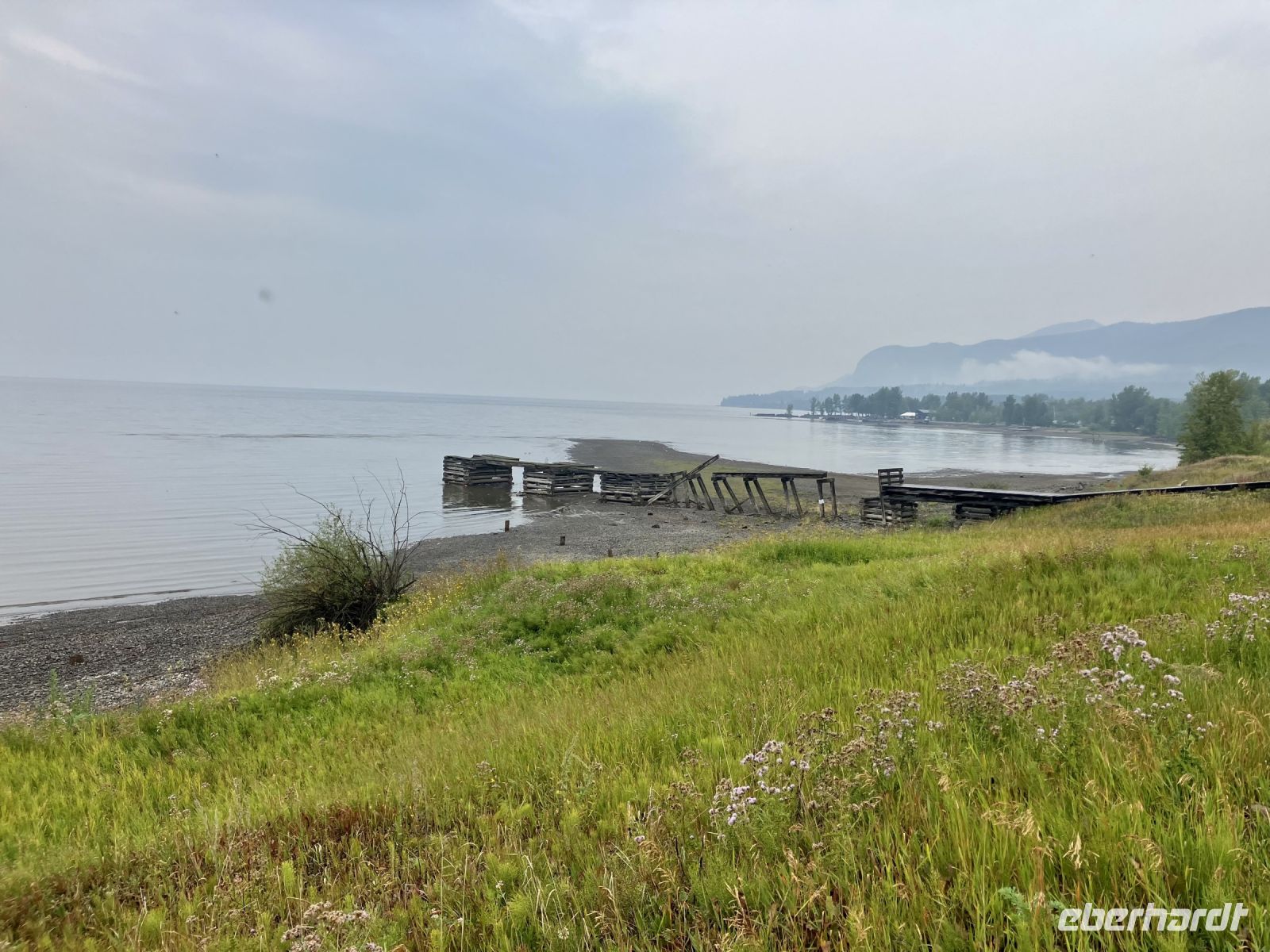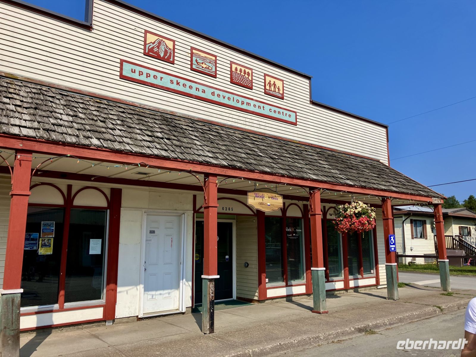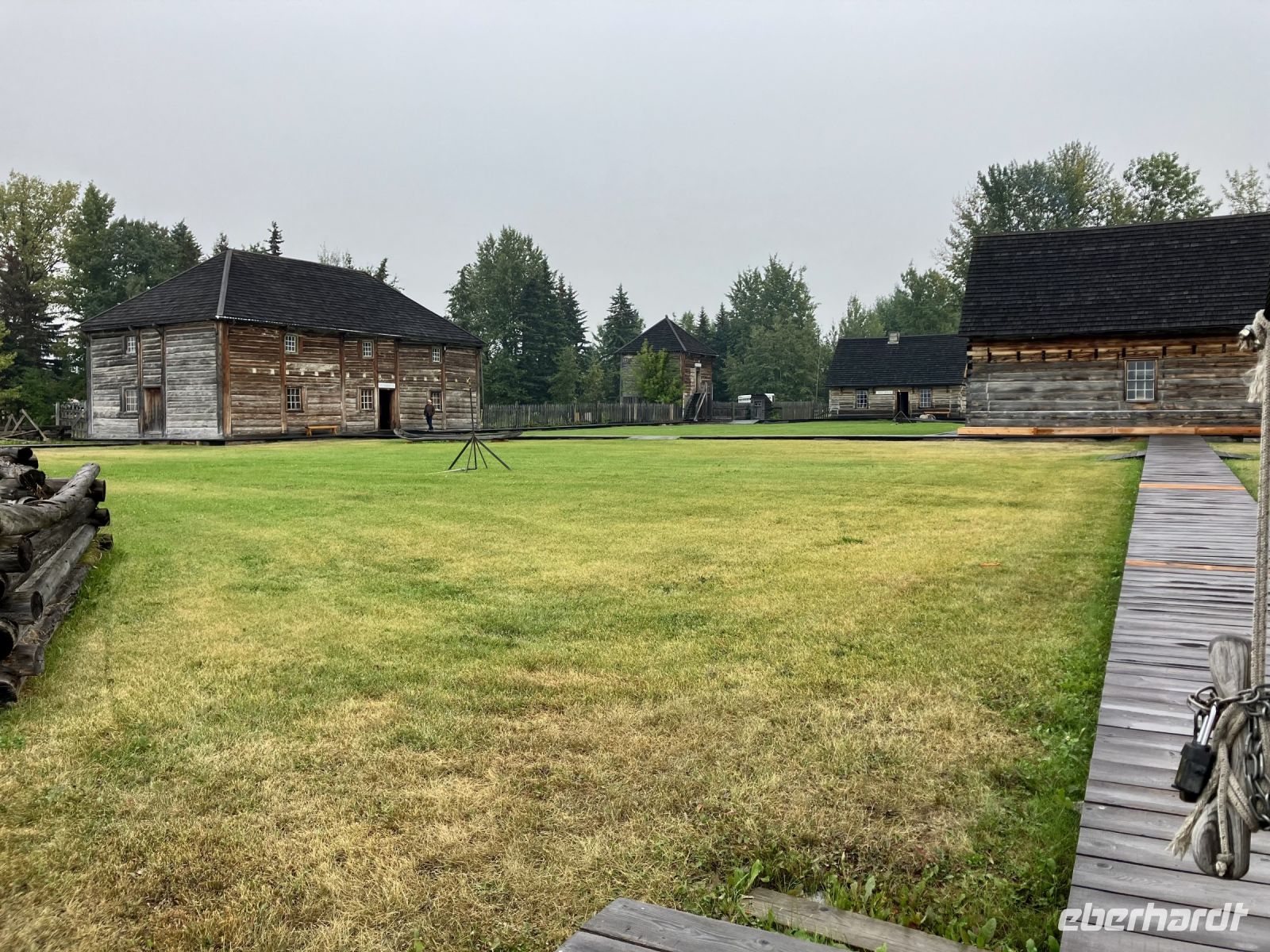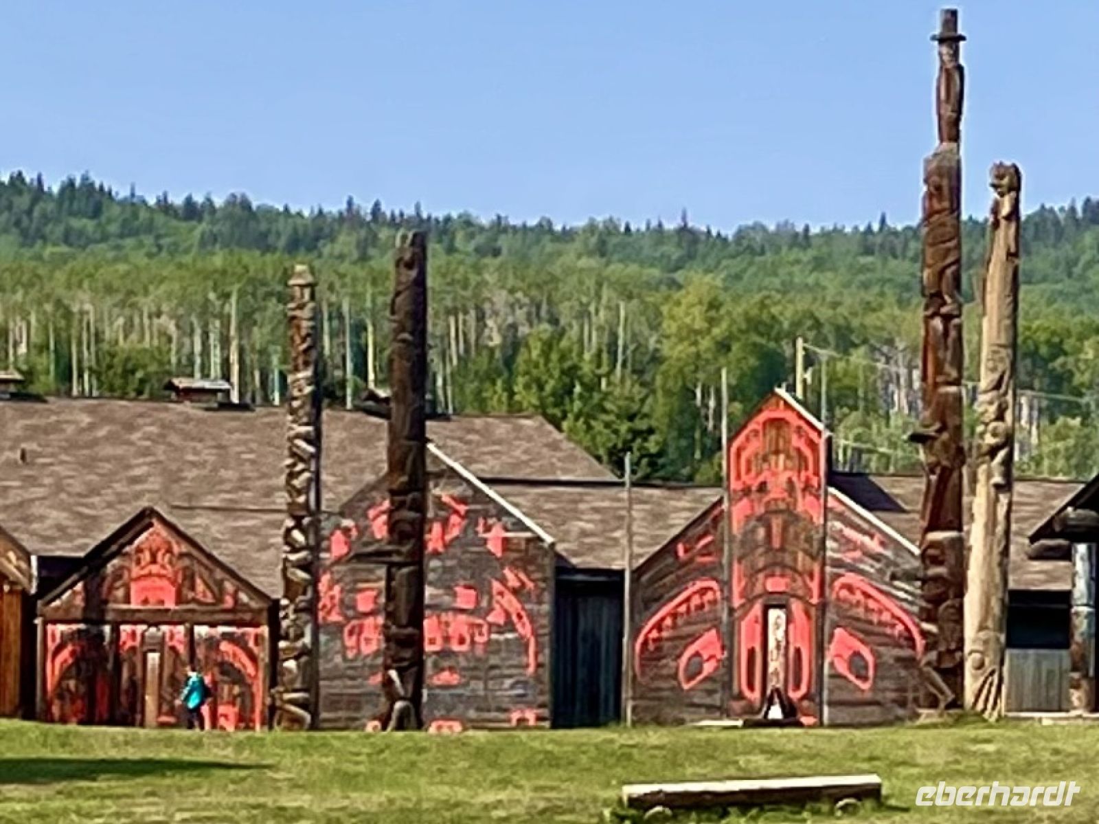 Heute ist unser Pioniertag und wir fahren nach Fort St James. Auf der Reise dorthin erfahren wir viele Geschichten ueber verschiedene kanadische Pioniere, die Polizei und die Forstwirtschaft. Schoen ist der grosse Norden mit seinem weiten Himmel. Fort St James ist eine Pelzhandelsstelle der Hudson Bay Company und nun ein Freilichtmuseum. Es ist aeusserst interessant an dem schoenen Stuart Lake gelegen. Ehe wir die verschiedenen Haeuser dieses Forts anschauen, machen wir lauthals am “weltbekannten” Haehnchen-Rennen mit. Viele unter uns gewinnen auch bei der Wette und ein schoener Knopf mit Huhn ist nun unser Markenzeichen. Nun aber zum Museum-Teil dieses Aufenthaltes. Das Hudson Bay Lagerhaus strahlt eine wunderbare Ruhe aus die wir einfach geniessen. Vieles lernen wir hier ueber die Trapper und ihre Gepflogenheiten, die Haendler mit ihren Tauschgeschaeften, die Fort Managers und ihre Einsamkeit fernab ihrer Heimat und die Ersten Nationen dieser Gegend. Auch das Maennerhaus mit seinen Geschichten versezt uns in die schwierige Zeit der damaligen Trapper und im Handelshaus sehen wir die Gueter die man hier einkaufen konnte gegen das “Bibergeld”. Wir bleiben auch lange da und schiessen viele Bilder. Zu Mittag hat Elisabeth uns eine lokale Spezialitaet bestellt. Es gibt Suppe und danach Bannock mit Schinken und Kaese dazu ein super kuehles und feines, von Eberhardt offeriertes Bierchen. Essen koennen wir draussen mit schoener Sicht auf den Stewart Lake. Was fuer ein schoener und gelungener Ausflug. Eine lange Strecke bis nach Smithers erwartet uns jedoch, also muessen wir nun aufbrechen. Auf der Highway no 16 fahren wir weiter in Richtung Westen an wunderschoenen Seen vorbei. Sie liegen einsam in den endlosen Waelder versteckt, genau wie es uns versprochen wurde. Doerfer die knappe 200 Personen zaehlen sehen wir. Wir doesen ein bisschen vor uns hin und schauen gleichzeitig einen Baeren-Film. So treffen wir problemlos 3 einhalb Stunden spaeter in Huston ein. Nein, nicht Houston, Texas. Hier halten wir kurz an, da wir ins Info Centre gehen- und den preparierten Grizzly sehen moechten. Nun dauert es nicht mehr lange bis nach Smithers. Wir lernen unterdessen, wie man einer hausgemachten Fliege das fliegen lehrt und wie man damit Fische fangen kann. Einmal in Smithers gibt es eine kurze Stadtrundfahrt ehe wir in unsere Lodge einchecken. Nun kaufen wir noch unser morgiges Picknick ein und kehren dann wieder zu unserem Hotel zurueck zum Abendbrot. Das Hotel ist schoen, das Restaurant auch und die Bar ist mit ihren vielen Fernseher und Einheimischen sehr autentisch. Wir aber haben einen eigenen Raum zum Essen, er ist nun echt nicht schoen. I am so sorry ! Wir sind alle recht muede nach dem langen Tag und freuen uns auf die gute Nacht mit frischer Luft ohne Rauchgeschmack. Nur gut, dass wir den Norden der Provinz Britsch Columbiens bereisen. Denn wir sind von den vielen Waldbraenden bislang verschont geblieben. In der Nacht regnet es wieder und Blitze erleuchten unsere Zimmer. Der Donner trommelt uns danach wieder in den Schlaf.