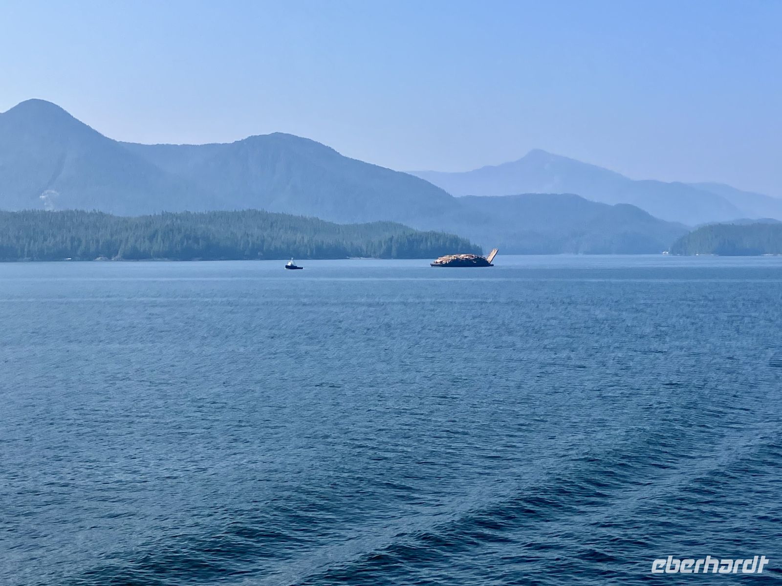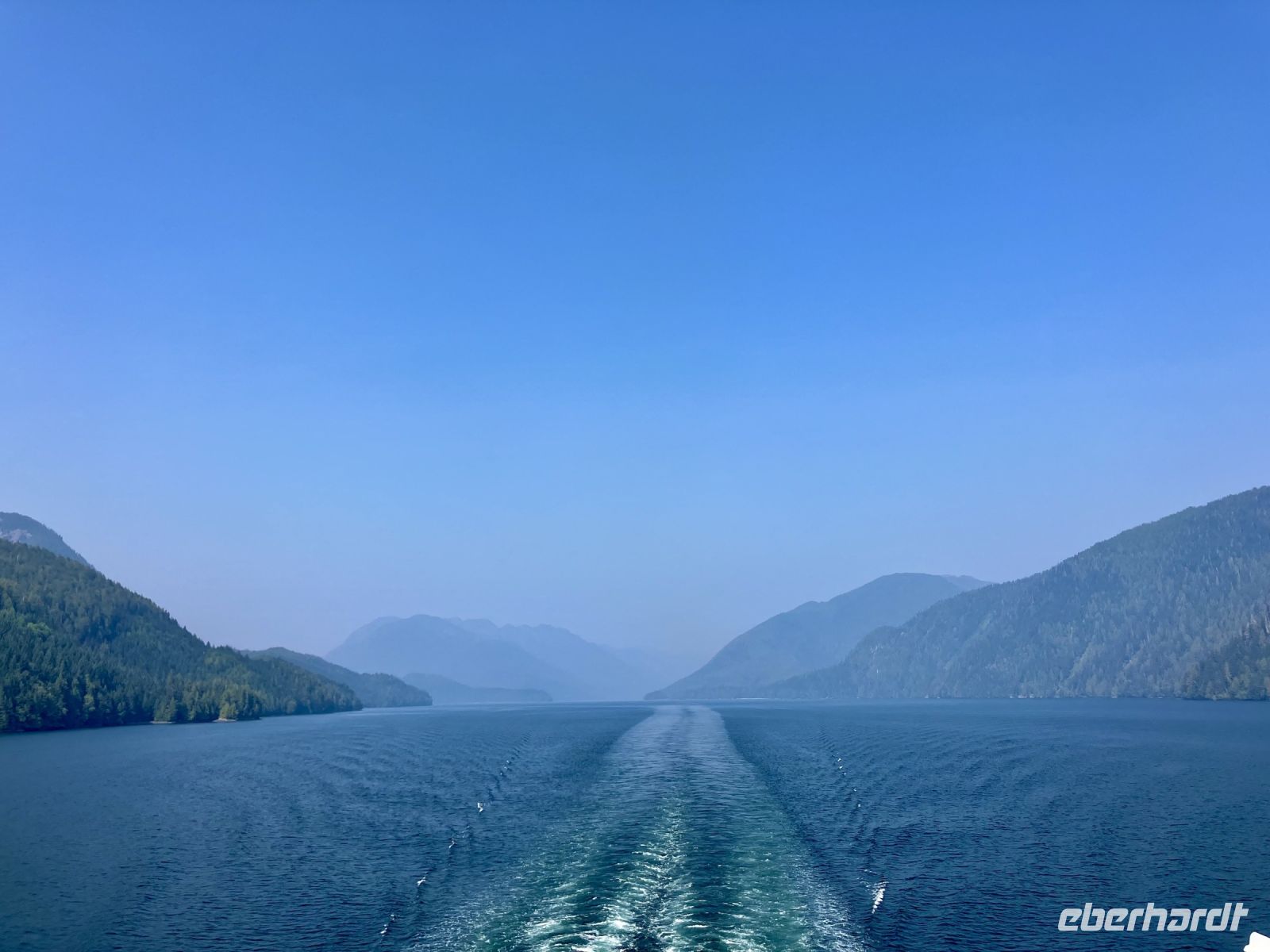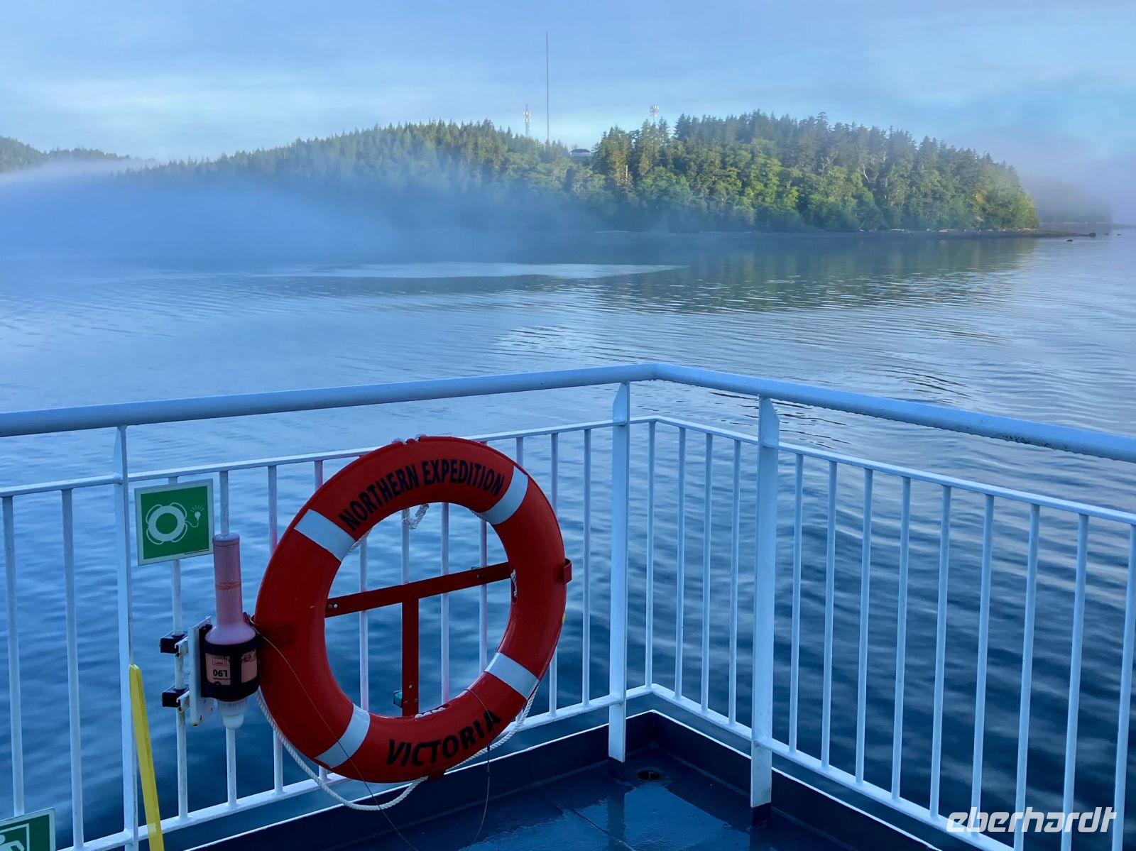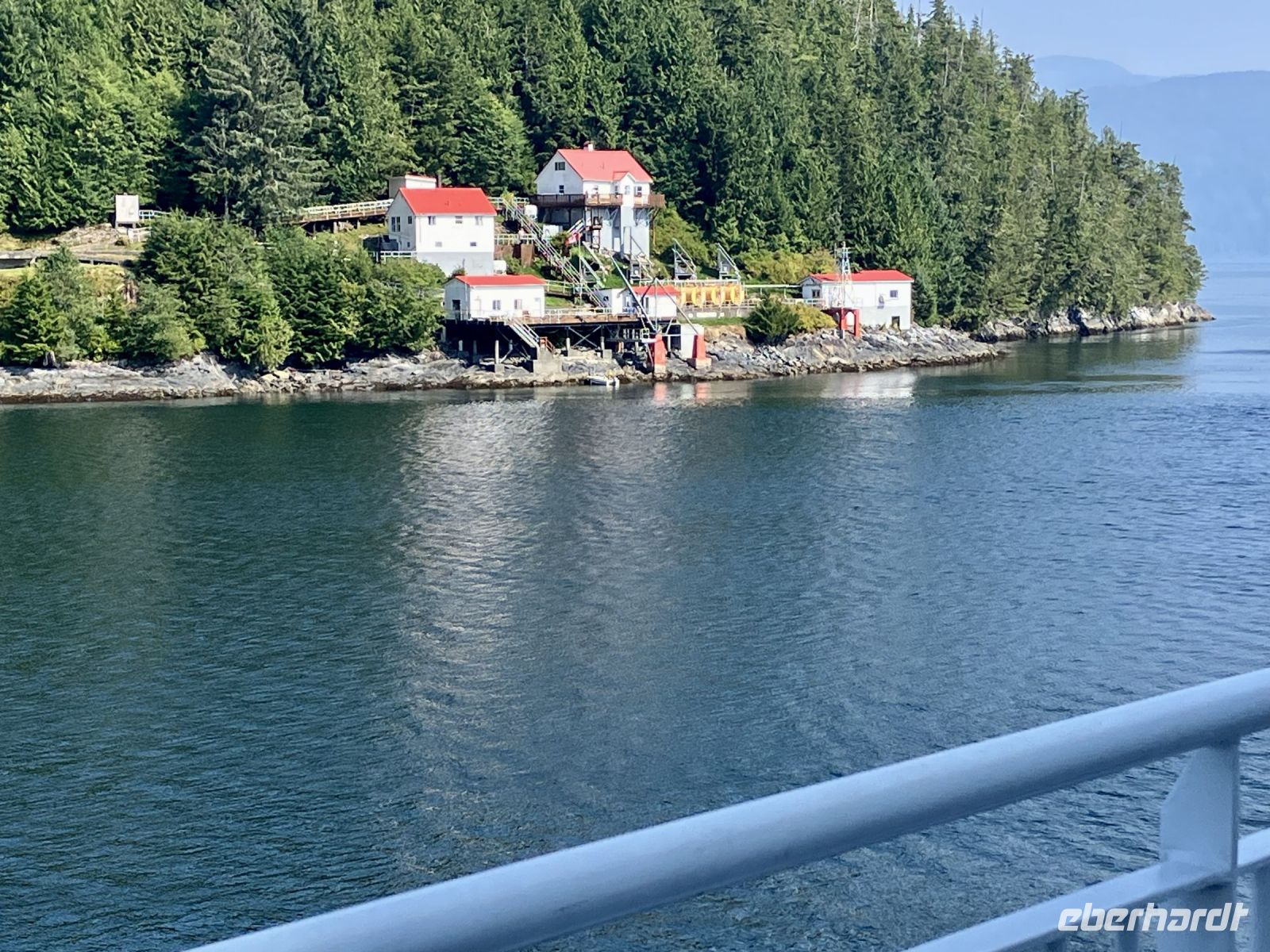 Au Weh ist richtig, denn es klingelt bereits um 5:00 Uhr in der Frueh ! Nur gut, dass wir die Koffer schon gestern abend in den Bus gestellt haben und bloss mit einem Handgepaeck bestueckt sind. Bald fahren wir mit dem Bus auf die Faehre, wir stehen ziemlich weit vorne und das ist fein, denn bei Ankunft in der Nacht, fahren wir auch wieder als eine der Ersten raus. Die Inside Passage koennen wir so richtig schoen erleben wie sie bloss etwa 30 Tage im Jahr zu sehen ist, bei Sonnenschein. Die Inside Passage ist rund 15 ½ Stunden lang, was sich nach ein bisschen lange anhorchen mag, jedoch gemuetlich und wunderschoen vergeht. Wir haben ja auch mal Zeit, die Ansichtskarten zu schreiben, zu lesen, auszuruhen miteinander zu reden und lachen und diese wunderschoene Gegend auch von den Aussendecks zu erleben. Immer wieder gibt es einen Wasserfall oder einen Leuchturm zu sehen und dann gibt es auch immer wieder die Aufregung......eine Ansage......Wale auf backbord, Wale auf steuerbord und alle rennen natuerlich auf die angegebene Seite, sodass der Steuermannn diese Gewichtsverschiebung jeweils ausgleichen muss. Ein Buckelwal hat uns auch richtig zugewinkt mit seiner Flosse, immer wieder winkte er. Von nun an sehen wir immer wieder Wale, viele sind aus HOLZ ! Die Aufregung ist jedoch immer sehr amuesant. So vertreiben wir uns die Zeit auf sehr angenehme Art und Weise. Wegen Covid19 werden wir leider nicht auf die Bruecke eingeladen. Diese Faehre kommt aus Flensburg und der Heilige Nikolaus passt auf dieses Schiff auf. Wir segeln heute mit der Flut und deshalb sind wir etwas frueher in Bella Bella wo einige Passagiere aus und zusteigen. Wir nutzen den fruehen Nachmittag fuer unsere Party auf Deck 6.