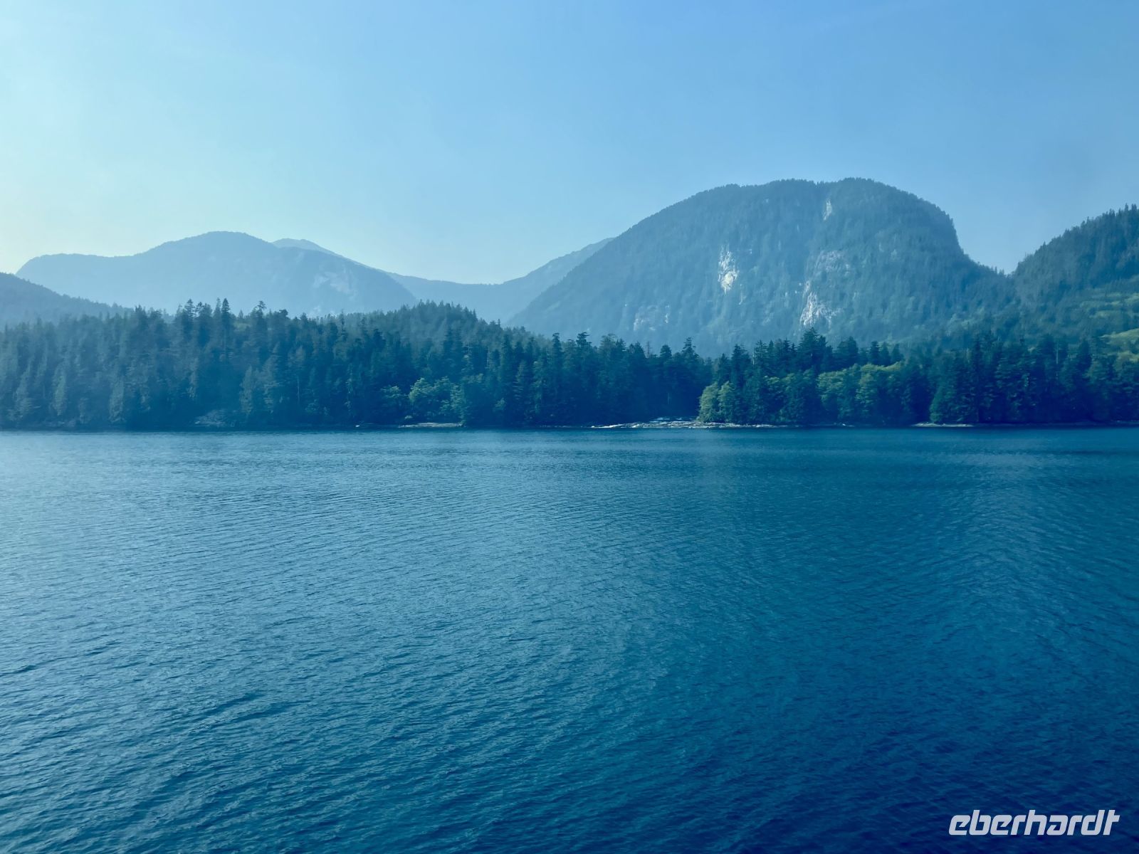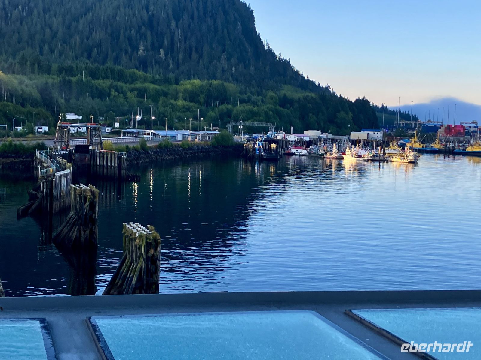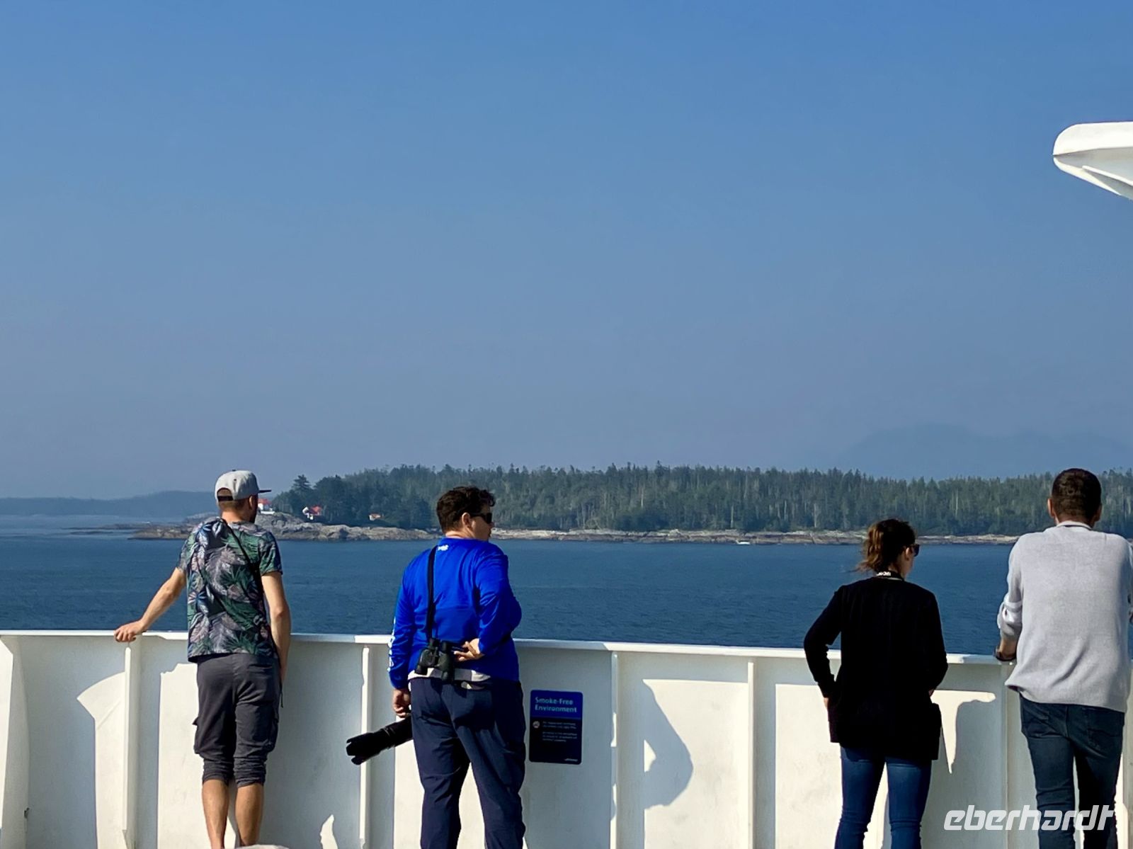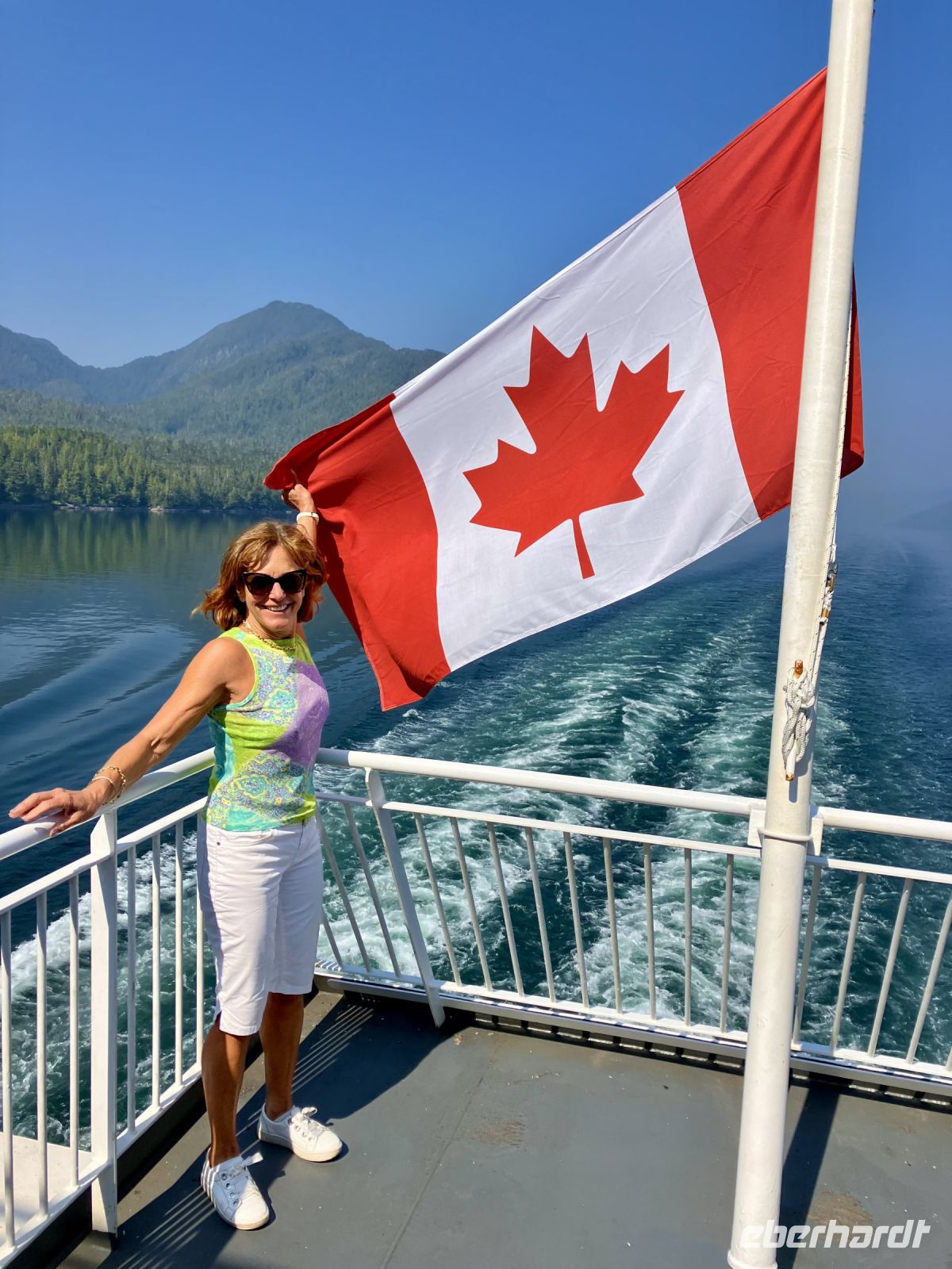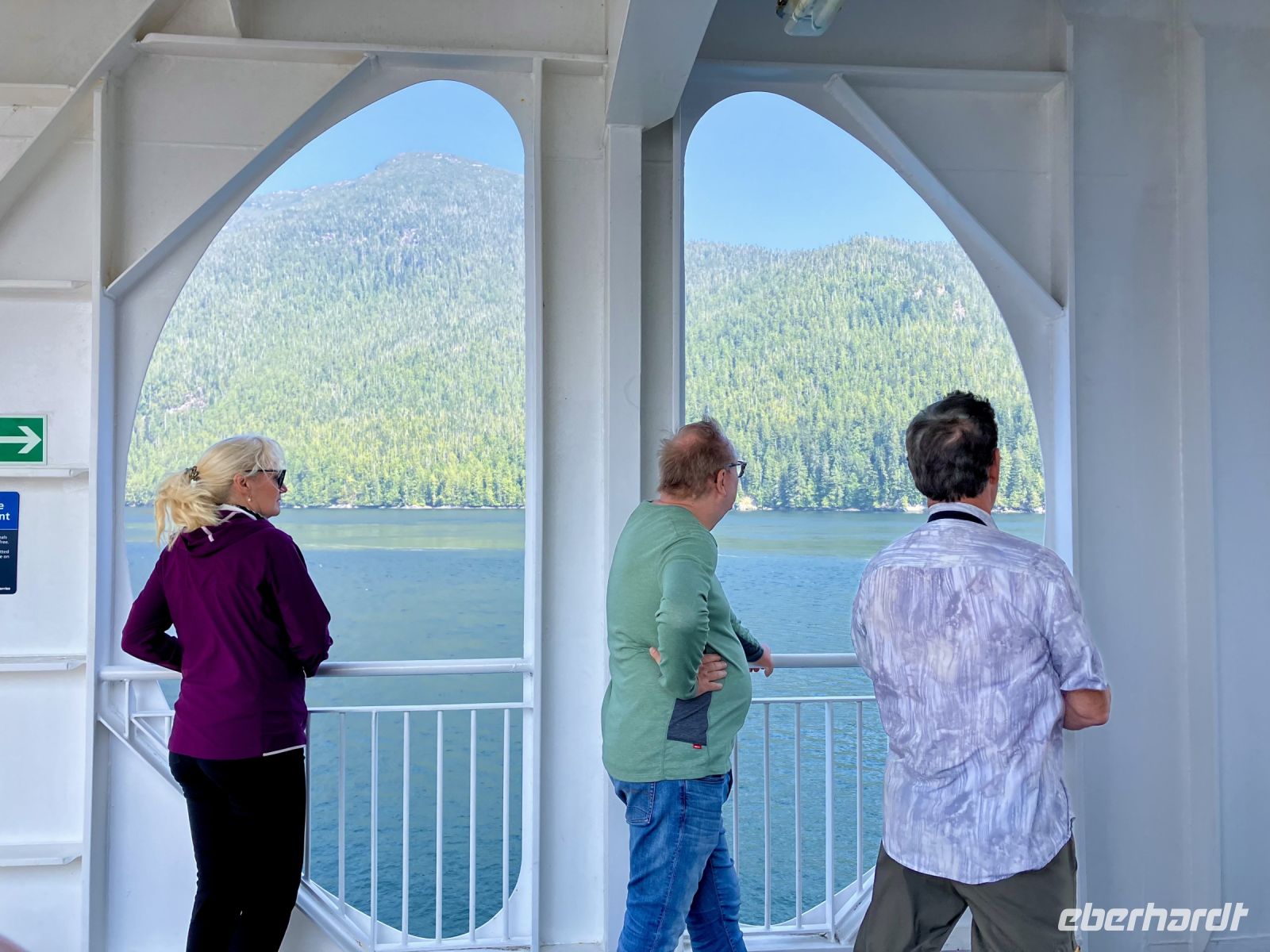 Au Weh ist richtig, denn es klingelt bereits um 5:00 Uhr in der Frueh ! Nur gut, dass wir die Koffer schon gestern abend in den Bus gestellt haben und bloss mit einem Handgepaeck bestueckt sind. Bald fahren wir mit dem Bus auf die Faehre, wir stehen ziemlich weit vorne und das ist fein, denn bei Ankunft in der Nacht, fahren wir auch wieder als eine der Ersten raus. Die Inside Passage koennen wir so richtig schoen erleben wie sie bloss etwa 30 Tage im Jahr zu sehen ist, bei Sonnenschein. Die Inside Passage ist rund 15 ½ Stunden lang, was sich nach ein bisschen lange anhorchen mag, jedoch gemuetlich und wunderschoen vergeht. Wir haben ja auch mal Zeit, die Ansichtskarten zu schreiben, zu lesen, auszuruhen miteinander zu reden und lachen und diese wunderschoene Gegend auch von den Aussendecks zu erleben. Immer wieder gibt es einen Wasserfall oder einen Leuchturm zu sehen und dann gibt es auch immer wieder die Aufregung......eine Ansage......Wale auf backbord, Wale auf steuerbord und alle rennen natuerlich auf die angegebene Seite, sodass der Steuermannn diese Gewichtsverschiebung jeweils ausgleichen muss. Ein Buckelwal hat uns auch richtig zugewinkt mit seiner Flosse, immer wieder winkte er. Von nun an sehen wir immer wieder Wale, viele sind aus HOLZ ! Die Aufregung ist jedoch immer sehr amuesant. So vertreiben wir uns die Zeit auf sehr angenehme Art und Weise. Wegen Covid19 werden wir leider nicht auf die Bruecke eingeladen. Diese Faehre kommt aus Flensburg und der Heilige Nikolaus passt auf dieses Schiff auf. Wir segeln heute mit der Flut und deshalb sind wir etwas frueher in Bella Bella wo einige Passagiere aus und zusteigen. Wir nutzen den fruehen Nachmittag fuer unsere Party auf Deck 6.