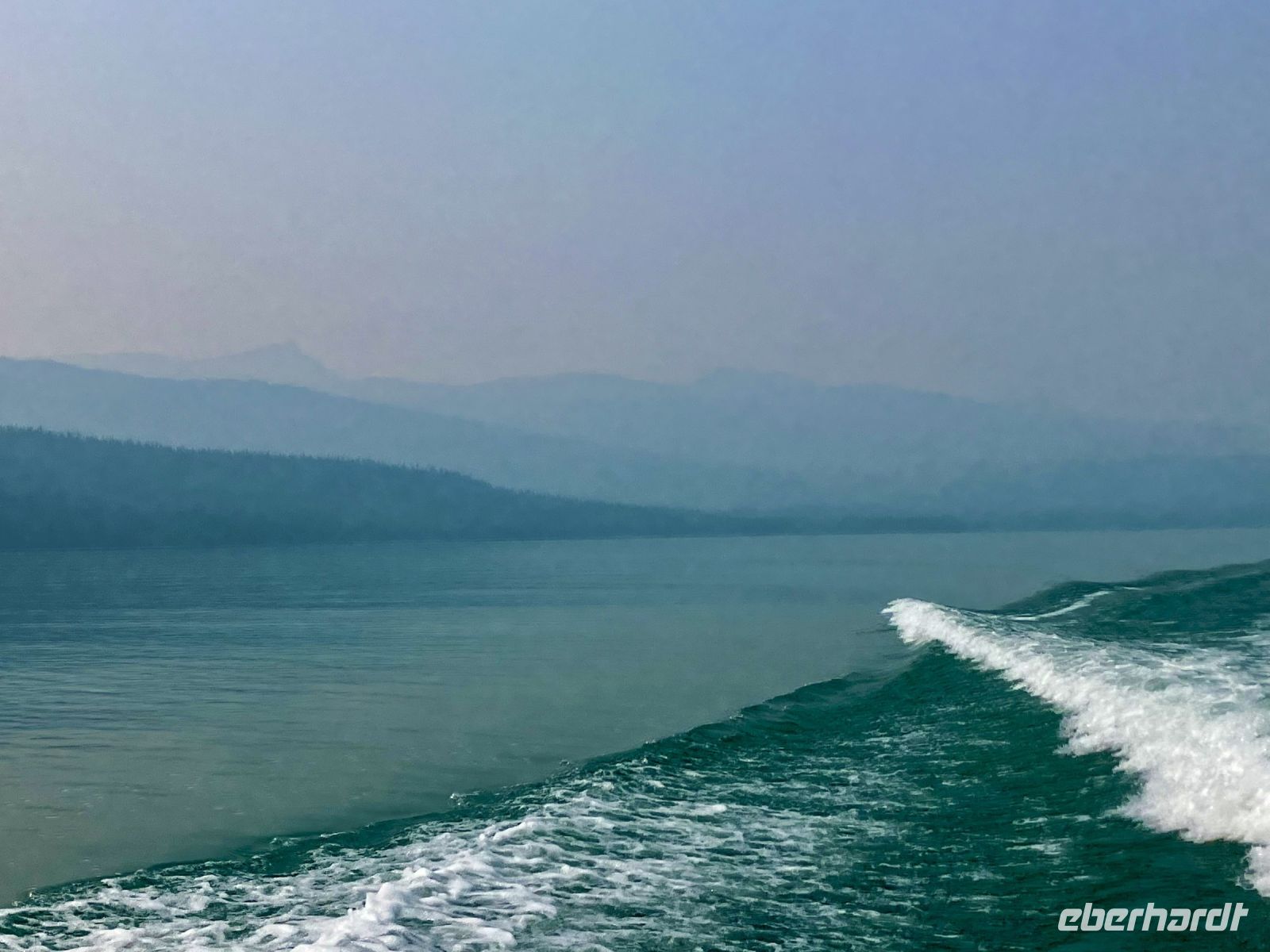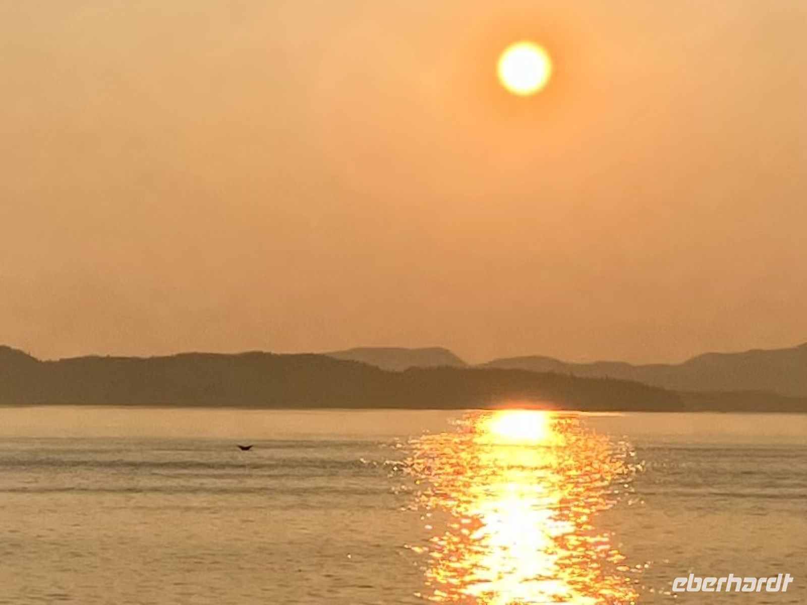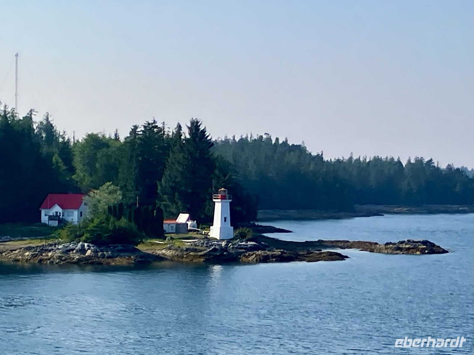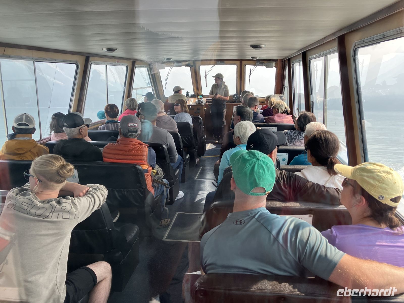 Au Weh ist richtig, denn es klingelt bereits um 5:00 Uhr in der Frueh ! Nur gut, dass wir die Koffer schon gestern abend in den Bus gestellt haben und bloss mit einem Handgepaeck bestueckt sind. Bald fahren wir mit dem Bus auf die Faehre, wir stehen ziemlich weit vorne und das ist fein, denn bei Ankunft in der Nacht, fahren wir auch wieder als eine der Ersten raus. Die Inside Passage koennen wir so richtig schoen erleben wie sie bloss etwa 30 Tage im Jahr zu sehen ist, bei Sonnenschein. Die Inside Passage ist rund 15 ½ Stunden lang, was sich nach ein bisschen lange anhorchen mag, jedoch gemuetlich und wunderschoen vergeht. Wir haben ja auch mal Zeit, die Ansichtskarten zu schreiben, zu lesen, auszuruhen miteinander zu reden und lachen und diese wunderschoene Gegend auch von den Aussendecks zu erleben. Immer wieder gibt es einen Wasserfall oder einen Leuchturm zu sehen und dann gibt es auch immer wieder die Aufregung......eine Ansage......Wale auf backbord, Wale auf steuerbord und alle rennen natuerlich auf die angegebene Seite, sodass der Steuermannn diese Gewichtsverschiebung jeweils ausgleichen muss. Ein Buckelwal hat uns auch richtig zugewinkt mit seiner Flosse, immer wieder winkte er. Von nun an sehen wir immer wieder Wale, viele sind aus HOLZ ! Die Aufregung ist jedoch immer sehr amuesant. So vertreiben wir uns die Zeit auf sehr angenehme Art und Weise. Wegen Covid19 werden wir leider nicht auf die Bruecke eingeladen. Diese Faehre kommt aus Flensburg und der Heilige Nikolaus passt auf dieses Schiff auf. Wir segeln heute mit der Flut und deshalb sind wir etwas frueher in Bella Bella wo einige Passagiere aus und zusteigen. Wir nutzen den fruehen Nachmittag fuer unsere Party auf Deck 6.