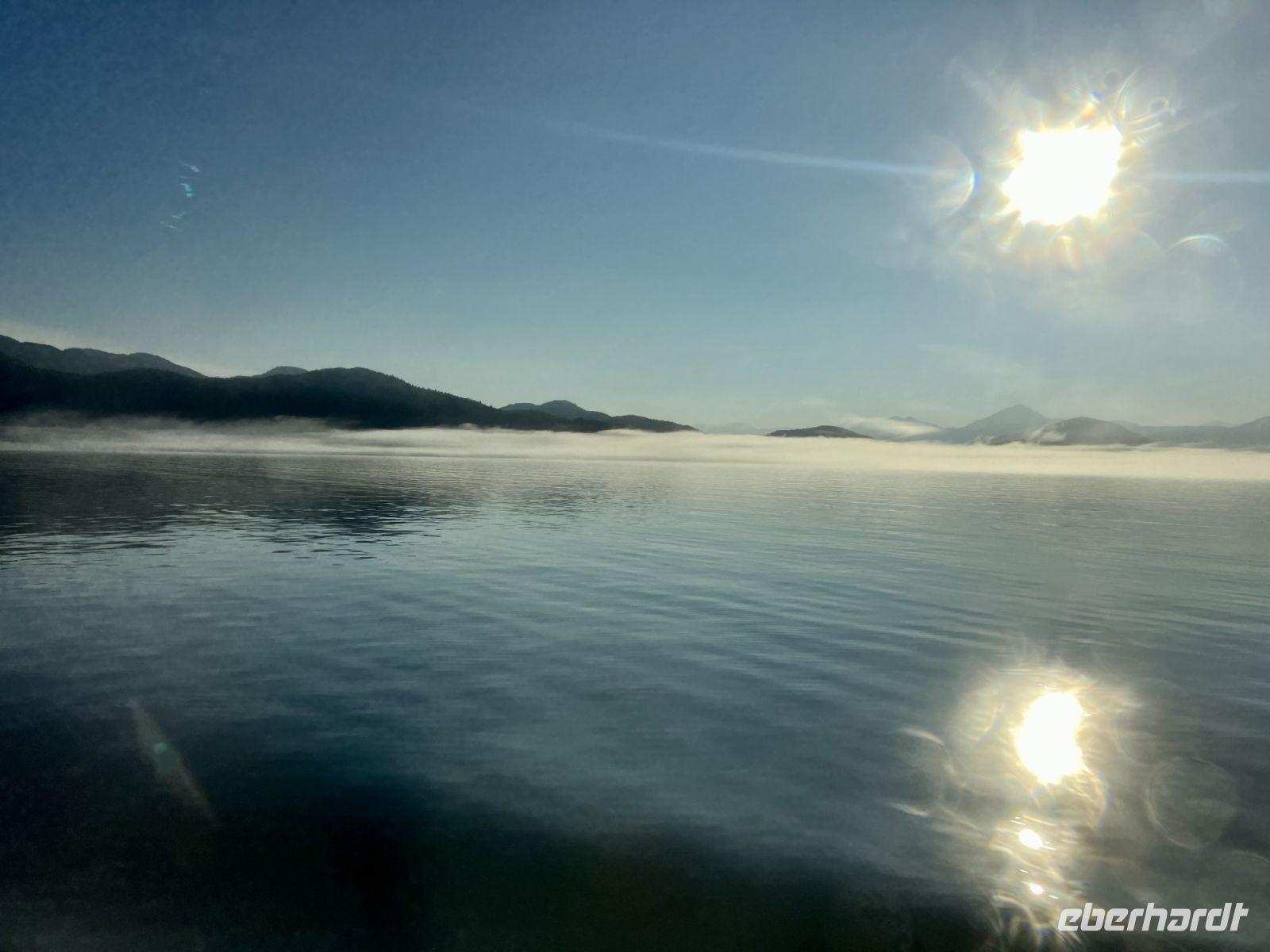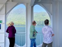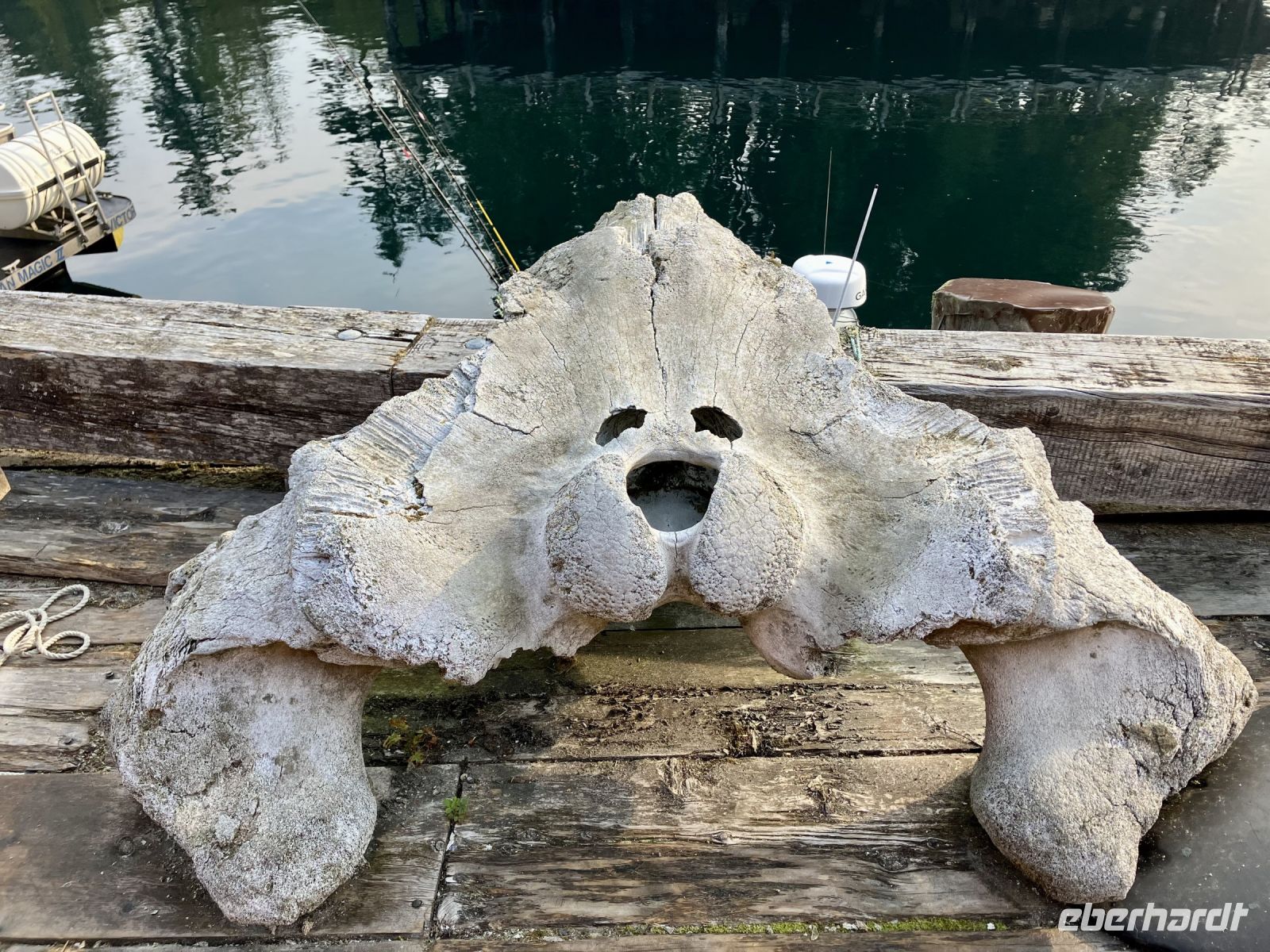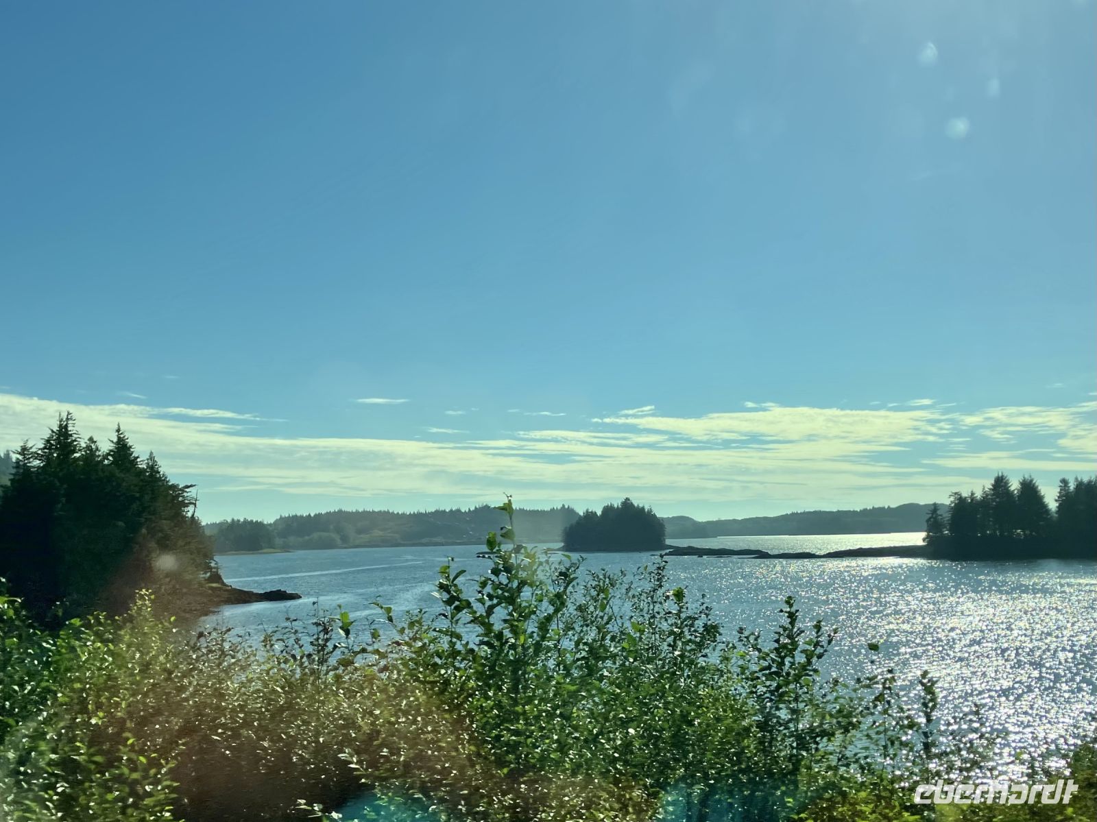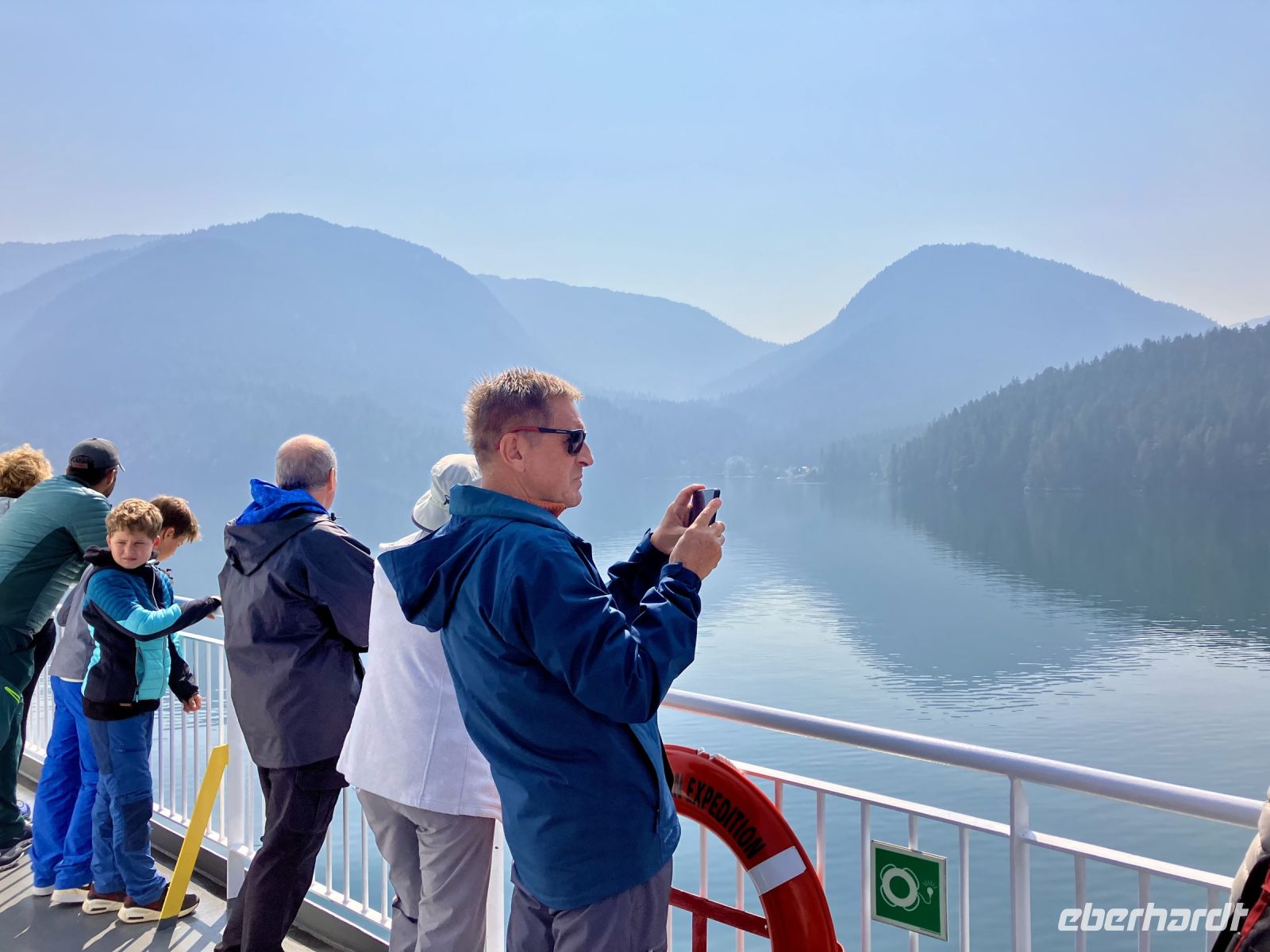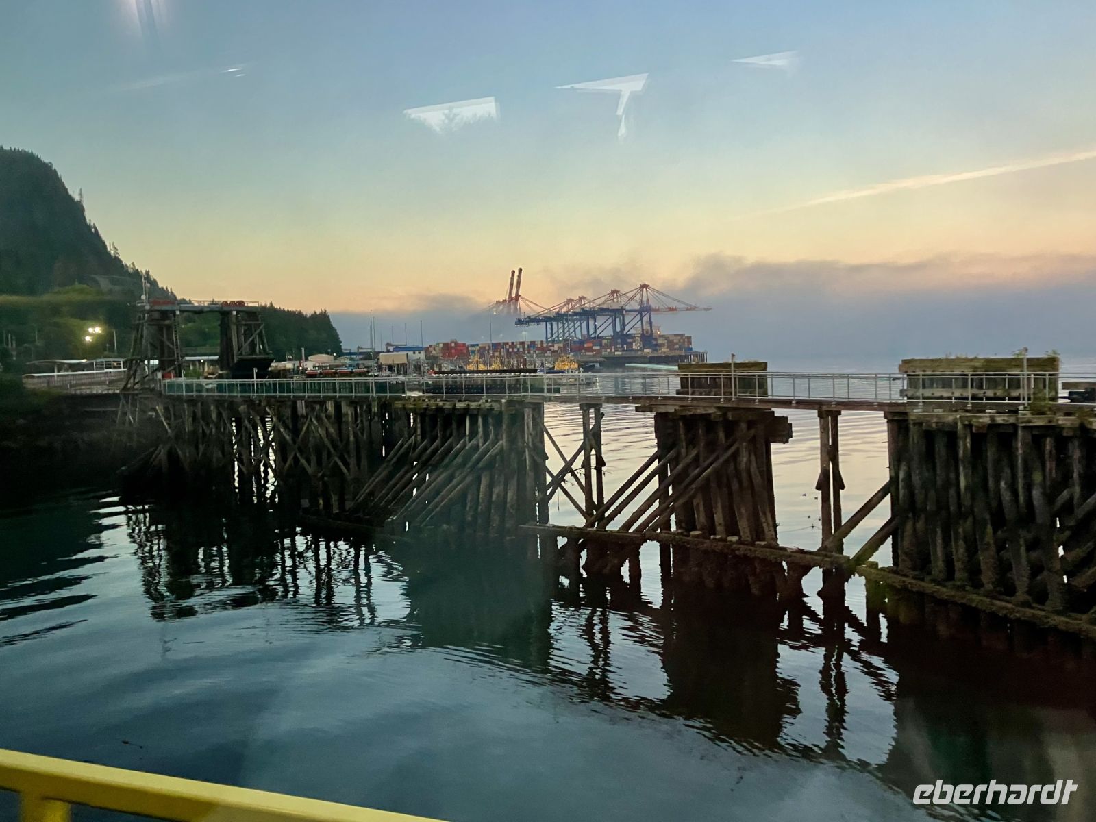 Au Weh ist richtig, denn es klingelt bereits um 5:00 Uhr in der Frueh ! Nur gut, dass wir die Koffer schon gestern abend in den Bus gestellt haben und bloss mit einem Handgepaeck bestueckt sind. Bald fahren wir mit dem Bus auf die Faehre, wir stehen ziemlich weit vorne und das ist fein, denn bei Ankunft in der Nacht, fahren wir auch wieder als eine der Ersten raus. Die Inside Passage koennen wir so richtig schoen erleben wie sie bloss etwa 30 Tage im Jahr zu sehen ist, bei Sonnenschein. Die Inside Passage ist rund 15 ½ Stunden lang, was sich nach ein bisschen lange anhorchen mag, jedoch gemuetlich und wunderschoen vergeht. Wir haben ja auch mal Zeit, die Ansichtskarten zu schreiben, zu lesen, auszuruhen miteinander zu reden und lachen und diese wunderschoene Gegend auch von den Aussendecks zu erleben. Immer wieder gibt es einen Wasserfall oder einen Leuchturm zu sehen und dann gibt es auch immer wieder die Aufregung......eine Ansage......Wale auf backbord, Wale auf steuerbord und alle rennen natuerlich auf die angegebene Seite, sodass der Steuermannn diese Gewichtsverschiebung jeweils ausgleichen muss. Ein Buckelwal hat uns auch richtig zugewinkt mit seiner Flosse, immer wieder winkte er. Von nun an sehen wir immer wieder Wale, viele sind aus HOLZ ! Die Aufregung ist jedoch immer sehr amuesant. So vertreiben wir uns die Zeit auf sehr angenehme Art und Weise. Wegen Covid19 werden wir leider nicht auf die Bruecke eingeladen. Diese Faehre kommt aus Flensburg und der Heilige Nikolaus passt auf dieses Schiff auf. Wir segeln heute mit der Flut und deshalb sind wir etwas frueher in Bella Bella wo einige Passagiere aus und zusteigen. Wir nutzen den fruehen Nachmittag fuer unsere Party auf Deck 6.