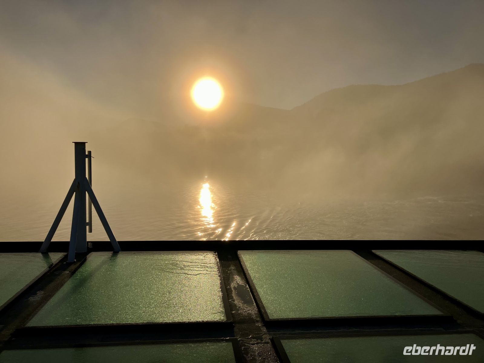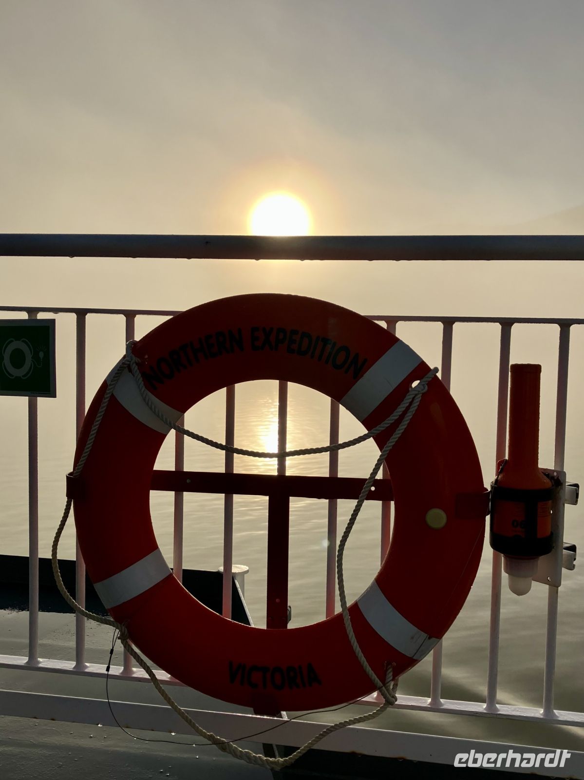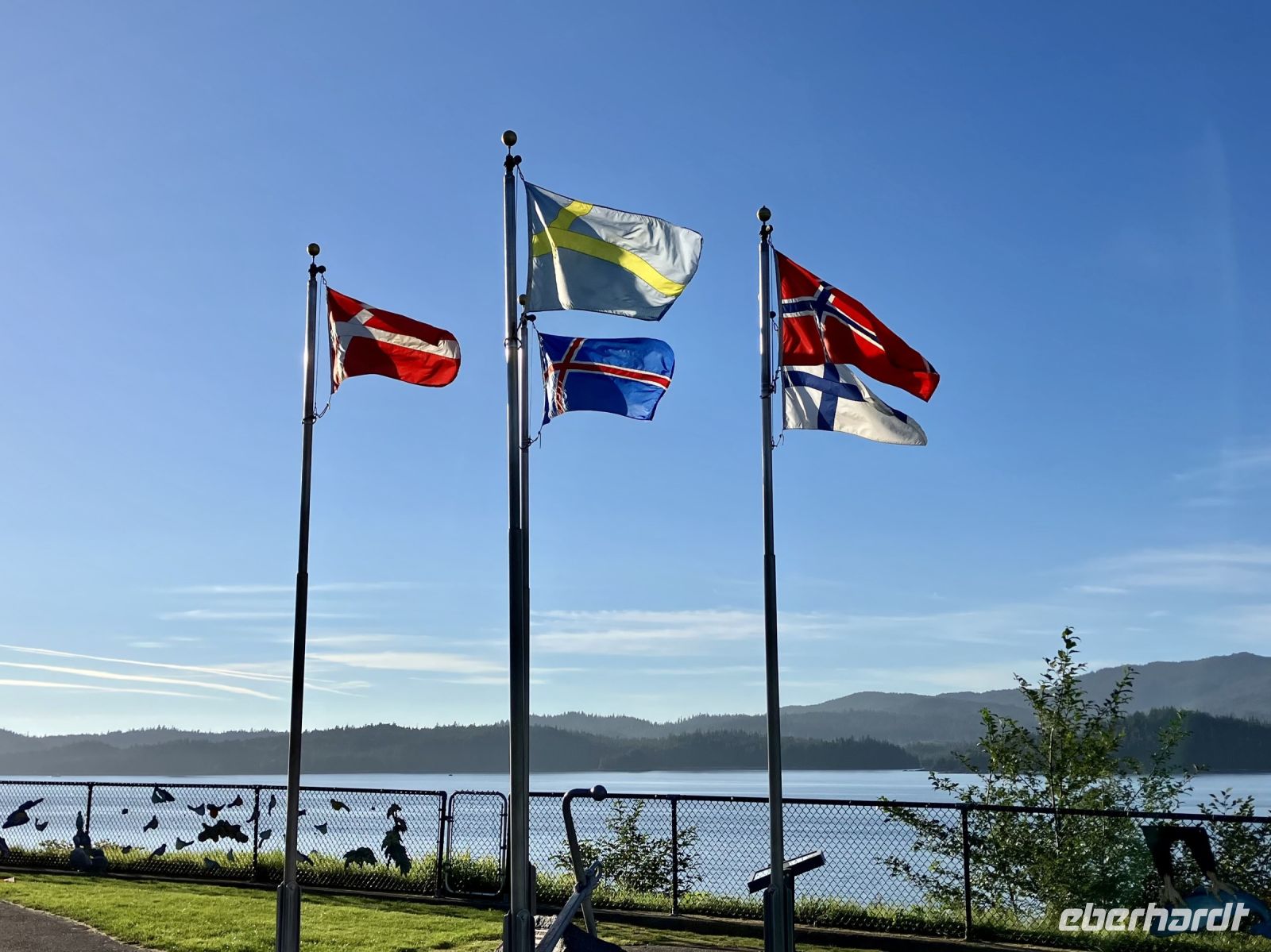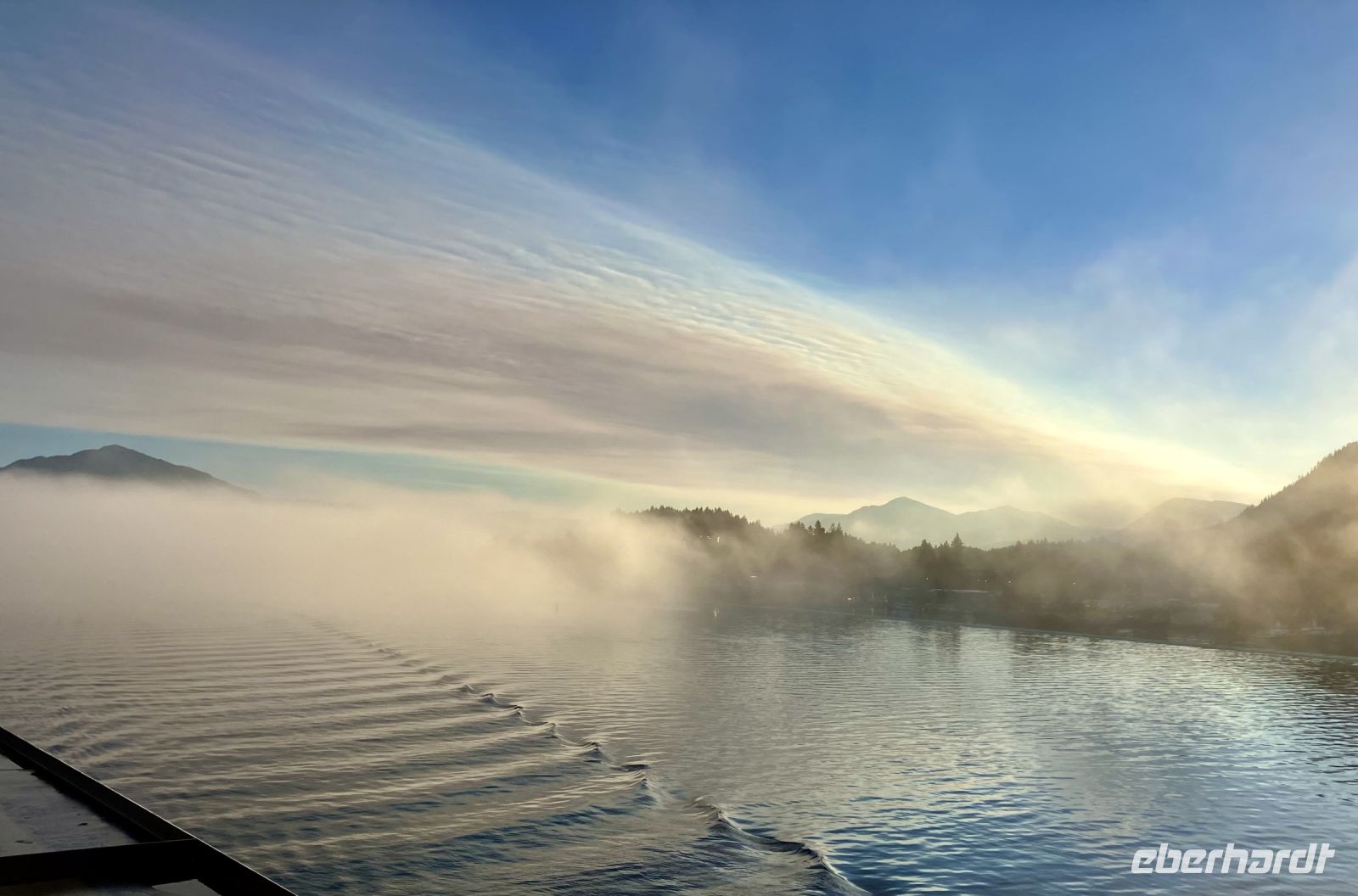 Au Weh ist richtig, denn es klingelt bereits um 5:00 Uhr in der Frueh ! Nur gut, dass wir die Koffer schon gestern abend in den Bus gestellt haben und bloss mit einem Handgepaeck bestueckt sind. Bald fahren wir mit dem Bus auf die Faehre, wir stehen ziemlich weit vorne und das ist fein, denn bei Ankunft in der Nacht, fahren wir auch wieder als eine der Ersten raus. Die Inside Passage koennen wir so richtig schoen erleben wie sie bloss etwa 30 Tage im Jahr zu sehen ist, bei Sonnenschein. Die Inside Passage ist rund 15 ½ Stunden lang, was sich nach ein bisschen lange anhorchen mag, jedoch gemuetlich und wunderschoen vergeht. Wir haben ja auch mal Zeit, die Ansichtskarten zu schreiben, zu lesen, auszuruhen miteinander zu reden und lachen und diese wunderschoene Gegend auch von den Aussendecks zu erleben. Immer wieder gibt es einen Wasserfall oder einen Leuchturm zu sehen und dann gibt es auch immer wieder die Aufregung......eine Ansage......Wale auf backbord, Wale auf steuerbord und alle rennen natuerlich auf die angegebene Seite, sodass der Steuermannn diese Gewichtsverschiebung jeweils ausgleichen muss. Ein Buckelwal hat uns auch richtig zugewinkt mit seiner Flosse, immer wieder winkte er. Von nun an sehen wir immer wieder Wale, viele sind aus HOLZ ! Die Aufregung ist jedoch immer sehr amuesant. So vertreiben wir uns die Zeit auf sehr angenehme Art und Weise. Wegen Covid19 werden wir leider nicht auf die Bruecke eingeladen. Diese Faehre kommt aus Flensburg und der Heilige Nikolaus passt auf dieses Schiff auf. Wir segeln heute mit der Flut und deshalb sind wir etwas frueher in Bella Bella wo einige Passagiere aus und zusteigen. Wir nutzen den fruehen Nachmittag fuer unsere Party auf Deck 6.