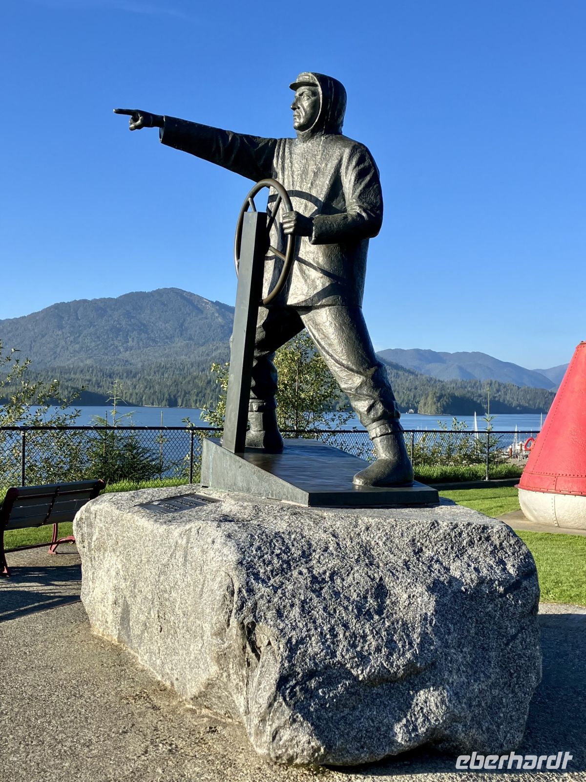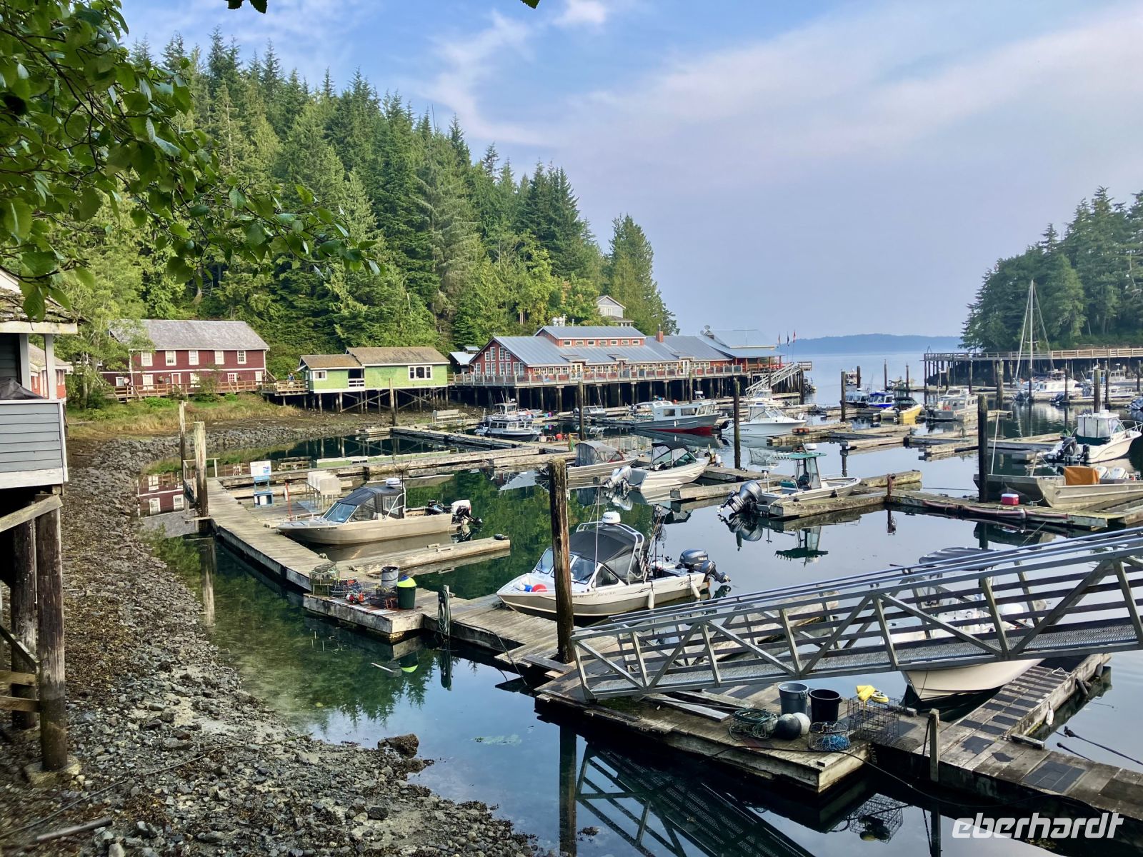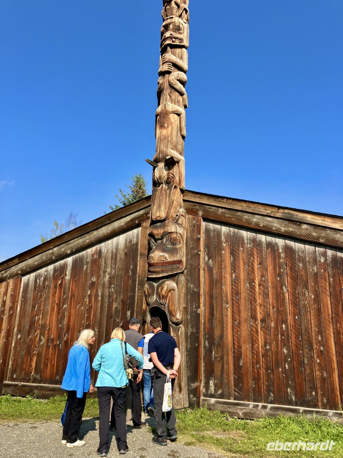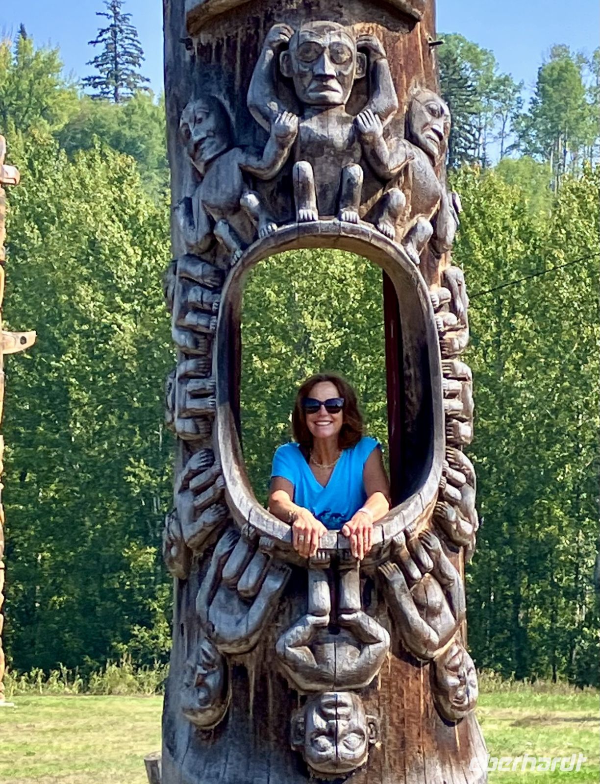 Ein wunderschoener Sonnentag bricht an. Wir haben so ein Glueck, es ist kaum zu glauben. Wir sind im tiefen Regenwald in der strahlenden Sonne. Tracy hat auch unseren Bus wieder auf Hochglanz poliert nach der gestrigen Staubstrasse. So verlassen wir zeitig Stewart und fahren bis nach Gitanyow ins Reservat der Gixsan. Aber ploetzlich piepst es im Armaturenbrett, Tracy haelt an, steigt aus, au weh, grosse Rauchwolke hinten am Bus. Klappe auf, Rauchwolke noch dichter. Die Strasse ist leer, es ist Samstag morgen. Es gibt keine Verbindung, kein Netz, wir stehen mitten im Wald. Die Strasse zeigt uns, dass wir Kuehlwasser verloren haben. Nicht lange danach, haelt ein grosser Lastwagen und der Fahrer hilft Tracy den Kuehlwasserschlauch wieder an den Tank anzuschliessen. Durch die Strasse gestern muss er sich geloest haben. Der LKW-Fahrer gibt uns auch Kuehlwasser, aber er hat bloss 4 Gallonen bei sich. Somit koennen wir wenigstens bis zur naechsten und einzigen Tankstelle auf der fat 300 Km Strecke fahren. Leider hat die Tankstelle kein Kuehlwasser und so bleiben wir nach weiteren 60 Km wieder stecken. Ein Camper aus Minnesota haelt an und verschickt ueber Satelit ein SOS. Unterdessen fuellen wir den Kuehlwasser Tank mit Trinkwasser und fahren dann auch bald einmal weiter Richtung Kreuzung mit der Gelbkopfstrasse die uns ans Meer fuehren wird. Ehe wir bei der Kreuzung sind halten wir noch, wie geplant in zwei verschiedenen Reservaten an. In Gitanyow und bestaunen wir das Indianerdorf und seine schoenen Totem (uuups, ich bitte um Entschuldigung ! Politisch korrekt heisst das: die geschichtserzaehlenden Pfaehle der Ersten Nationen. Aber eben, es ist zu lange fuer einen Reisebericht !) Einheimische sehen wir nur wenige. Der General Store wurde neu ausgebaut und ist jetzt modern mit Softdrinks und Chips aller Arten ausstaffiert. Weiter geht es in noch ein anderes echtes Indianerdorf mit seinen vielen Totempfaehlen. Kitwanga heisst dieses Dorf und seine Totem stehen alle in Reih und Glied. Einige stehen schoen gerade und andere neigen sich bereits. Einer ist umgefallen und liegt nun im Grass und darf dort ruhen, bis er nicht von der Natur zurueckgeholt wird. Unterdessen aber……hat uns die US Polizei, welche den SOS Notruf erhalten hat, nicht lokaliesieren koennen. Sie haben die RCMP (kanadische Polizei) in Kenntnis gesetzt, dass ein Bus irgendwo auf der HWY 37 gestrandet sei. Eine intensive Suchaktion mit Streifenwagen und Helikopter wurde nun gestartet. Wir wissen aber nichts davon. Wir stecken ja auch in Reservate die von der RCMP ausgeschlossen sind. Das Reise-und das Busunternehmen werden benachrichtet, dass der Bus verschwunden und nicht auffindbar sei. Panik. Wo ist die Reisegruppe, gekidnappt ? Bloss Elisabeth’s Anruf bei der Kreuzung, wo man auch wieder vernetzt ist, lichtet die Paniksituation und stoppt die Suchaktion. Wir wurden nicht gekidnappt und sind auch nie verloren gegangen, wir hatten bloss kein Kuehlwasser ! Unterdessen hat Tracy auch Kuehlwasserkonzentrat kaufen koennen und die Welt ist wieder rund. Wir biegen in den Westen ab und fahren in Richtung Terrace. Dort gibts dann einen Kaffee und Kuchen dazu. Dem Skeena River entlang, sehen wir auch viele Fliegenfischer die wie Totempfaehle dem Ufer entlang stehen und einen Lachs nach dem andern herausholen. Am spaeteren Nachmittag kommen wir in Prince Rupert an. Nach der kurzen Stadtrundfahrt checken wir in unser Hotel ein um danach noch etwas Freizeit zu geniessen und ein wenig einkaufen zu gehen. Unser Abendessen ist in einem schoenen Restaurant in der Naehe des Hotels. Das Essen ist auch hier wieder sehr lecker. Wir gehen heute auch etwas frueher schlafen denn Morgen – Au Weh !