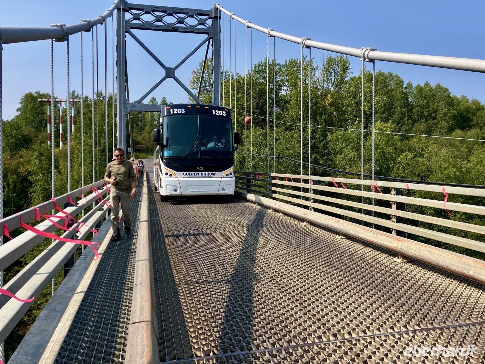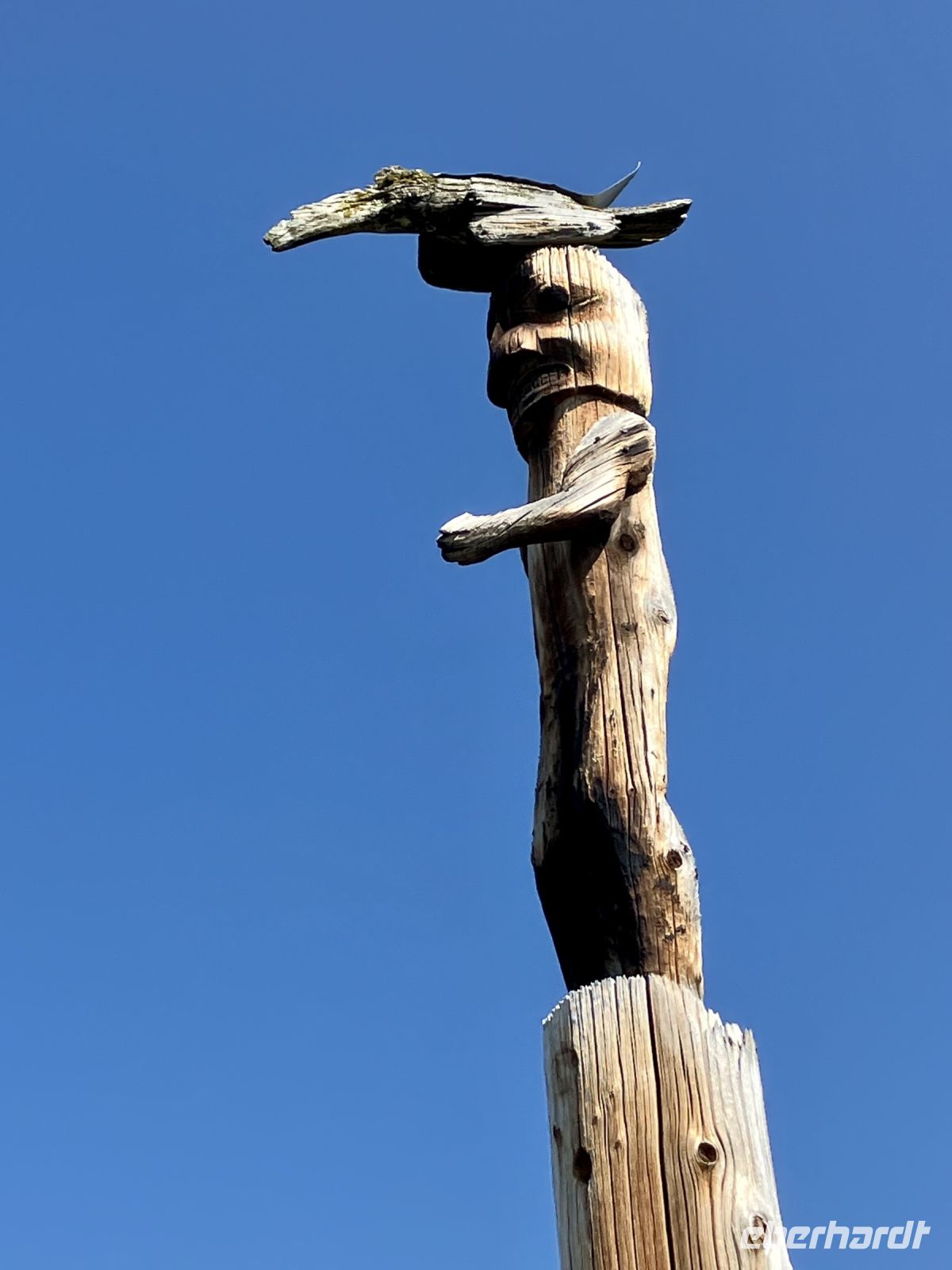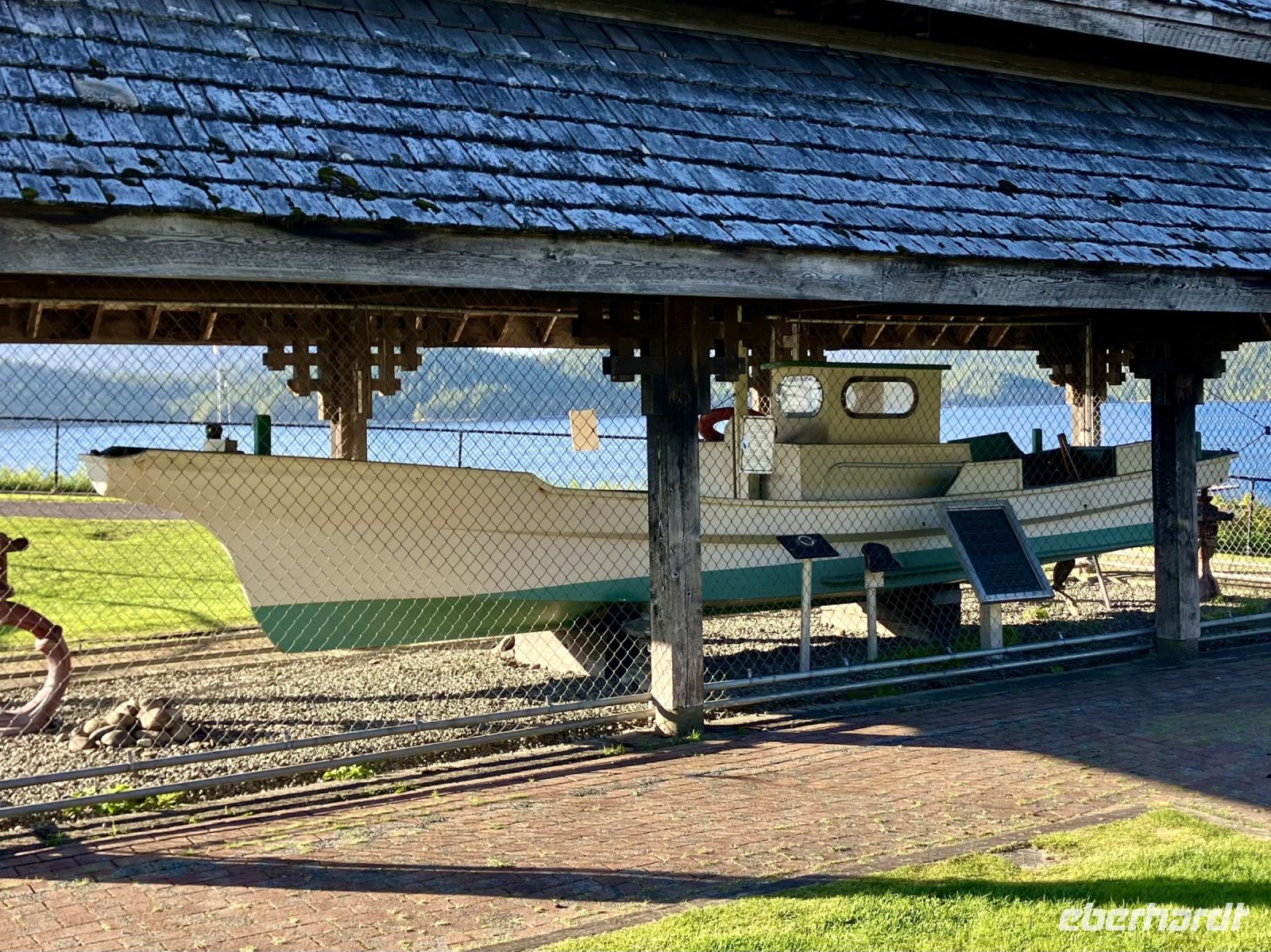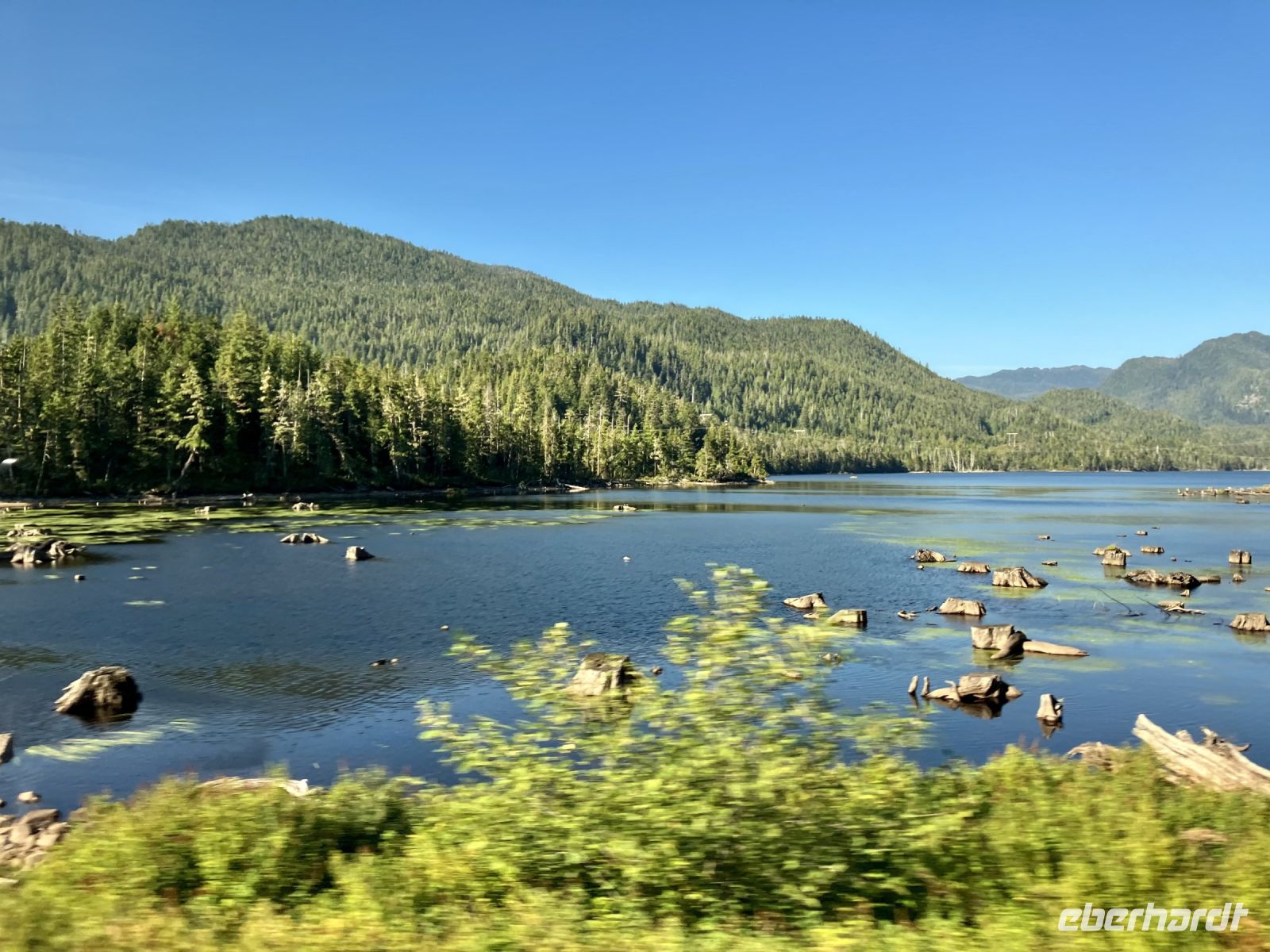 Ein wunderschoener Sonnentag bricht an. Wir haben so ein Glueck, es ist kaum zu glauben. Wir sind im tiefen Regenwald in der strahlenden Sonne. Tracy hat auch unseren Bus wieder auf Hochglanz poliert nach der gestrigen Staubstrasse. So verlassen wir zeitig Stewart und fahren bis nach Gitanyow ins Reservat der Gixsan. Aber ploetzlich piepst es im Armaturenbrett, Tracy haelt an, steigt aus, au weh, grosse Rauchwolke hinten am Bus. Klappe auf, Rauchwolke noch dichter. Die Strasse ist leer, es ist Samstag morgen. Es gibt keine Verbindung, kein Netz, wir stehen mitten im Wald. Die Strasse zeigt uns, dass wir Kuehlwasser verloren haben. Nicht lange danach, haelt ein grosser Lastwagen und der Fahrer hilft Tracy den Kuehlwasserschlauch wieder an den Tank anzuschliessen. Durch die Strasse gestern muss er sich geloest haben. Der LKW-Fahrer gibt uns auch Kuehlwasser, aber er hat bloss 4 Gallonen bei sich. Somit koennen wir wenigstens bis zur naechsten und einzigen Tankstelle auf der fat 300 Km Strecke fahren. Leider hat die Tankstelle kein Kuehlwasser und so bleiben wir nach weiteren 60 Km wieder stecken. Ein Camper aus Minnesota haelt an und verschickt ueber Satelit ein SOS. Unterdessen fuellen wir den Kuehlwasser Tank mit Trinkwasser und fahren dann auch bald einmal weiter Richtung Kreuzung mit der Gelbkopfstrasse die uns ans Meer fuehren wird. Ehe wir bei der Kreuzung sind halten wir noch, wie geplant in zwei verschiedenen Reservaten an. In Gitanyow und bestaunen wir das Indianerdorf und seine schoenen Totem (uuups, ich bitte um Entschuldigung ! Politisch korrekt heisst das: die geschichtserzaehlenden Pfaehle der Ersten Nationen. Aber eben, es ist zu lange fuer einen Reisebericht !) Einheimische sehen wir nur wenige. Der General Store wurde neu ausgebaut und ist jetzt modern mit Softdrinks und Chips aller Arten ausstaffiert. Weiter geht es in noch ein anderes echtes Indianerdorf mit seinen vielen Totempfaehlen. Kitwanga heisst dieses Dorf und seine Totem stehen alle in Reih und Glied. Einige stehen schoen gerade und andere neigen sich bereits. Einer ist umgefallen und liegt nun im Grass und darf dort ruhen, bis er nicht von der Natur zurueckgeholt wird. Unterdessen aber……hat uns die US Polizei, welche den SOS Notruf erhalten hat, nicht lokaliesieren koennen. Sie haben die RCMP (kanadische Polizei) in Kenntnis gesetzt, dass ein Bus irgendwo auf der HWY 37 gestrandet sei. Eine intensive Suchaktion mit Streifenwagen und Helikopter wurde nun gestartet. Wir wissen aber nichts davon. Wir stecken ja auch in Reservate die von der RCMP ausgeschlossen sind. Das Reise-und das Busunternehmen werden benachrichtet, dass der Bus verschwunden und nicht auffindbar sei. Panik. Wo ist die Reisegruppe, gekidnappt ? Bloss Elisabeth’s Anruf bei der Kreuzung, wo man auch wieder vernetzt ist, lichtet die Paniksituation und stoppt die Suchaktion. Wir wurden nicht gekidnappt und sind auch nie verloren gegangen, wir hatten bloss kein Kuehlwasser ! Unterdessen hat Tracy auch Kuehlwasserkonzentrat kaufen koennen und die Welt ist wieder rund. Wir biegen in den Westen ab und fahren in Richtung Terrace. Dort gibts dann einen Kaffee und Kuchen dazu. Dem Skeena River entlang, sehen wir auch viele Fliegenfischer die wie Totempfaehle dem Ufer entlang stehen und einen Lachs nach dem andern herausholen. Am spaeteren Nachmittag kommen wir in Prince Rupert an. Nach der kurzen Stadtrundfahrt checken wir in unser Hotel ein um danach noch etwas Freizeit zu geniessen und ein wenig einkaufen zu gehen. Unser Abendessen ist in einem schoenen Restaurant in der Naehe des Hotels. Das Essen ist auch hier wieder sehr lecker. Wir gehen heute auch etwas frueher schlafen denn Morgen – Au Weh !