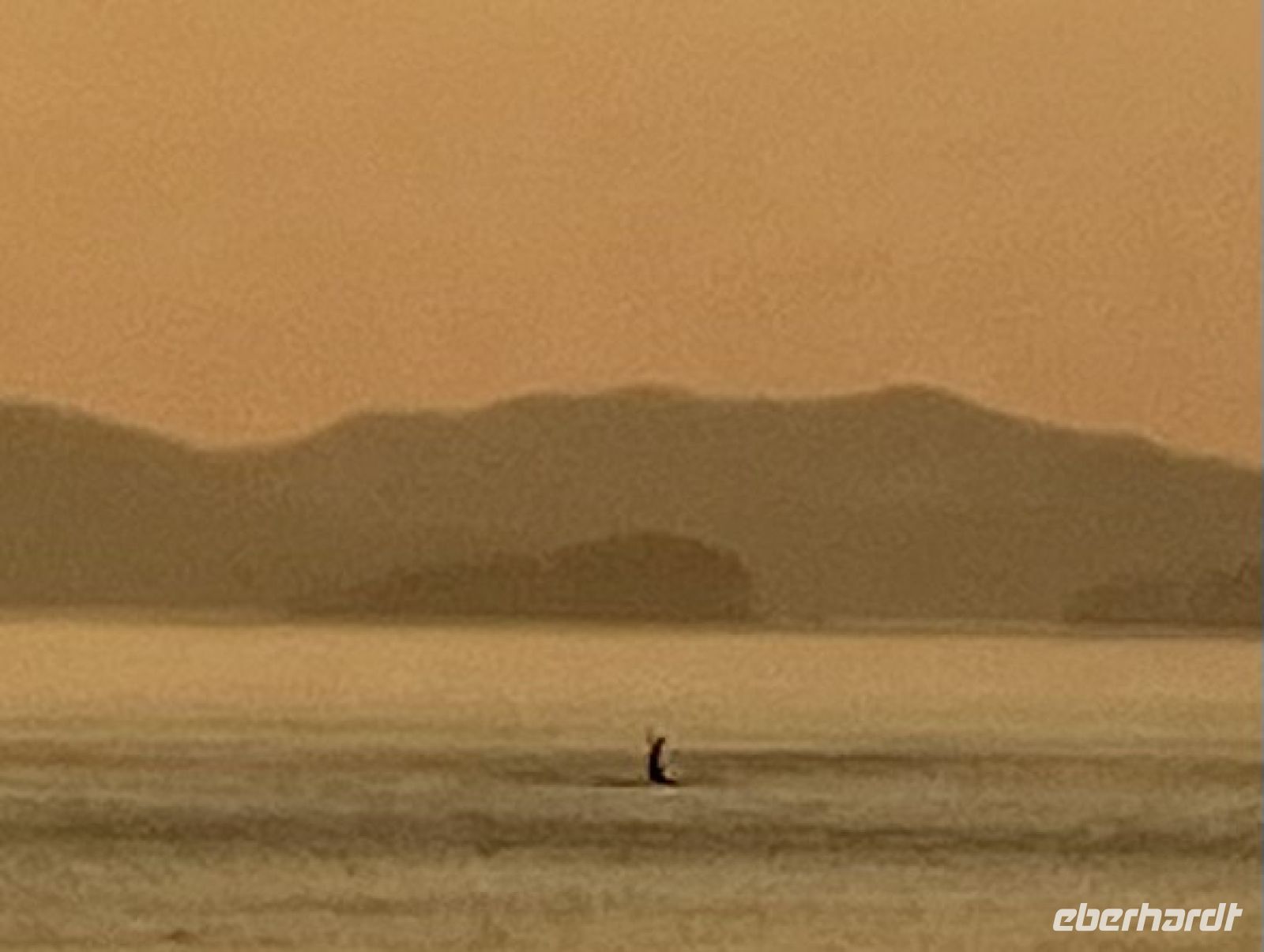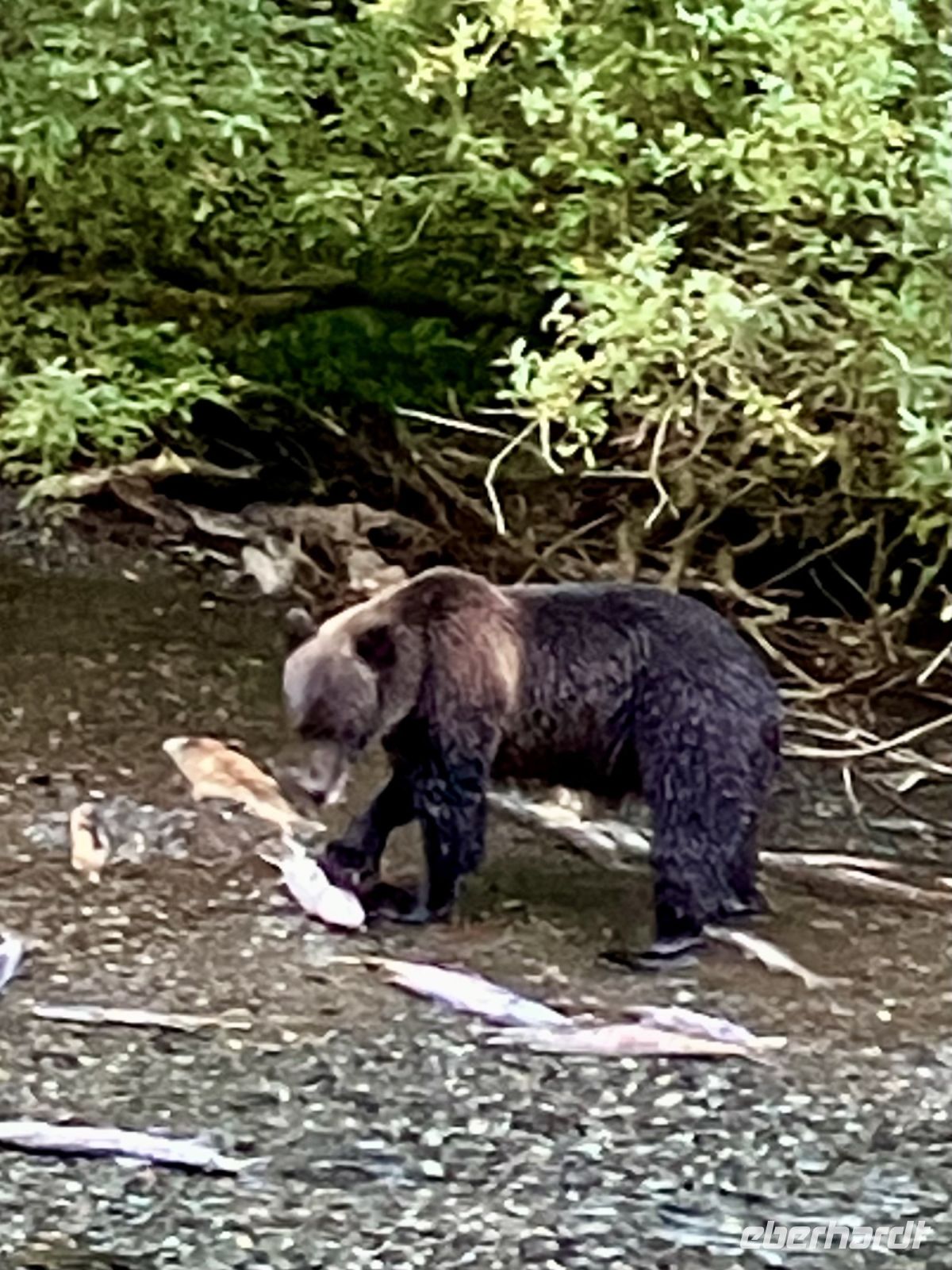 Oh schau….da, auf der anderen Seite der Terrasse, da steht er. Ein grosser dunkelbrauner Grizzly mit einem hellen Kragen und Buckel. Es ist derselbe Griyylz von heute Nachmittag. Jetzt aber ist er hungrig. Er ist jung und schlank und huepft von Lachs zu Lachs. Die Fische schrecken alle zur Seite und der junge Springinsfeld muss sich anfangs ganz schoen anstrengen um einen zu fangen. Ach so, er will nicht jeden Lachs, er sucht sich nur die groessten weiblichen Lachse aus. Mit seiner riesen Tatze wird ein Lachs nach dem anderen gefangen, der Bauch wird geoeffnet, die Eier werden herausgesogen und dann gehts an das Gehirn und die Augen. Manche auserwaehlte Lachse werden fast zur Gaenze aufgefressen so schmackhaft muessen sie sein. Schaut Euch die Bilder in Galerie an. Unser Grizzly war so nahe, wir konnten seine Nasenloecher kontrollieren ! Wenn wir das wollten. Nun koennt ihr Euch vorstellen, wie viele Fotos da geknipst wurden. Es wird eine lange Nacht denn die Bilder wollen nun alle aussortiert werden.