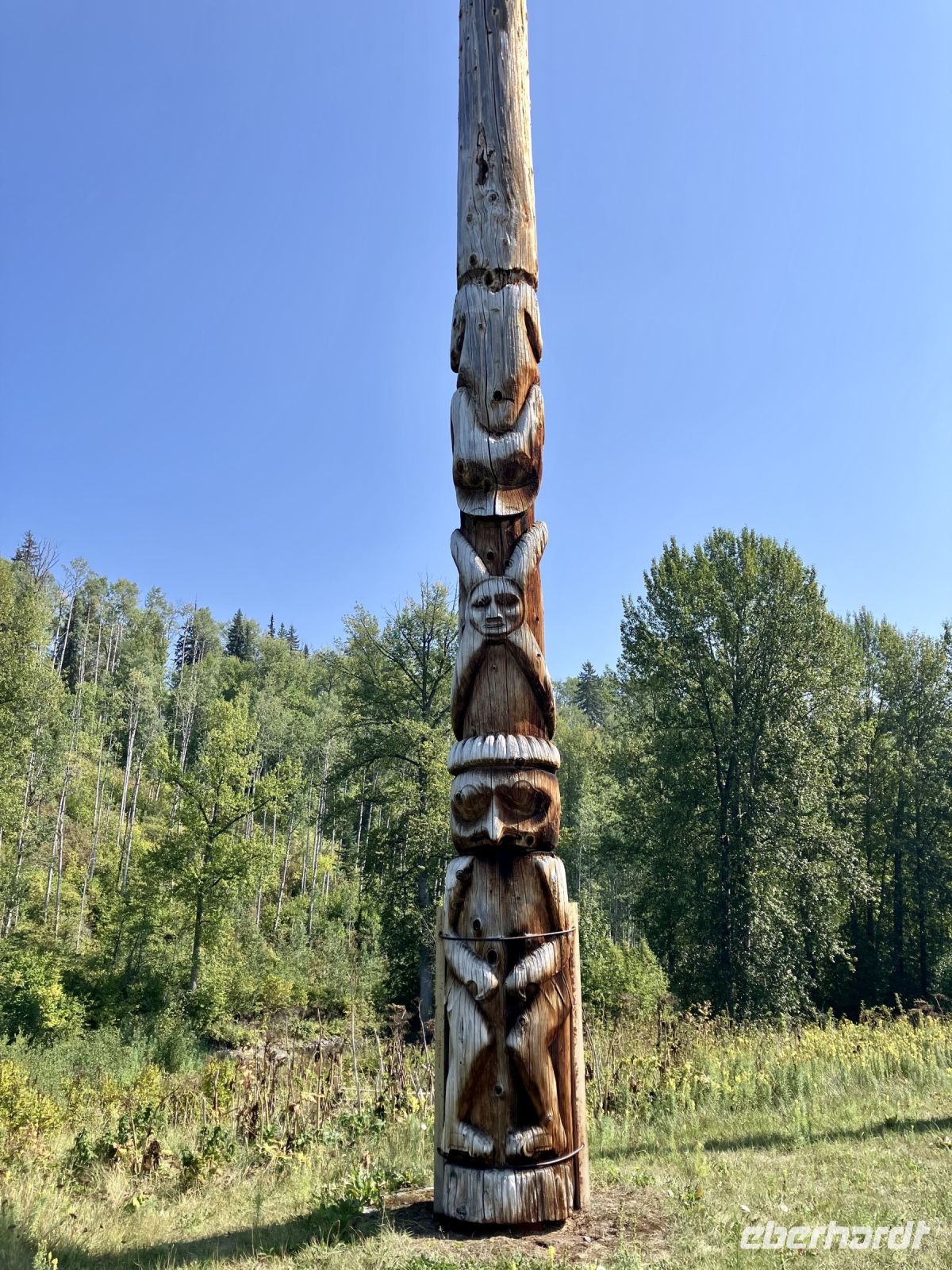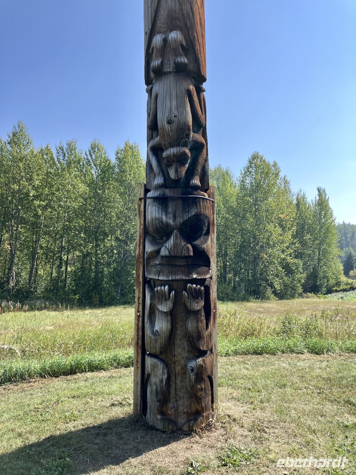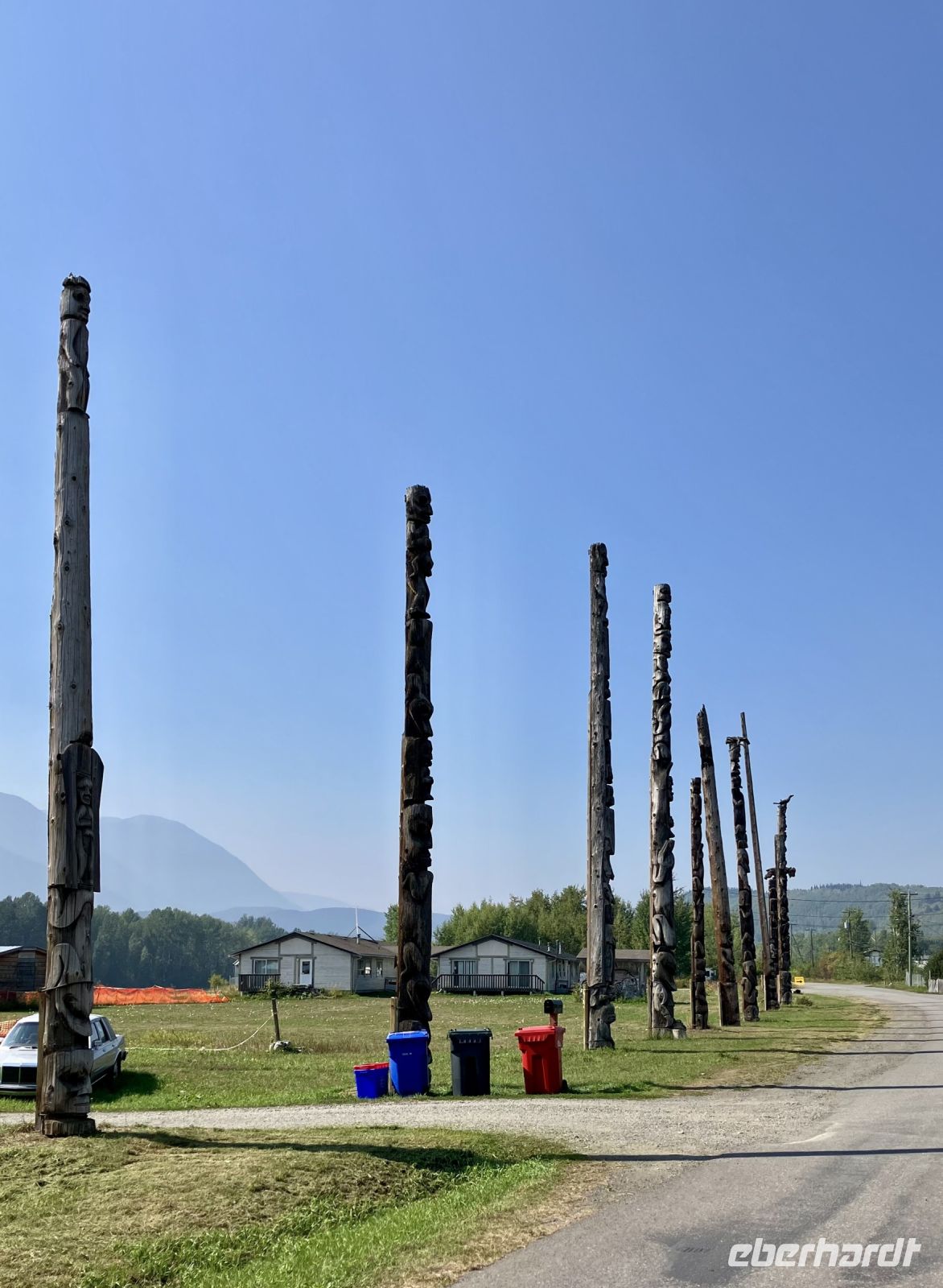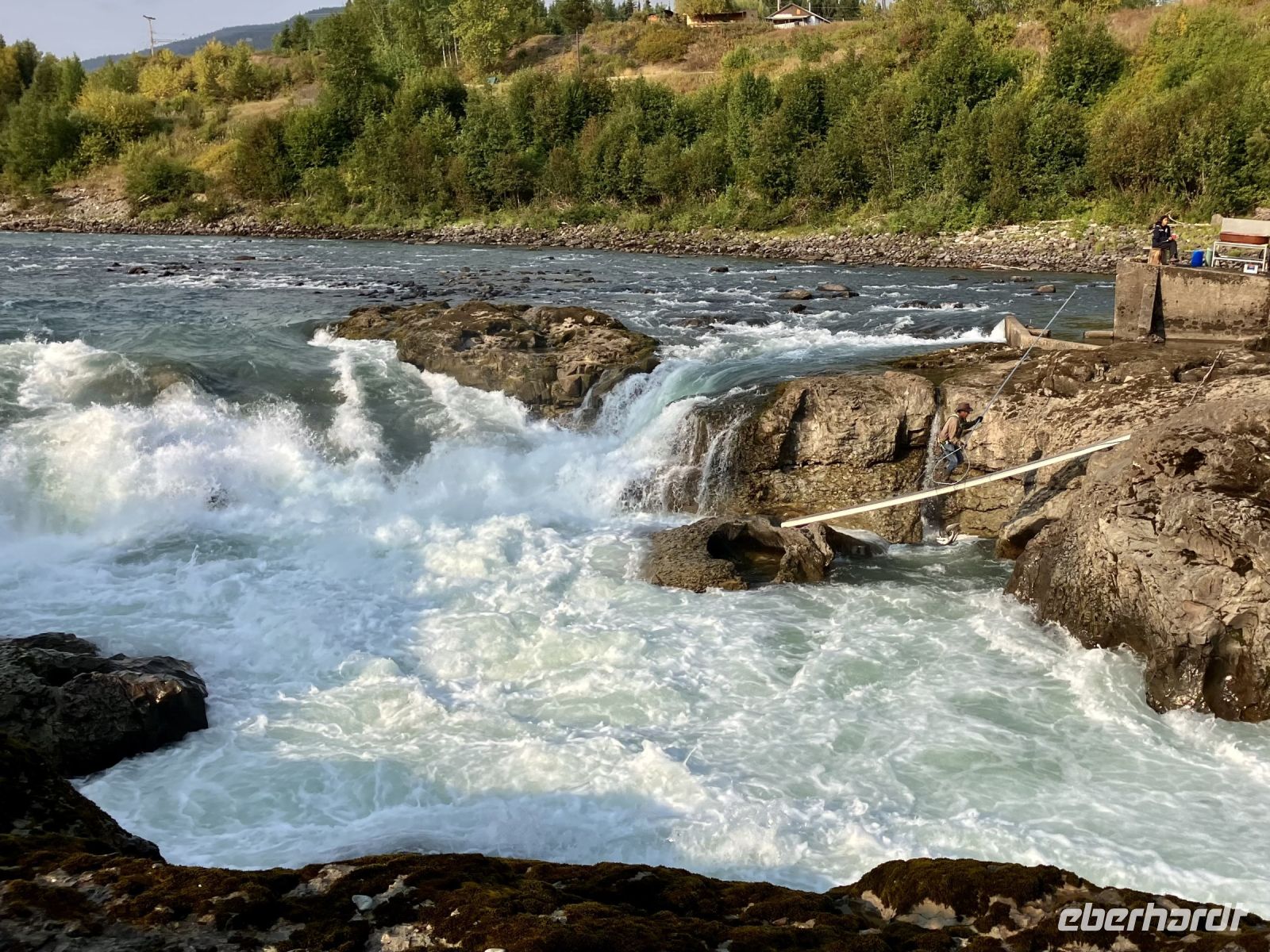 Oh wieder strahlende Sonne, das verschoenert jede Bilderschau. Heute haben wir unseren «Erste Nationen Tag«. Das wird interessant, denn als Erstes gibt es ein richtig kanadisches Fruehstueck mit viel Speck, Ruehrei, Kartoffeln und natuerlich Fruechten, Brot und was man sonst noch alles essen koennte frueh morgens. So fahren wir nach dem Picknickeinkauf (welches einige gestern nicht geschafft haben) gemuetlich aus Smithers raus in Richtung Hazelton. Der breite schoene Bulkley River fliesst sanft rechts der Strasse entlang. Bald sind wir bei Morricetown welches nun seinen Namen in Wesket veraendert hat. Ein Ort der Ersten Nationen. Hier beschleunigen Felsen den Fluss und in der Schnelle sehen wir schon von weitem wie einige Leute mit ihren langen Koecher auf Felsvorspruengen stehend Lachse fischen. Ach wie toll ! So steigen wir auch aus und gehen die Felsen runter, Elisabeth’s Warnung zu Herzen nehmend. Die Lachse springen die 2 Wasserfaelle hinauf werden aber von den Fischern geradezu aus dem Wasser herausgetragen. Kaum an der frischen Luft, werden die gefangenen Lachse kontrolliert, gewogen und gemessen. Es ist echt intressant, diesem Treiben zuzuschauen.