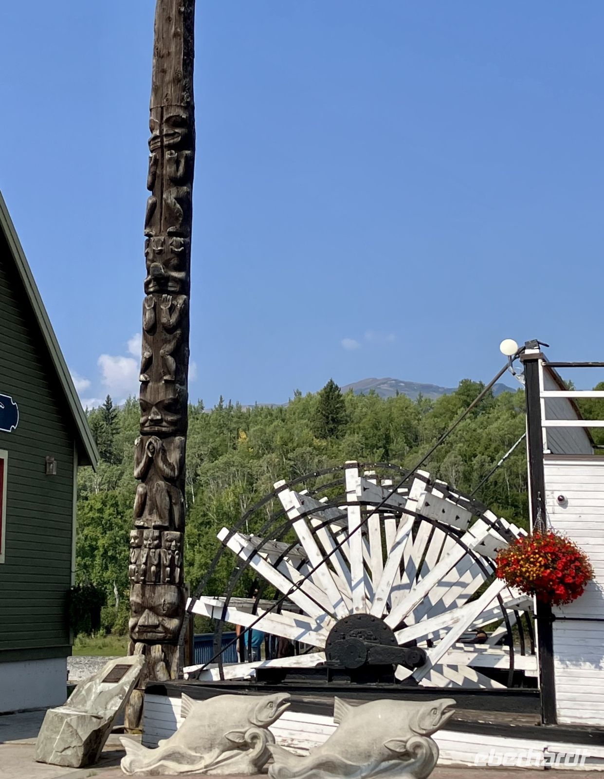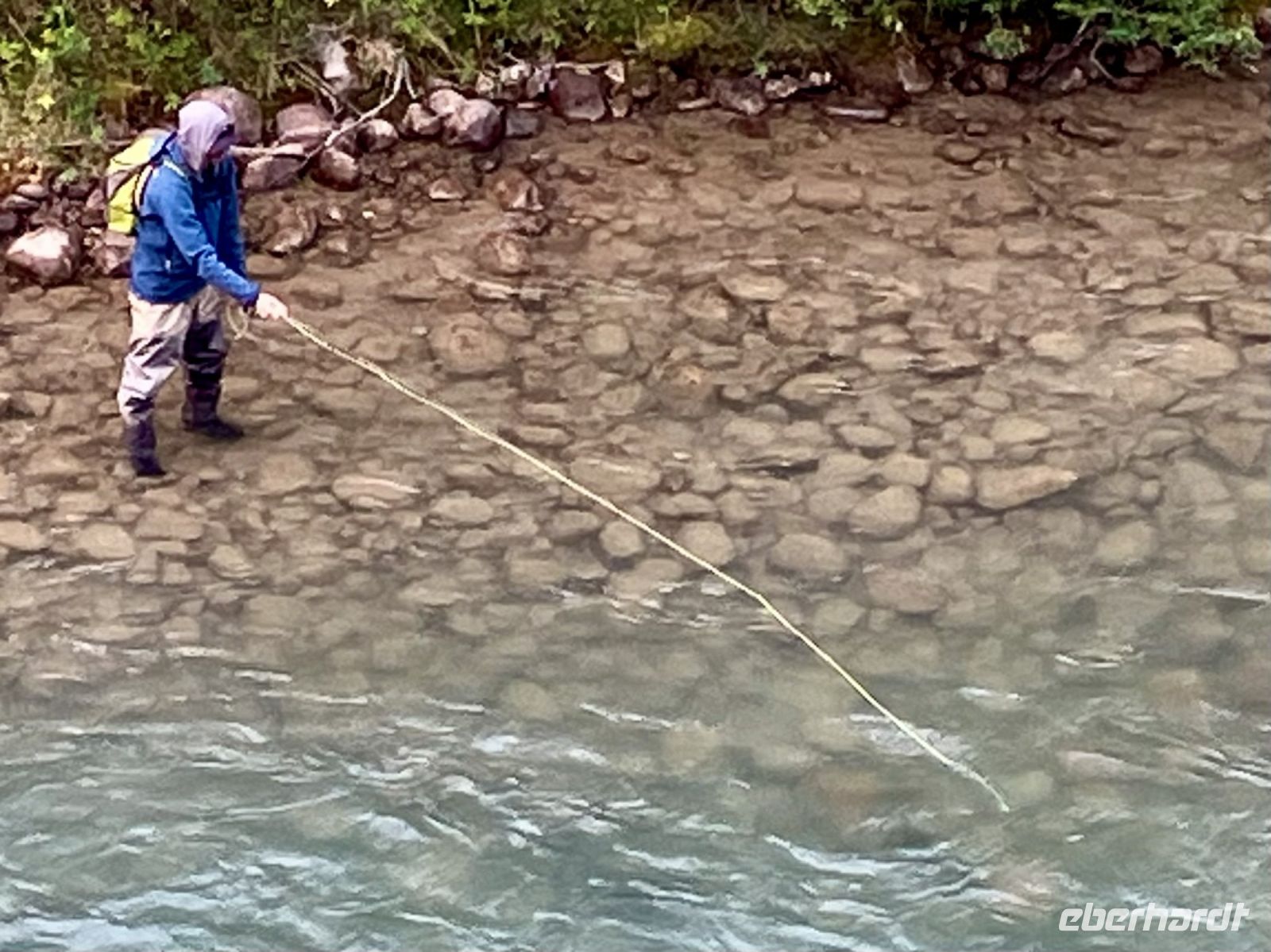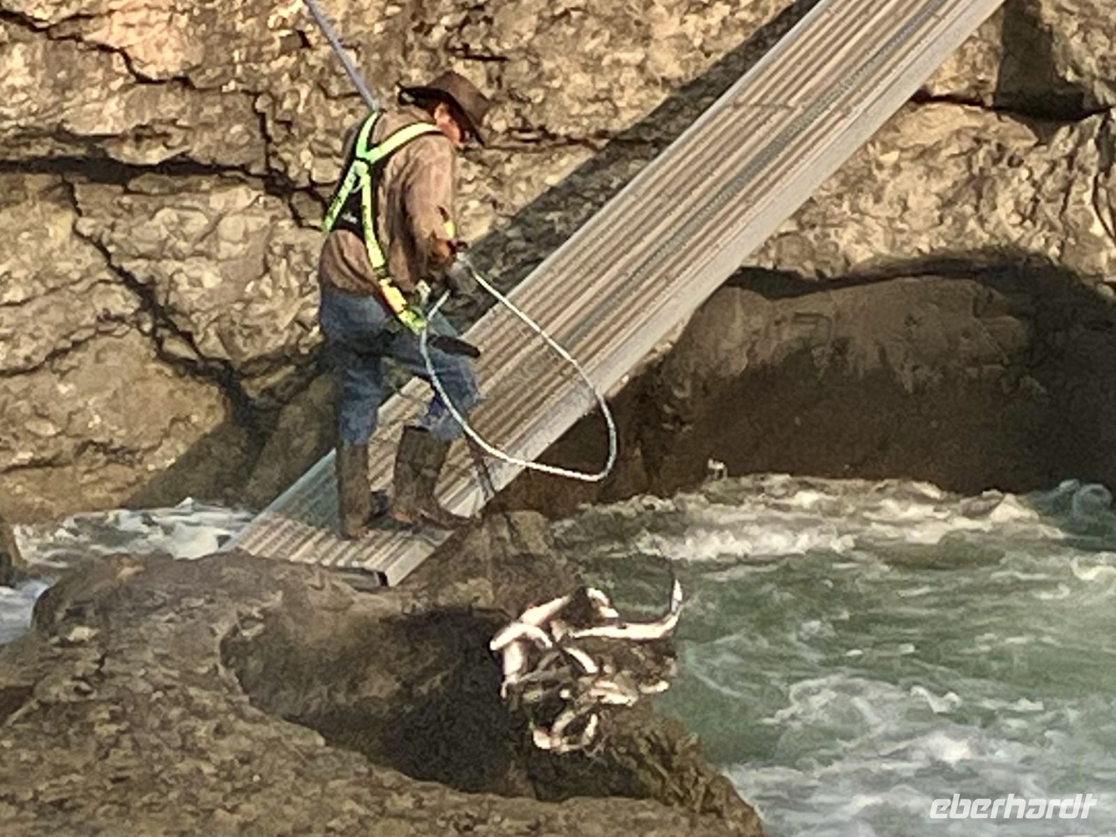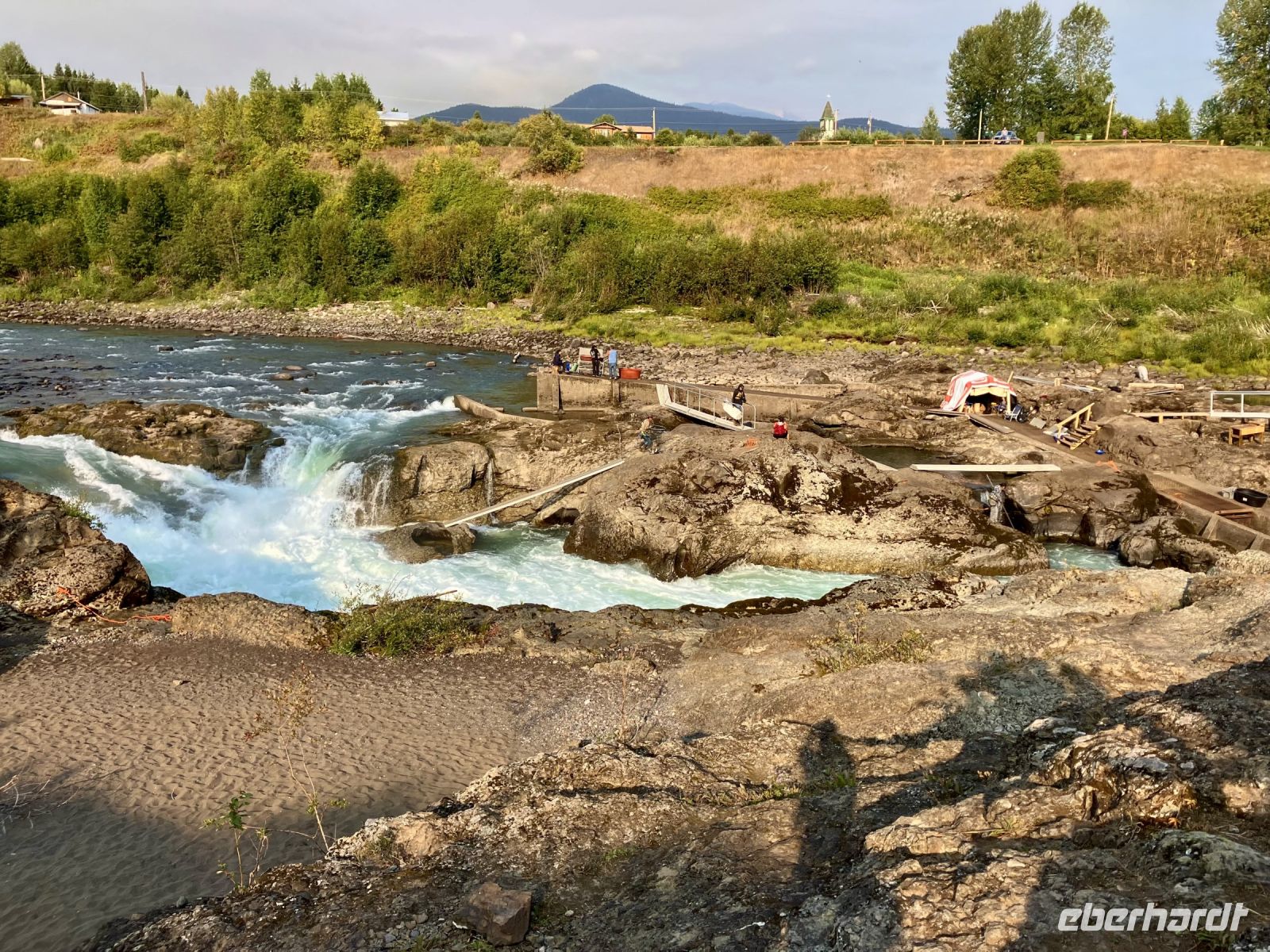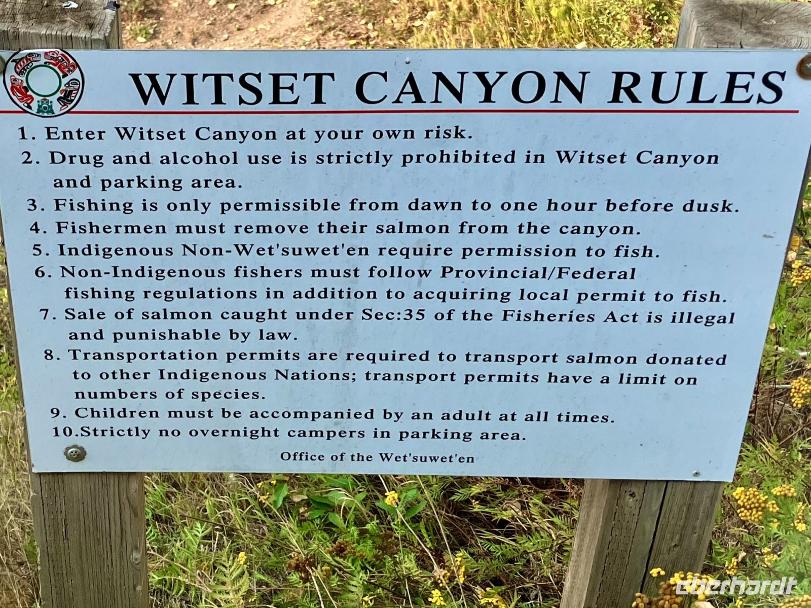 Oh wieder strahlende Sonne, das verschoenert jede Bilderschau. Heute haben wir unseren «Erste Nationen Tag«. Das wird interessant, denn als Erstes gibt es ein richtig kanadisches Fruehstueck mit viel Speck, Ruehrei, Kartoffeln und natuerlich Fruechten, Brot und was man sonst noch alles essen koennte frueh morgens. So fahren wir nach dem Picknickeinkauf (welches einige gestern nicht geschafft haben) gemuetlich aus Smithers raus in Richtung Hazelton. Der breite schoene Bulkley River fliesst sanft rechts der Strasse entlang. Bald sind wir bei Morricetown welches nun seinen Namen in Wesket veraendert hat. Ein Ort der Ersten Nationen. Hier beschleunigen Felsen den Fluss und in der Schnelle sehen wir schon von weitem wie einige Leute mit ihren langen Koecher auf Felsvorspruengen stehend Lachse fischen. Ach wie toll ! So steigen wir auch aus und gehen die Felsen runter, Elisabeth’s Warnung zu Herzen nehmend. Die Lachse springen die 2 Wasserfaelle hinauf werden aber von den Fischern geradezu aus dem Wasser herausgetragen. Kaum an der frischen Luft, werden die gefangenen Lachse kontrolliert, gewogen und gemessen. Es ist echt intressant, diesem Treiben zuzuschauen.