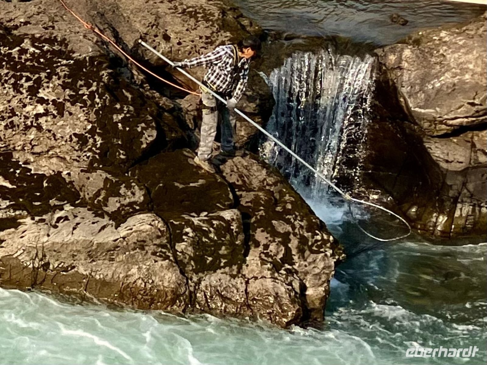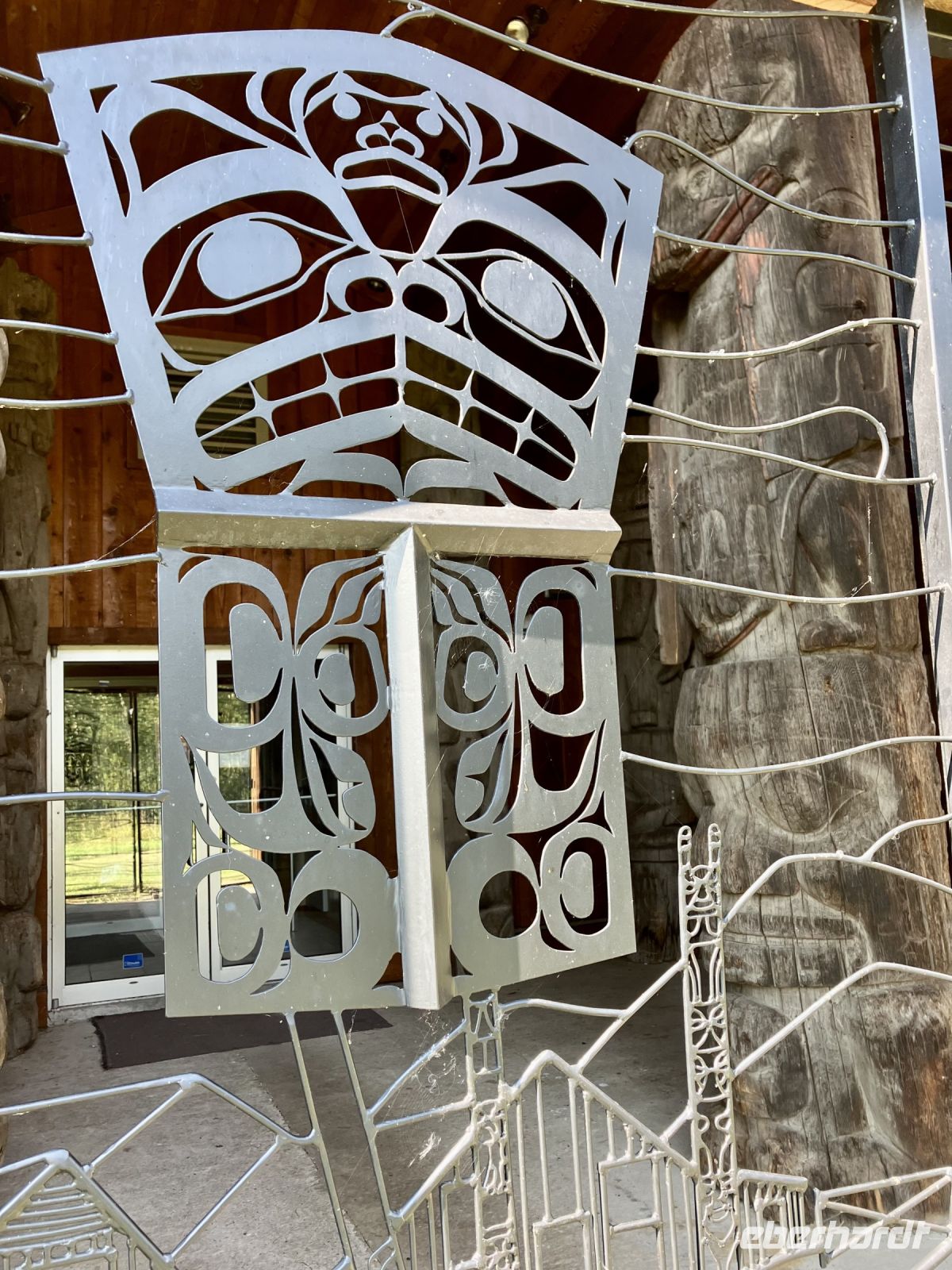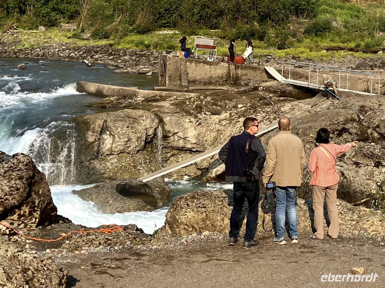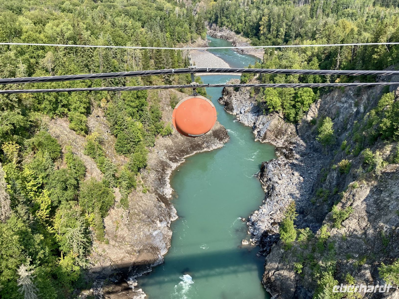 Oh wieder strahlende Sonne, das verschoenert jede Bilderschau. Heute haben wir unseren «Erste Nationen Tag«. Das wird interessant, denn als Erstes gibt es ein richtig kanadisches Fruehstueck mit viel Speck, Ruehrei, Kartoffeln und natuerlich Fruechten, Brot und was man sonst noch alles essen koennte frueh morgens. So fahren wir nach dem Picknickeinkauf (welches einige gestern nicht geschafft haben) gemuetlich aus Smithers raus in Richtung Hazelton. Der breite schoene Bulkley River fliesst sanft rechts der Strasse entlang. Bald sind wir bei Morricetown welches nun seinen Namen in Wesket veraendert hat. Ein Ort der Ersten Nationen. Hier beschleunigen Felsen den Fluss und in der Schnelle sehen wir schon von weitem wie einige Leute mit ihren langen Koecher auf Felsvorspruengen stehend Lachse fischen. Ach wie toll ! So steigen wir auch aus und gehen die Felsen runter, Elisabeth’s Warnung zu Herzen nehmend. Die Lachse springen die 2 Wasserfaelle hinauf werden aber von den Fischern geradezu aus dem Wasser herausgetragen. Kaum an der frischen Luft, werden die gefangenen Lachse kontrolliert, gewogen und gemessen. Es ist echt intressant, diesem Treiben zuzuschauen.
