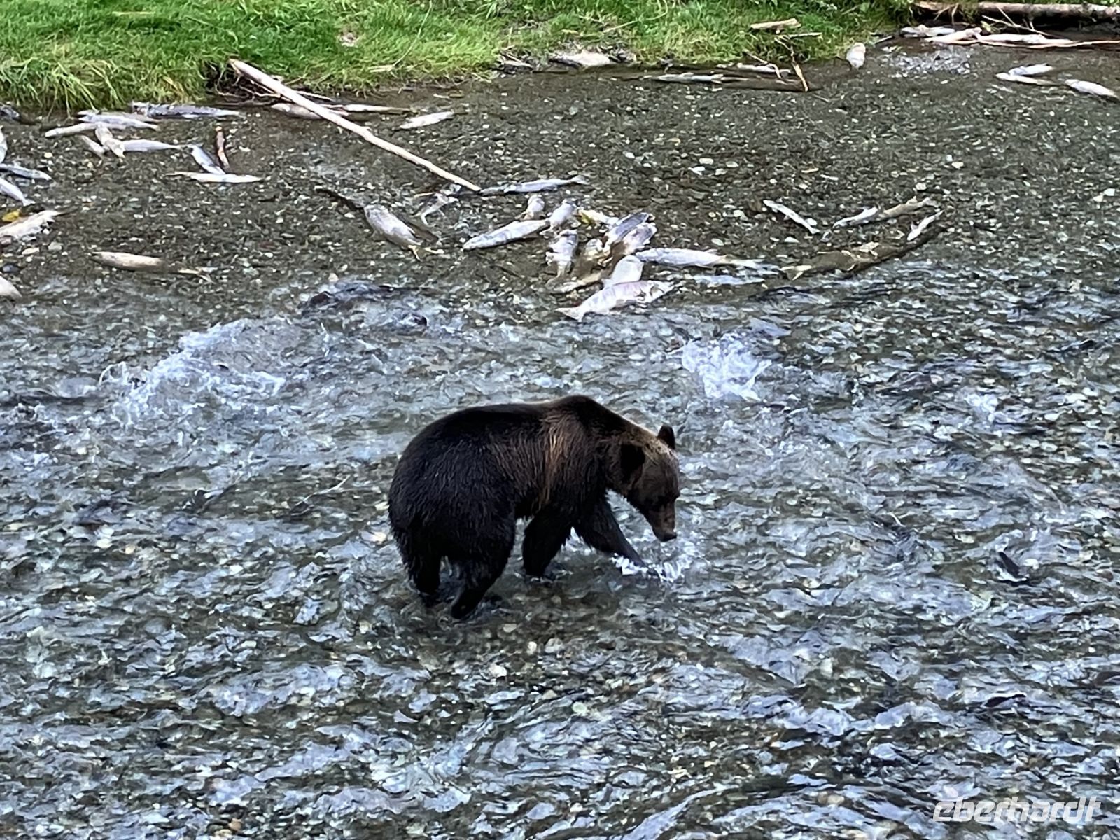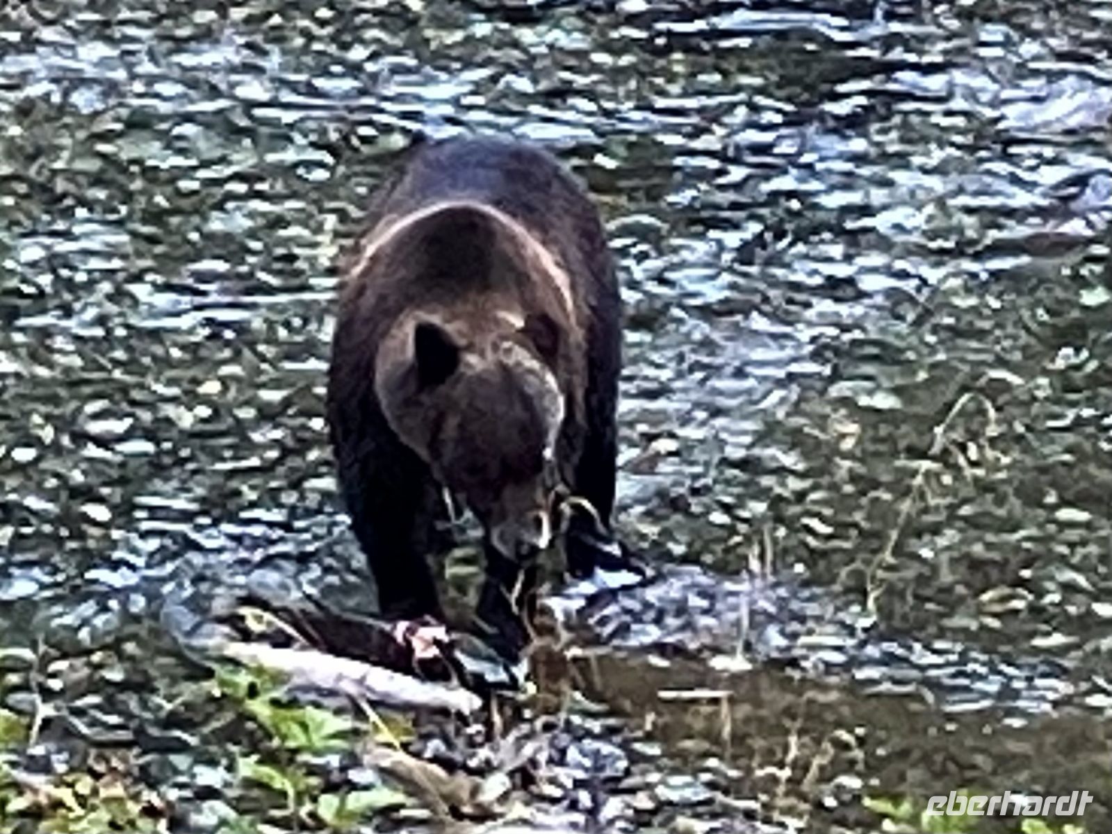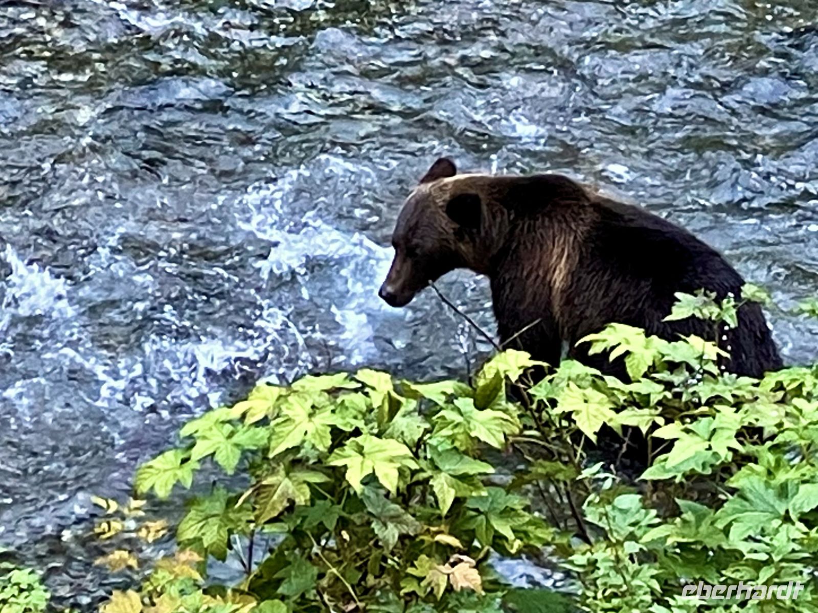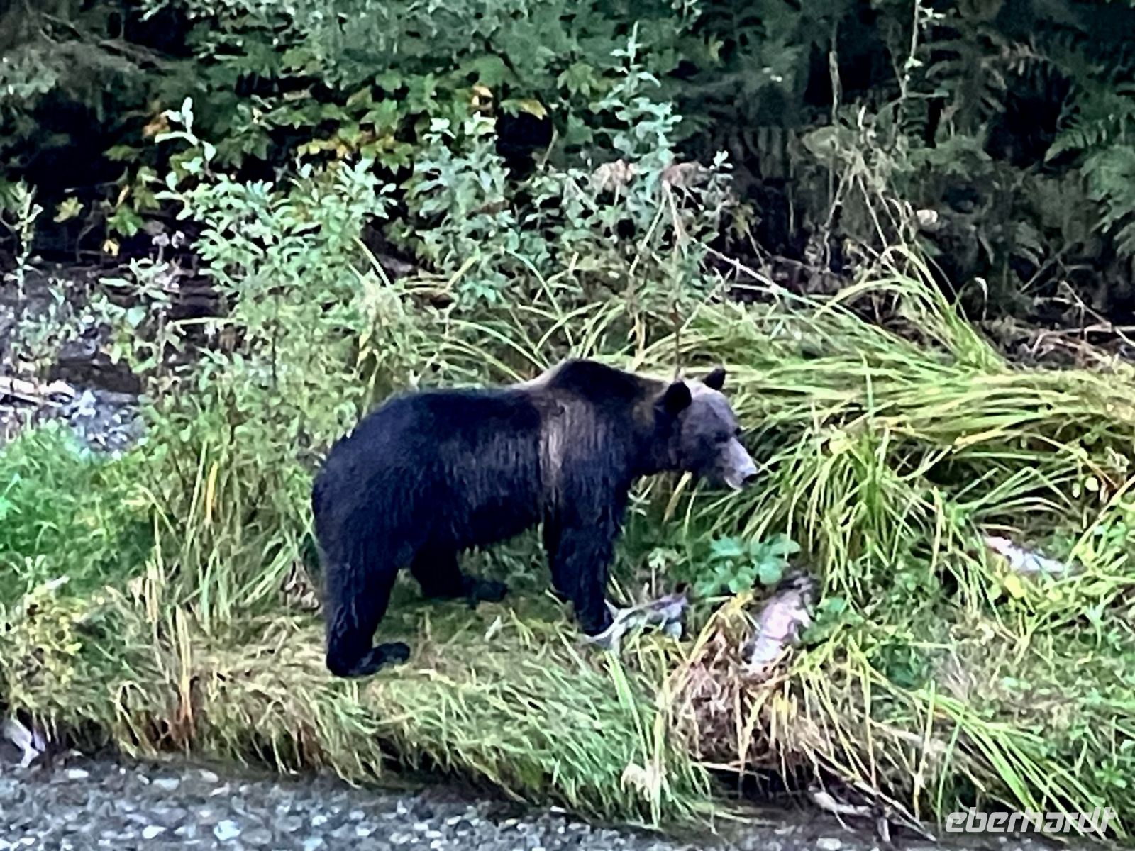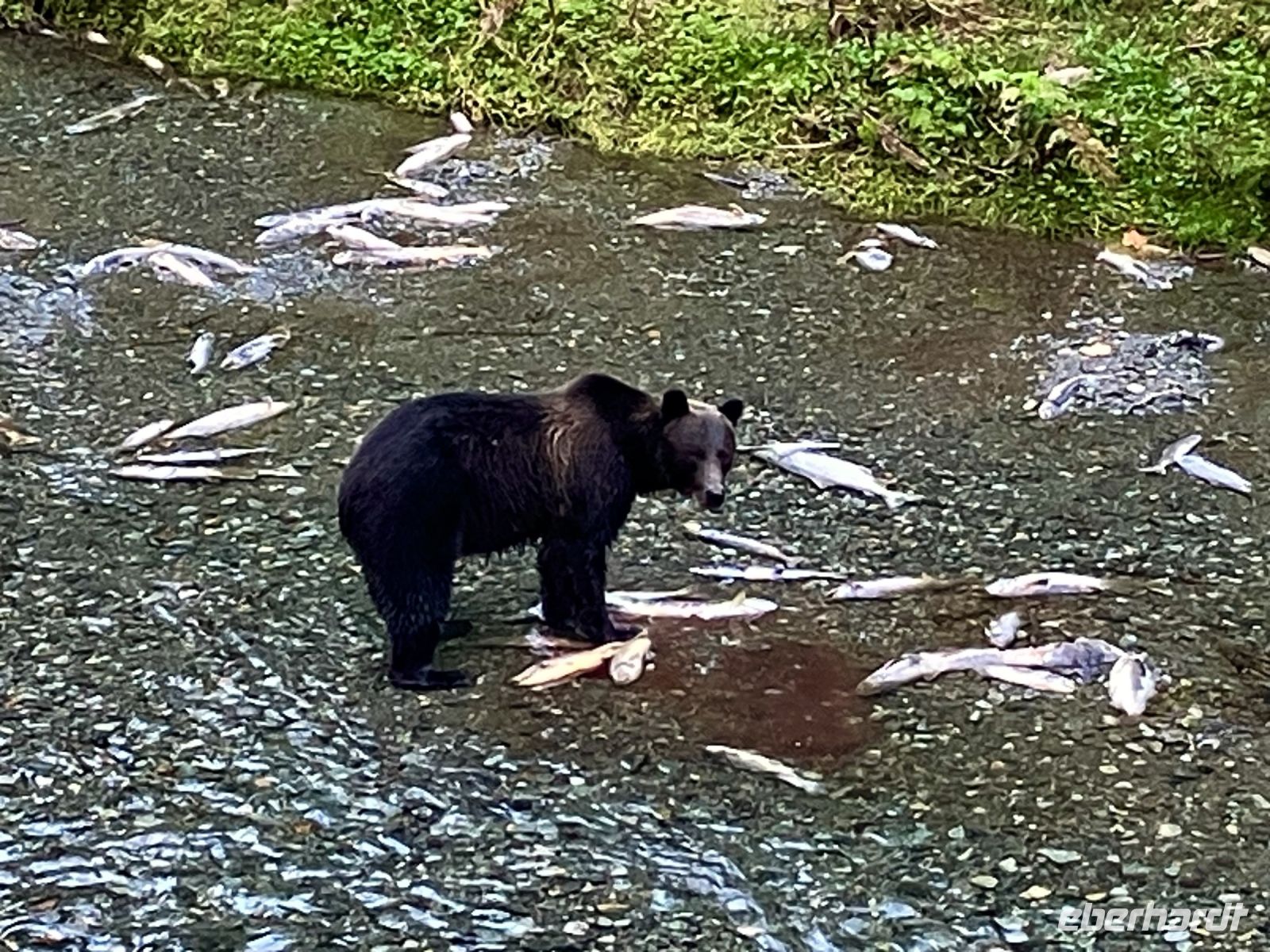 Heute fahren wir etwas eher ab, denn wir wollen zeitig bei der Baerenbeobachtung dabei sein. Nach dem ueppigen Fruehstuecksbuffet fahren wir gleich los, ueber die Grenze, nach Hyder, Alaska. Der erste Halt ist am Fish Creek........Ach ja, die halbe Stunde frueher auf, hat sich gelohnt. Schon auf dem Weg zur Baerenbeobachtung, sehen wir viele laichende Lachse in dem kleinen Fluss. Einmal auf der erhoeten Holzterrasse angekommen werden wir bereits mit der Sichtung eines wunderbaren grossen Schwarzbaeren verwoehnt. Er ist bereits am anderen Ende der Terrasse und wandert gemaechlich den Fluss hinunter bis wir ihn nicht mehr sehen. Nun passiert mal nichs mehr, wir knipsen Bilder der Lachse und wollen dann langsam gehen.