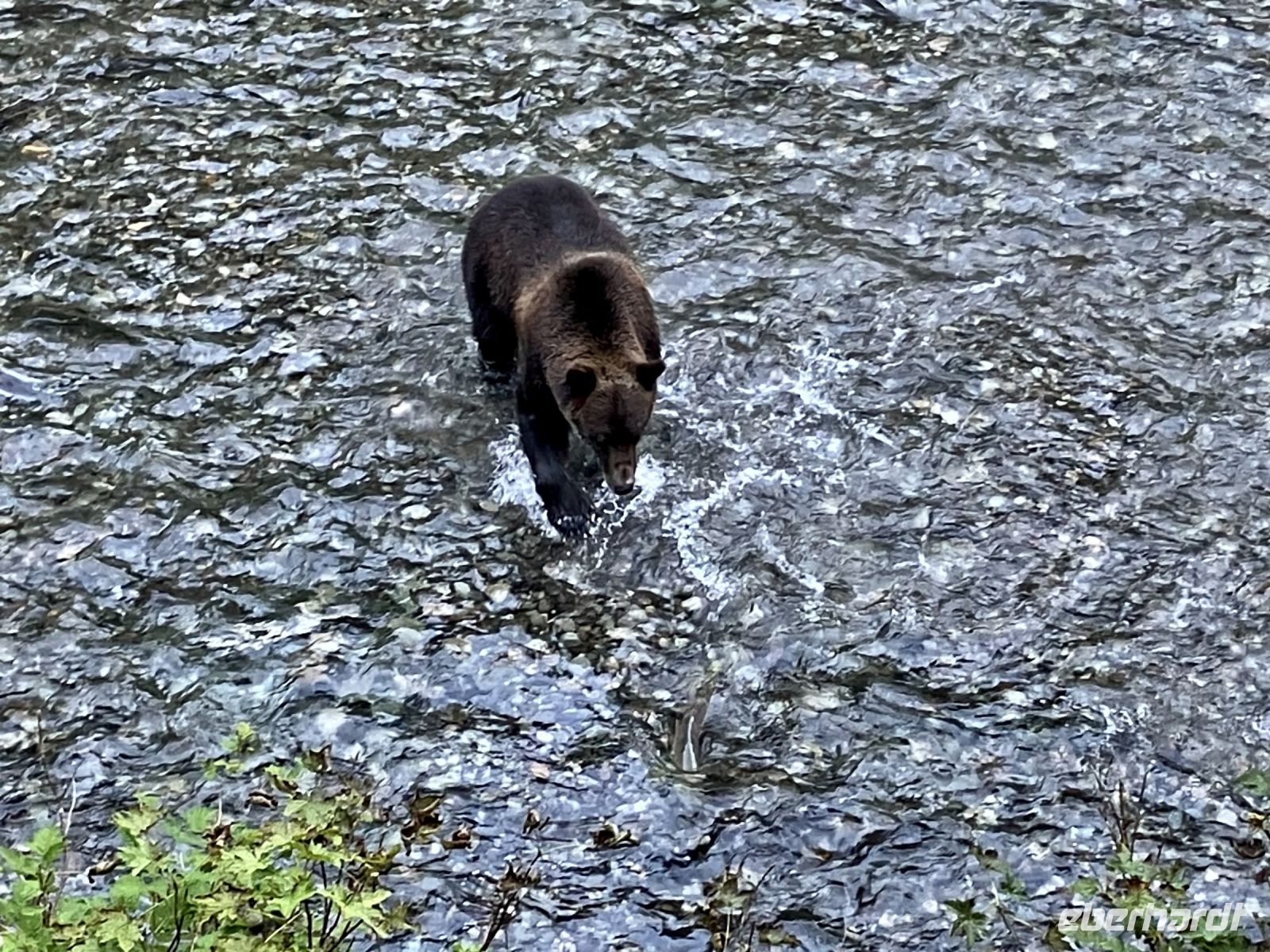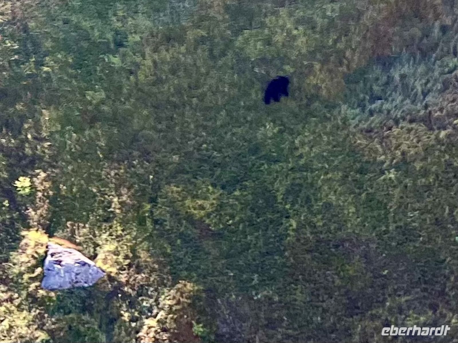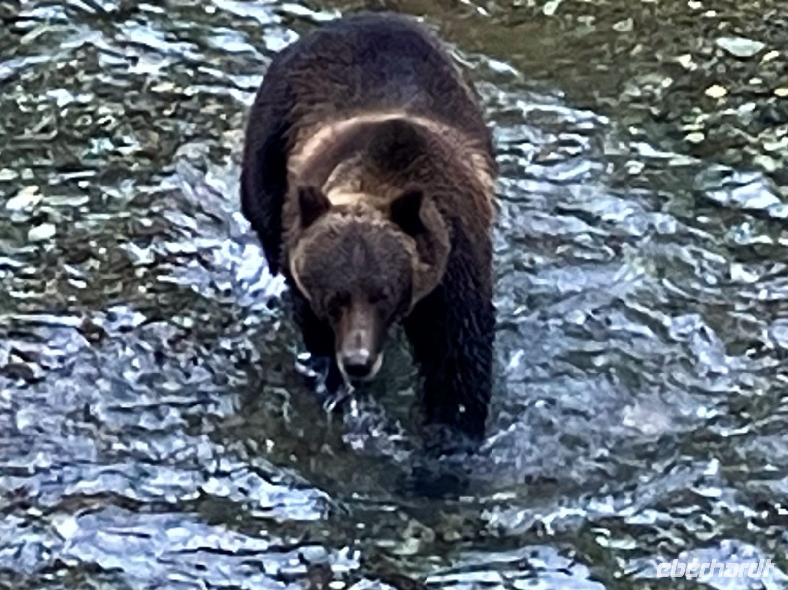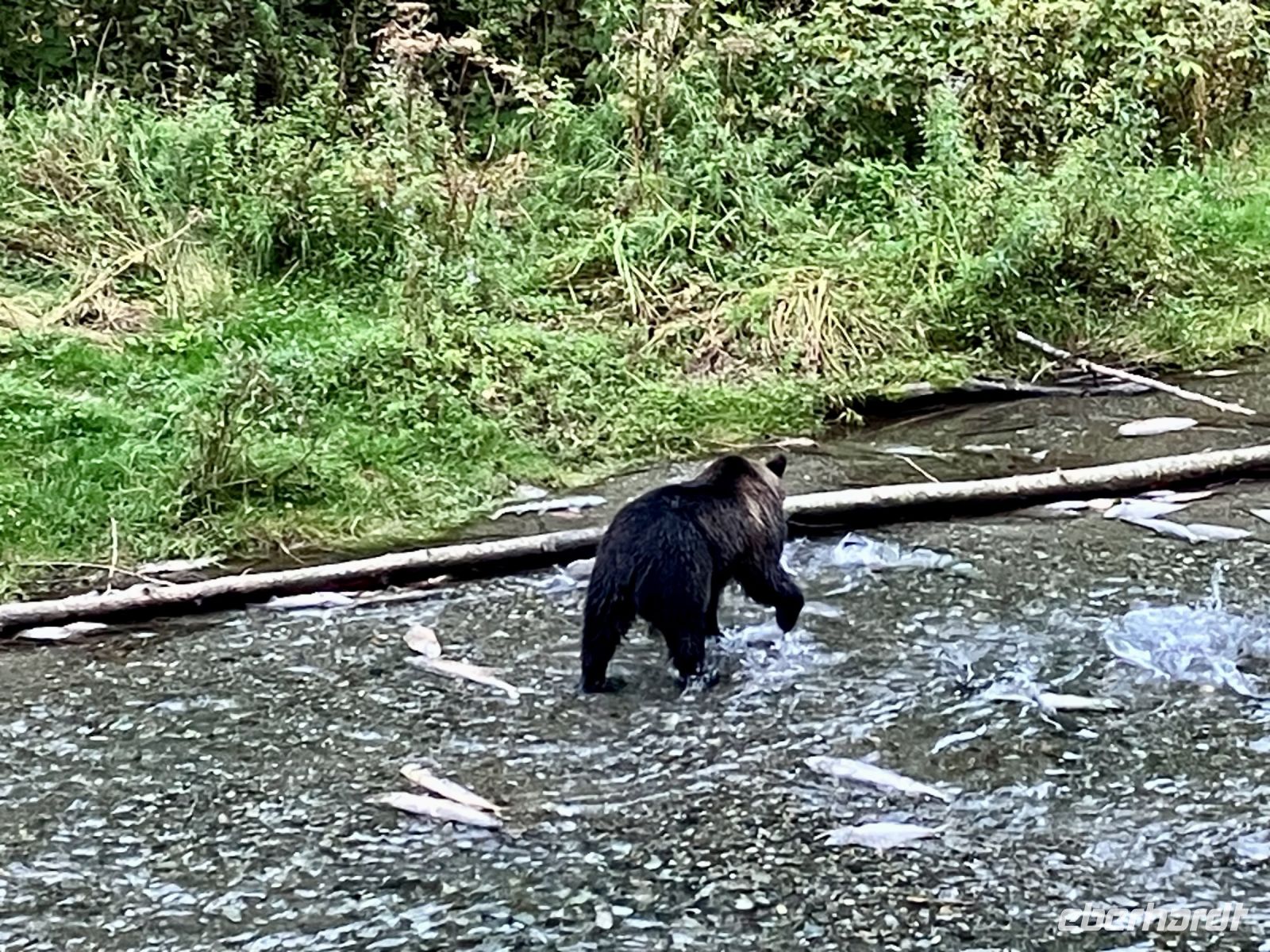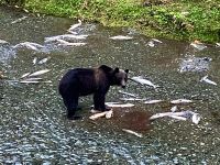 Heute fahren wir etwas eher ab, denn wir wollen zeitig bei der Baerenbeobachtung dabei sein. Nach dem ueppigen Fruehstuecksbuffet fahren wir gleich los, ueber die Grenze, nach Hyder, Alaska. Der erste Halt ist am Fish Creek........Ach ja, die halbe Stunde frueher auf, hat sich gelohnt. Schon auf dem Weg zur Baerenbeobachtung, sehen wir viele laichende Lachse in dem kleinen Fluss. Einmal auf der erhoeten Holzterrasse angekommen werden wir bereits mit der Sichtung eines wunderbaren grossen Schwarzbaeren verwoehnt. Er ist bereits am anderen Ende der Terrasse und wandert gemaechlich den Fluss hinunter bis wir ihn nicht mehr sehen. Nun passiert mal nichs mehr, wir knipsen Bilder der Lachse und wollen dann langsam gehen.