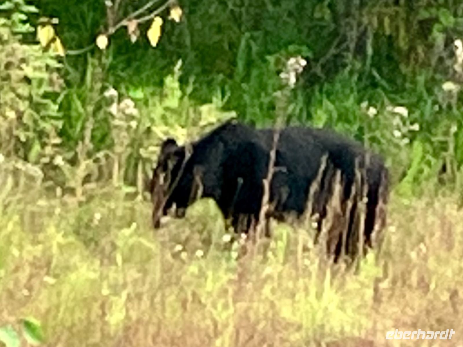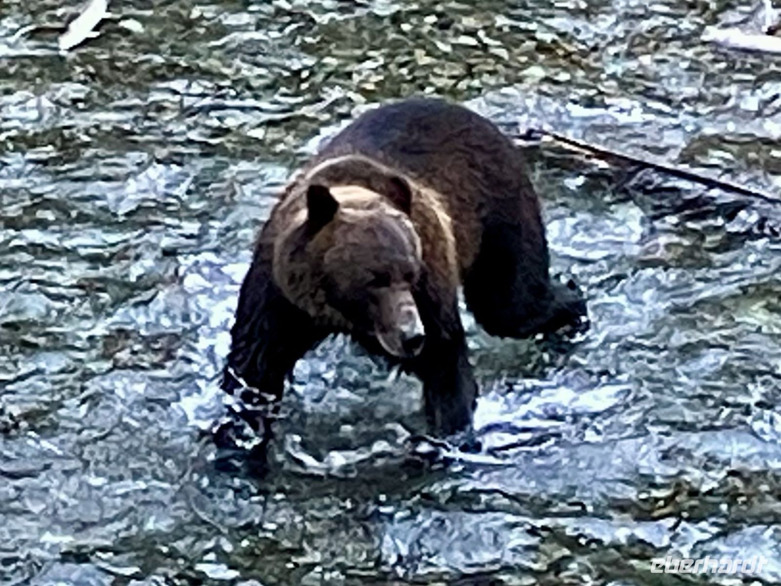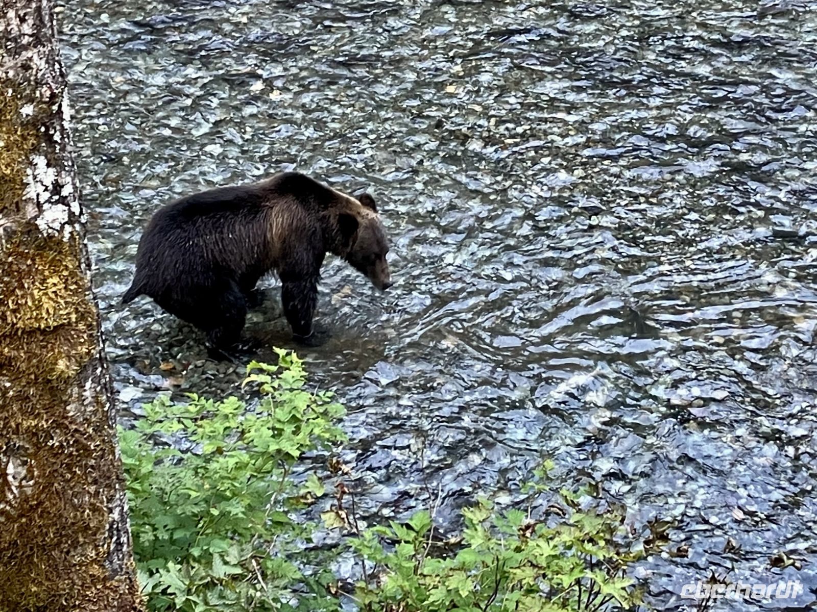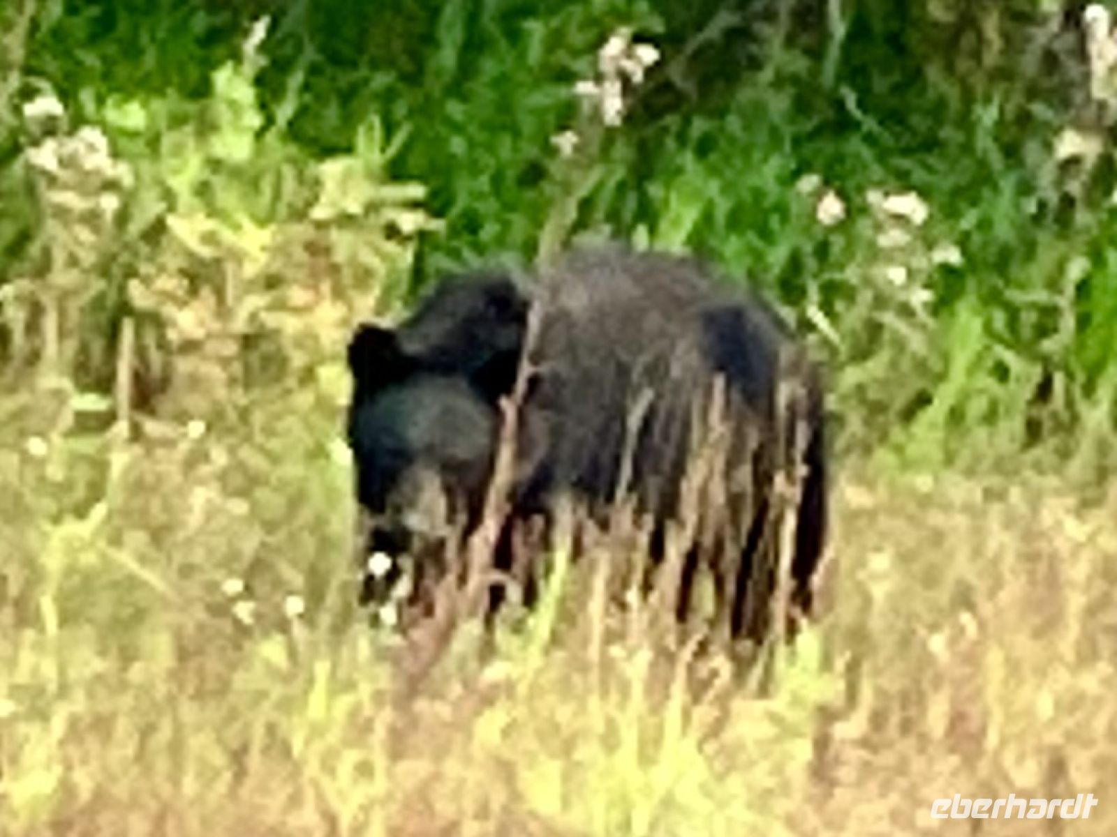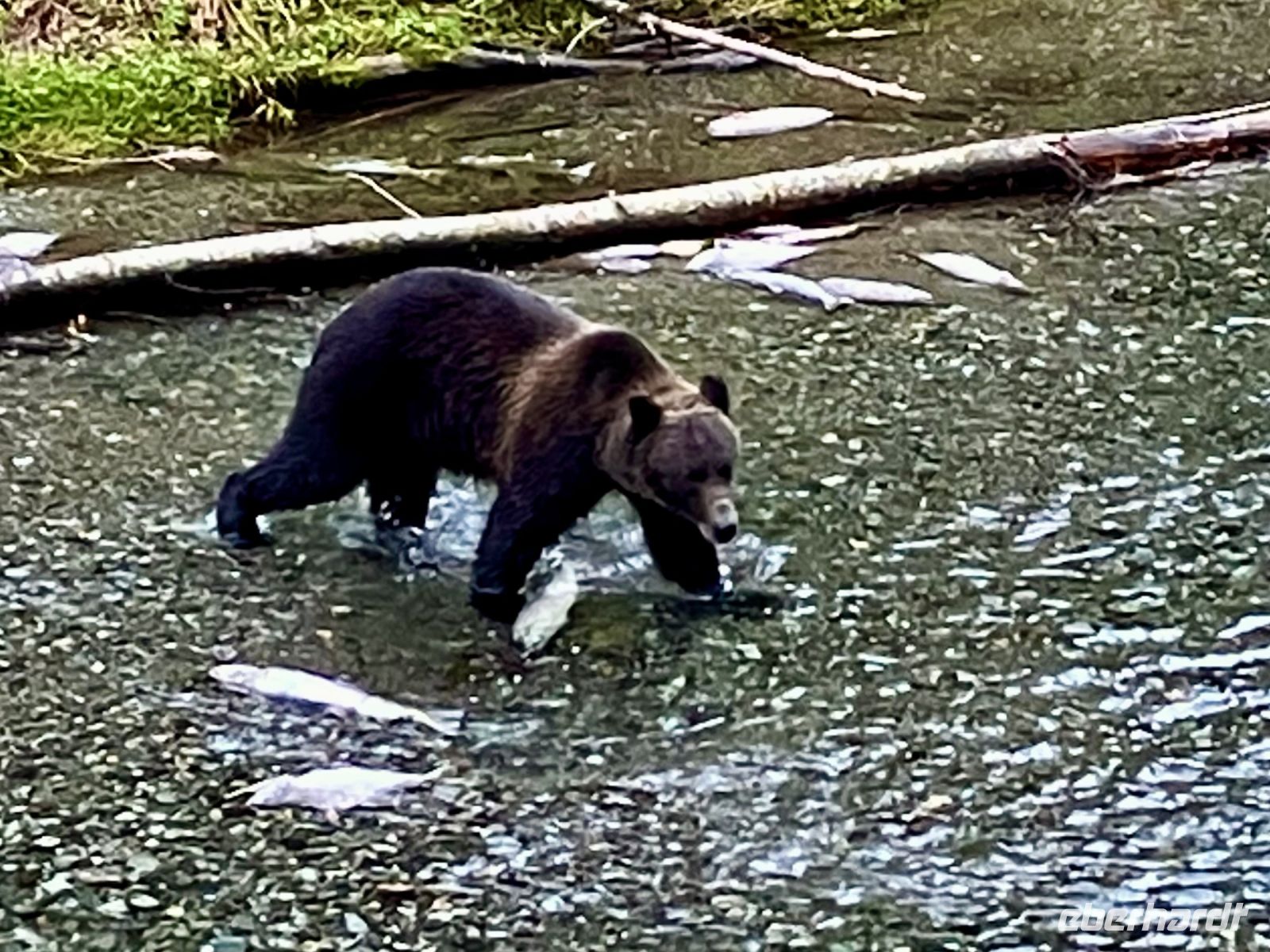 Heute fahren wir etwas eher ab, denn wir wollen zeitig bei der Baerenbeobachtung dabei sein. Nach dem ueppigen Fruehstuecksbuffet fahren wir gleich los, ueber die Grenze, nach Hyder, Alaska. Der erste Halt ist am Fish Creek........Ach ja, die halbe Stunde frueher auf, hat sich gelohnt. Schon auf dem Weg zur Baerenbeobachtung, sehen wir viele laichende Lachse in dem kleinen Fluss. Einmal auf der erhoeten Holzterrasse angekommen werden wir bereits mit der Sichtung eines wunderbaren grossen Schwarzbaeren verwoehnt. Er ist bereits am anderen Ende der Terrasse und wandert gemaechlich den Fluss hinunter bis wir ihn nicht mehr sehen. Nun passiert mal nichs mehr, wir knipsen Bilder der Lachse und wollen dann langsam gehen.