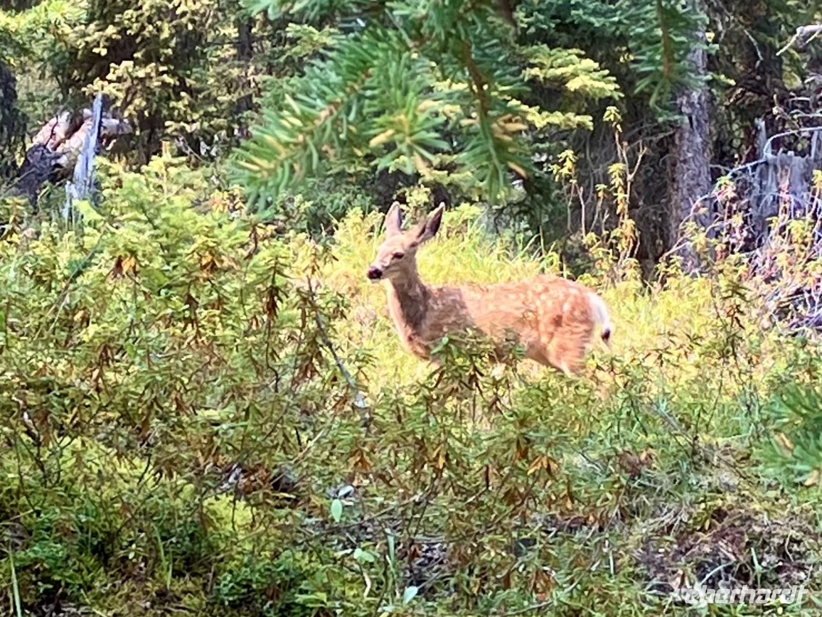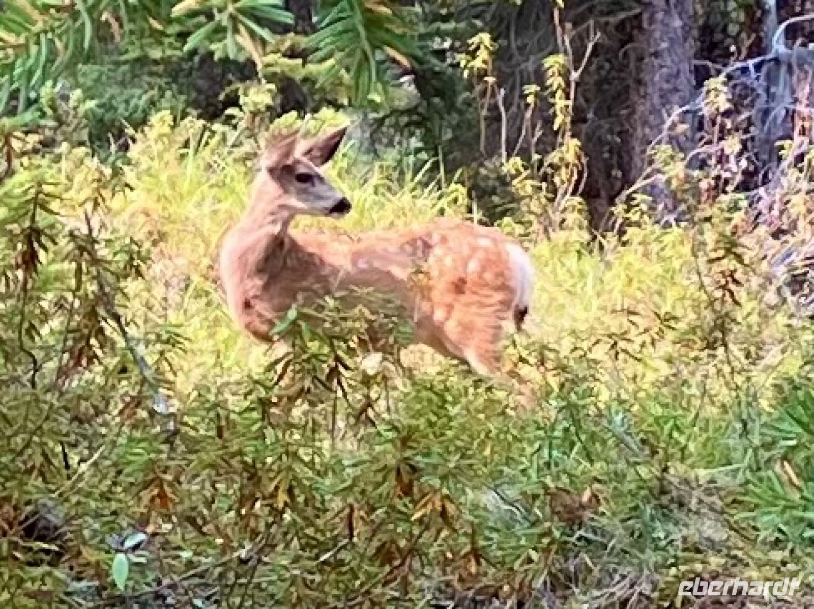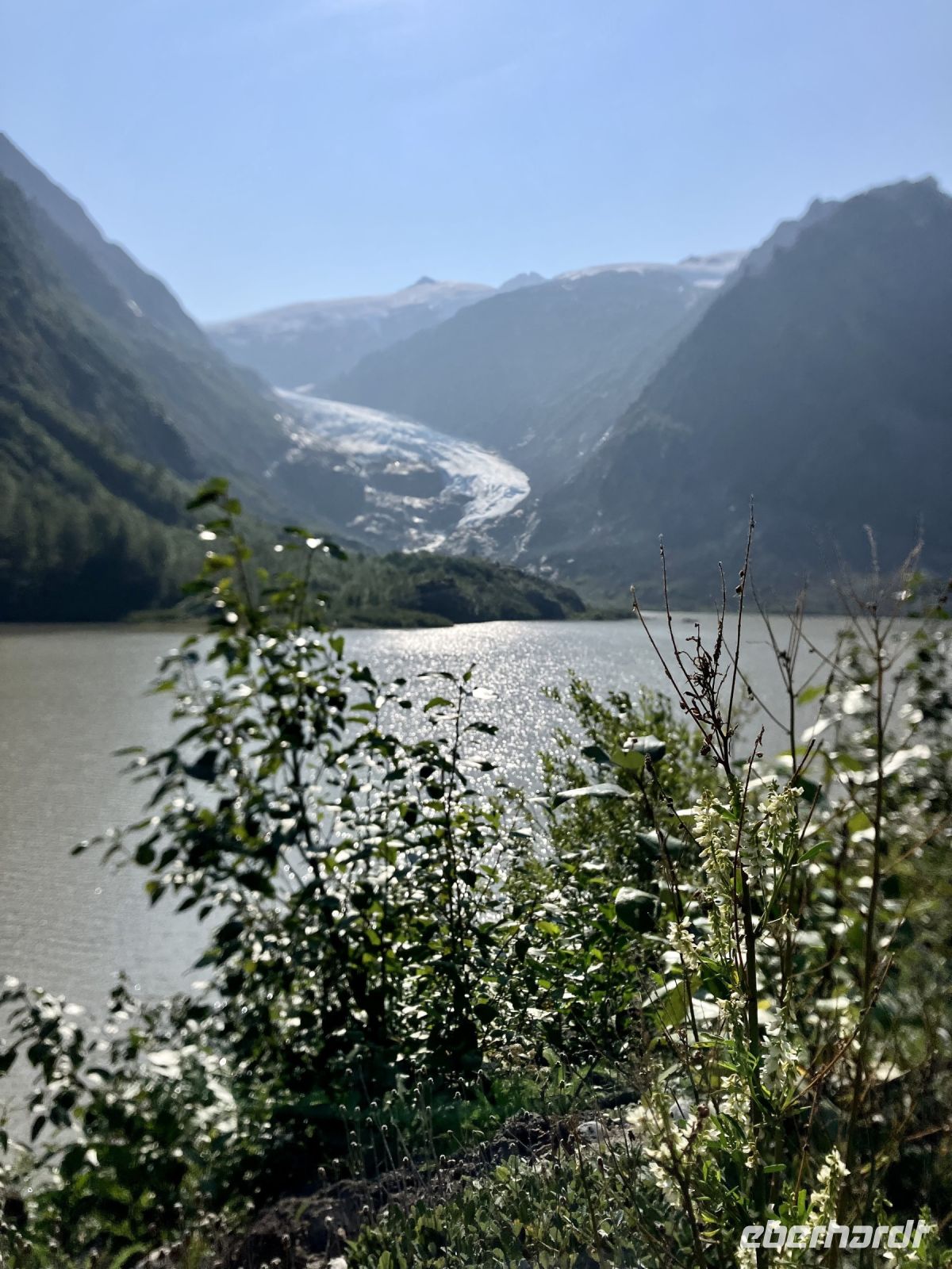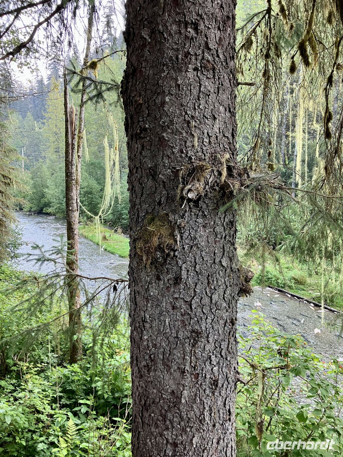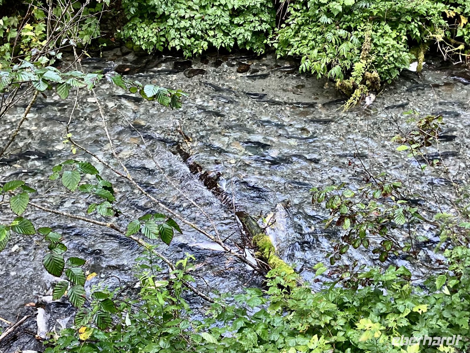 Heute fahren wir etwas eher ab, denn wir wollen zeitig bei der Baerenbeobachtung dabei sein. Nach dem ueppigen Fruehstuecksbuffet fahren wir gleich los, ueber die Grenze, nach Hyder, Alaska. Der erste Halt ist am Fish Creek........Ach ja, die halbe Stunde frueher auf, hat sich gelohnt. Schon auf dem Weg zur Baerenbeobachtung, sehen wir viele laichende Lachse in dem kleinen Fluss. Einmal auf der erhoeten Holzterrasse angekommen werden wir bereits mit der Sichtung eines wunderbaren grossen Schwarzbaeren verwoehnt. Er ist bereits am anderen Ende der Terrasse und wandert gemaechlich den Fluss hinunter bis wir ihn nicht mehr sehen. Nun passiert mal nichs mehr, wir knipsen Bilder der Lachse und wollen dann langsam gehen.