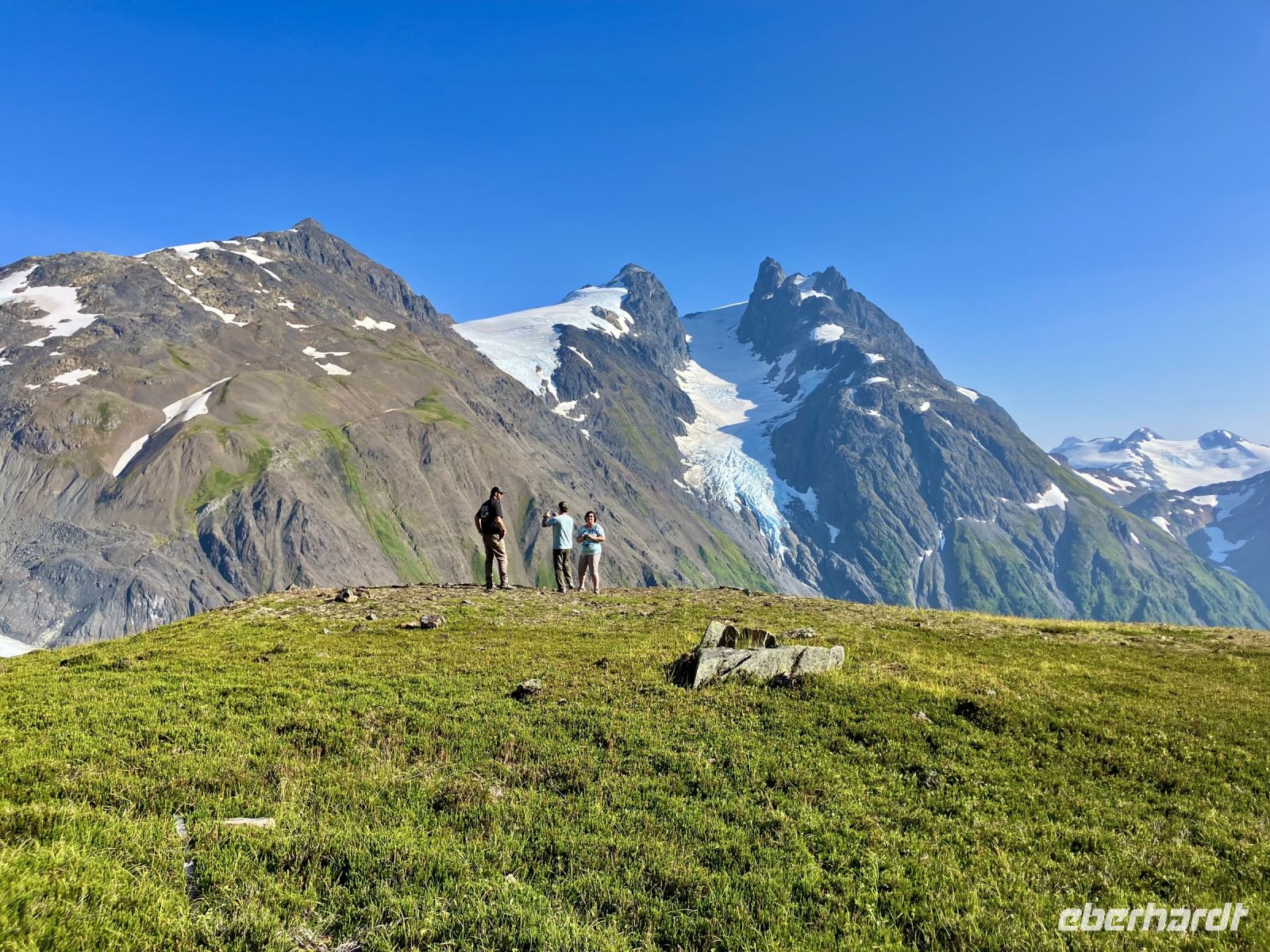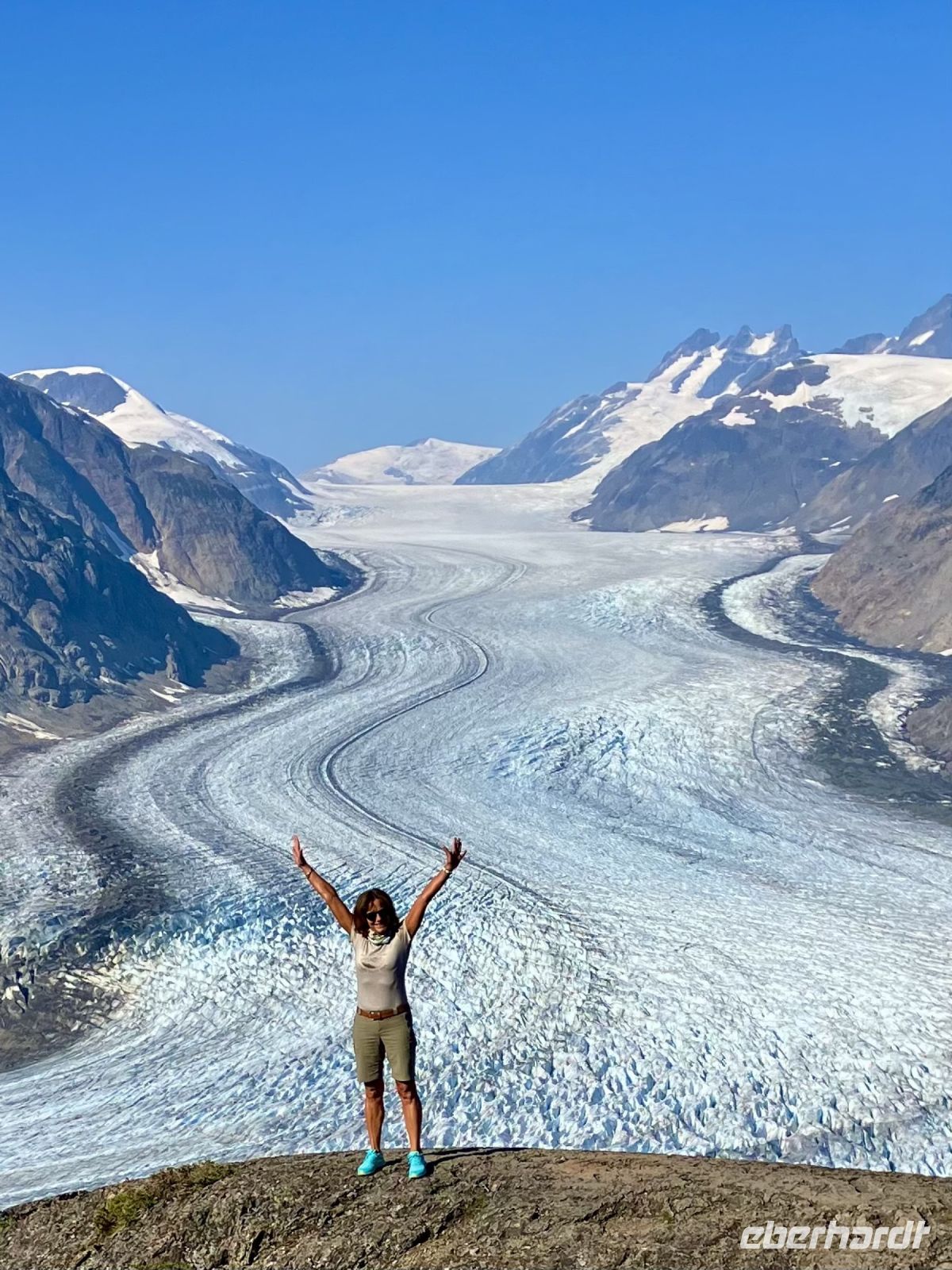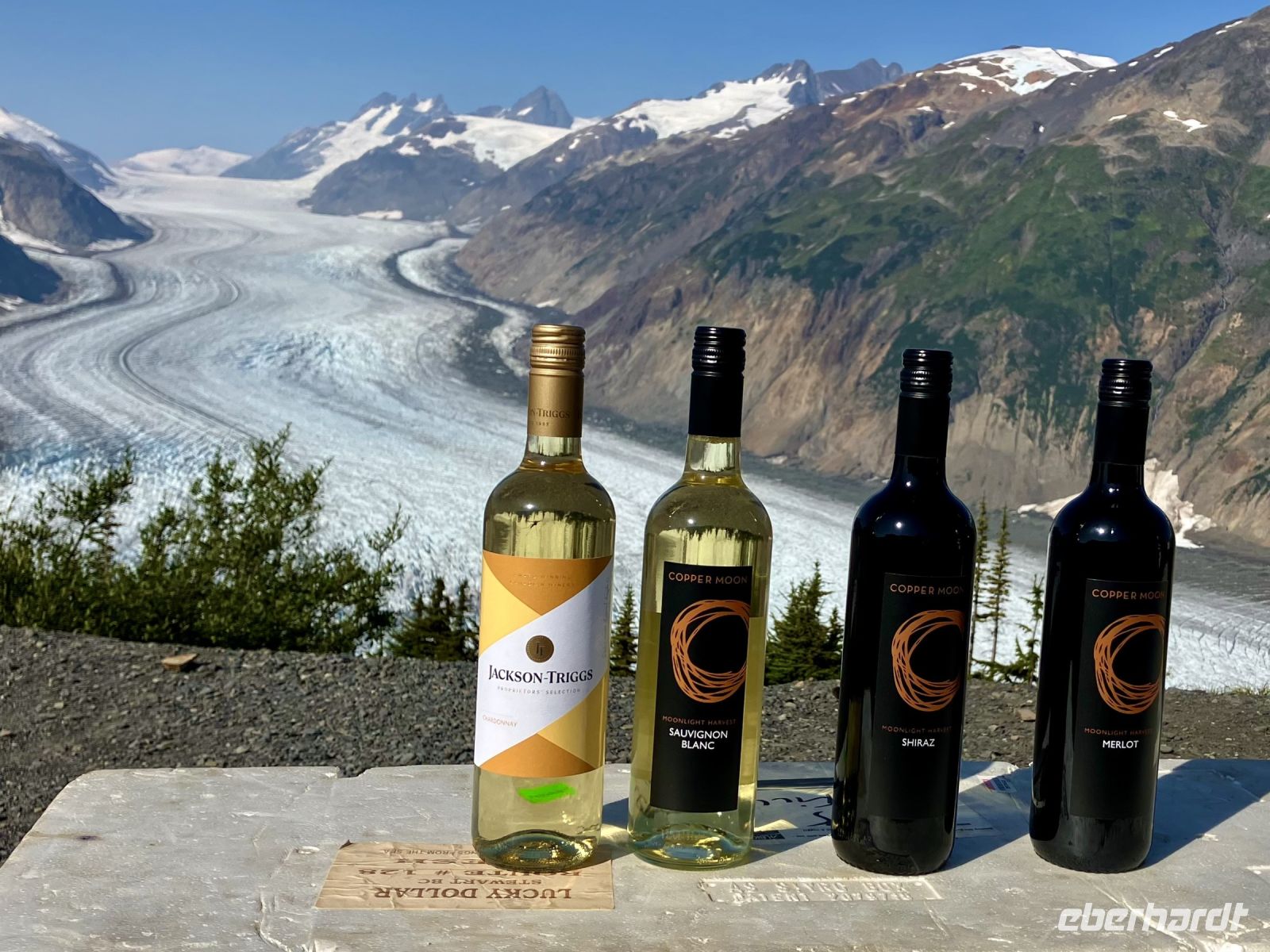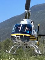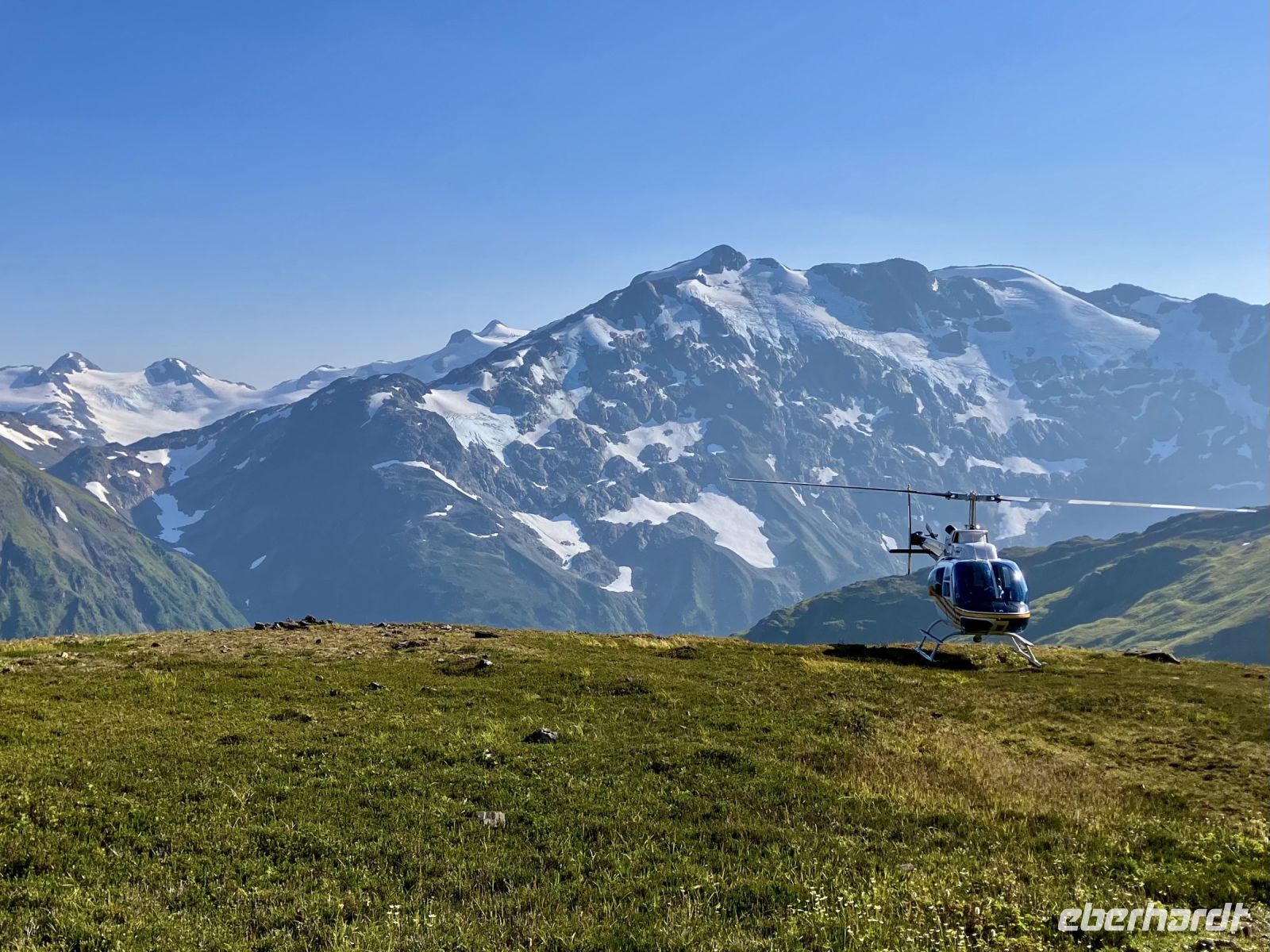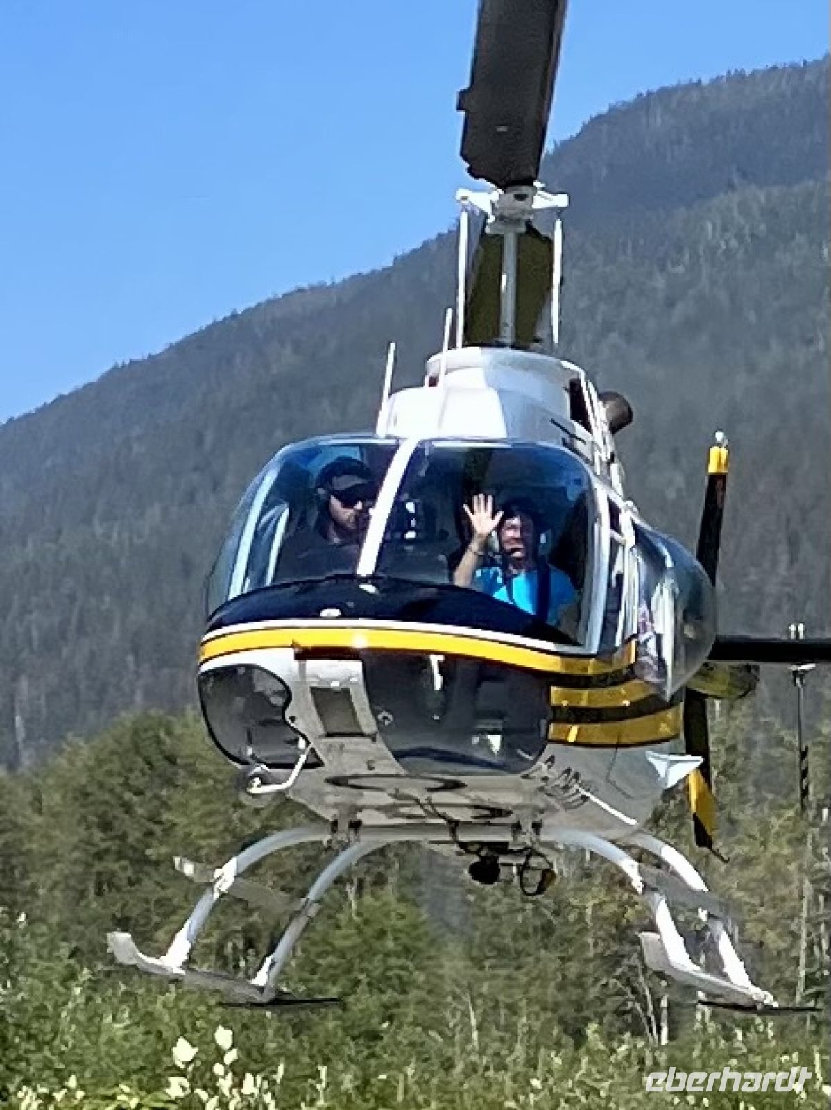 Wir fahren bis hinauf zum Salmon Glacier. Vorbei an alten, verlassenen Minen wo die Leute hier zwischen den 20er und 50er Jahren viel Geld mit Gold, Silber, Nickel und Kupfer verdienten. Eine Mine wurde wieder-gekauft-eroeffnet und in Betrieb genommen. Gold wird wieder herausgeholt. Geschickt faehrt Tracy diese enge und steile Bergstrasse hinauf, sie ist auch heuer mit Dellen versehen, so uebt sich Tracy auch in der Slalom-fahrt. Oben angekommen, staunen wir ueber die wunderschoene Sicht auf den Lachsgletscher und die umliegenden Berge. Es ist so toll, dass wir unser Glueck kaum fassen koennen. Eine kleine Kraxeltour bring einige von uns auf den Berg mit einer enormen Aussicht und kleinen Seen welche Berge spiegeln. Einfach wunderbar. Nun knurrt langsam der Magen und wir koennen unser organisiertes Picknick starten. Umrahmt wird dieses Picknick von einer Weinverkostung von 4 verschiedenen kanadischen Weinsorten. Wir stossen auf eine herrliche Reise an und auf alle Mitreisenden die sich fuer gerade diese schoene Reise entschlossen haben. Nun fahren wir wieder zurueck. Dem Salmon Glacier entlang, den Berg hinunger und entlang des Salmon Flusses. Die bringt uns zu einer nochmaligen Baerenbeobachtung Auch jetzt haben wir wieder Glueck. Es zeigt sich ein dunkler Grizzly mit hellem Buckel auf dem kleinen See neben Fish Creek. Hmmm, er frisst Beeren und streicht dem Ufer entlang weg von uns, bis er nicht im Dickicht verschwinden. Es will sich einfach kein Baer oder Grizzly im Fish Creek aufhalten und sich an den vielen Lachsen naehren. Sorry. Also fahren wir weiter und schauen uns nun noch das Alaska-Doerfchen Hyder an und gehen dort auch in DIE Bar. Ein paar Dollar spaeter sind wir nun “hyderized” und der Magen brennt ein wenig. Ueber die Grenze fahren wir problemlos den Pass vorweisend und gelangen so auch bald wieder zu unserem Hotel. Nun haben sich einige fuer den Heliflug entschlossen und andere haben mal ein paar Stuunden frei. Der Heliflug ist einzigartig, da er bis auf das grosse Cumbria Eisfeld hinaufgeht. Von oben hat man eine ganz tolle Sicht nicht nur auf das Eisfeld aber auch auf riesen Gletscher, maechtige Berge, den Portland Kanal und tuerkisfarbene Seen. Auch landet der Heli einmal, sodasss man aussteigen kann und die Welt aus einer ganz anderen Perspektive erleben kann. Wieder zurueck im Hotel gibt es heute fuer alle ein fruehes Abendessen da wir gleich darauf noch einmal zur Baerebeobachtung fahren koennen.