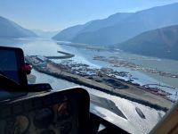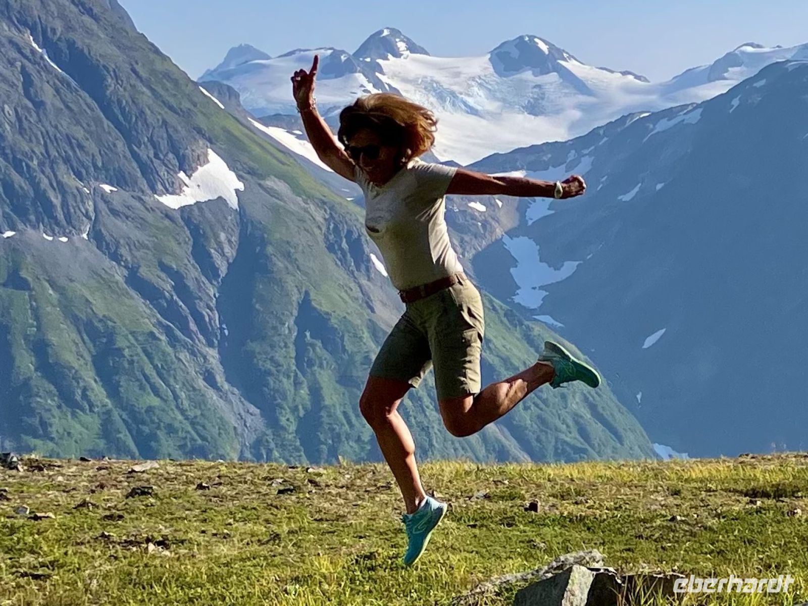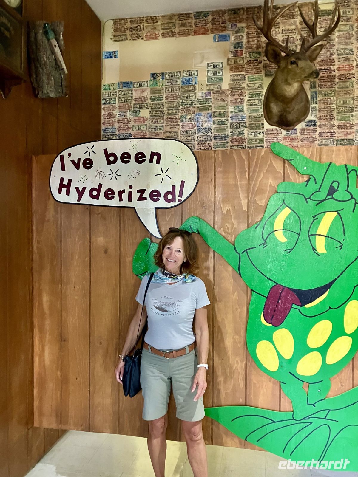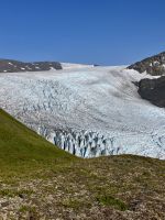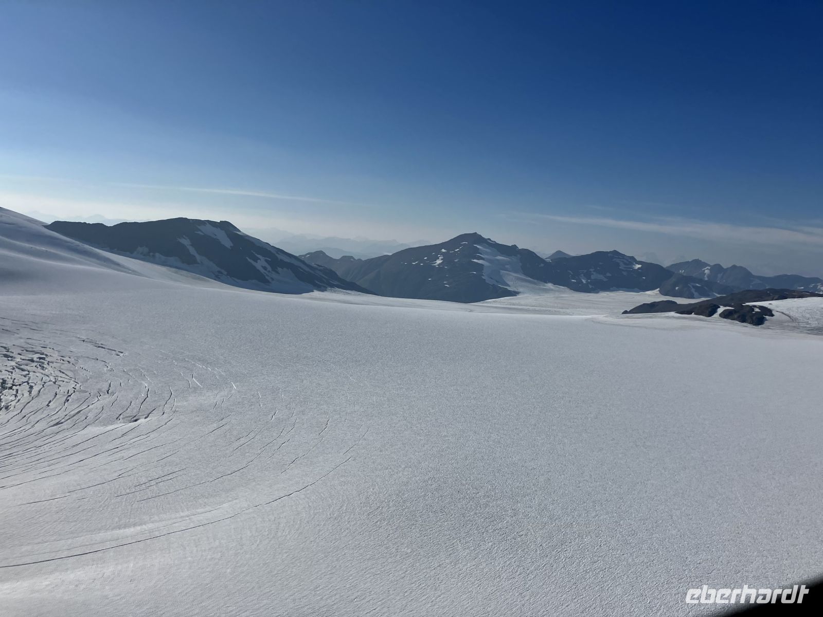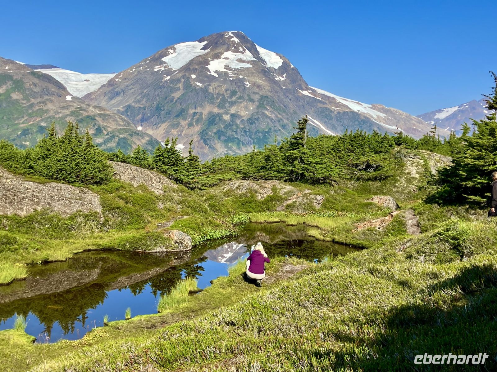 Wir fahren bis hinauf zum Salmon Glacier. Vorbei an alten, verlassenen Minen wo die Leute hier zwischen den 20er und 50er Jahren viel Geld mit Gold, Silber, Nickel und Kupfer verdienten. Eine Mine wurde wieder-gekauft-eroeffnet und in Betrieb genommen. Gold wird wieder herausgeholt. Geschickt faehrt Tracy diese enge und steile Bergstrasse hinauf, sie ist auch heuer mit Dellen versehen, so uebt sich Tracy auch in der Slalom-fahrt. Oben angekommen, staunen wir ueber die wunderschoene Sicht auf den Lachsgletscher und die umliegenden Berge. Es ist so toll, dass wir unser Glueck kaum fassen koennen. Eine kleine Kraxeltour bring einige von uns auf den Berg mit einer enormen Aussicht und kleinen Seen welche Berge spiegeln. Einfach wunderbar. Nun knurrt langsam der Magen und wir koennen unser organisiertes Picknick starten. Umrahmt wird dieses Picknick von einer Weinverkostung von 4 verschiedenen kanadischen Weinsorten. Wir stossen auf eine herrliche Reise an und auf alle Mitreisenden die sich fuer gerade diese schoene Reise entschlossen haben. Nun fahren wir wieder zurueck. Dem Salmon Glacier entlang, den Berg hinunger und entlang des Salmon Flusses. Die bringt uns zu einer nochmaligen Baerenbeobachtung Auch jetzt haben wir wieder Glueck. Es zeigt sich ein dunkler Grizzly mit hellem Buckel auf dem kleinen See neben Fish Creek. Hmmm, er frisst Beeren und streicht dem Ufer entlang weg von uns, bis er nicht im Dickicht verschwinden. Es will sich einfach kein Baer oder Grizzly im Fish Creek aufhalten und sich an den vielen Lachsen naehren. Sorry. Also fahren wir weiter und schauen uns nun noch das Alaska-Doerfchen Hyder an und gehen dort auch in DIE Bar. Ein paar Dollar spaeter sind wir nun “hyderized” und der Magen brennt ein wenig. Ueber die Grenze fahren wir problemlos den Pass vorweisend und gelangen so auch bald wieder zu unserem Hotel. Nun haben sich einige fuer den Heliflug entschlossen und andere haben mal ein paar Stuunden frei. Der Heliflug ist einzigartig, da er bis auf das grosse Cumbria Eisfeld hinaufgeht. Von oben hat man eine ganz tolle Sicht nicht nur auf das Eisfeld aber auch auf riesen Gletscher, maechtige Berge, den Portland Kanal und tuerkisfarbene Seen. Auch landet der Heli einmal, sodasss man aussteigen kann und die Welt aus einer ganz anderen Perspektive erleben kann. Wieder zurueck im Hotel gibt es heute fuer alle ein fruehes Abendessen da wir gleich darauf noch einmal zur Baerebeobachtung fahren koennen.
