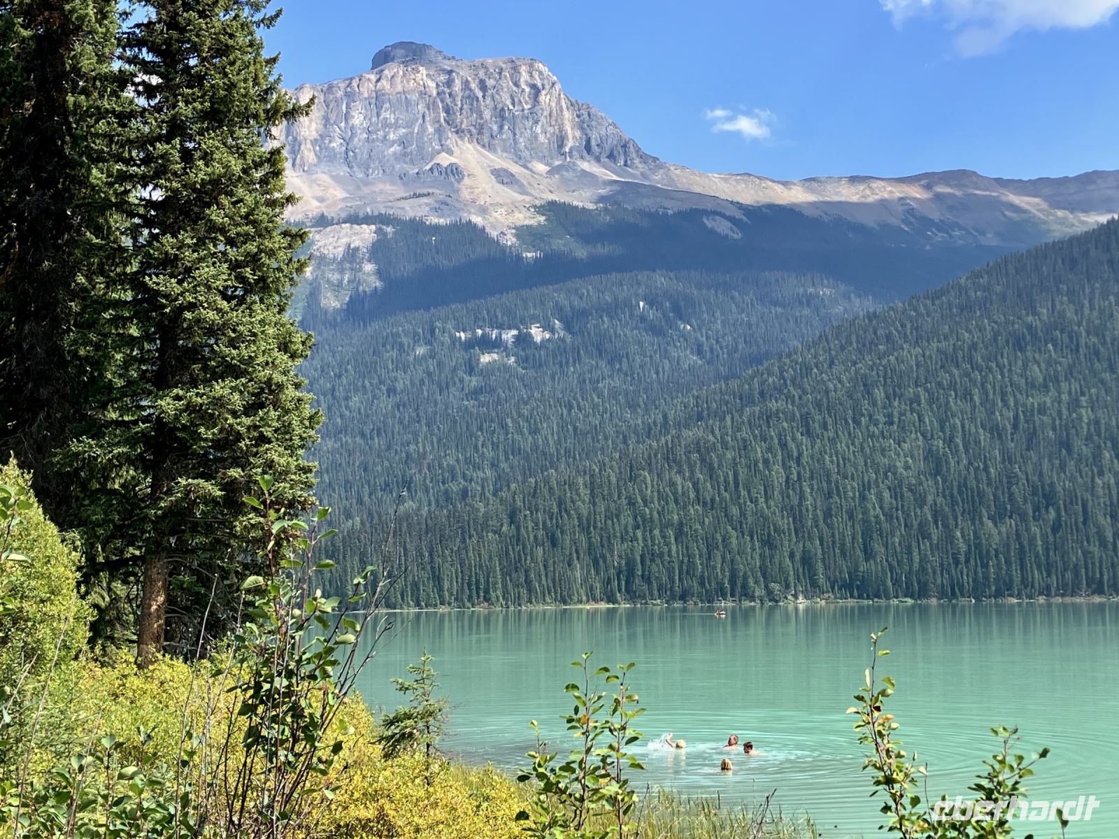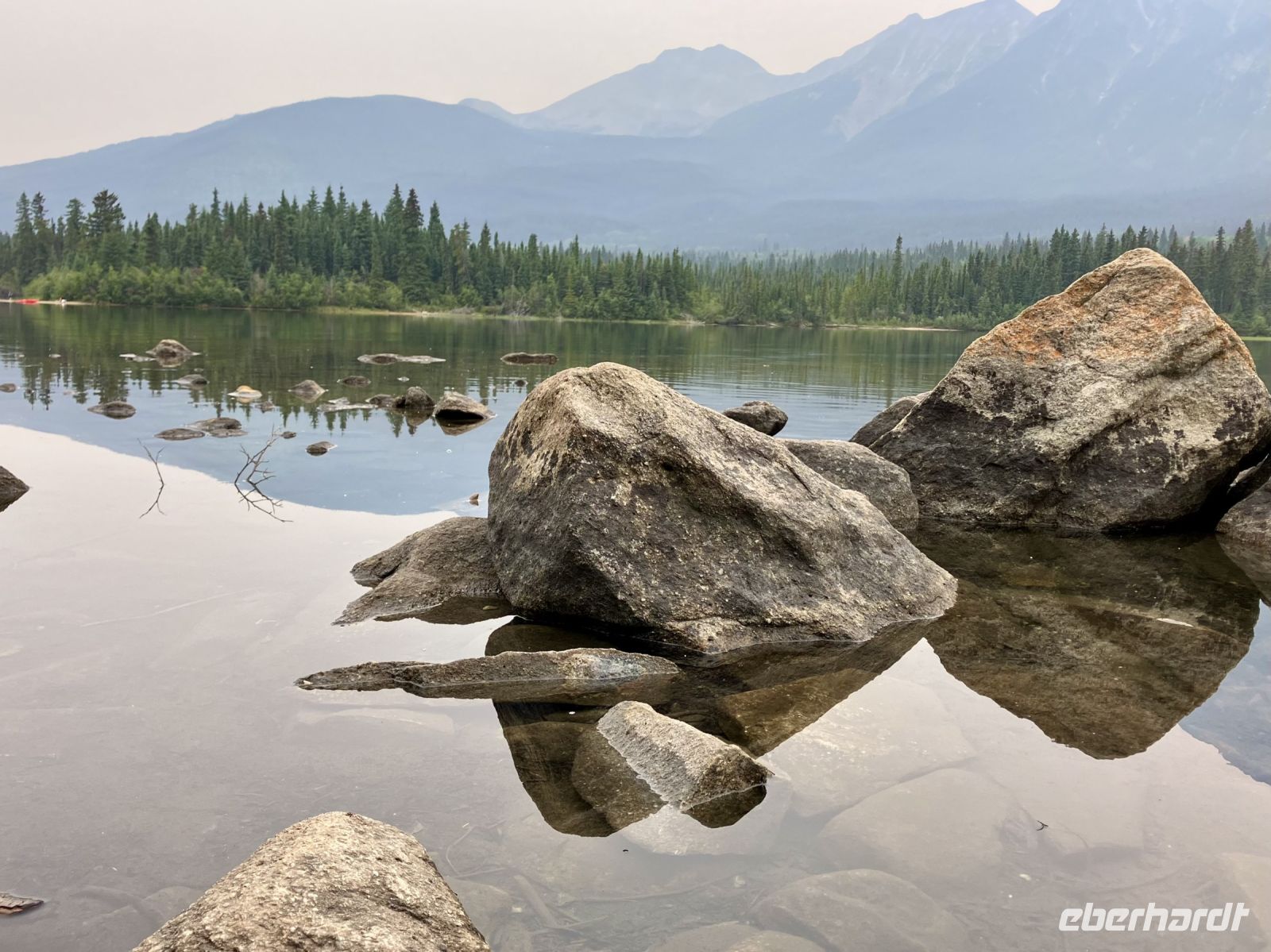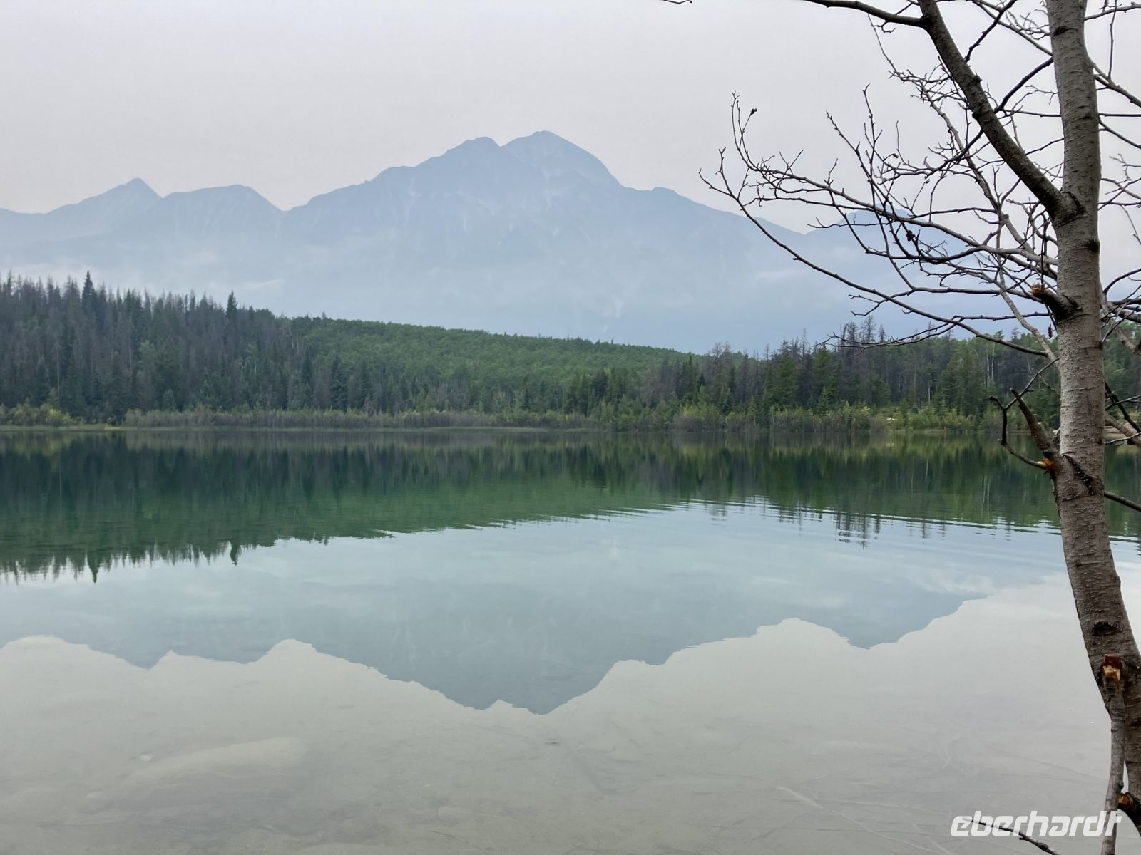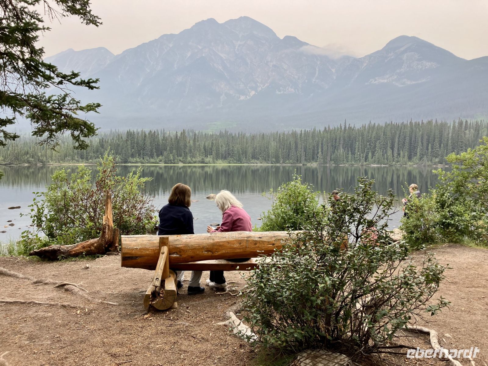 Ein wunderbarer Tag bricht an, die Sonne lacht und die Nacht war gut. Es hat sogar geregnet sodass heute die Rauchschwaden lockerer sind. Schoen ist es abseits von Verkehr, Internet und Telefone aufzuwachen. Es ist erst 7 Uhr in der Frueh und die kurzen Hosen lachen uns trotzdem schon aus dem Koffer an, denn die Wettervorhersage meint, es wuerde heute schoen warm. Auf dem Weg nach Jasper sehen wir leider weder den gestrigen Wapiti noch einen Baeren. Es ist einfach zu warm und da halten sich die Tiere nicht in den unteren Regionen auf. So sorry ! Aber da wir die Suche nicht aufgeben wollen, besuchen wir vorerst Patricia Lake mit der schoenen Spiegelung und dem tollen Pyramid Mountain im Hintergrund. Die Habakuk Geschichte mit der Werft laesst uns kopfschuettelnd staunen. Nun gehts weiter zu Pyramid Lake oberhalb Jasper. Da spazieren wir auch um diese kleine Insel die mittels einer Bruecke mit dem Festland verbunden ist. Die Aussicht ist gut, und der gute Pyramid Mountain schaut leicht blau gefaerbt hinter dem glitzernden See heraus. Ein lustiges Gruppenfoto schiessen wir hier um, und in, einem umgedrehten Wurzelstock. Es ist ganz privat und nicht in der Bildergalerie, kommts einfach naechstes mal auf die Reise mit, dann seht Ihr wie toll es hier ist. Zurueck in Jasper machen wir einen kleinen notwendigen Halt ehe wir unsere heutige Reise auf der Gelbkopfstrasse fortsetzen. Auf der Yellow Head Highway fahren wir nun gemuetlich dahin bis wir nicht die Grenze zwischen Alberta und Britisch Columbien ueberschreiten und die Uhr umstellen. Der heutige Tag hat 25 Stunden, also haben wir 1 Stunde mehr Spielzeit. Judihui. Mittagessen tun wir bei Mount Robson bei strahlendem Sonnenschein. Mount Robson ist heute ganz wolkenfrei, was nur sehr selten vor kommt. Also knipsen wir Fotos wie wild. Nun muessen wir aber noch viele Km fahren bis nach Prince George. Aber 8 Km nach der Mittagspause halten wir, steigen aus, gehen einen Pfad im Wald hinunter zum Fraser Fluss und…..sehen einen wunderschoenen Wasserfall indem heute jedoch keine Lachse hochspringen. Die ersten Lachse sind anscheinend bereits gesichtet worden, sie nehmen hier ihre letzte Huerde, ehe sie endlich laichen und sterben koennen. Die Wasserfaelle sind sehr breit aber auch hoch mit sprudelndem Wasser. Wie das die Lachse schaffen koennen ist uns ein Raetsel auch sind wir hier rund 1300 Km vom Meer entfernt ! Zurueck im Bus gibt es nun die Geschichte ueber die Lachse und wir wissen nun, dass wir eine Wilde Socke (wild sockey) mit nach Hause nehmen werden. Ein Nickerchen leitet uns zur Kaffeepause in McBride. Beim Bahnhof hat Donna ihr Coffeehouse mit Capuccino, Expresso, Lattes und normalem Kaffee, dazu selbstgemachte Suesspeisen. Bald muessen wir jedoch wieder weiterfahren und wir sprechen ueber die vielen Allgemeinfragen. Waerend wir gerade ueber die Pensionskasse Kanadas sprechen bremst unser gute Tracy ploetzlich und kommt auf der Autobahn zum Stillstand. Wir schauen, er laechelt und meint schmunzelnd : there is a bear ! Ohne zu zoegern faehrt er nun rueckwaerts bis wir nicht alle den wunderschoenen Baer im Grass fressend sehen. Sein glaenzendes Fell verraert sein junges Alter aber ausgewachsen ist er. Er laesst sich ueberhaupt nicht stoeren und frisst genuesslich weiter an den gelben Bluemchen und den zarten Graeser. Wir bleiben eine Weile bei ihm und schauen ihm zu. Viele Antworten auf Allgemeinfragen spaeter, kommen wir bei einem kleinen Park mit Urbaeumen vorbei. Das laedt auf eine einstuendige Wanderung ein. Wir staunen ueber die Riesen die man hier hat stehen lassen. Die Zedern sind gigantisch und das Unterholz tiefgruen, kleine Baeche veredeln das perfekte Bild. Endlich, am Spaetnachmittag, kommen wir in Prince George, auch liebevoll PG gnannt (gleiche Abkuerzung wie fuer Pijama!) an. So koennen wir auch schon gleich in unser schoenes Coast Hotel einchecken und ein Weilchen spaeter das feine Abendessen im Privatsaal geniessen. Gute Nacht PG
