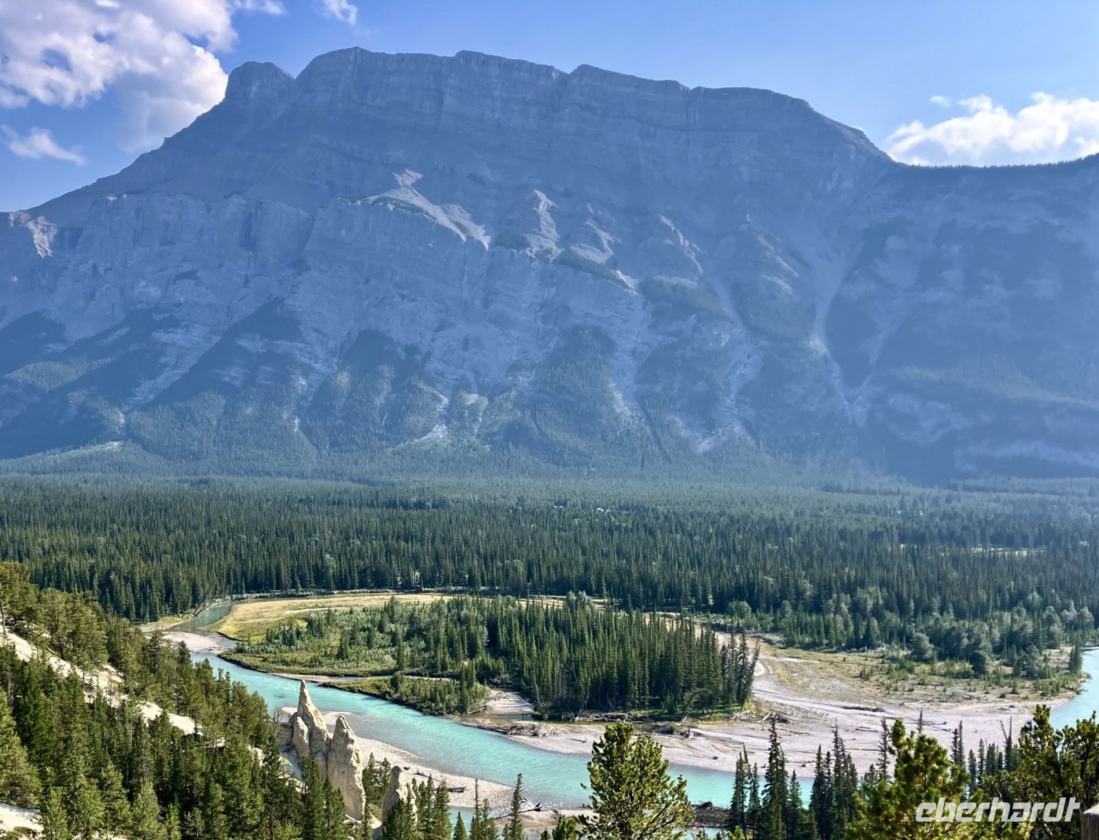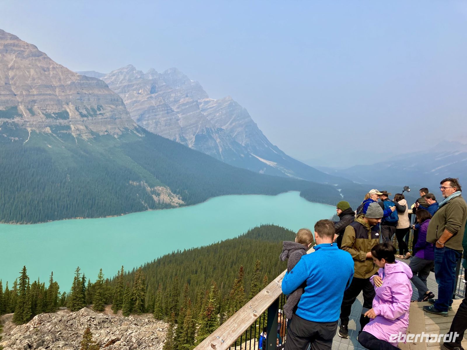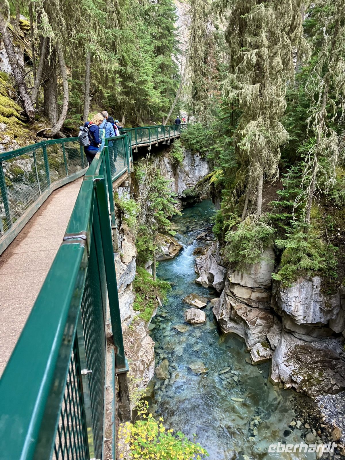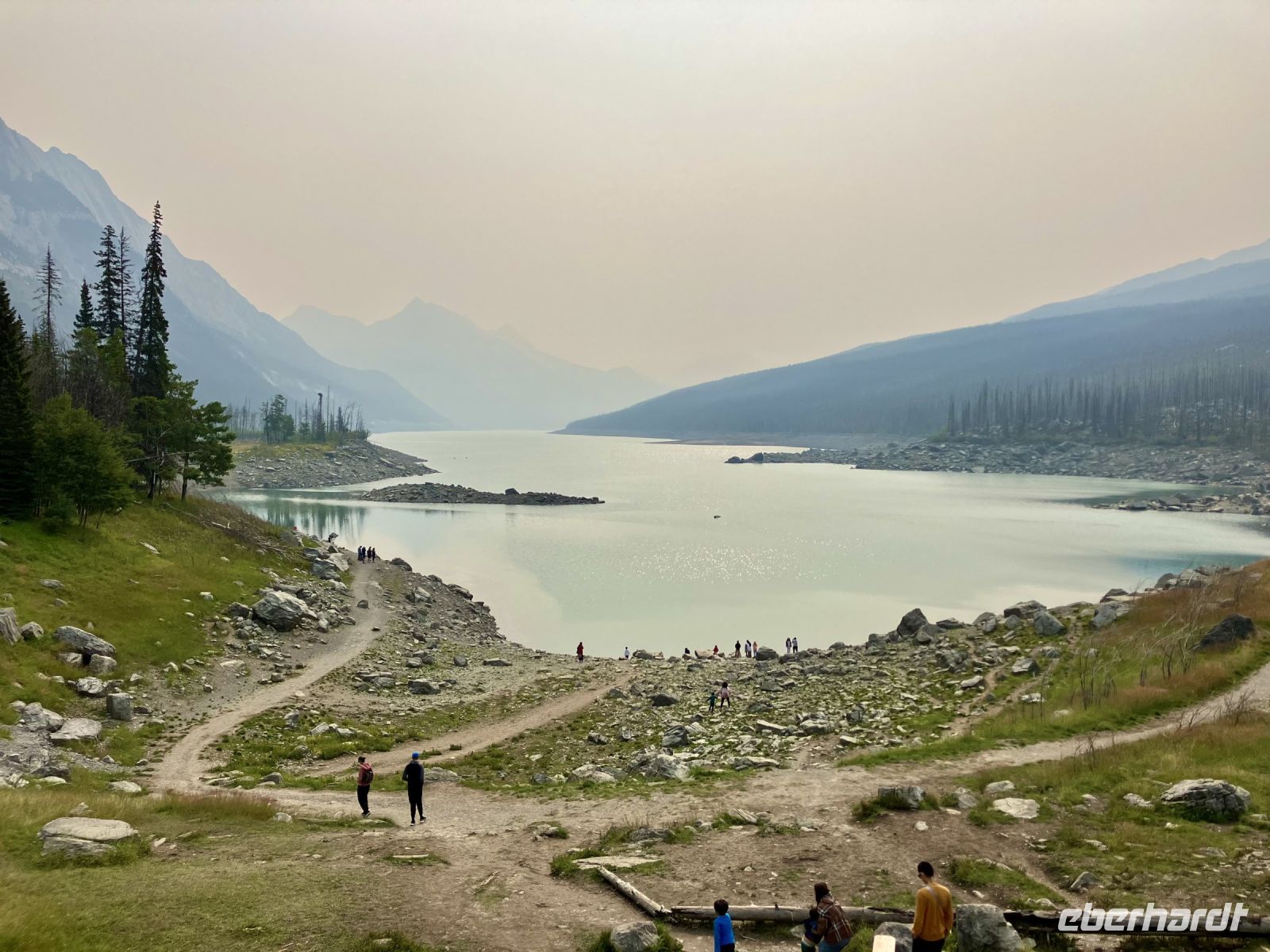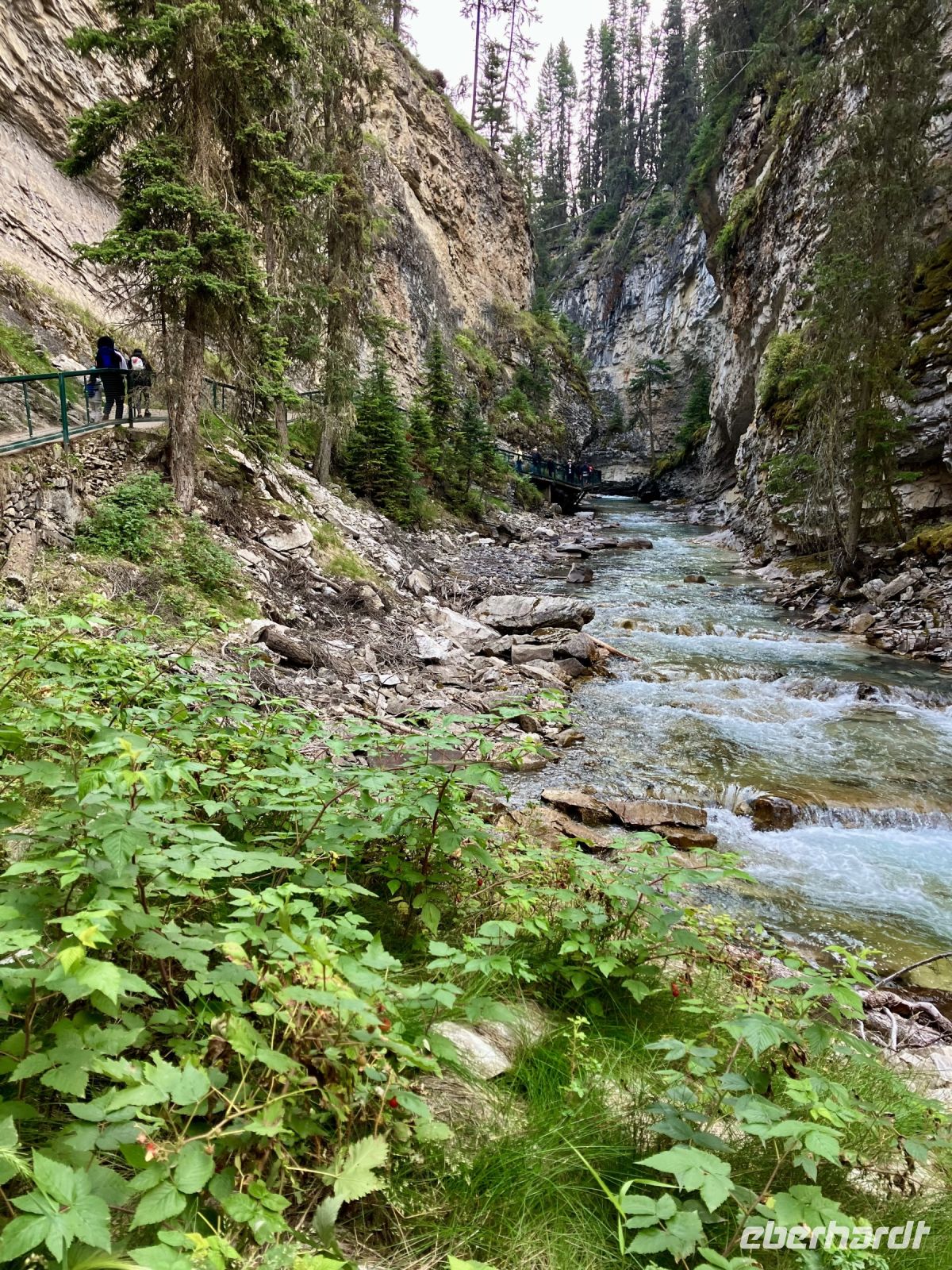 Vorhang auf, strecken, gaehnen und schauen. Ach wie schoen in Banff aufwachen zu duerfen und das Wetter meint es auch gut mit uns. Die Sonne lacht hinter den Rauchschwaden die noch immer von den grossen Waldbraenden in Britisch Columbien rueberkommen. Fenster auf….und gleich wieder schliesen, es ist ganz schoen kalt, 4 Grad, also wird die Hose heute verlaengert. Die Berge sieht man in verschiedenen blautoenen, es schaut alles sehr romantisch aus und wir hoffen natuerlich, dass wir von weiteren Waldbraenden verschont bleiben. Der gute Jet lag haelt uns noch immer einige Stunden pro Nacht wach, aber wir lassen uns nichts anmerken. Niemand sieht die Augenringe der anderen ! Wir sind auf Urlaub und das ist schoen. Also ab, zu einer kleiner Wanderung in eine Klamm. Der Johnston Canyon ist sehr beliebt und wir wandern die kurze Strecke bis zum Jacuzzi der Indianer und wieder zurueck. Eindruecklich ist dieser Canyon und bezaubernd sein Wasserfall. Heute wollen wir aber noch auf die beruehmte Icefield Parkway, die Prachtstrasse der Rocky Mountains. Erster Halt ist beim Castle Mountain, denn den konnten wir ja gestern nicht in unseren Handys verewigen. Danach gehts gleich weiter zum Crawfoot Gletscher, herrlich wie dieser Gletscher glitzert. Der nahe gelegene Bow See ist heute etwas gekräuselt und viele Autos sind unten geparkt. Also bleiben wir oben stehen und spazieren runter zum See. Dem Ufer entlang gehend laufen die Kameras wieder heiss. Die Umgebung, die Berge, Gletscher, Waelder und die schmucke Num Te Jah Lodge sind sehr fotogen. Schaut in die Fotogalerie, es sind die mystischen Bilder. Nun noch schnell in die Num Te Jah Lodge um den Kaffee zu holen und weiter gehts mit Tracy. Naechster Stop ist 5 Min spaeter, beim Peto Lake. Der Dackelsee, wie er auch liebevoll genannt wird, ist tief im Tal gelegen und hat wohl die allerschoenste Farbe aller Gletscherseen. Heute ist er hell und milchig in ein zartes Aquamarin gehuellt. Vor dem rauchigen Himmel schaut er super aus. Nun faengt jedoch der Magen an zu knurren. Also fahren wir weiter. Auf dem grossen Waterfoul See (Seevoegel) sehen wir heute ganze 6 Entchen aber die Geschichte des grossen Abenteurer Alexander McKenzie’s fuehrt uns zur Mittagspause. Wir picknicken am North Saskatchewan River und geniessen die Ruhe. Nach einer guten halben Stunde packen wir`s wieder. Waehrend der Fahrt hinauf zum Athabasca Gletscher gibt es nun ein kurzes Nickerchen denn bald gehts weiter zu unserer Gletscherfahrt. Auch dies ist ein Spektakel, denn wir sitzen in einem Eisexplorer. Dies ist ein tolles Sondergefaehrt und es krazelt mit uns auf den Athabasca Gletscher, welcher Teil des Columbia Eisfeldes ist. Auf dem ewigen Eis angekommen, steigen wir auch aus. Das Wetter ist perfekt wenn auch noch immer etwas rauchig und das Eis ist so, dass man heute gut darauf gehen kann ohne auszurutschen. Wir haben auch sehr viel Zeit heute auf dem Eis so werden viele Fotos geschossen und viele mitgebrachte Flaeschchen mit dem Ewig-Jung Wasser des Gletschers gefuellt. Ob uns Tracy (unser Fahrer) auch wiedererkennen wird ? Aber natuerlich, er wartet bereits auf uns damit er uns sicher in die Sunwapta Lodge fahren kann. Ach wie schoen, die Sunwapta Lodge, ist abseits gelegen, mitten im Wald. Es ist urchig und richtig schoen hier. Nach dem Prosecco check-in haben wir noch Zeit um zum Wasserfall zu spazieren, ehe wir ins Restaurant gebeten werden. Das BBQ heute abend ist fantastisch und Heidis lustige Erklaerungen ueber die Tierwelt der Rocky Mountains runden diesen schoenen Tag ab. Keiner braucht da noch ein Schlaf-Liedchen