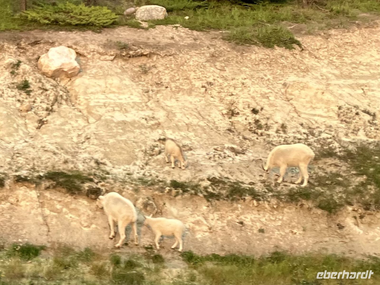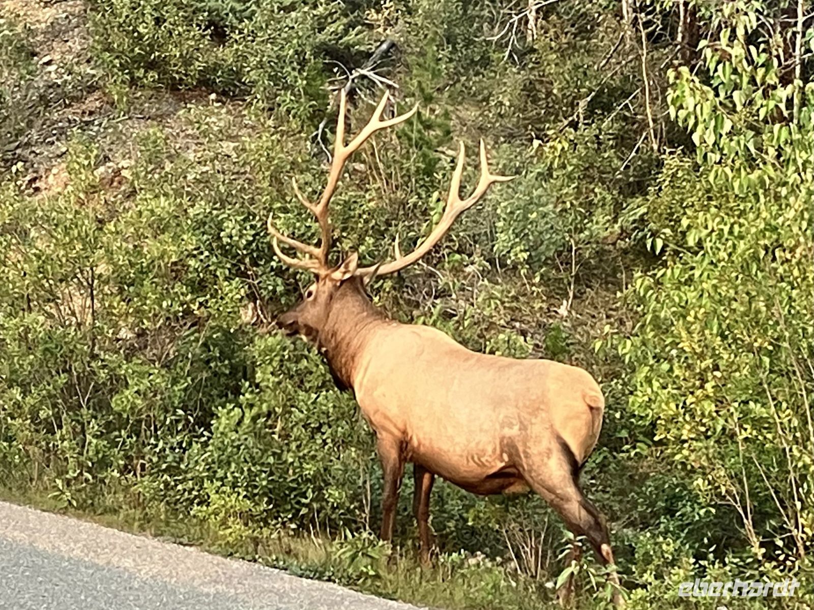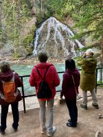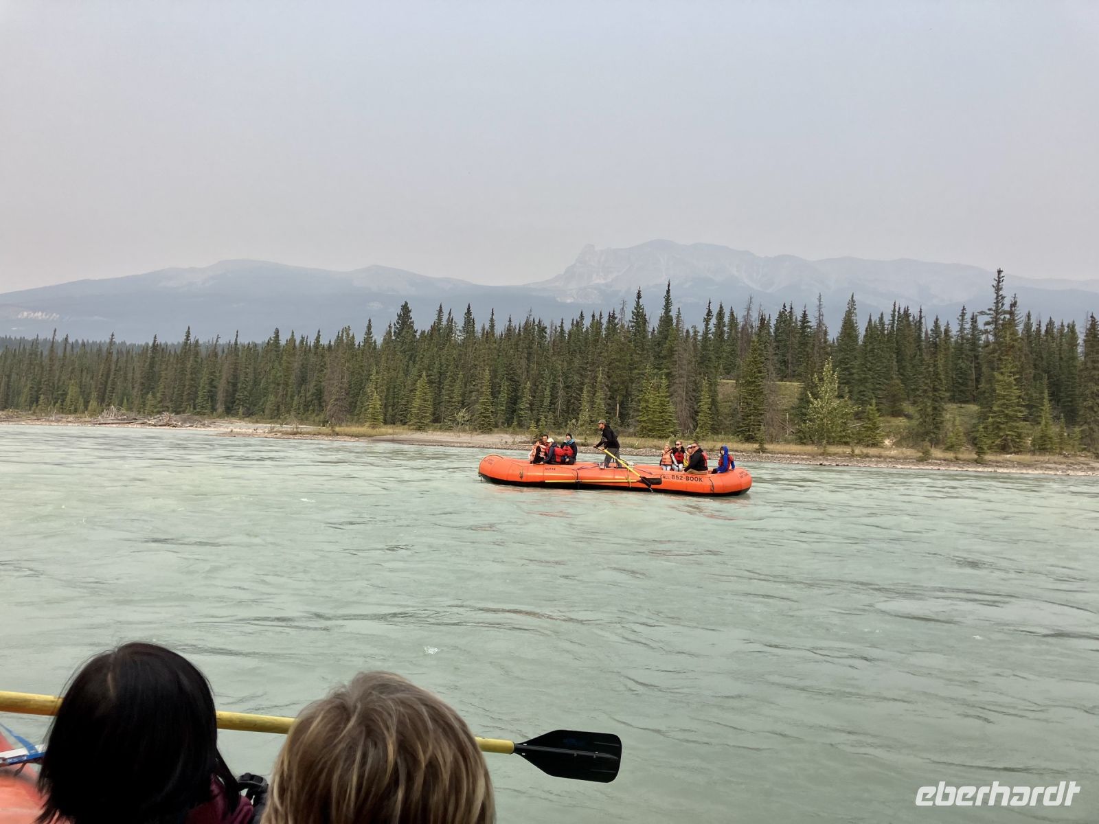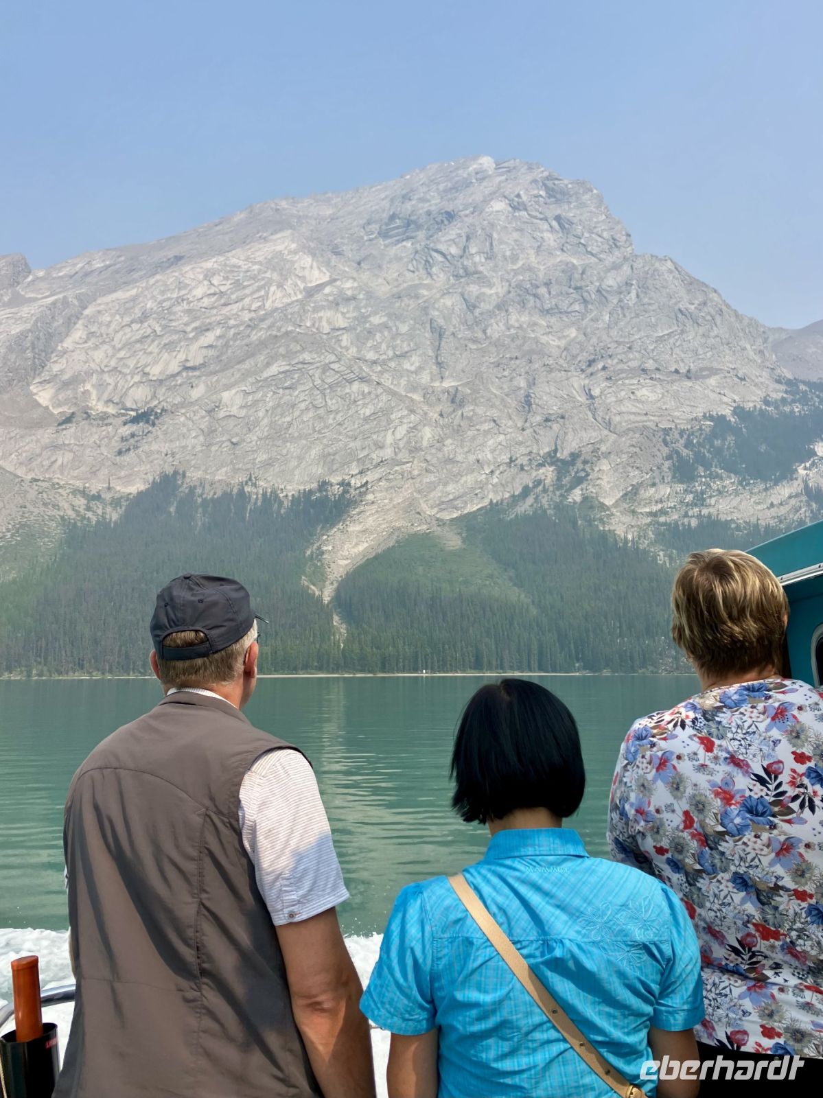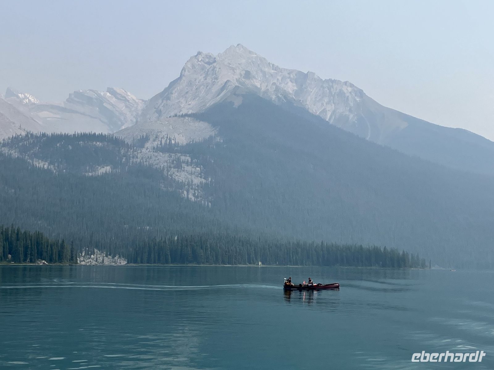 Hinter den Wolken zeigt sich schon ein wenig Sonne und 3 Grad ist es heute in der Frueh. Die kurzen Hosen und das kleine T-Shirt sind jedoch genau die richtige Bekleidung fuer den heutigen Tag, denkt sich die Reiseleitung und zipt sich dann doch die Beinverlaengerung an die Hose und nimmt gleich 2 Jacken mit. Wir fahren nach dem ausgiebigen Fruehstueck gleich nach Jasper, um diesen kleinen Ort auszukundschaften. Gleich darauf gehts auf in die Maligne Schlucht. Einige unter uns moechten gerne die Maligne Schlucht hinaufgehen, das ist ein Spaziergang von rund 1 ½ Stunden, viele Fotostops inkludiert. Andere fahren mit dem Bus bis zum Kaffeehaus und gehen oben die kleinere Runde, andere wieder geniessen einfach mal die Zeit und schauen dem Treiben zu. Das Wasser des Maligne Flusses fasziniert uns alle, denn es verschwindet immer wieder durch unterirdische Gaenge und bekommt Zufluesse aus dem Felsen. So ist der Wasserspiegel des Flusses immer verschieden. Der schoene Wasserfall “Weisser Ton” laedt zum verweilen, und die Gegend zum geniessen ein. Unterwegs gibts noch eine kleine Einfuehrung in den Fotokurs fuer Handy’s. Der Weg ist gut, das Wetter spielt auch mit und wir sind gluecklich hier auf Urlaub zu sein. Oben beim Kaffeehaus treffen wir uns alle wieder und fahren alsobald weiter. Unser Weg fuehrt uns zu Medicin Lake wo wir auch einen kurzer Fotostop einlegen. Das Wetter meint es gut mit uns es regnet nicht und die Sonne sieht man durch die Rauchschwaden welche den Himmel verschleiern. Im Adlerhorst sitzt nun niemand mehr drinnen, die Kuecken sind ausgezogen und die Eltern dieser Weisskopfadler Familie sind nun sicher beschaeftigt sich selbst wieder aufzupaeppeln. Die Elisabeth Gebirgskette schaut auf Medicin Lake hinunter. Bald darauf kommen wir bei Maligne See an, wo sich jeder einen Inbiss auf der Terrasse mit Seeblick goennt und einen Spaziergang entlang des Maligne Sees unternimmt. Um 14:00 Uhr legt unser Boot ab, wir fahren zu der beruehmten Spirit Island. Ach so schoen, ist diese Bootstour auf dem grossen Maligne See. Immer wieder begegnen wir Kanu-fahrer, also verlangsamt unser Kapitaen die Fahrt, sodass die fleissigen Paddler nicht in das 4 Grad kalte Wasser gekippt werden. Begegnen wir jedoch einem Schwesterschiff, fahren wir mit Vollgas auf die Bugwelle und starten das Rodeospiel. Viel wird nun erzaehlt ueber die Stoney First Nations, die Fische im See, die Berge rundherum, die Waelder und die Gletscher. So sind wir bald bei der romantische Halbinsel Spirit Island. Sie hat das perfefkte “setting” von hellblauen Wasser umgeben, welches wiederum von Bergen, die wie Throne ausschauen, eingerahmt ist. Viele Fotos spaeter fahren wir wieder zurueck, bestaunen die Gletscher und das Bergpanorama und tauschen uns aus. So amuesieren wir uns koestlich und sind auch bald wieder im Hafen von Maligne Lake. Unser Fahrer Tracy, wartet auch bereits auf uns und bald gehts im Bus weiter. Siesta ist nun angesagt bis wir in Jasper ankommen. Da steigen alle, ausser den mutigen Rafter aus. Die Jasper-Besichtigungs Gruppe hat nun etwas Freizeit und diejenigen die sich fuer die Rafting tour angemeldet haben werden nun zum Fluss gefahren. Da wartet das knall rote Gummiboot bereits auf uns und Harrisson, der Rafting Guide paddelt uns auf dem Sunwapta Fluss wieder zurueck nach Jasper. Dies ist echt ein toller Ausflug, wir lachen uns krumm und muessen auch immer wieder festhalten, wenn wir ueber Wasserschnellen und Wellen raften. Das Boot ist so lang, dass man die Wellen kaum vernimmt, aber viel Eindruck macht es allemal. Bei Ankunft huepfen wir wieder an Land und steigen in Tracy’s Bus ein der genau zur richtigen Zeit am richtigen Ort aufkreuzt. Nun aber schnell nach Jasper hinein, um den Rest der Gruppe aufzugabeln. Auf der Rueckfahrt in unsere Lodge halten wir ploetzlich inne, denn hier steht er, ein riesengrosser Wapitihirsch mit riesigem Geweih steht gemuetlich am Strassenrand und frisst genuesslich Graeser. Viele Fotos danach fahren wir weiter bloss um kurze Zeit danach wieder anzuhalten, da sich 4 Schneeziegen auch wieder gleich am Strassenrand bei einer sehr hellen Sandsteinbank zeigen. Ach so wunderschoen, wir bleiben eine Weile stehen um ihnen zuzuschauen. Nur gut, dass wir nicht auch noch einen Baeren sichten, sonst kaemen wir zu spaet zum Abendessen ! Wir freuen uns irre, dass wir endlich auch groessere Tiere als bloss Streifenhoernchen in den Rockies gesehen haben. Wir hatten einen sehr schoenen Tag heute, danke Eberhardt, danke Wetter, danke allen Mitreisenden. Das Abendessen ist wieder sehr fein und ueppig, sodass wir uns danach bald in unsere kuscheligen Bungalows zur Nachtruhe begeben.