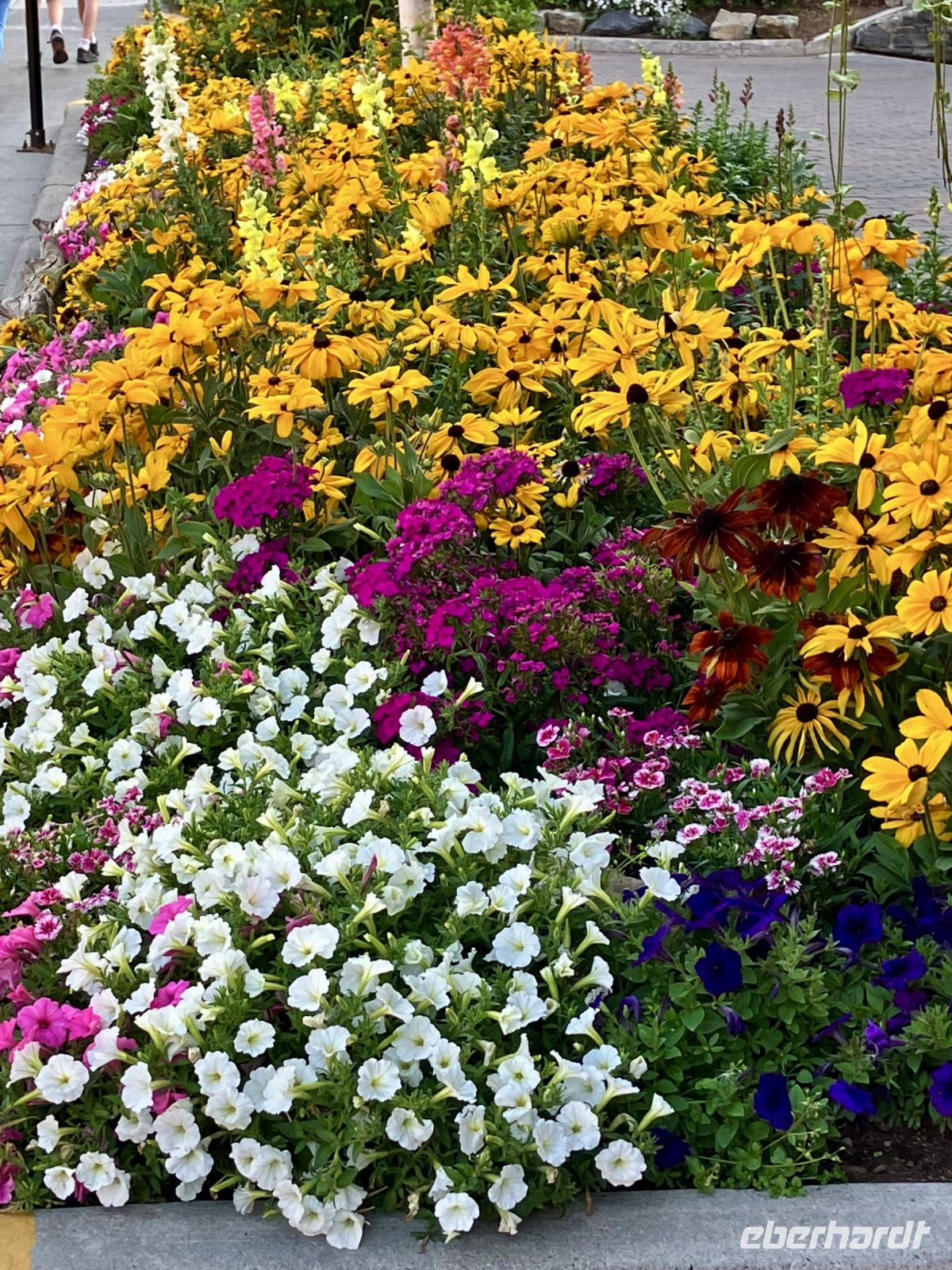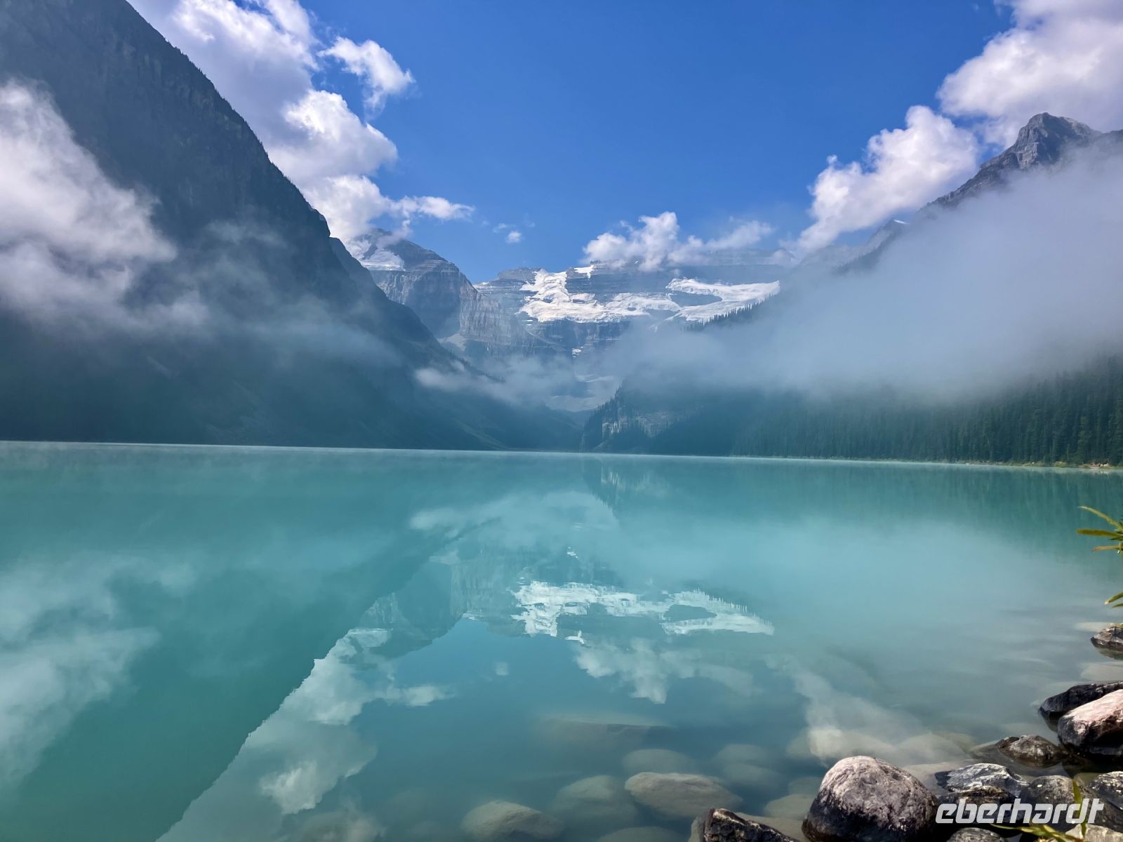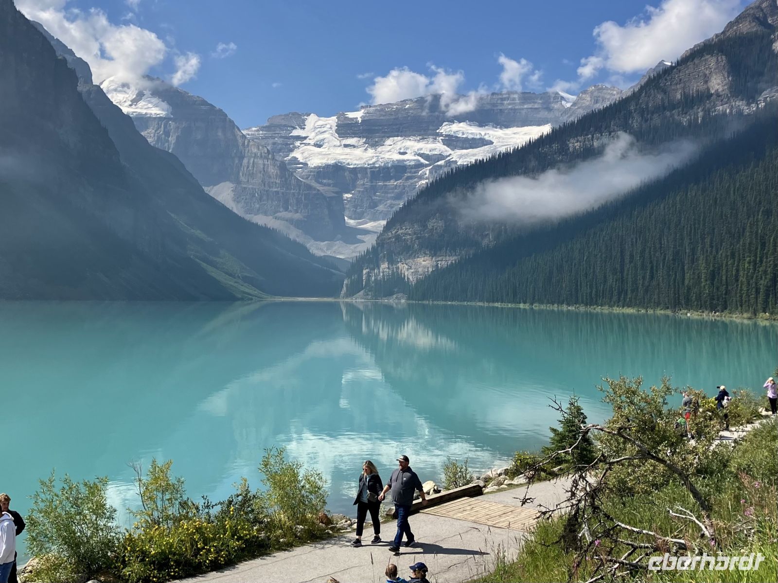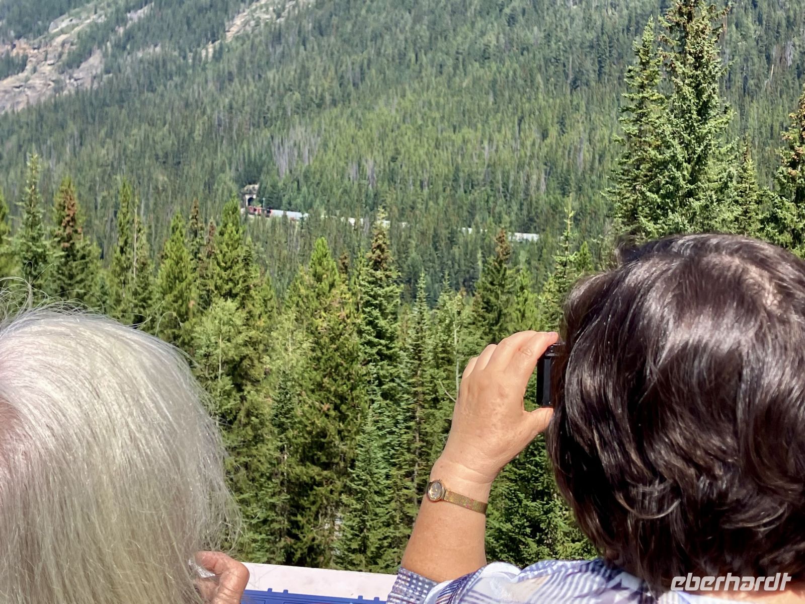 in wunderschoener Morgen erwartet uns und nach dem Genuss des Fruehstuecksbuffets fahren wir gleich los, denn die Rocky Mountains warten bereits auf uns. Wir fahren beim Olympischen Zentrum Calgarys vorbei und horchen den Geschichten von Eddy the Eagle, Katharina Witt, Cassius Clay und der jamaikanische Bobmanschaft zu. 1988 Calgary; das waren ausserordentliche Olympische Winterspiele. Sie sind nach wie vor Gewinn-bringend. Bald darauf begruessen uns schon die maechtigen Berge. Wir sehen sie, aber es wird immer diesiger und die Bergspitzen sind kaum mehr zu sehen. Vorbei am Mount Rundle, Cascade Mountain und Banff gehts gleich in Richtung Lake Louise. Ein kleiner Stopp bei Castle Mountain um uns die Beine zu vertreten und ein paar Bilder zu knipsen verschoenert diese erste Fahrt durch die Rockies. Bald sind wir schon in Lake Louise. Nun kaufen wir noch ein kleines Picknick ein und fahren auch gleich weiter zum legendaeren See. Da haben wir nun eine gute Stunde Zeit, uns das Hotel und den See anzuschauen. Ploetzlich loesen sich alle diese tief liegenden Wolken auf und wir sitzen im strahlenden Sonnenschein am Ufer des Lake Louises gemuetlich, unser Picknick geniessend. Wir haben heute noch einiges vor, also fahren wir alsobald weiter, aus dem Banff National Park hinaus, in den Yoho National Park hinein. Da halten wir bei den Spiral Tunnels. Ach was fuer ein Glueck, wir hoeren einen Zug, wir sehen ihn, steigen flink aus und schauen diesem Eisenbahn-Schauspiel zu. Wir sehen wie er in der Achterschleife die hier in den Berg hineingebaut wurde in die Tunnels hinein- und hinausfaehrt. Der Zug ist beeindruckend mit seinen 4 Loks und etwa 130 Wagons. Toll. Glueck gehabt. Bald fahren wir weiter zum Emerald Lake. Der See ist wunderschoen smaragdfarben. Die Sonne lacht. Die Berge schauen auf uns nieder. Geradezu idyllisch, fast kitschig schoen, schaut auch die Lodge auf der Halbinsel aus. Das Dach in demselben gruen-blau gehalten wie der See selbst, alles passt. Viele Leute fahren heute mit den roten Paddelbooten herum und die Blumenampeln leuchten in vielen Farben. Besucher aus der ganzen Welt knipsen Fotos und spazieren herum. Wir schauen dem Treiben etwas zu, knipsen auch schoene Bilder, und gehen auf einen kleinen Spaziergang dem Ufet entlang. Ploetzlich halten wir. Aus der Handtasche kommen eine Flasche Kanadischer Whisky und lauter kleine rote Becher zum Vorschein. Wir stossen auf eine gute Reise an und freuen uns, dass wir die Gluecklichen sind, die heute hier Urlaub feiern duerfen. Naechster Stop ist beim tosenden Kicking Horse River. Dieser braust wuchtig unter einer natuerlichen Steinbruecke durch. So viele Eindruecke haben wir heute gesammelt, die koennen wir nun auf der Fahrt nach Banff bei einem wohlverdienten Nickerchen verdauen. In Banff fahren wir gleich auf die Stadtrundfahrt sodass wir alles ueber dieses legendaere Dorf und seine Geschichte zu sehen und zu hoeren bekommen. Vorerst besuchen wir das beruehmte ehemalige Eisenbahnhotel das Banff Springs Hotel. Danach halten wir beim Bow Wasserfall, hier wurde eine Szene des Films “Fluss ohne Wiederkehr” mit Marilyn Monrow gedreht. Danach besuchen wir noch eine Aussichtsterrasse und zu gutem Schluss machen wir einen kurzen Spaziergang um lustige Steinformationen, die Hoodoos anzuschauen. Nach so einem vollen Tag sehnen wir uns nach ein paar Stunden Freizeit in Banff. Uii der Koch in dem renommierten Restaurant hat heute nicht seinen besten Tag. Die Suppe und das Dessert sind jedoch koestlich. Nun freuen wir uns die Augenlieder bald von innen betrachten zu koennen. Gute Nacht meine neuen Freunde. Wir traeumen von endlosen Zuegen, smaragdgruenen Seen und glitzernden Berge.