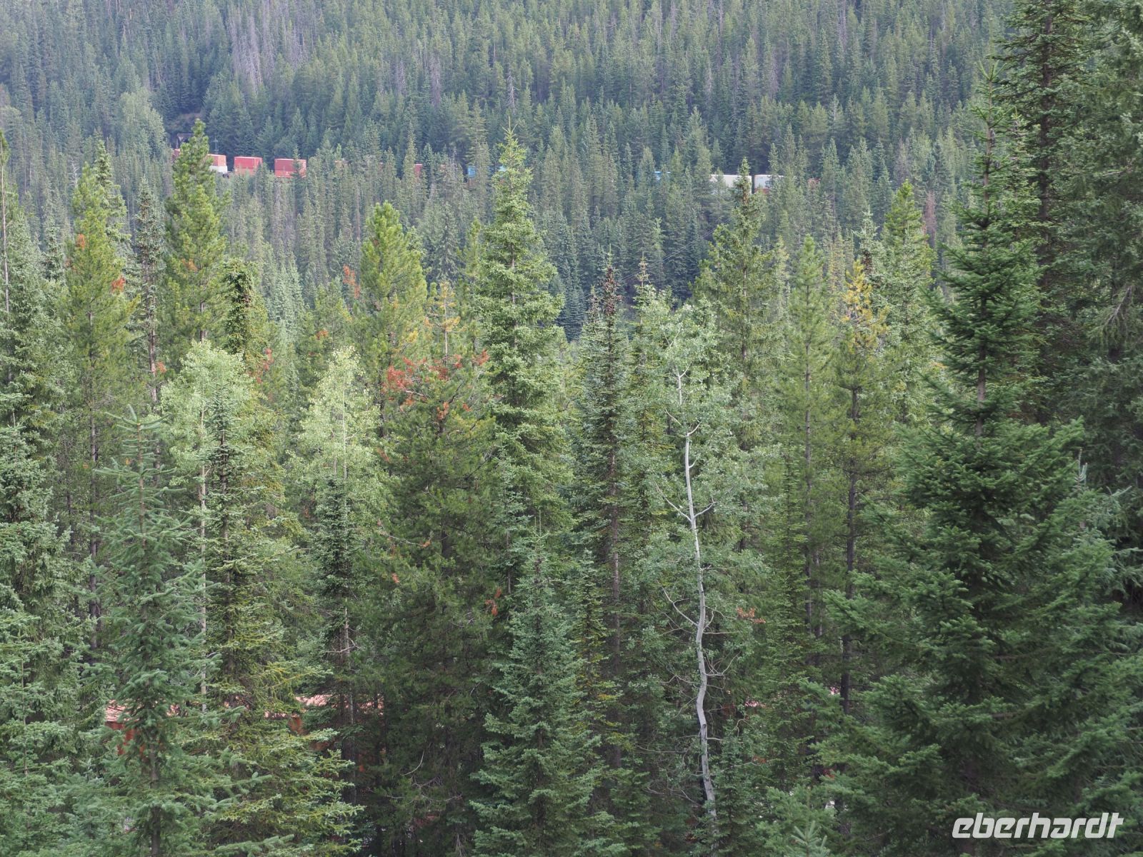 Am Bow-Fluss legten wir einen kleinen Foto-Stopp ein. Im Laufe der Fahrt durch das Bow-Tal begegneten uns immer wieder die so genannten ‚logdepole pines‘, die Kiefern mit den ganz dünnen Stämmen, die bis zu 400 Jahre alt werden können. Sie heißen auch Küsten- oder Drehkiefern, weil die Zweige oft um ihre eigene Achse gedreht sind. Ein schöner Anblick!