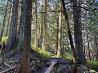 Nach aufregenden und wunderschönen sonnigen Tagen in den Bergen verlassen wir die Rocky Mountains und beginnen unsere lange Reise nach Stewart an der Grenze zu Alaska. Am liebsten würden wir noch mindestens eine weitere Nacht in unseren Chalets am Fluss bleiben und die friedvolle Atmosphäre genießen. Zum Abschied werfen wir einen sehnsüchtigen Blick von der Talstation der Jasper Skytram zurück auf den Nationalpark und den Ort Jasper. Bald darauf erreichen wir den Yellowhead Pass und damit die Grenze zu British Columbia, wo wir unsere Uhren um eine weitere Stunde zurückstellen. Es wundert mich kein bisschen, dass meine Gäste wieder größtmögliches Glück haben und den Mount Robson ohne auch nur den Hauch einer Wolke sehen. (Nur in Sachen Bären haben wir bisher einfach kein Glück!) Wir machen hier gleich eine zeitige Mittagspause, sodass wir die Aussicht auf den höchsten Berg der kanadischen Rockies möglichst lange genießen können. Mit zwei Wendemanövern ermöglicht uns Freddy danach einen Spaziergang zu den Rearguard Falls. Diese markieren den weitesten Punkt der Lachswanderung am Fraser River. Schon wieder haben meine Gäste Glück und können zwei oder drei Königslachse beim Versuch beobachten, die herabstürzenden Wassermassen zu überwinden. Der nächste Stopp am historischen Bahnhof von McBride war ursprünglich stets als technische Pause geplant – bis ich erfahren habe, dass es in einem unscheinbaren Lebensmittelladen in der Nachbarschaft handgemachte Icecream Sandwiches gibt. Glücklicherweise hat die nette Besitzerin gerade ganz frisch neue Exemplare zubereitet! Lecker, aber auch sehr kalorienhaltig. Da brauchen wir fast kein Abendbrot mehr. Immerhin können wir beim Spaziergang im Ancient Forest einige Kalorien ablaufen. Der eindrucksvolle Regenwald mit uralten Rotzedern verspricht etwas Abkühlung von den hochsommerlichen Temperaturen. Eine letzte Stunde Fahrt trennt uns dann noch von unserer Zwischenübernachtung in Prince George, einem großen Zentrum der Holzindustrie mitten in British Columbia.