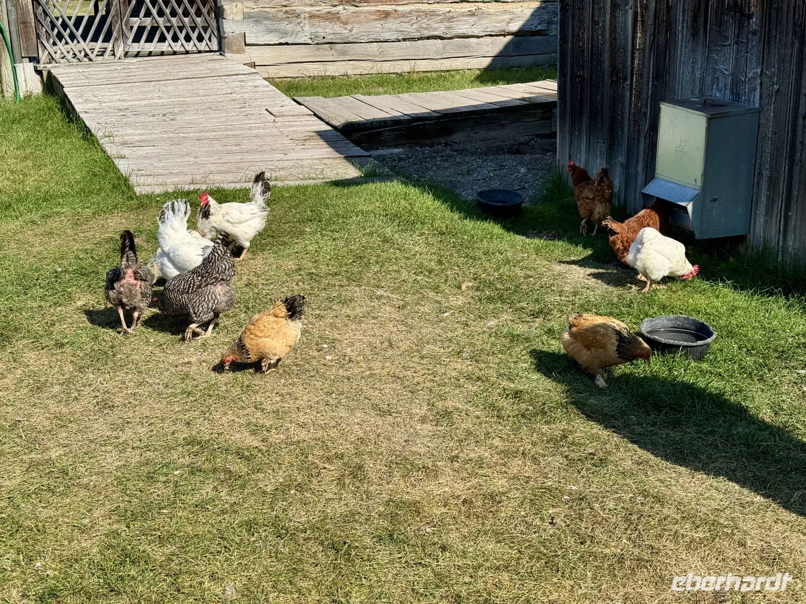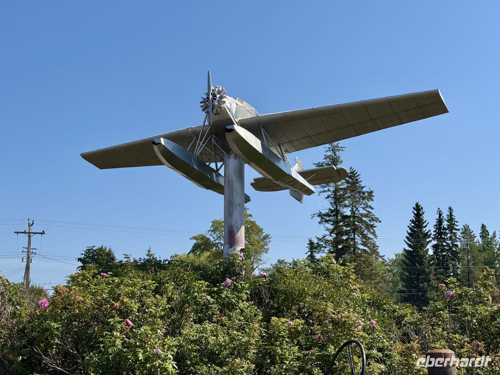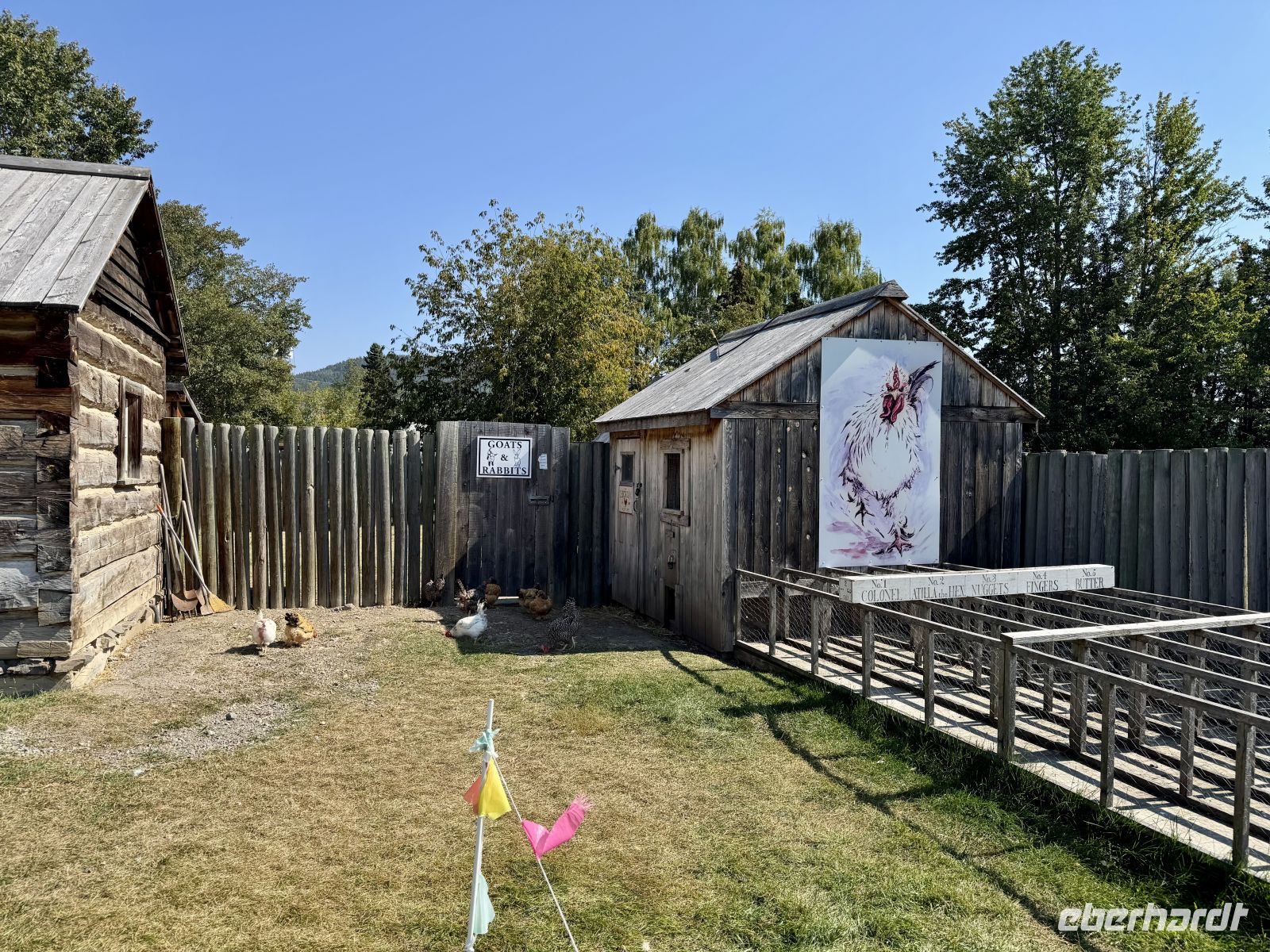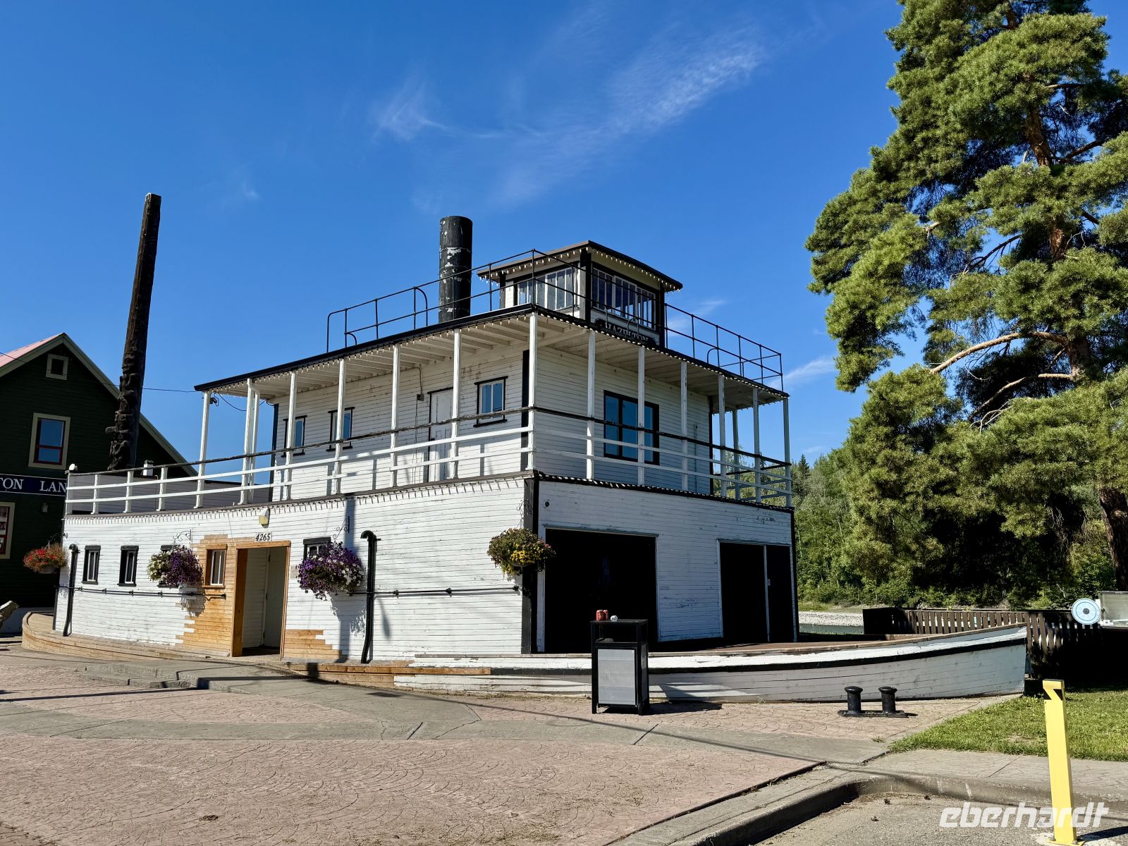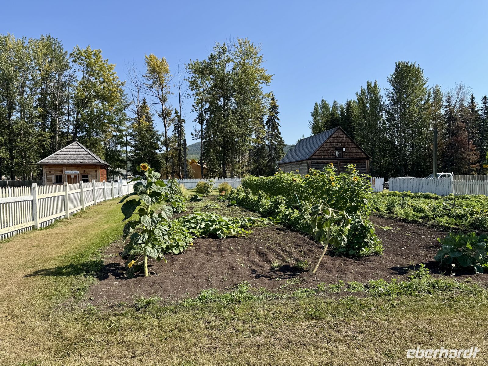 Der heutige Tag steht ganz im Zeichen der Erforschung und Erschließung des kanadischen Westens durch die großen Pelzhandelsgesellschaften. Höhepunkt des Tages ist der Besuch des Fort St. James, einer nationalen Gedenkstätte. Gleichzeitig wird uns die Weite Kanadas einmal mehr vor Augen geführt, denn bis dorthin sind es schon zwei Stunden Fahrt. Wir unterbrechen sie in Vanderhof, dem geografischen Zentrum von British Columbia, für einen Einkaufsstopp in einem Supermarkt und sind erstaunt über das riesige Angebot in solch einem vergleichsweise kleinen Ort mitten im Nirgendwo. In Fort St. James am Stuart Lake angekommen, reisen wir im dortigen Kino ins Jahr 1896 zurück. Im großen Handelsposten der Hudson’s Bay Company herrscht geschäftiges Treiben und große Anspannung, denn es steht ein großes Ereignis bevor: das weltberühmte Hühnerrennen. Unsere charmante Führerin Claire führt uns zum Schauplatz des großen Trubels, wo auch wir unsere Wetten auf die Sieger platzieren. Im Starterfeld sind diesmal große Namen wie Shadowfax, Chicken Nuggets, Attila the Hen und Butter Chicken vertreten. Unter meinen Gästen haben einige den richtigen Riecher und können ihren Gewinn in Form von vielen Chicken Bucks einstreichen. Ich selbst gehe diesmal allerdings — zum ersten Mal überhaupt — völlig leer aus und trotte entsprechend geknickt hinter Claire ins ehemalige Haupthaus des Forts, wo uns eine sehr interessante Führung erwartet. Auch im Handelshaus, Lagerhaus und Männerhaus treffen wir auf viele spannende Exponate und viele, viele Felle — nur ein Bruchteil dessen, was zu Hochzeiten hier lagerte. Der geräucherte Fisch und andere gelagerte Lebensmittel machen uns hungrig. Zum Glück haben wir ja vorhin eingekauft! Nur ein kleines Stück weiter nördlich am See finden wir in einem Park ein lauschiges Plätzchen für unser Picknick. Freddy spendiert zum Nachtisch zwei Packungen Timbits von Tim Hortons. Nun beginnt die lange Fahrt durch den kanadischen Lake District bis nach Smithers. Der Highway führt scheinbar endlos durch die fruchtbare Hochebene. Blaue Seen, grüne Wälder und weite Weideflächen ziehen an uns vorüber. Nach einer Pause in Burns Lake erblicken wir am Horizont die ersten schneebedeckten Berge. Wir nähern uns unserem heutigen Ziel. Obwohl Smithers kleiner ist als Prince George, versprüht es mehr Charme und erinnert eher an einen Wintersportort in den Alpen. Am Anfang der Hauptstraße steht sogar ein aus Holz geschnitzter Alphornbläser.