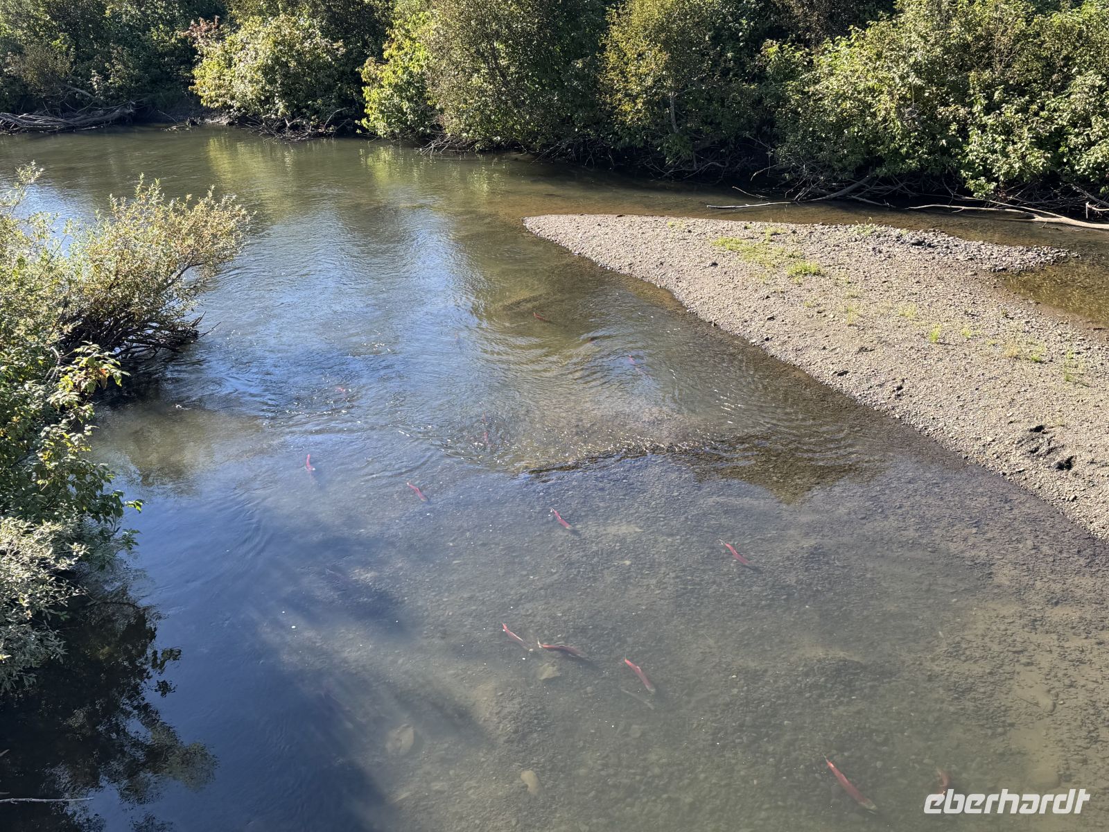 Meine Gäste haben auf diesen Tag sehnsüchtig hingefiebert und entsprechend hohe Erwartungen. Bärenbeobachtung und Ausflug zum Salmon Glacier! Das Wetter spielt wieder mit (haben wir nicht anders erwartet), aber von Hyder sind alle etwas schockiert. Die freundlichste Geisterstadt Alaskas – und dann groß Werbung für Trump 2028? Und so viel Schrott und Gerümpel? Wir fahren erstmal durch bis in den Tongass National Forest und sehen unterwegs einige majestätische Weißkopfseeadler auf der Jagd nach Lachsen. Am Fish Creek treffe ich auf eine (freundliche!) Rangerin, die ich schon vom letzten Jahr kenne und die mir etwas Hoffnung macht: Es würden wohl gerade täglich regelmäßig Grizzlys vorbeikommen und nach Lachsen fischen. Aber wann? Obwohl für die Bären eine üppige Mahlzeit angerichtet ist und der Bach vor Lachsen nur so überquillt, haben wir beim ersten Versuch keinen Erfolg. Wir ziehen weiter zum Salmon Glacier. Eine Herausforderung für Freddy, denn die geteerte Straße endet fast sofort und er muss etwa 25 Kilometer auf einer Schotterstraße meistern. Die führt zu verschiedenen Minen, darunter auch einer Goldmine, die wir passieren. Da sind wir tatsächlich schon wieder auf kanadischem Boden. Bald sehen wir die Gletscherzunge bläulich in der Sonne glitzern und machen einen ersten Fotostopp. Aber es sind immer noch mehr als zehn Kilometer bis zum Aussichtspunkt – der Salmon Glacier ist nämlich gewaltig, viel größer als der Athabasca-Gletscher! Alle sind von diesem Anblick begeistert! Auf einer Höhe von mehr als 1.100 Metern machen wir unsere Picknickpause und blicken dabei genau auf das Eis. Berücksichtigen wir die An- und Abreise, dann ist passenderweise heute unser Bergfest, weshalb ich schon seit Banff eine Flasche Zauberwasser im Gepäck habe. Natürlich dürfen alle – außer Freddy – vom kanadischen Whisky mit Ahornsirup probieren. Dabei hätte sich gerade unser Chauffeur nach dieser Auffahrt auf der Schotterstraße mehr als ein Gläschen verdient! Die Rückfahrt hinunter zum Fish Creek meistert er ebenfalls mit Bravour und darf sich nun eine Pause gönnen, während wir zur zweiten Bärenbeobachtung ausschwärmen. In unserer Abwesenheit waren doch tatsächlich eine Grizzlydame und ihr Junges hier! Vielleicht kommen sie auf ihrem Streifzug noch einmal zurück? Leider nein, nur ein kleiner Plüschbär wird gesichtet. Wieder kein Glück. Wir trotten traurig von dannen und probieren unser Glück bei den Weißkopfseeadlern. Natürlich fliegen sie gerade davon, als wir aus dem Bus aussteigen. Wir haben schon ein bisschen Pech heute mit dem Timing! Auch das Postamt in Hyder hat schon zu. Zum Glück können wir bei einer netten Dame im einzigen Souvenirladen Briefmarken erwerben und Postkarten abgeben – sie kümmert sich um alles Weitere. Wir können gut verstehen, weshalb sie im Winter nach Arizona flüchtet, denn erstens ist es hier in Hyder im Winter noch ausgestorbener und zweitens sieht es in Hyder an einigen Stellen schlimmer aus als bei den berühmten Hempels unterm Sofa. (Und wer kein Trump-Fan ist, hat in Hyder sowieso einen schweren Stand.) Die Beamten an der Grenze kriegen beinahe einen Schweißausbruch, als wir mit dem Bus vorfahren – so viele Pässe auf einmal, die heute kontrolliert werden müssen! Fast schon richtige Arbeit! Aber freundlich bleiben sie trotzdem. Kanadier halt. Nach zwei Stunden Freizeit treffen wir uns im Hotel zum zeitigen Abendessen wieder. Die neuen Eigentümer des Restaurants haben ein leckeres Buffet u. a. mit Salaten, Kartoffelgratin und sogar Crème Brûlée als Nachtisch aufgefahren – Letzteres hätte ich hier, mitten im Nirgendwo, nie erwartet! Trotzdem bleibe ich angespannt. Wo kriege ich heute noch einen echten Bären her? Zumindest spielen erstmal die Weißkopfseeadler bei unserer Rückkehr nach Alaska am Abend mit und lassen sich fotografieren. Und bei unserem nunmehr dritten Besuch am Fish Creek werde ich schließlich von einem Grizzly erlöst, der sich nach etwa einer halben Stunde am südlichen Ende für 10–15 Minuten blicken lässt, genüsslich einen Lachs verspeist und auf einem Baumstamm balanciert. Glückliche Gäste, erleichterter Reiseleiter! Jetzt kann Andreas endlich wieder ruhig schlafen! Nur noch alle unbeschadet durch die Geisterstadt Hyder und über die Grenze zurück nach Kanada bringen, zwei weitere Kilometer bis zum Hotel – dort warten mein Bett und süße Träume von kuscheligen Bären.