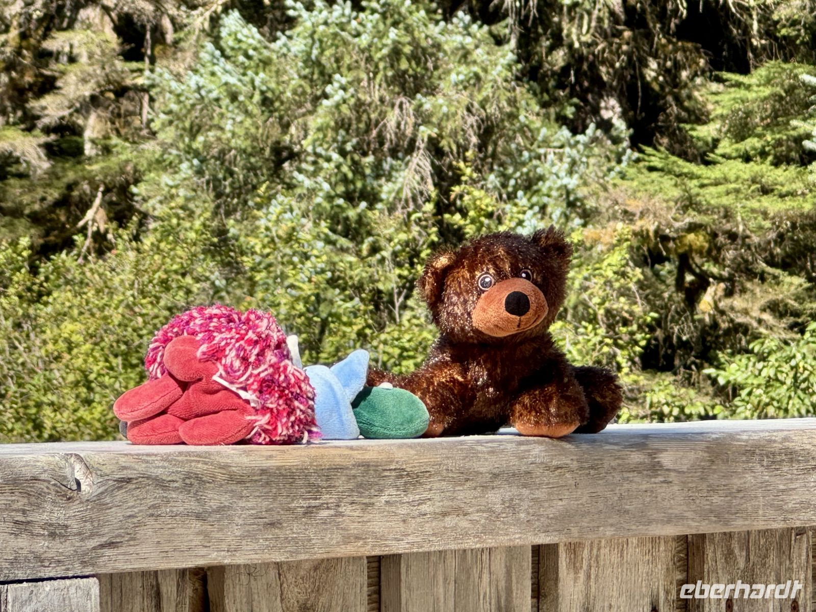 Nun haben wir gestern zwar endlich einen Bären gesehen, doch so richtig zufrieden bin ich noch nicht. Lassen mich etwa meine beiden plüschigen Glücksbringer Max und Jacques im Stich? Noch gebe ich meine Hoffnung nicht ganz auf. Doch auch das Wetter sind wir besser gewohnt. Bei unserer Abfahrt aus Stewart hängen die Wolken tief im Tal. Zumindest dieser Wohlfühlfaktor ändert sich im Laufe des Vormittags zu unserer Zufriedenheit. Aber Bären? Fehlanzeige. Keine Bären bis zum Bear River Glacier, wo wir nochmals einen Fotostopp einlegen. Keine Bären bis zur Tankstelle an der Meziadin Junction. Keine Bären am Meziadin Lake, denn die Ranger lassen uns ohne Genehmigung nicht auf den Campingplatz. Keine Bären auf dem ganzen Highway 37 bis zum Yellowhead Highway. Die Hoffnung auf ein weiteres Bärenwunder schwindet. Auf die Totempfähle in Gitanyow ist wenigstens Verlass. Sie stehen dort schweigend und beharrlich, teilweise seit mehr als 100 Jahren. Manche schon etwas schief, aber sie stehen. Welche geheimnisvollen Legenden wohl in ihnen verewigt sind? Wir erkennen u. a. Raben, Wölfe und Menschen um ein großes Loch im Eis. Ein paar Kilometer weiter überqueren wir wieder den Skeena River und sind zurück am Highway 16. Keine weiteren Bären. Vielleicht ist es doch einfach zu heiß in Kanada für diese Jahreszeit? Auch bei unserer Picknick-Pause an einem Rastplatz brennt die Sonne auf uns hinab. Zum Glück stehen zwei Picknick-Bänke im Schatten. Also dann, zurück in die Zivilisation! Erst Terrace, dann Prince Rupert, immerhin beide mit mehr als 10.000 Einwohnern. Für den Norden British Columbias quasi Mega-Metropolen. Definitiv groß genug für ein Tim Hortons, was Freddy zusätzlich motiviert. Vor und nach unserer Kaffeepause bei Tim Hortons bzw. Starbucks in Terrace sehen wir aber am Skeena River plötzlich ganz viele Bären! Hier halten sich die Schwarzbären also alle versteckt! Sechs prächtige Exemplare, darunter eine Bärenmama mit zwei tapsigen Jungtieren, die vor uns die Straße überqueren! Wie niedlich! Wir sind so perplex, dass wir manchmal gar nicht so schnell die Kamera zücken können. Zumindest von einem Schwarzbären am gegenüberliegenden Flussufer können wir gute Aufnahmen machen, denn Freddy fährt rechts ran und sogar ein kleines Stück zurück. Zum Glück ist nicht so viel Verkehr! Ach, heute Nacht werde ich ganz besonders gut schlafen – wenn sie nur nicht so kurz wäre! 4:20 Uhr wird mein Wecker klingeln ... Doch daran wollen wir jetzt noch nicht denken. Wir genießen die Weiterfahrt entlang des Flusses, des mächtigen Skeena River, durch das Küstengebirge und machen einen letzten Fotostopp am Telegraph Point, bevor wir Prince Rupert erreichen. Dort feiern wir am Abend im Restaurant unsere beiden Ehepaare, die heute ihr 40. bzw. sogar 50. (!) Jubiläum begehen. Goldene Hochzeit – eine wirklich starke Leistung!