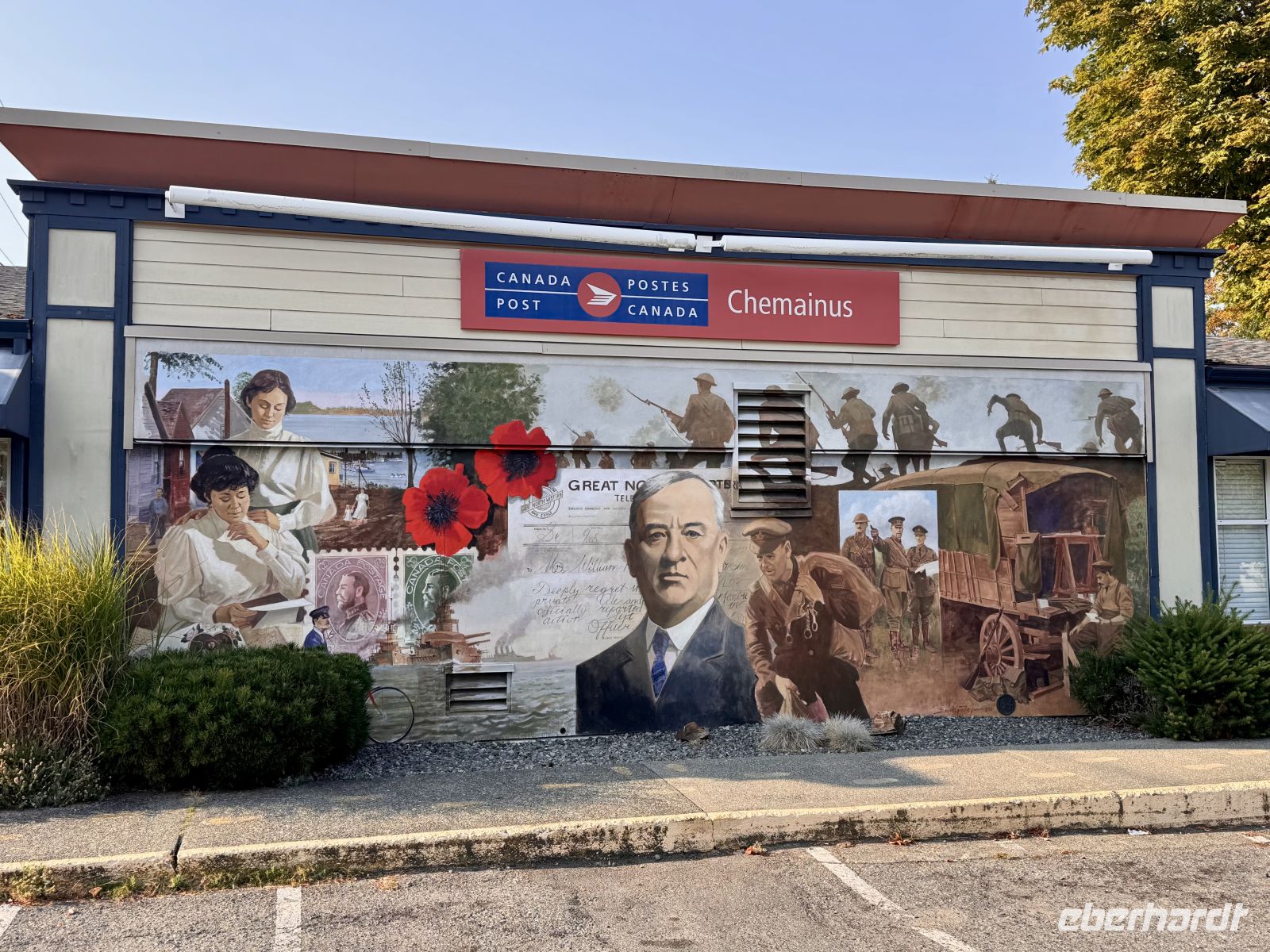 Auch beim Frühstück sorgt die andere Reisegruppe für etwas Chaos, wodurch das Hotelpersonal ganz schön flitzen muss und ins Schwitzen kommt. Mit ein bisschen Geduld werden wir gut satt und kommen pünktlich los. Nach einem Schlenker durch Port Hardy beginnen wir die Fahrt nach Victoria am anderen Ende der riesigen Insel. Sie führt zunächst wieder durch Wald, viel Wald, bis wir nach etwa einer Stunde die erste Pause in der Telegraph Cove machen. So ein großer Bus sorgt für neugierige Blicke durch einen Hirsch am Straßenrand. Auch auf der Wiese am Resortkomplex liegen zwei Hirsche. Doch damit nicht genug der Tierbegegnungen! Im Wasser der Bucht tummeln sich verspielte Seeotter, die offenbar ein Motorboot erwerben (oder stehlen?) wollen. Noch schnell einen Tee oder Kaffee holen, dann geht es weiter. Über 500 Kilometer muss Freddy heute schaffen. Für die Mittagspause steuern wir Campbell River an und haben damit fast die Hälfte der Strecke geschafft. Der Ort liegt schön am Wasser und bietet ein paar nette Bäckereien und Restaurants. Den Nachtisch gönnen wir uns in Chemainus, denn direkt neben dem Bus hat eine Eisdiele geparkt — nein, umgedreht, wir haben den Bus rein zufällig neben einer Eisdiele geparkt, die rein zufällig viele leckere Sorten selbst gemachtes Eis anbietet. Aber eigentlich sind wir wegen der vielen Wandgemälde hier, die den kleinen Ort verschönern und die Geschichte der First Nations und Einwanderer wiedergeben. Über den Malahat Pass gelangen wir schließlich am Abend nach Victoria, beziehen unser schönes Hotel direkt neben dem Parlament am Inner Harbour und können uns beim Spaziergang zum Restaurant gar nicht von den vielen schönen Gebäuden und Ansichten losreißen. Neben dem Parlament gibt es ja noch das Empress Hotel, das alte Dampfschiffterminal und die niedlichen Wassertaxis! So viele tolle Fotomotive! Das könnten wir übrigens von unseren drei Gängen zum Abendessen auch wieder sagen. Und lecker ist es auch. Derweil wird es draußen dunkel und Victoria entfaltet dank der zauberhaften Beleuchtung noch einmal einen ganz anderen Reiz.
