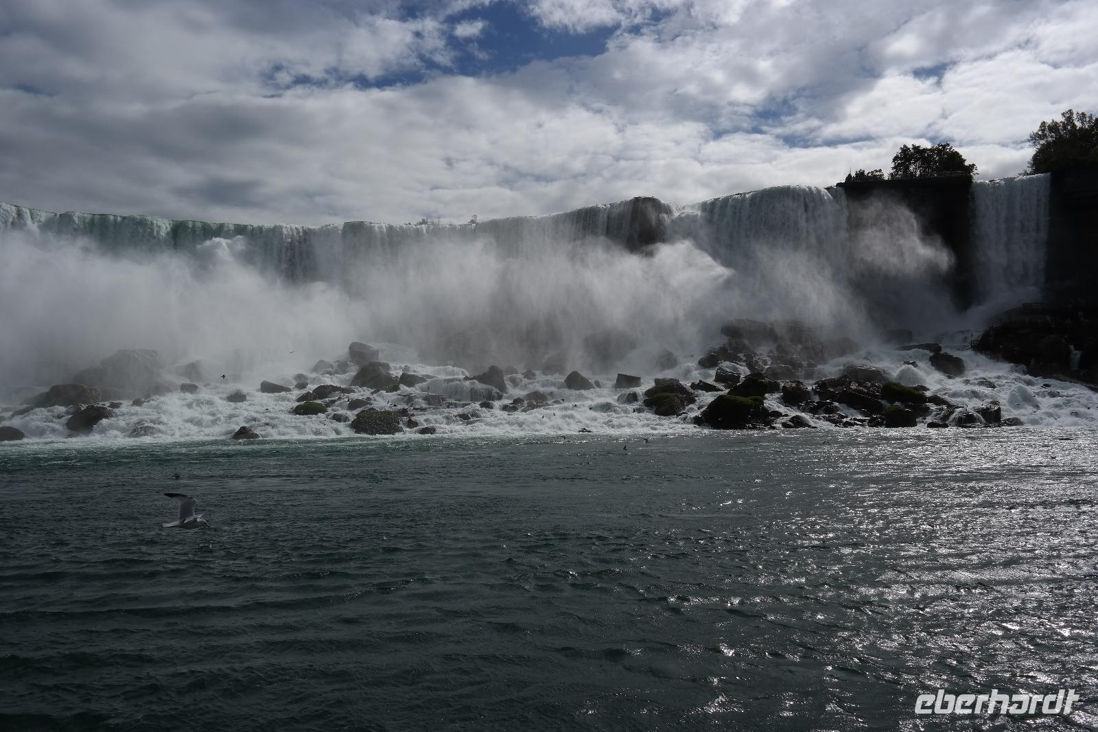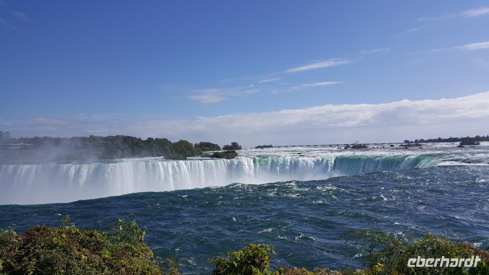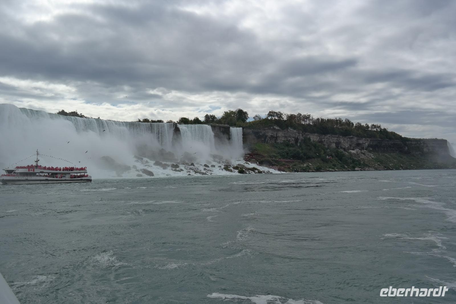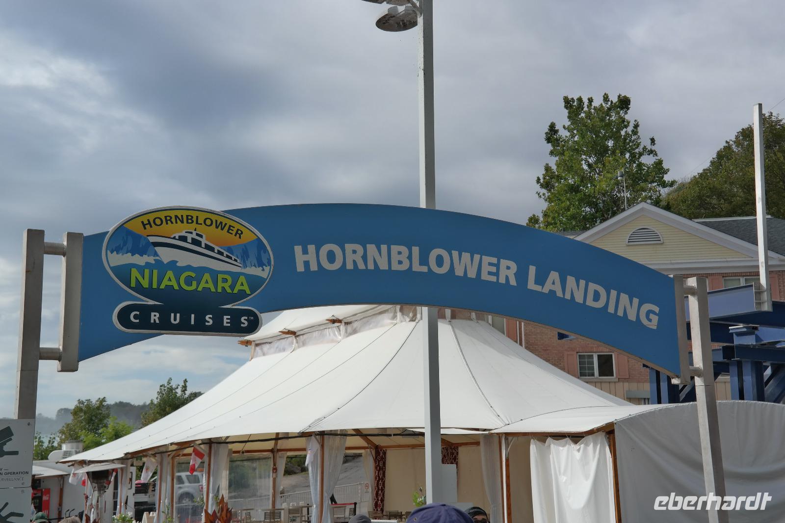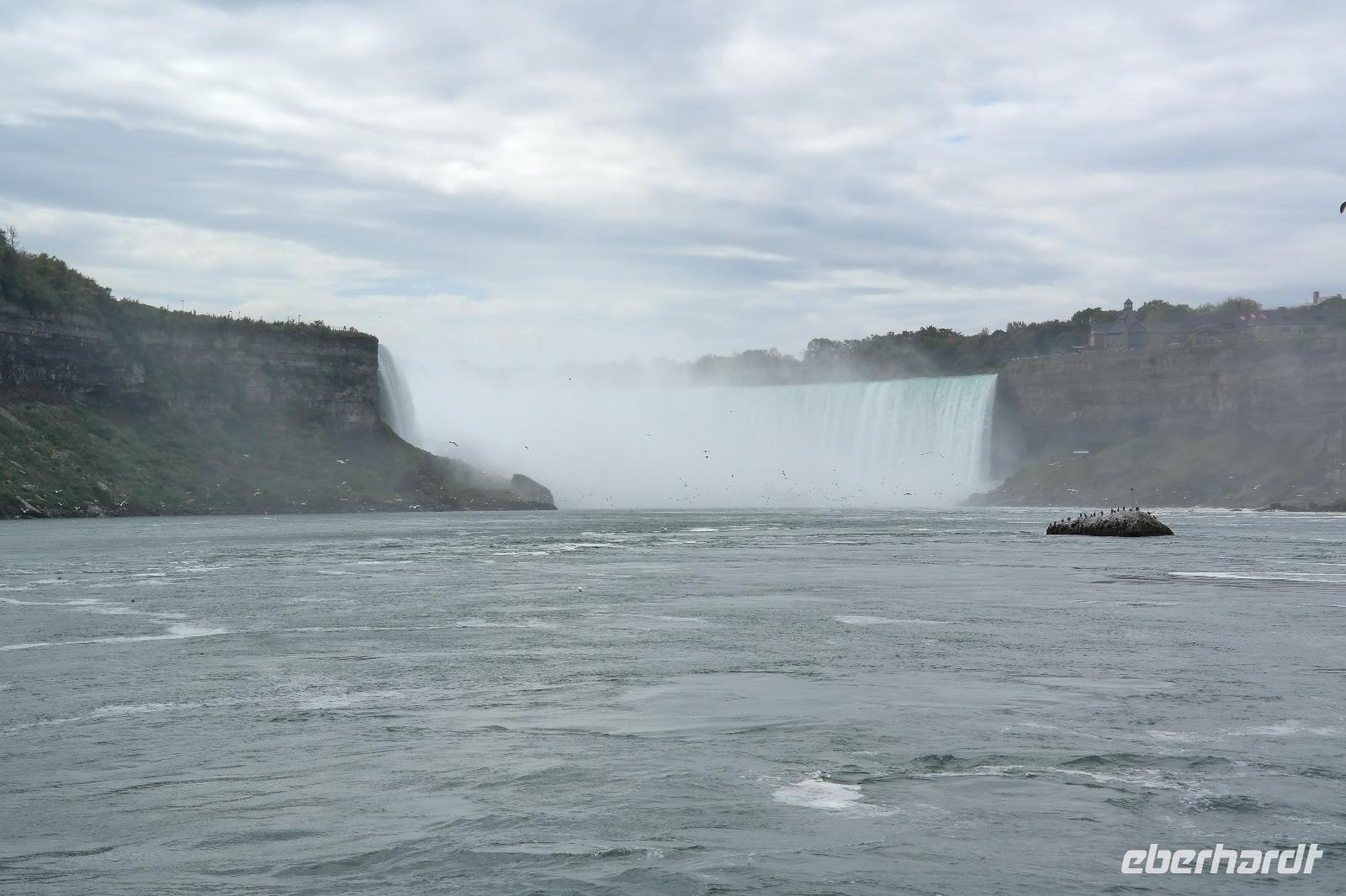 Am Morgen erreichten wir endlich Toronto. Die Skyline konnten wir schon morgens aus der Ferne sehen - vor allem das glänzende Gebäude der Bank of Montreal sticht sofort ins Auge: die Fenster sind mit jeweils 10 Gramm Gold beschichtet, sodass das ganze Gebäude inmitten der Hochhäuser Torontos hervor sticht. Schon um 09.00 Uhr startete unser Eberhardt-Inklusiv-Ausflug zu den Niagara Fällen. Bruno, unser Guide und Busfahrer Juan erwarteten uns am Hafen von Toronto. Nach einer ca. 1 ½-stündigen Fahrt kamen wir dann endlich an! Als erstes starteten wir die Bootsfahrt mit den sogenannten „Hornblower" und wurden ganz nah an die Niagara Fälle gebracht - trotz Regenponchos blieb natürlich keiner von uns trocken und auch, wenn wir inmitten der Gischt so gar nichts von den Fällen sehen konnten, sollte man sich dieses Erlebnis nicht entgehen lassen! Glücklicherweise kam die Sonne dann noch heraus und unsere Sachen konnten bei einem kleinen Spaziergang entlang des Ufers von den amerikanischen Fällen zu den kanadischen Horsehoe Fällen ein wenig trocknen. Nachdem wir einige Fotos schießen konnten holte uns der Bus wieder ab und wir fuhren zum Skylon Tower, wo wir unser Mittagessen mit einer wunderschönen Aussicht auf die Niagara Fälle genießen konnten.