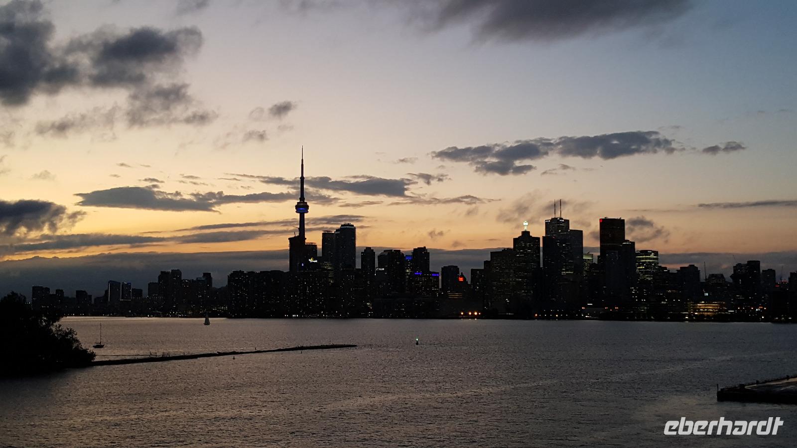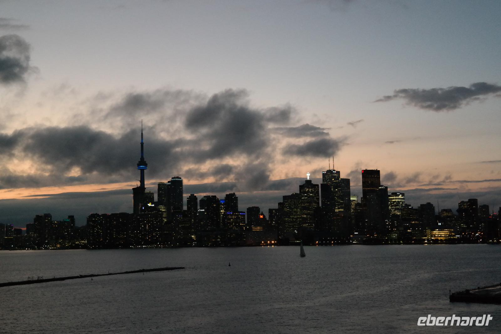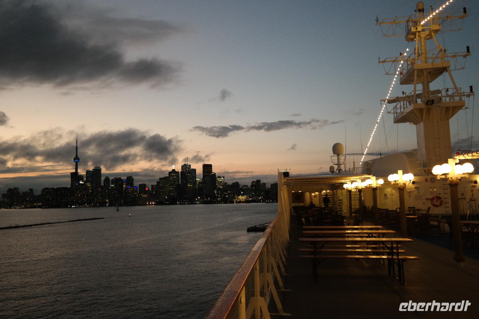 In der Nacht hat sich der Sturm gelegt und wir können nun glücklicherweise den Welland-Kanal durchqueren. Nach einigen Schleusen sehen wir dann in der ferne die Stadt Toronto. Da der Sturm weg gezogen ist haben wir heute klare Sicht und können die Stadt in 56 km Entfernung erkennen. Bei der Einfahrt in den Ontario-See in Port Weller können wir das kleine, niedliche Städtchen Niagara-On-The-Lake noch einmal von der Wasserseite aus sehen. Um 11.30 Uhr lädt uns unsere Kreuzfahrtdirektorin dann zum Frühschoppen auf das Pooldeck ein. Es gibt natürlich Bier, Weißwürste und Brezel. Nach einem entspannten Nachmittag an Bord machten wir uns alle noch einmal für das Abschiedsabendessen schick. Unser Kapitän Vladimir Vorobyov lud uns am Abend in die Lounge zum Abschieds-Cocktail ein und später gingen wir gemeinsam ins Restaurant um das Gala-Abendessen zu genießen.