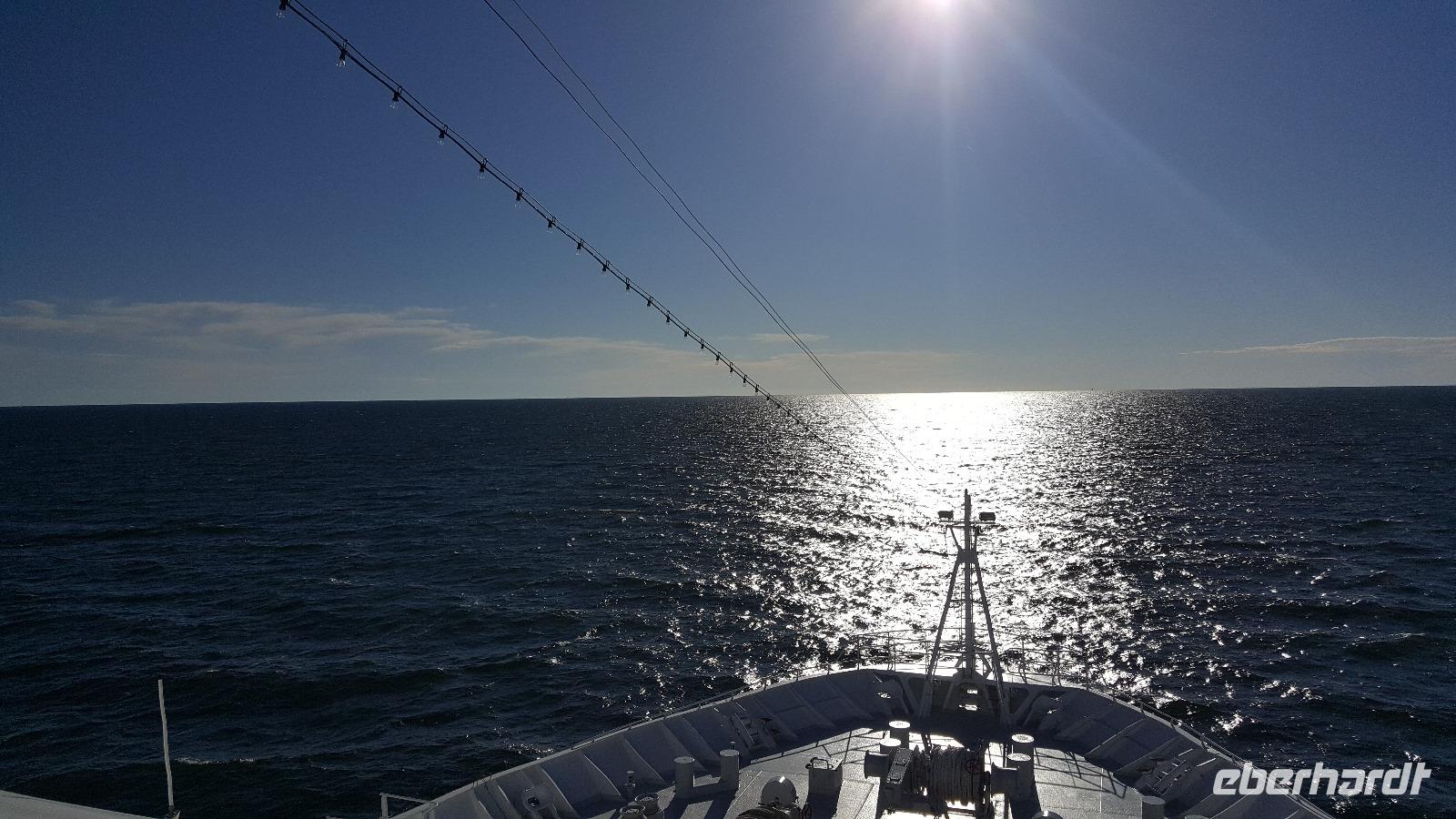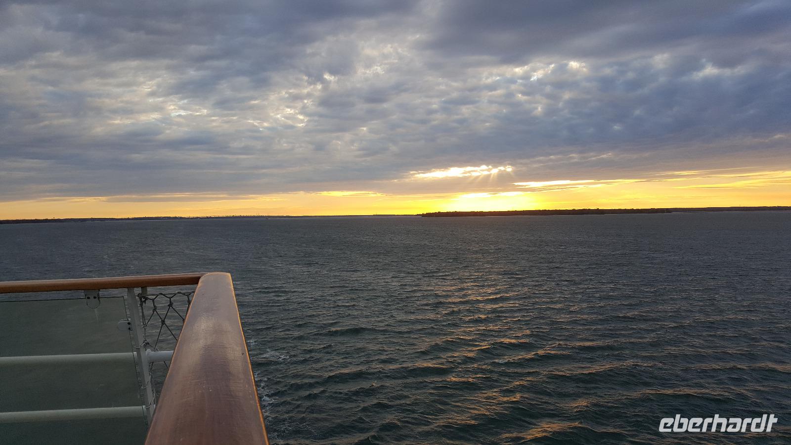 Nach einem kurzen Sicherheitscheck konnten wir schon auf das Schiff und unsere Kabine beziehen. Natürlich haben wir alle erst einmal das Schiff ausgekundschaftet und die Aussicht von Deck genossen. Um 19.00 Uhr habe ich alle Eberhardt-Gäste zum Sektempfang eingeladen um auf die schöne Kreuzfahrt anzustoßen, die uns nun bevor lag. Danach gingen wir alle gemeinsam ins Restaurant und haben das leckere Essen und den Service der Crew genossen. Da es ein langer und anstrengender Tag war, sind viele von uns bereits sehr zeitig ins Bett gegangen.