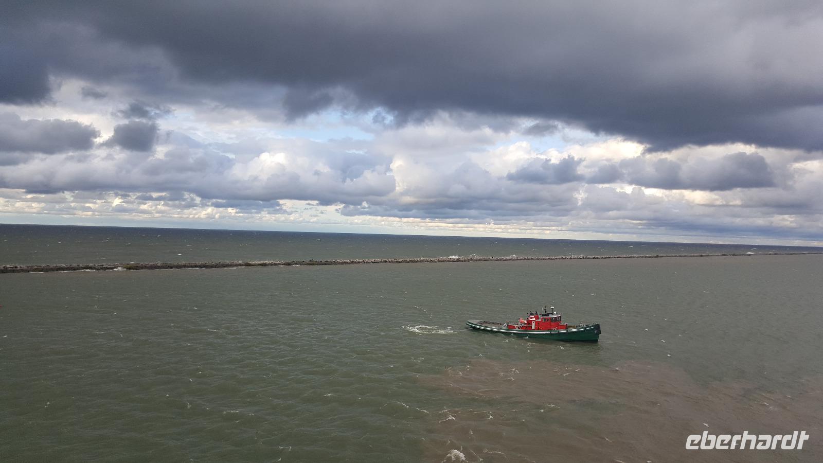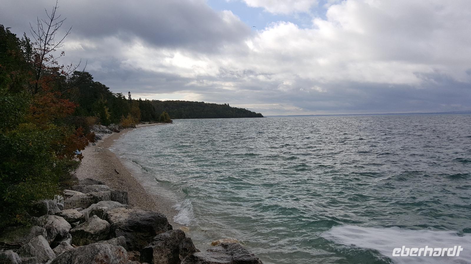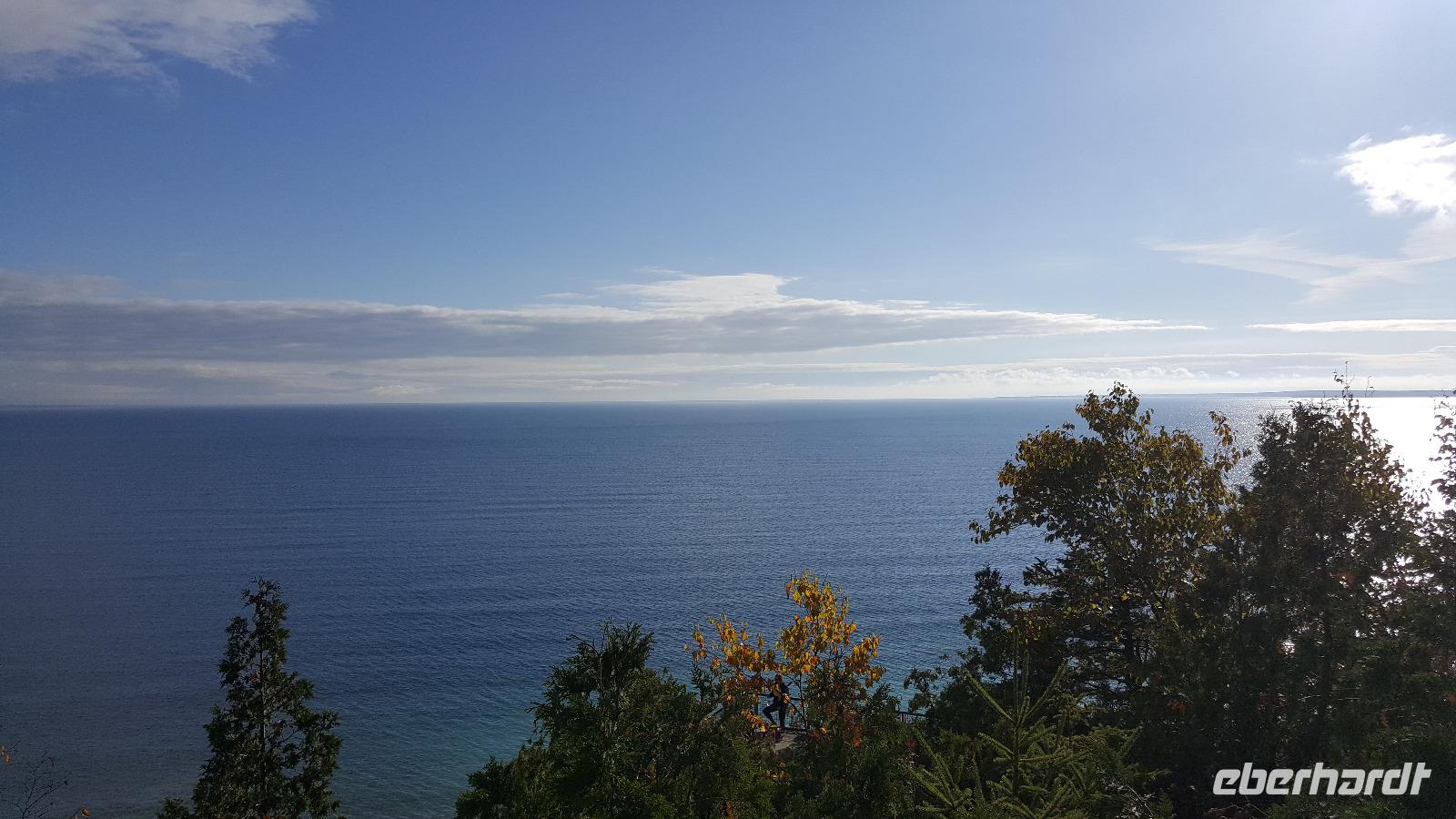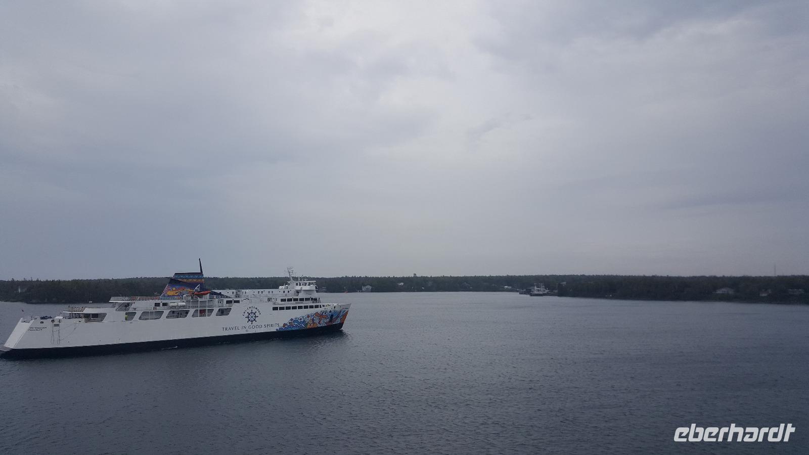 In der Nacht durchquerte unser Schiff die MS Hamburg den Lake Huron um am Nachmittag vor Tobermory in der Bucht Geogian Bay zu ankern. Die Georgian Bay ist eine große Seitenbucht des Lake Huron und sogar fast so groß wie der Lake Ontario. Die Durchfahrt zwischen der Bruce Halbinsel im Süden und Manitoulin Island im Norden ist gerade einmal 25 km breit.