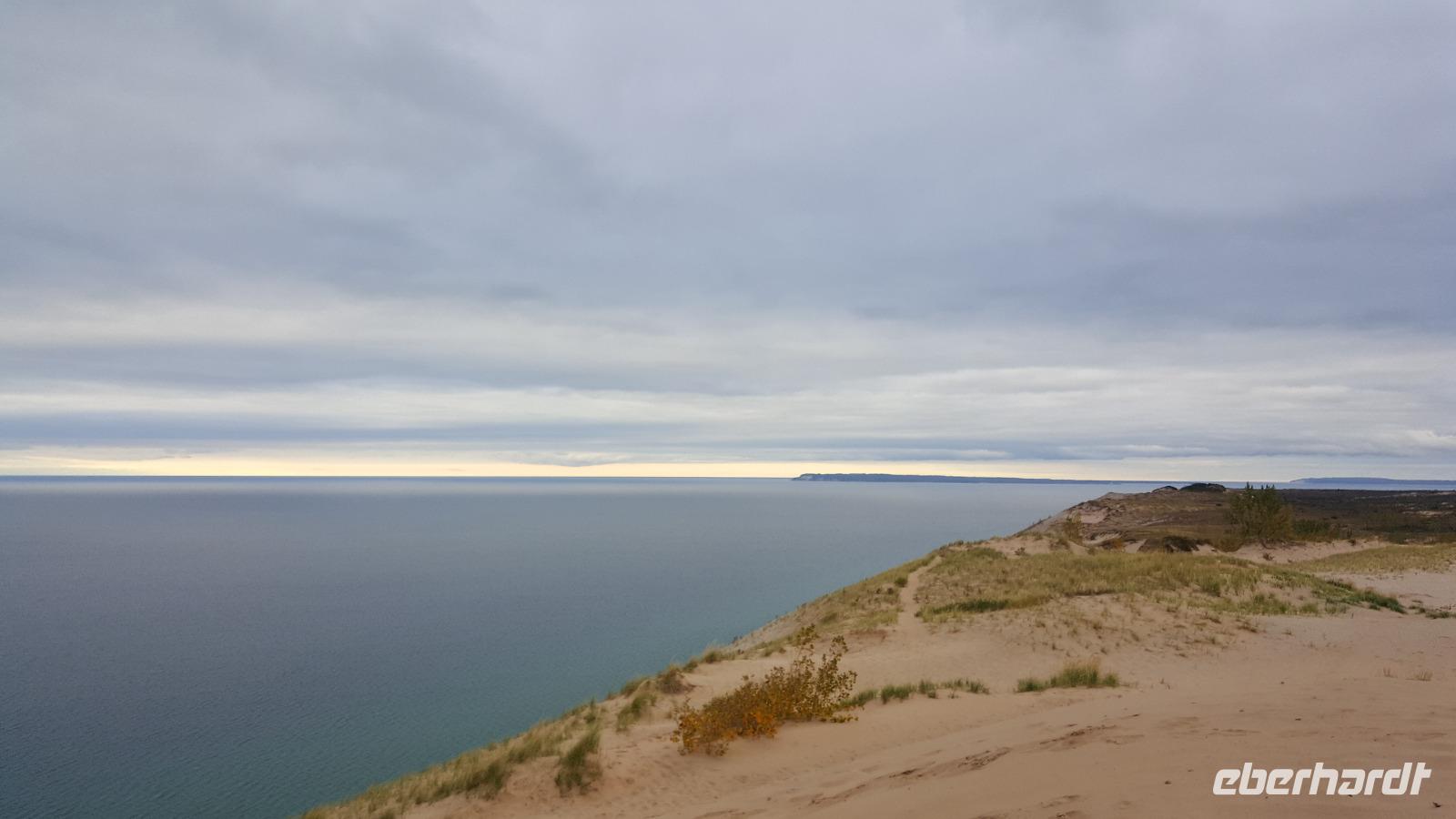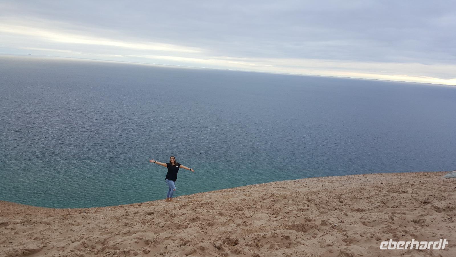 Heute konnten wir wieder ein wenig länger schlafen, denn wir sollen erst am Nachmittag in Traverse City ankommen. Um 10.00 Uhr sammelten sich wieder viele Gäste in der Lounge um Lektorin Heike bei ihrem Vortrag über Traverse City und Mackinac Island zuzuhören. Um 13.30 Uhr ankern wir und die Tenderboote werden ins Wasser gelassen. Traverse City liegt an der Grand Traverse Bay, welche durch die Old Mission Peninsula in zwei Buchten geteilt wird. Die Stadt ist unter anderem berühmt für die hellen Sandstrände und das türkisfarbene Wasser. Auf dem Programm steht ein Ausflug zu den Sleeping Bear Dünen und Glen Arbor. Ein kleiner Geheimtipp ist die Cherry Republic in Glen Arbor - man sollte auch definitiv die getrockneten Kirschen probieren wenn man in der Gegend ist, denn nicht umsonst heißt die Stadt „Cherry Capital of the World". Weiter fahren wir dann zu den Sleeping Bear Dünen - der Name stammt von einer Indianersage in der eine Bärin mit zwei Jungen vor einem Waldbrand in Wisconsin ins Wasser floh. Die Bärin erreichte das andere Ufer doch für die Jungen war es einfach zu weit und sie ertranken. Der Umriss der Dünen soll die schlafende Bärin darstellen, die auf ihre Jungen wartet. Die beiden Inseln North - und South Manitou Island stellen die beiden Jungen dar. Der Geist Manitu soll die beiden Bären in die Inseln verwandelt haben, genau dort wo sie ertranken.