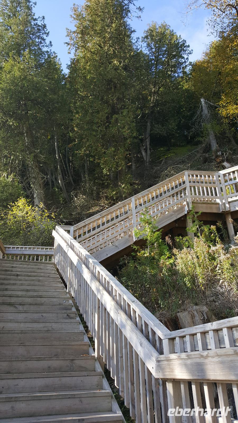 Da es am heutigen Tag sehr windig ist, fällt der Ausflug „Fahrt mit dem Glasbodenboot" leider aus, sodass alle Gäste heute „freilaufend" sind. Das kleine Fischerdorf Tobermory erreichten wir durch die Tenderboote da das Schiff auf Reede liegt. Wir wanderten ein kurzes Stück zu einem Aussichtsturm direkt neben dem Nationalparkzentrum. Von hier oben hatte man einen tollen Blick über die Landschaft und die Bucht. Leider war die Farbenpracht des Indian Summers noch nicht so weit fortgeschritten, sodass man immer noch viel grün sehen konnte. Nach einen kurzen Spaziergang durch den Wald zum Wasser ging es wieder zurück nach Tobermory. Einige haben vielleicht auch auf ihrer Wanderung das Kalkgestein des Niagara Escarpments wieder entdeckt - Kalkgestein eines Tropenmeers welches vor ca. 400 Mio. Jahren verschwand. Das Escarpment ist charakterisiert durch Kalkstein und zieht sich durch das ganze Gebiet der Großen Seen. Durch die immernoch vorhandenen Kalksteinklippen, erhält das glasklare Wasser vor Tobermory eine wunderschöne Türkis-Färbung.