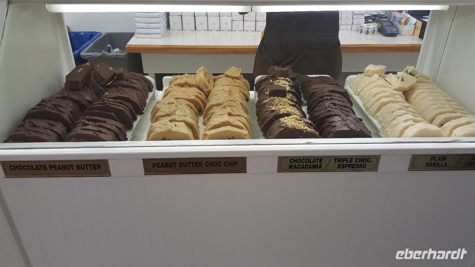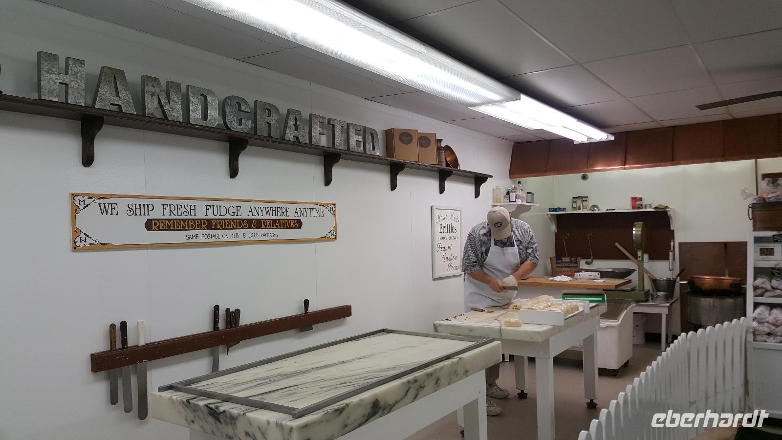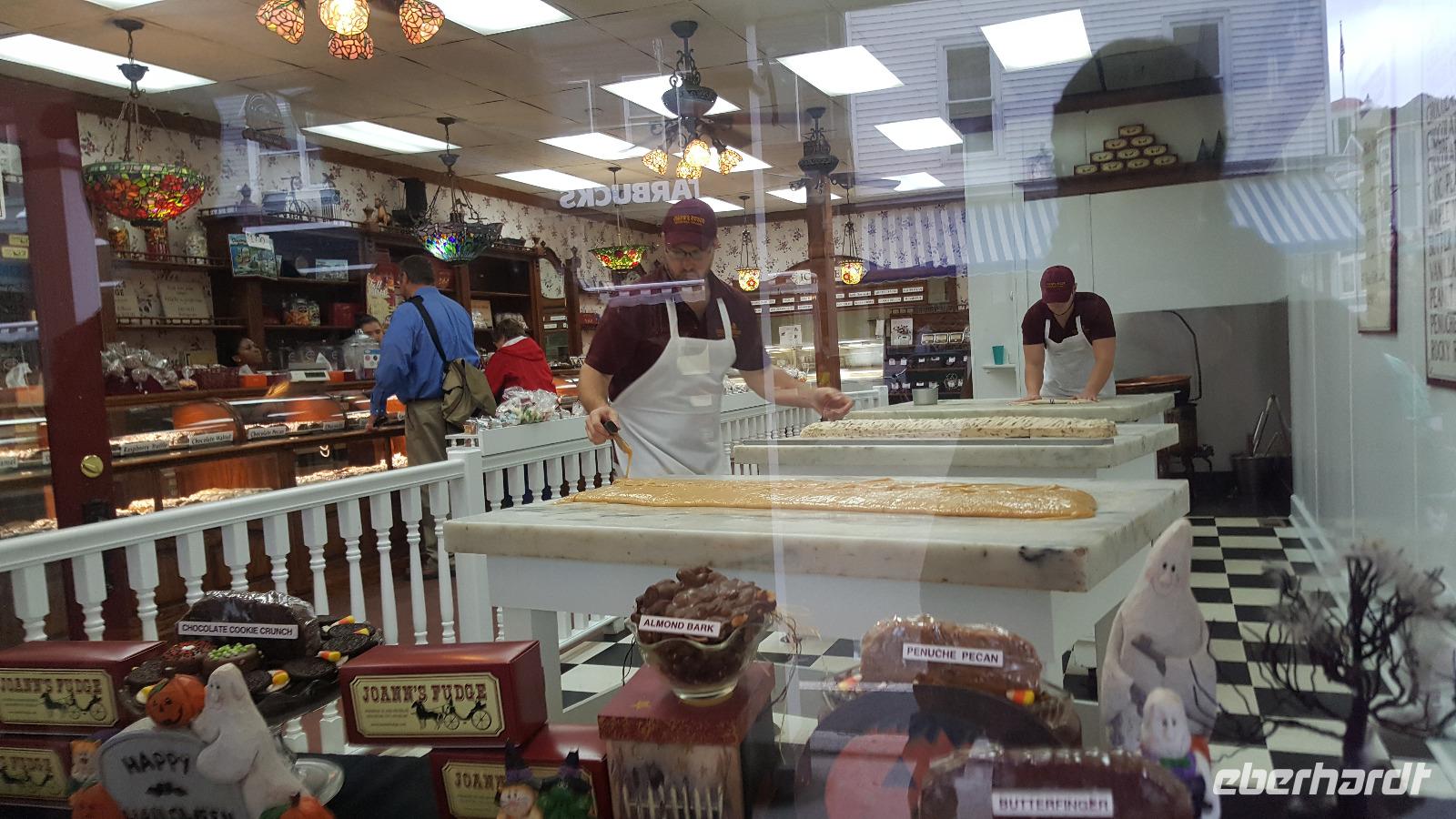 Wer Ruhe und Abstand vom Alltagsleben sucht, findet dies hier auf Mackinac Island - zumindest in der Nebensaison. Auf der ca. 10km² großen Insel dürfen keine Autos fahren, somit ist es ein Paradies für Wanderer und Radler - wenn auch die höchste Stelle nicht einmal 100m überschreitet. Ich lieh mir ein Fahrrad aus und umrundete einmal die Insel auf dem 13 km langen „Highway" - auf halber Strecke traf ich einige unserer Gruppe, die auch auf Fahrrädern unterwegs waren. In der kleinen Stadt wieder angekommen ließ ich mir es auch nicht nehmen die Spezialität der Insel zu probieren: Fudge! In der ganzen Stadt riecht es nach dieser süßen Leckerei und in fast allen Geschäften kann man sehen wie die flüssige Schokolade auf Steintischen hin und her gewälzt wird, bis sie erkaltet und zu einer festen Masse wird. Diese wird dann in Stücke geschnitten und direkt verkauft.