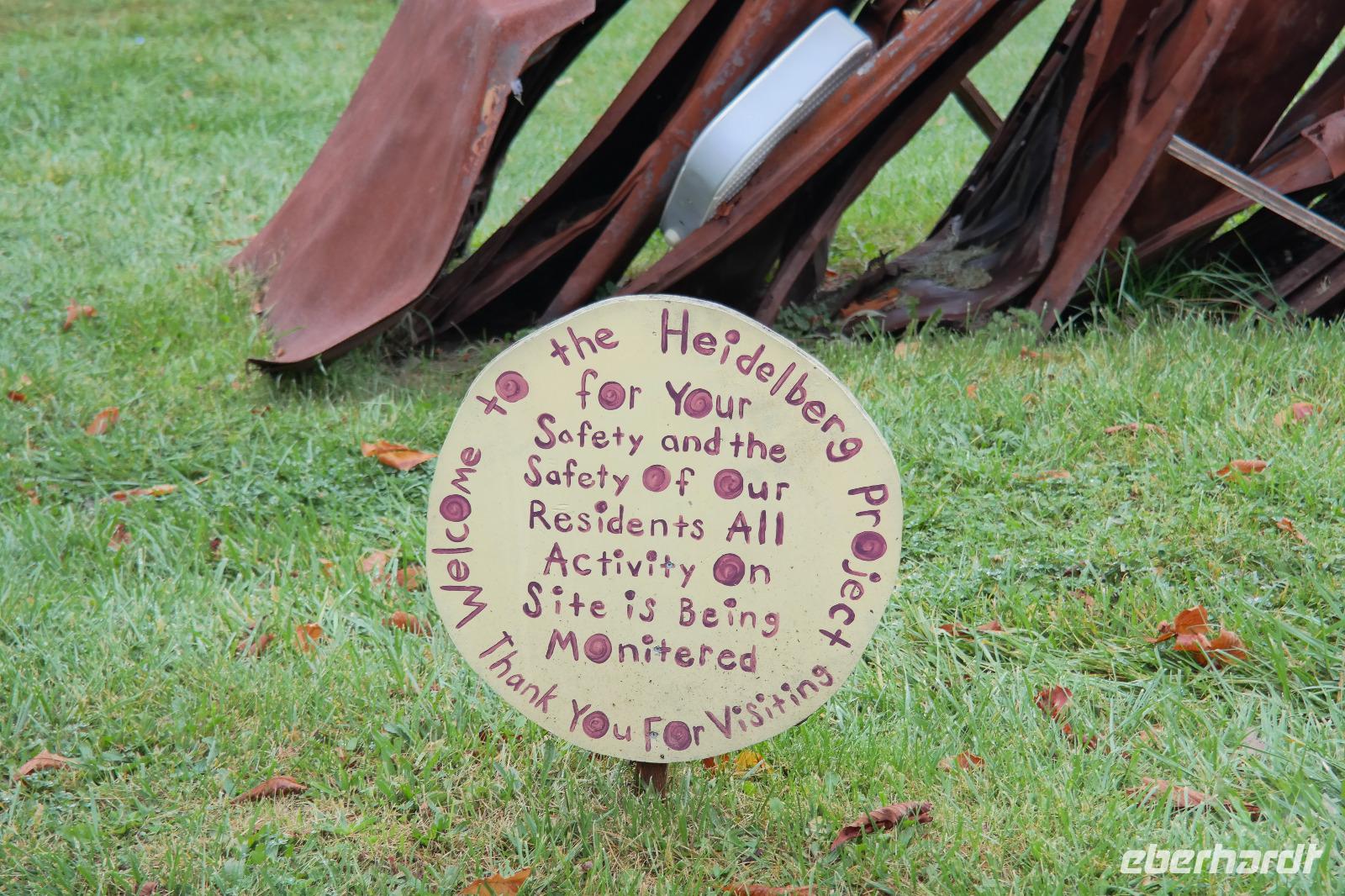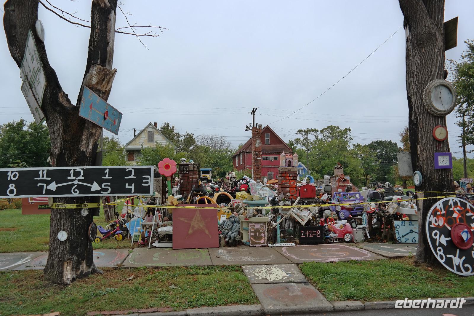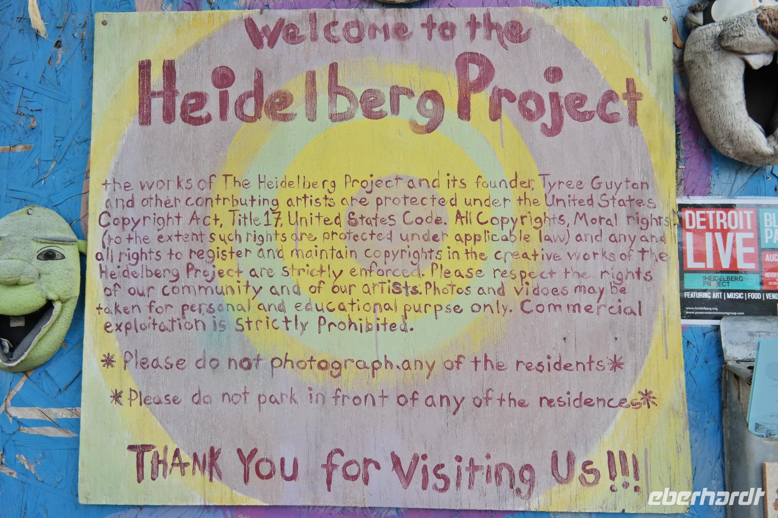 Nach der Grenzkontrolle konnte unser Ausflug dann richtig starten: Wir fuhren zuerst zur Bahnstation wo wir in einen sogenannten „People Mover" stiegen und eine Runde mit der selbstfahrenden Bahn drehten um einen kurzen Überblick über die Stadt erhielten. Als wir am Flussufer vorbei fuhren hatten wir einen tollen Blick auf die MS Hamburg und die Ambassador Bridge. Weiter ging es dann mit dem Bus durch die Stadt - am Guardian Building und Fisher Building stiegen wir aus um die farbenprächtigen Bauwerke des Jugendstils näher zu bestaunen. Aber nicht nur das moderne Stadtzentrum wurde uns bei der Stadtrundfahrt gezeigt, sondern auch die Problembereiche der Stadt Detroit. So besuchten wir das Heidelberg Project, welches vor 25 Jahren gegründet wurde um der Verwahrlosung des Stadtteils entgegen zu wirken. Die Bewohner, welche hauptsächlich afro-amerikanischer Abstammung sind, versuchen mit den wenigen finanziellen Mitteln die sie haben der Stadt wieder ein wenig Leben einzuhauchen, indem sie ihre Häuser knallbunt anmalen und allerlei Trödel den sie finden oder noch zu Hause stehen haben versuchen in Kunstwerke zu verwandeln.