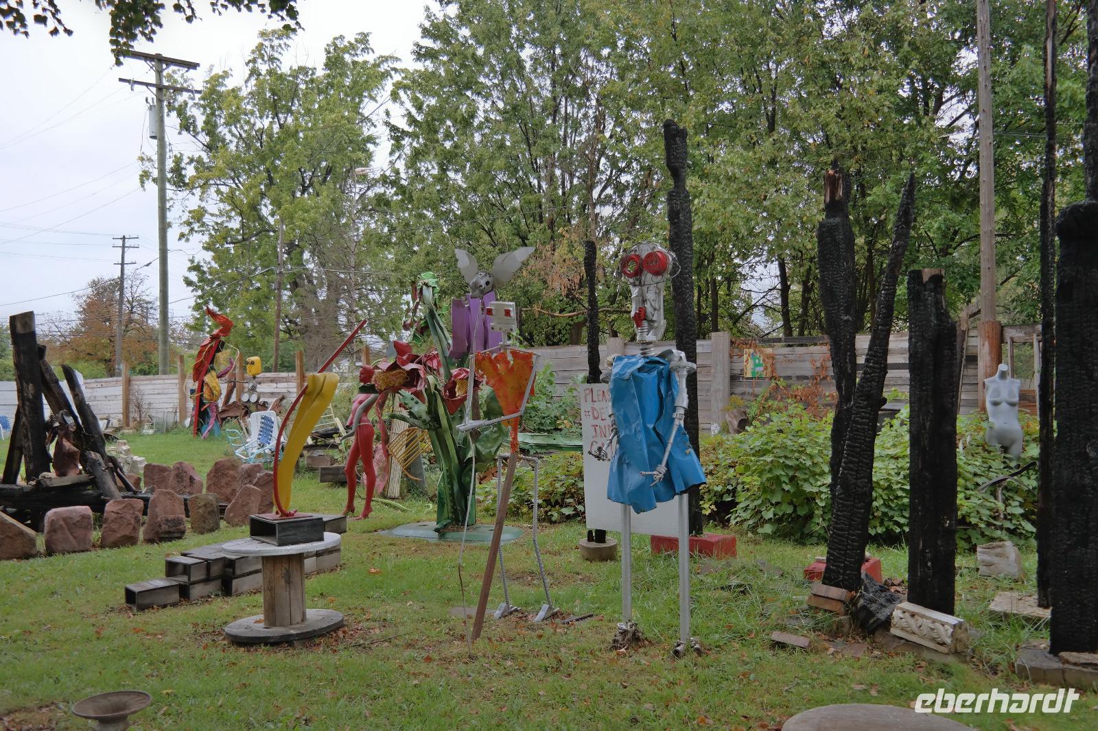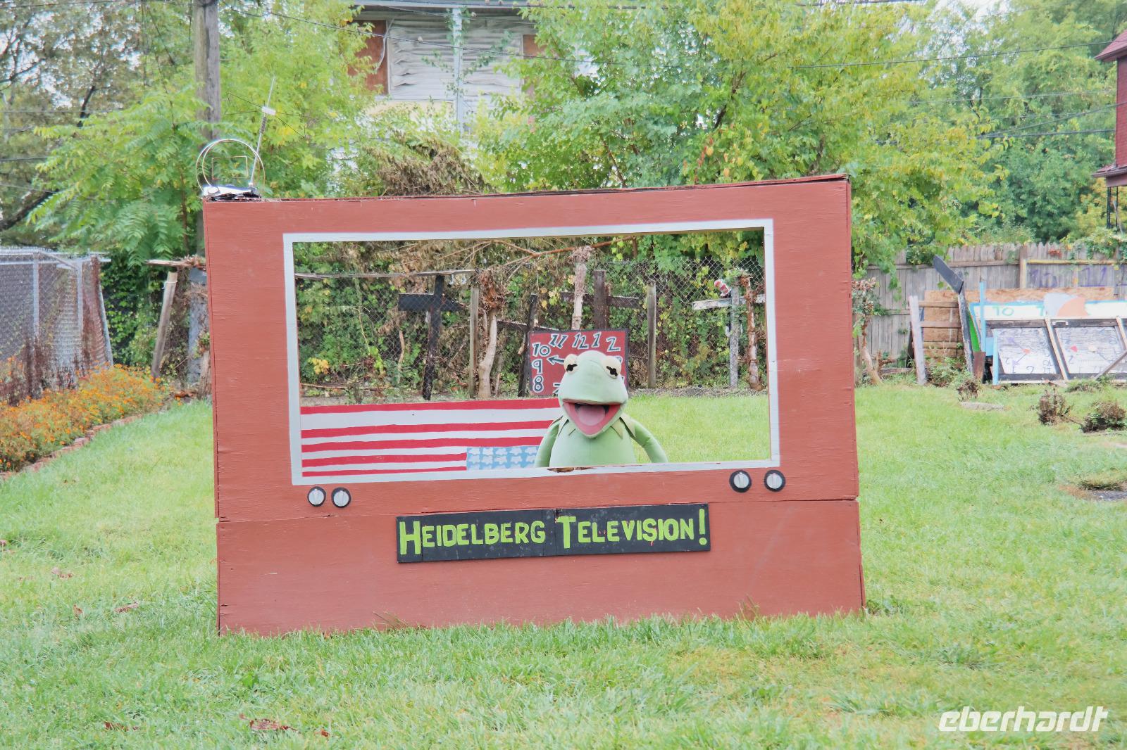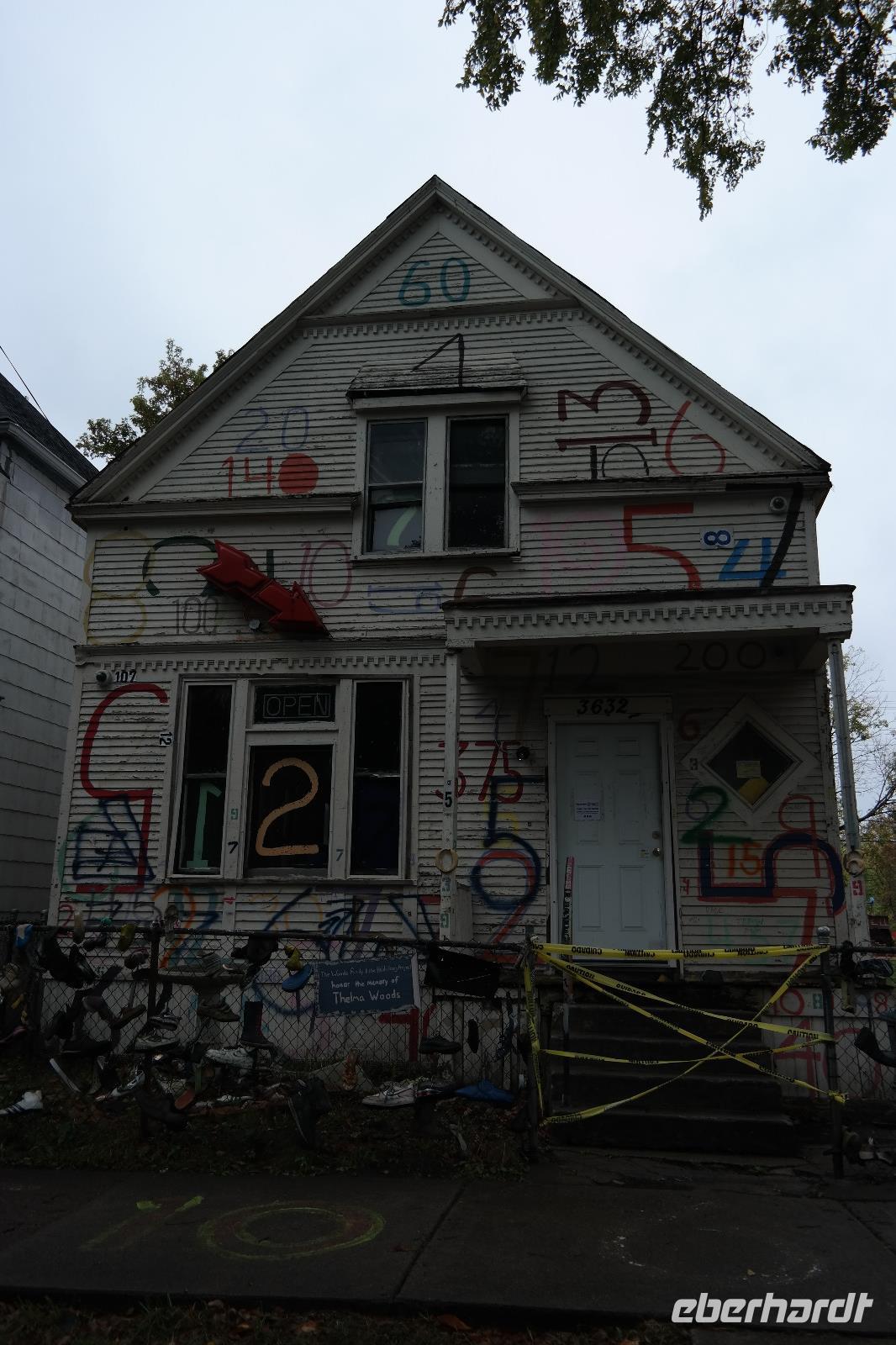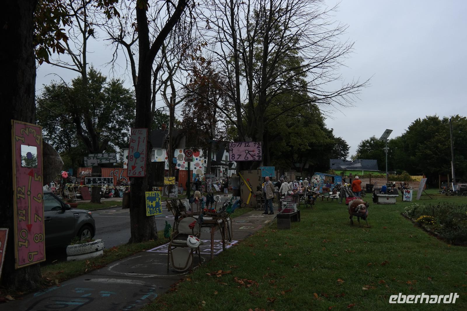 Nach der Grenzkontrolle konnte unser Ausflug dann richtig starten: Wir fuhren zuerst zur Bahnstation wo wir in einen sogenannten „People Mover" stiegen und eine Runde mit der selbstfahrenden Bahn drehten um einen kurzen Überblick über die Stadt erhielten. Als wir am Flussufer vorbei fuhren hatten wir einen tollen Blick auf die MS Hamburg und die Ambassador Bridge. Weiter ging es dann mit dem Bus durch die Stadt - am Guardian Building und Fisher Building stiegen wir aus um die farbenprächtigen Bauwerke des Jugendstils näher zu bestaunen. Aber nicht nur das moderne Stadtzentrum wurde uns bei der Stadtrundfahrt gezeigt, sondern auch die Problembereiche der Stadt Detroit. So besuchten wir das Heidelberg Project, welches vor 25 Jahren gegründet wurde um der Verwahrlosung des Stadtteils entgegen zu wirken. Die Bewohner, welche hauptsächlich afro-amerikanischer Abstammung sind, versuchen mit den wenigen finanziellen Mitteln die sie haben der Stadt wieder ein wenig Leben einzuhauchen, indem sie ihre Häuser knallbunt anmalen und allerlei Trödel den sie finden oder noch zu Hause stehen haben versuchen in Kunstwerke zu verwandeln.