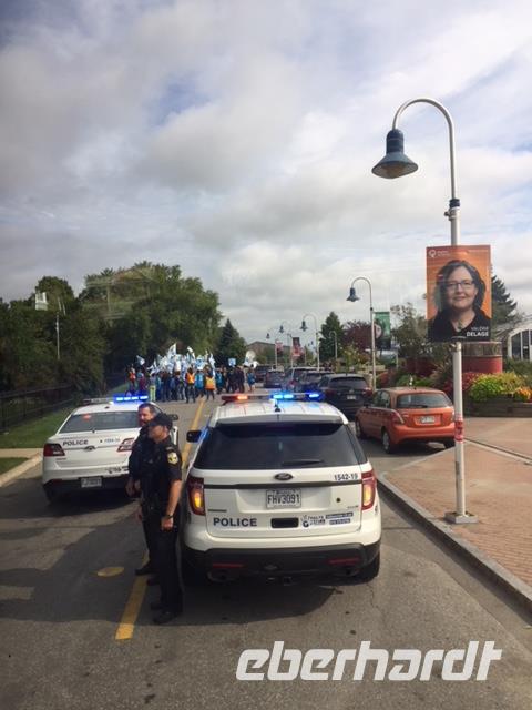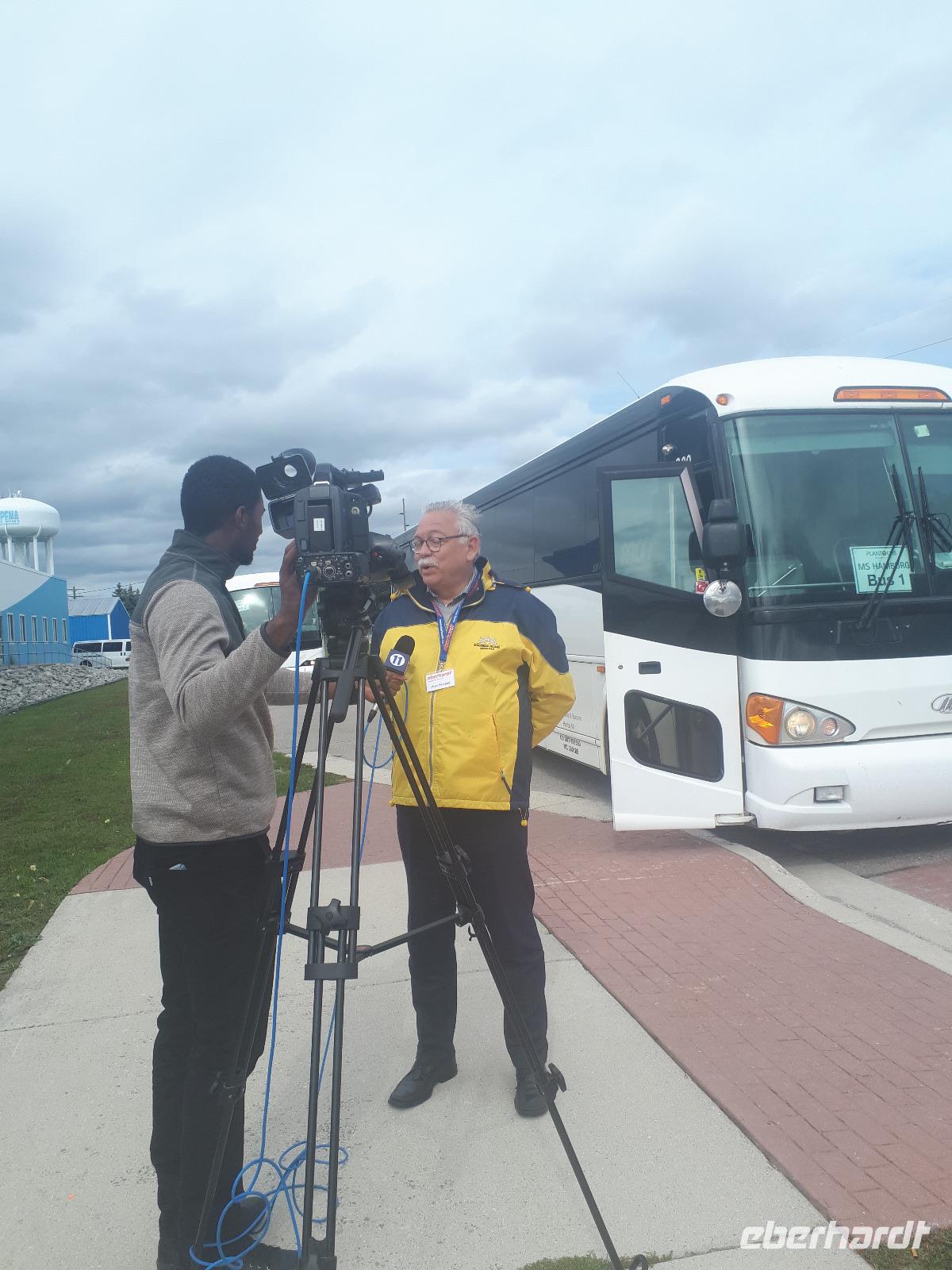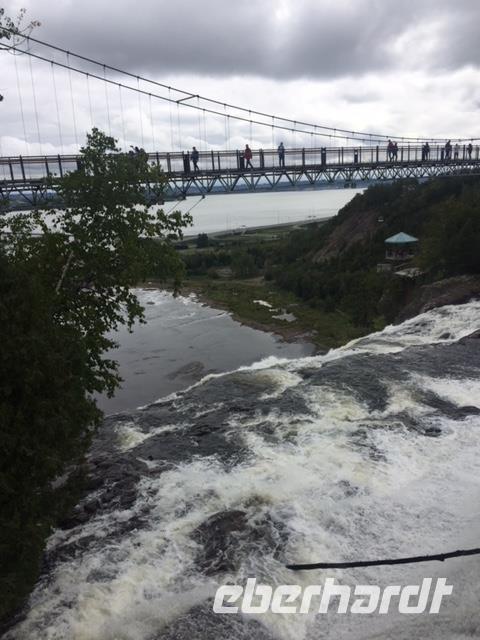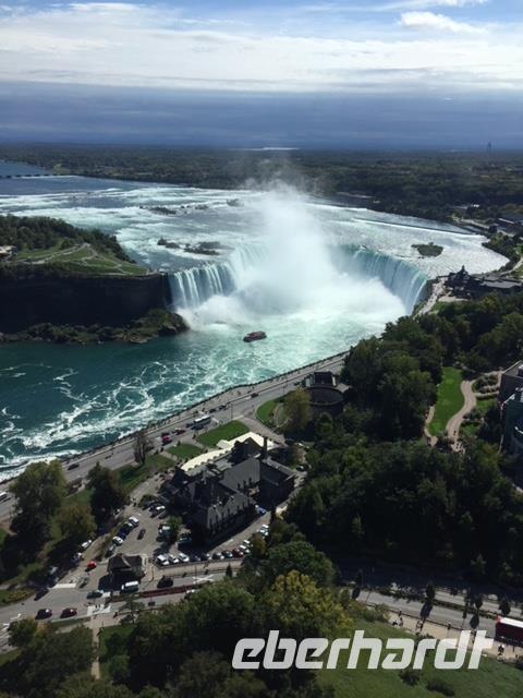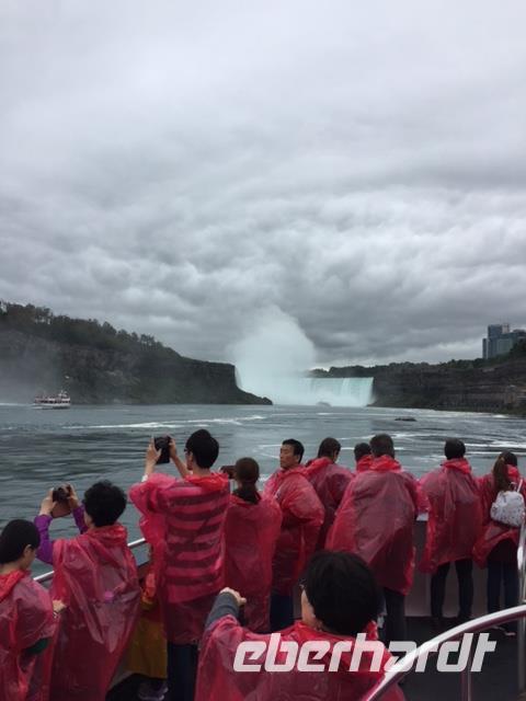 Heute haben wir unseren exklusiven Eberhardt-Ausflug zu den Niagarafällen. Edith, eine der lebenserfahrensten Reiseleiterinnen, die wir auf dieser Reise kennenlernen, fährt mit uns an die weltberühmten Wasserfälle. Leider spielt uns die Technik im Bus einen Streich. Dennoch erleben wir eine abwechslungsreiche Fahrt zu den Niagarafällen. Dort geht es dann Schlag auf Schlag. Ein ausgeklügeltes Organisationssystem nimmt uns auf und kurz darauf sind wir, mit roten Plastikplanen behängt, auf einem Schiff welches uns vor und hinter die Wasserfälle fährt. Fazit: klatschnass - aber wir waren da. Der Himmel reißt auf und während des gemeinsamen Mittagessens im Drehrestaurant des Skylon Towers bietet sich uns ein fantastischer Anblick der Wasserfälle von oben.