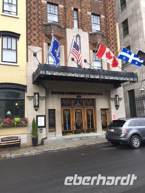 Der Frankfurter Flughafen ist in bester Morgenlaune. Reisende hasten zu ihren Gates oder schlendern gemütlich herum, genehmigen sich noch einen Kaffee oder warten auf ihren Abflug. Langsam vergrößert sich unsere Reisegruppe. Nach und nach kommen die Gäste aus Pforzheim, Leipzig, Berlin und Dresden an. Ein erstes Kennenlernen, und schon beginnt das so genannte Boarding. Eine seltsame Beschreibung des Vorganges, wenn dutzende Menschen versuchen, zum gleichen Zeitpunkt ihr Flugzeug zu betreten. Dabei hat doch jeder einen fest gebuchten Platz. So natürlich auch wir, die voller Erwartung in Richtung Montreal fliegen. Der Service im Flieger ist einschließlich der angebotenen Unterhaltungsprogramme sehr bequem und komfortabel. Nach der Landung in Montreal erleben wir die erste Einreise auf den amerikanischen Kontinent. Fast spielend überwinden wir die Zollschranken in Form eines Computerdisplays, den es zu bedienen gilt. Jetzt warten wir auf unseren Flug nach Québec. Warten ist dann auch am örtlichen Gepäckband angesagt, da lässt man es mit kanadischer Gemütlichkeit sehr langsam angehen. Silke, unsere örtliche Reiseleitung, erwartet uns geduldig bereits am Ausgang. Während der kurzen Fahrt zu unserem Hotel nehmen wir die ersten Eindrücke von Kanada in uns auf. Der Rest des Tages besteht aus dem Zimmerbezug und einem gemeinsamen Abendessen im Hotel Clarendon.