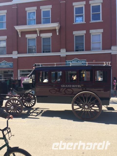 Der heutige Morgen beginnt mit einem Skattournier, an dem auch Kapitän Vladimir Vorobyov teilnimmt. Wir sind gespannt, wie die teilnehmenden Damen unserer Gruppe den Zeichenkurs absolvieren werden. Immerhin hat Jolanda versprochen, mit einer revolutionären Methode Malwillige zu Künstlern zu machen. Das Wetter verspricht heute richtig gut zu werden. Das sind ideale Voraussetzungen, um einen wirklich gemütlichen Nachmittag auf Mackinac Island zu erleben. Eine wirklich autofreie Urlaubsinsel, die mit dem Grand-Hotel eines der mondänsten Feriendomizile Nordamerikas beherbergt. Selbstverständlich probieren wir auch den Fudge, eine Toffee-ähnliche Masse, die vor allem süß schmeckt. Die zahlreichen Shops der Insel bieten einen ganz besonderen Service, nämlich kostenfreien Internetzugang und damit natürlich die beste Gelegenheit, Bilder, Bilder, Bilder nach Hause zu schicken. Am Abend eine echt gelungene Überraschung: das Team der MS Hamburg kann auch richtig Party machen. Motto des Abends: „Black and White".