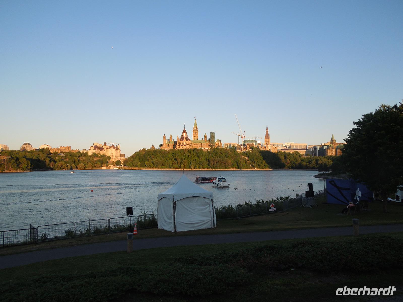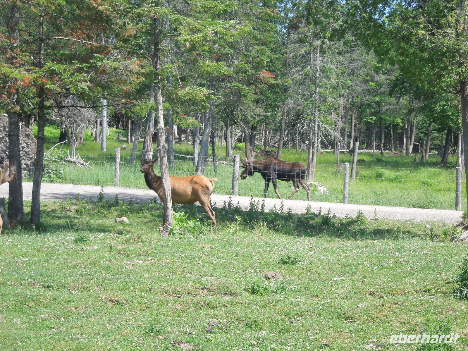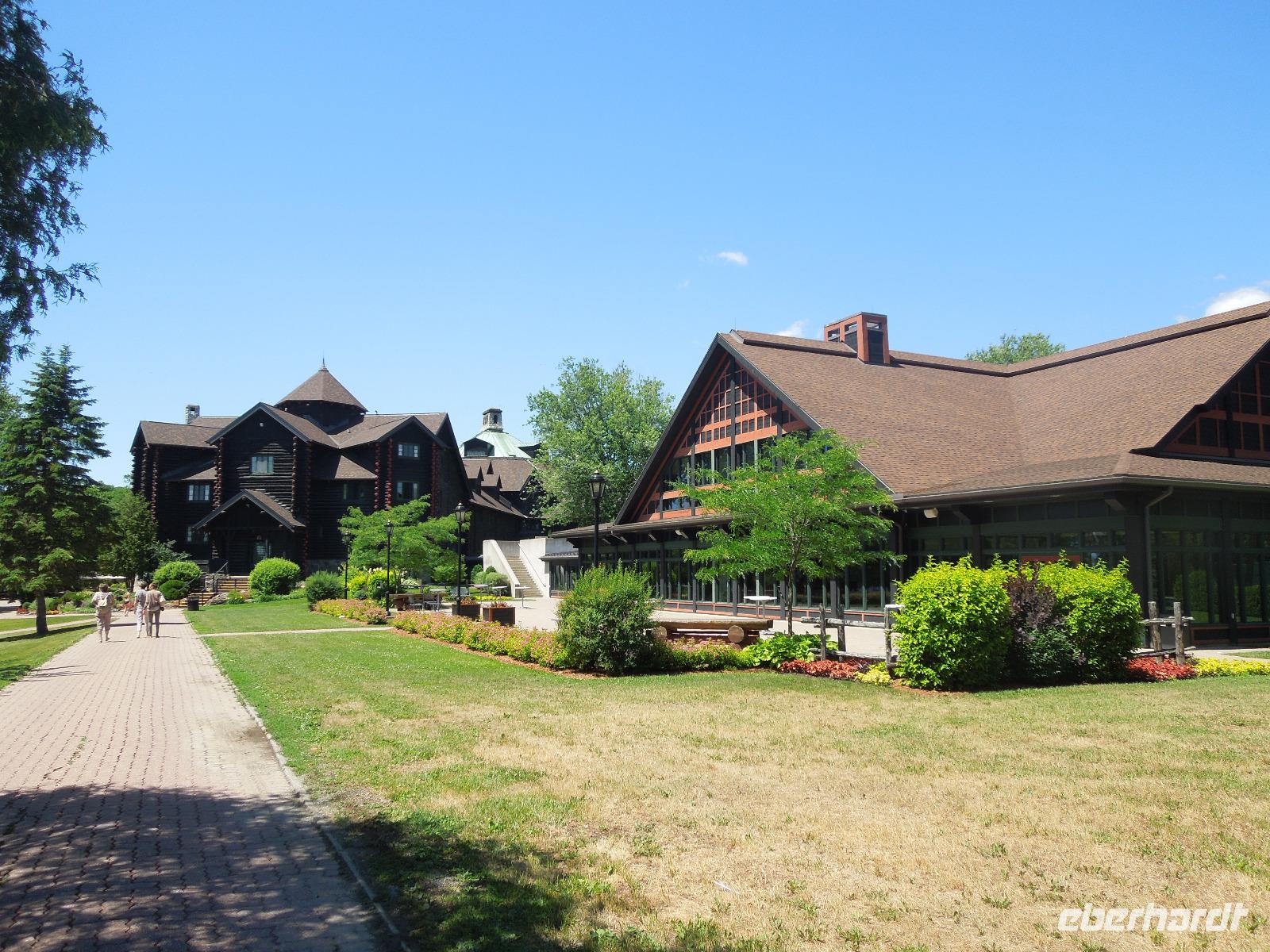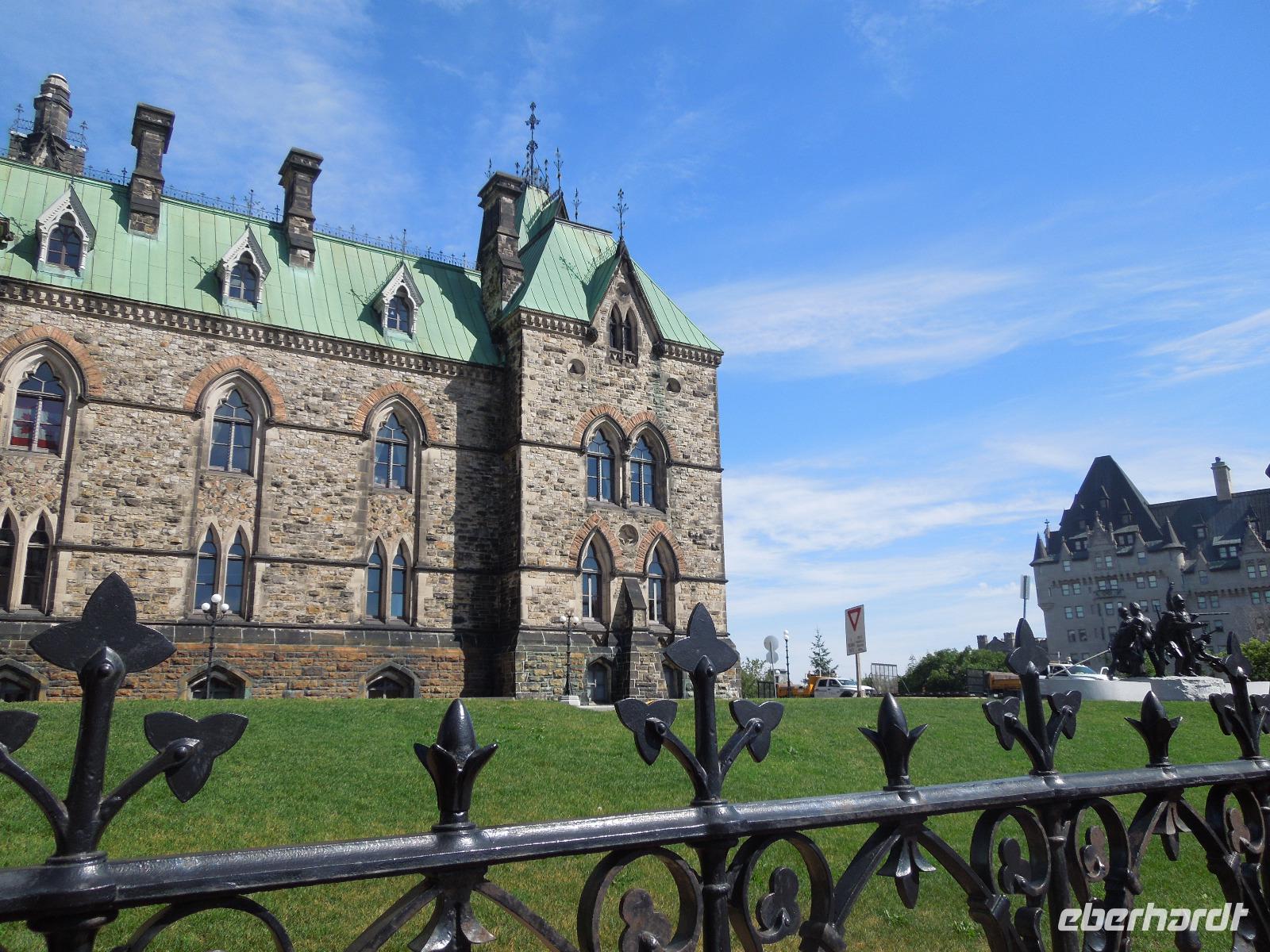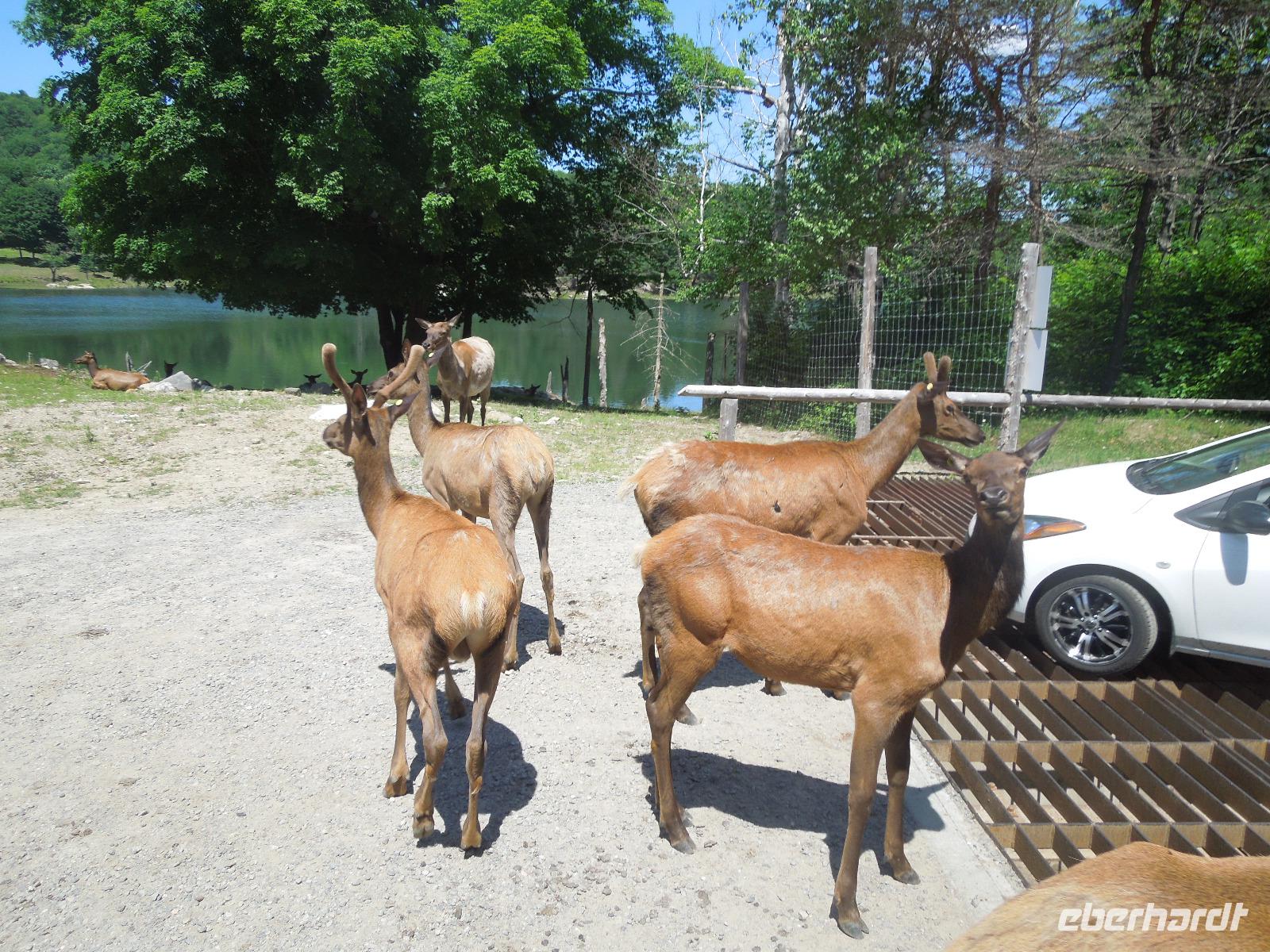 Nach dem Beladen des Busses fuhren wir in Richtung Ottawa. Wir ließen die atemberaubende Landschaft Kanadas einige Zeit an uns vorbeiziehen bis wir gegen Mittag das Fairmont Chateau Montebello erreichten. Wir genossen die schöne Anlage am Ottawa-Fluss und nahmen dort auch unser Mittagessen ein. Es gab eine exzellente Auswahl am Buffet und das Essen war wirklich köstlich. Nachdem wir uns satt gegessen hatten, fuhren wir nur ein paar Minuten zum Omega Wildlife Park. Nur mit dem Bus oder Auto war die Durchfahrt gestattet. Aussteigen durfte man nur an wenigen Stellen. Wir bekamen am Anfang einige Möhren, mit denen wir aus der Bustür heraus die hungrigen Wapitis fütterten. Diese wussten genau, dass es in jedem Fahrzeug Essen gibt. An einem der Stopps, wo man aussteigen durfte, gab es sogar Rehe, die man aus der Hand füttern konnte. Im Park hatten wir wirklich Glück, denn wir sahen viele Tiere, die sich sonst nicht immer zeigen: Coyoten, Büffel, Elche, Schwarzbären, Polarfüchse und Arktische Wölfe. Nach dieser erlebnisreichen Tour durch den Park fuhren wir weiter in die Hauptstadt Kanadas - Ottawa. Diese liegt im östlichen Teil der Provinz Ontario am Fluss Ottawa. Da am nächsten Tag, der Nationalfeiertag Kanadas war, machten wir gleich heute einen Teil der Stadtrundfahrt und sahen unter anderem das Regierungsviertel. Am bekannten Byward Market, legten wir einen Stopp für das Abendessen ein. Hier gab es viele kleine Restaurants, Souvenirgeschäfte und Stände. Am Museum für kanadische Geschichte wollten wir unser Gruppenfoto machen, da man hier einen sehr schönen Hintergrund hatte. Da stellten sich glatt ein paar Jugendliche dazu, die dort ihren Abschlussball feierten und posierten mit uns vor der Kamera. Die Kanadier sind wirklich sehr offen und freundlich.