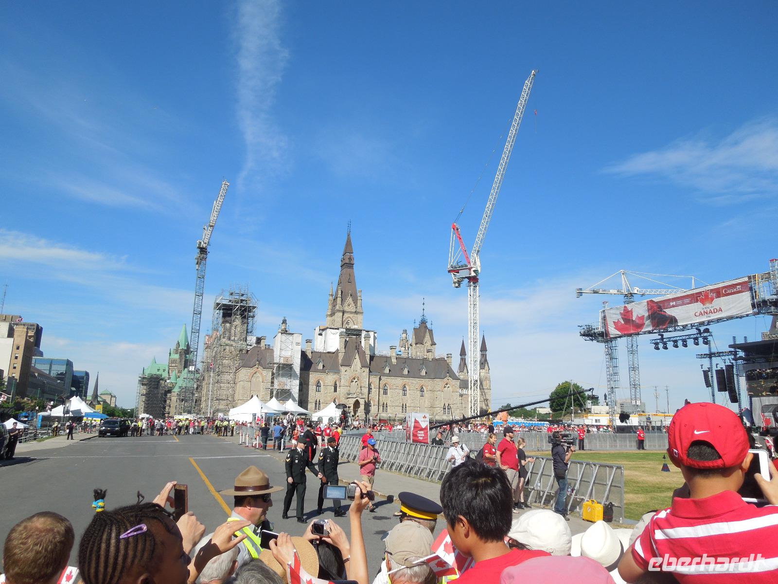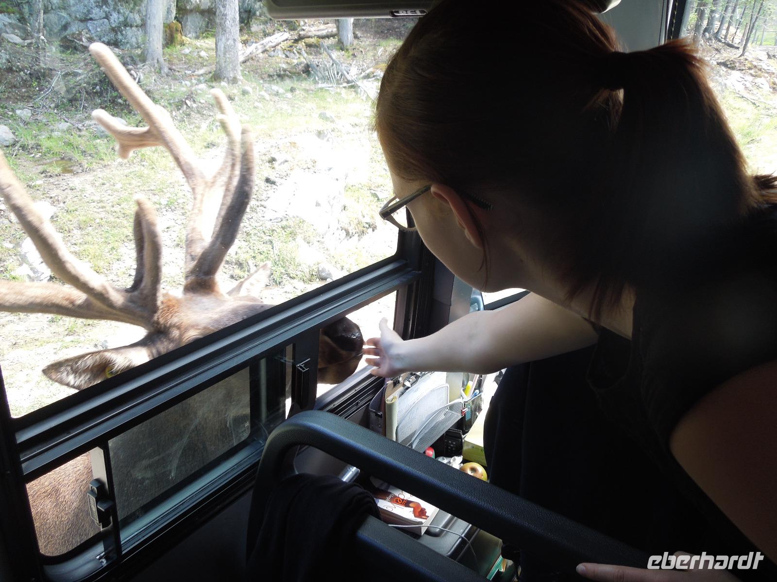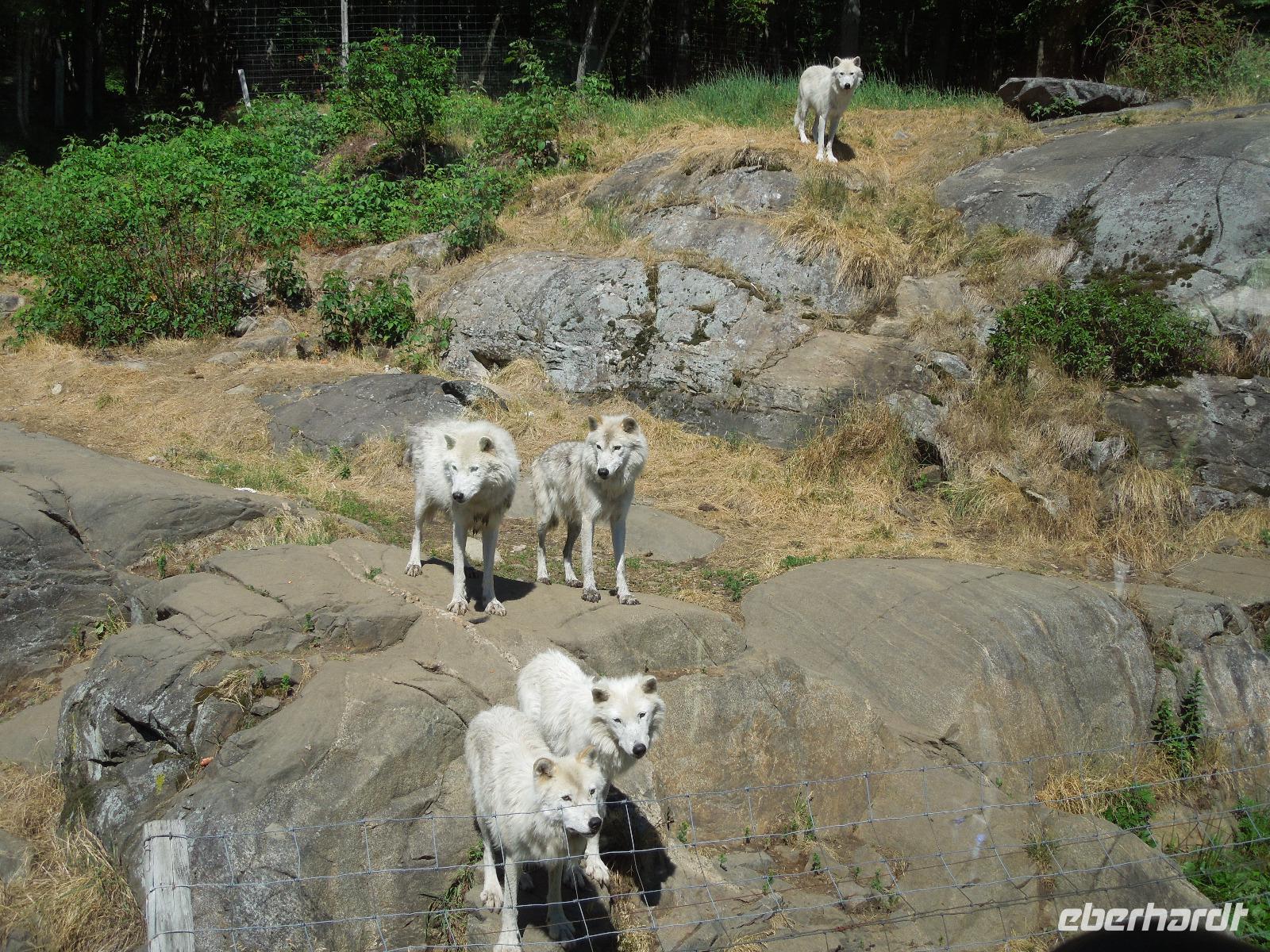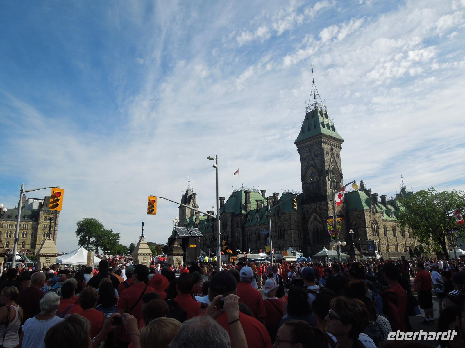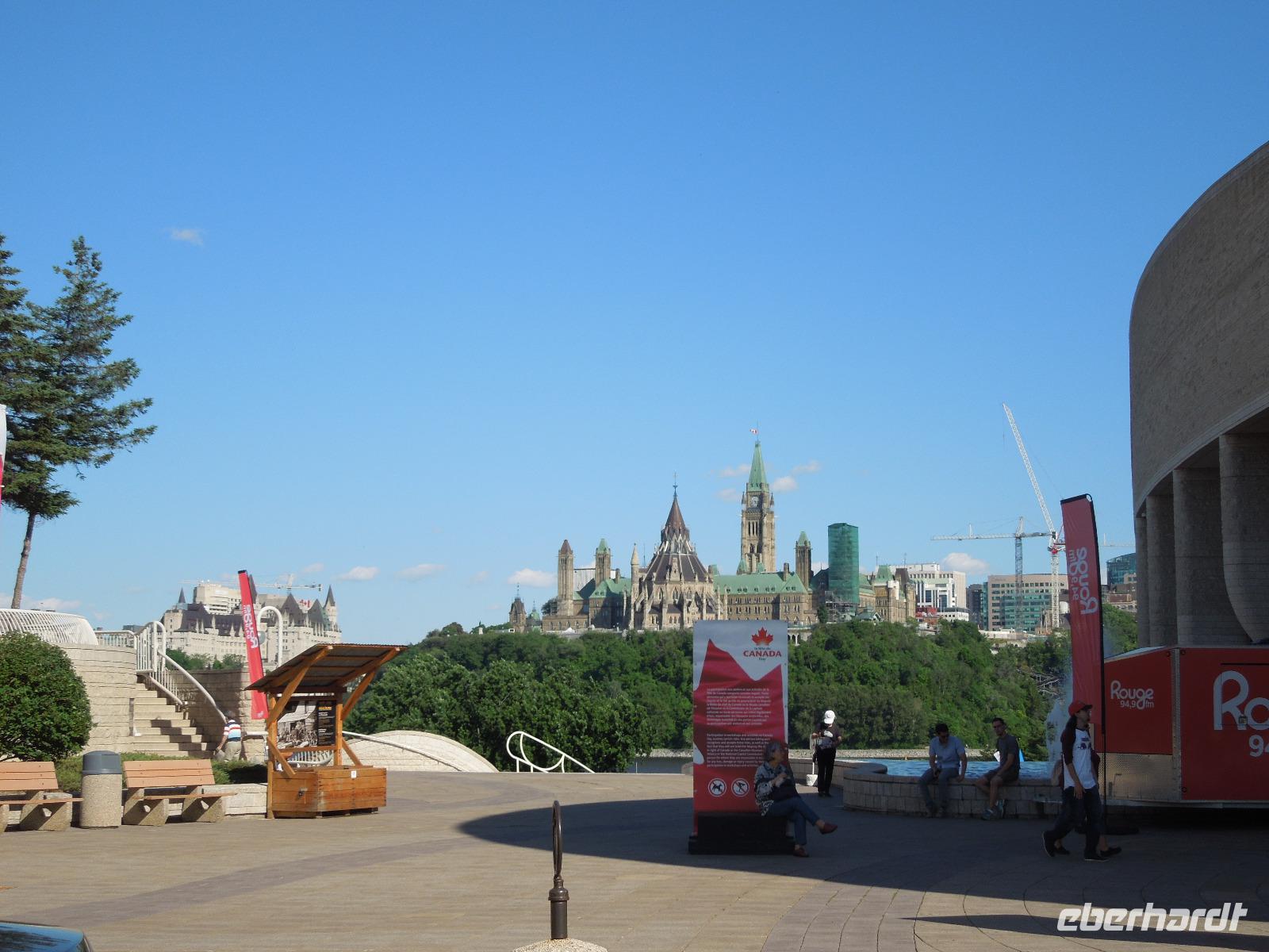 Nach dem Beladen des Busses fuhren wir in Richtung Ottawa. Wir ließen die atemberaubende Landschaft Kanadas einige Zeit an uns vorbeiziehen bis wir gegen Mittag das Fairmont Chateau Montebello erreichten. Wir genossen die schöne Anlage am Ottawa-Fluss und nahmen dort auch unser Mittagessen ein. Es gab eine exzellente Auswahl am Buffet und das Essen war wirklich köstlich. Nachdem wir uns satt gegessen hatten, fuhren wir nur ein paar Minuten zum Omega Wildlife Park. Nur mit dem Bus oder Auto war die Durchfahrt gestattet. Aussteigen durfte man nur an wenigen Stellen. Wir bekamen am Anfang einige Möhren, mit denen wir aus der Bustür heraus die hungrigen Wapitis fütterten. Diese wussten genau, dass es in jedem Fahrzeug Essen gibt. An einem der Stopps, wo man aussteigen durfte, gab es sogar Rehe, die man aus der Hand füttern konnte. Im Park hatten wir wirklich Glück, denn wir sahen viele Tiere, die sich sonst nicht immer zeigen: Coyoten, Büffel, Elche, Schwarzbären, Polarfüchse und Arktische Wölfe. Nach dieser erlebnisreichen Tour durch den Park fuhren wir weiter in die Hauptstadt Kanadas - Ottawa. Diese liegt im östlichen Teil der Provinz Ontario am Fluss Ottawa. Da am nächsten Tag, der Nationalfeiertag Kanadas war, machten wir gleich heute einen Teil der Stadtrundfahrt und sahen unter anderem das Regierungsviertel. Am bekannten Byward Market, legten wir einen Stopp für das Abendessen ein. Hier gab es viele kleine Restaurants, Souvenirgeschäfte und Stände. Am Museum für kanadische Geschichte wollten wir unser Gruppenfoto machen, da man hier einen sehr schönen Hintergrund hatte. Da stellten sich glatt ein paar Jugendliche dazu, die dort ihren Abschlussball feierten und posierten mit uns vor der Kamera. Die Kanadier sind wirklich sehr offen und freundlich.