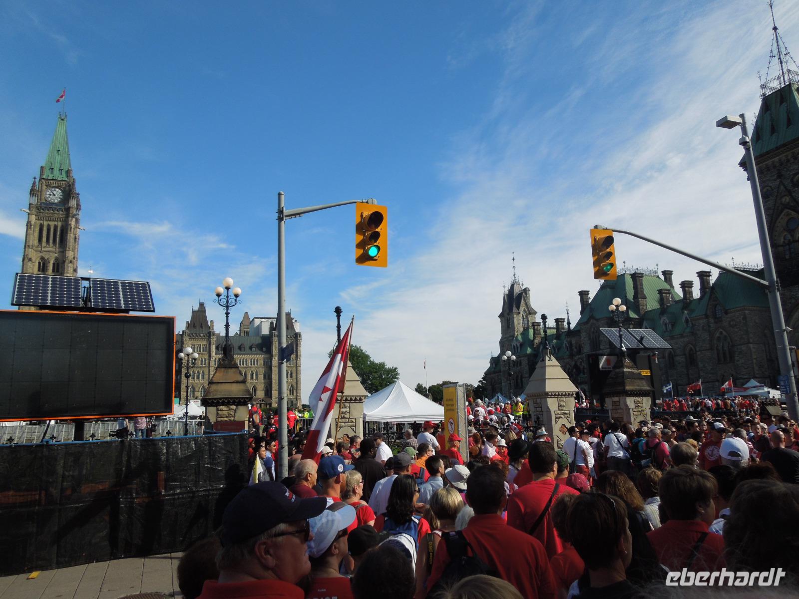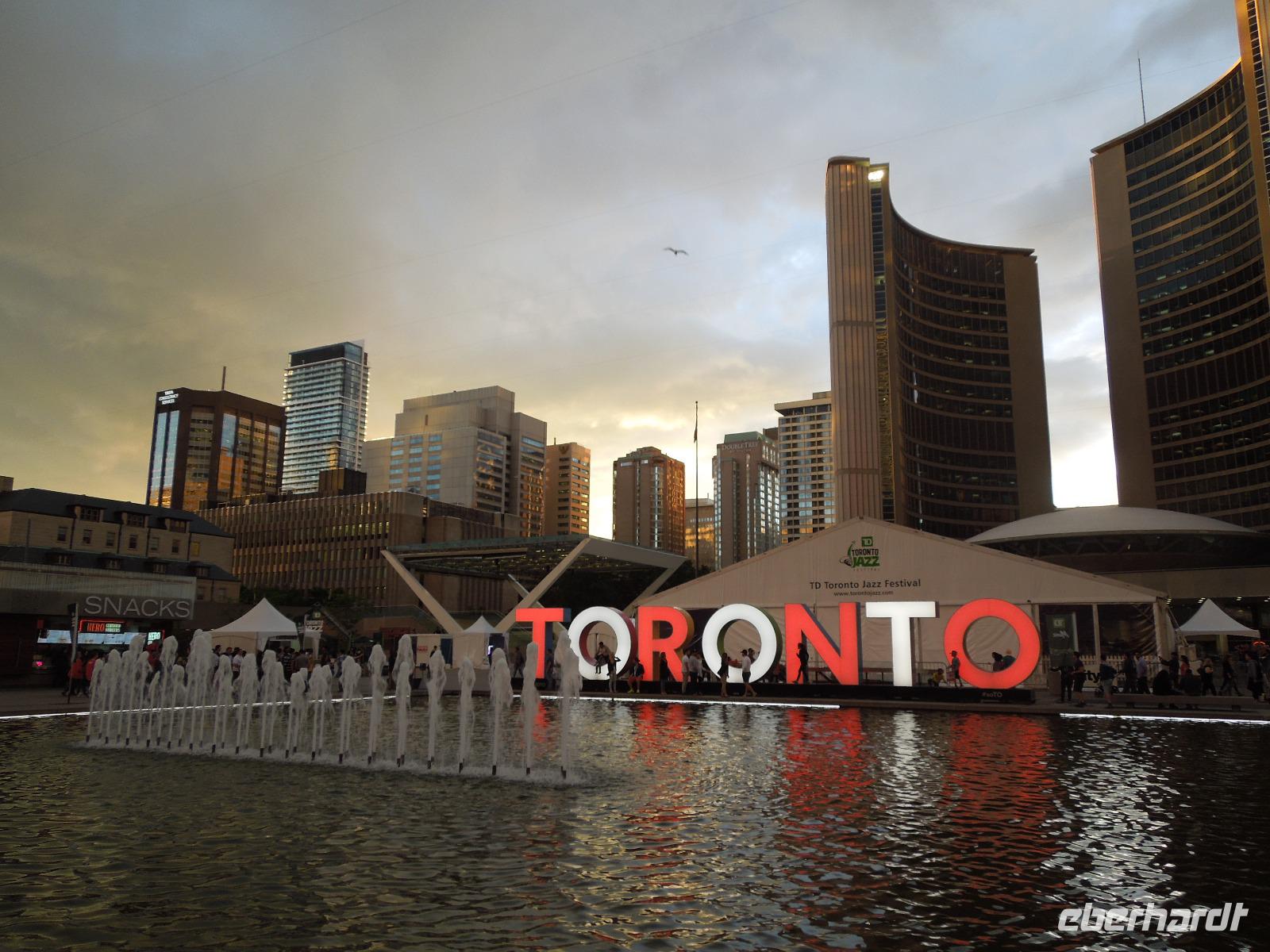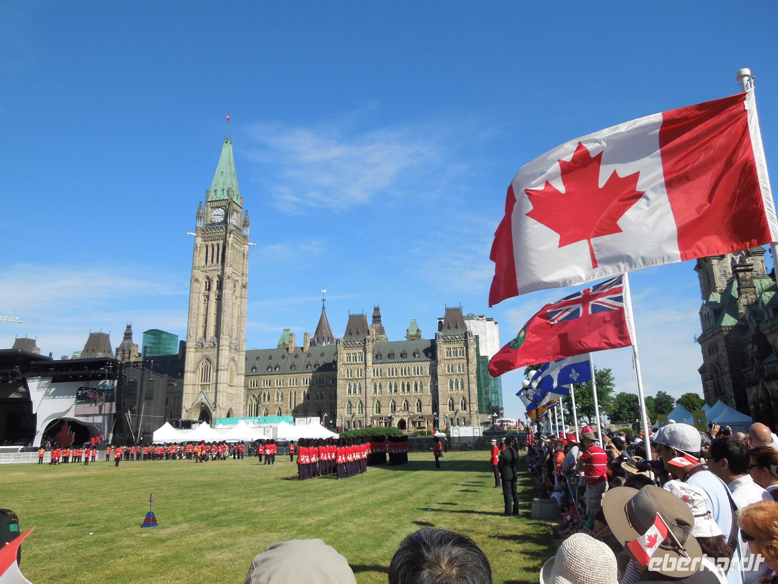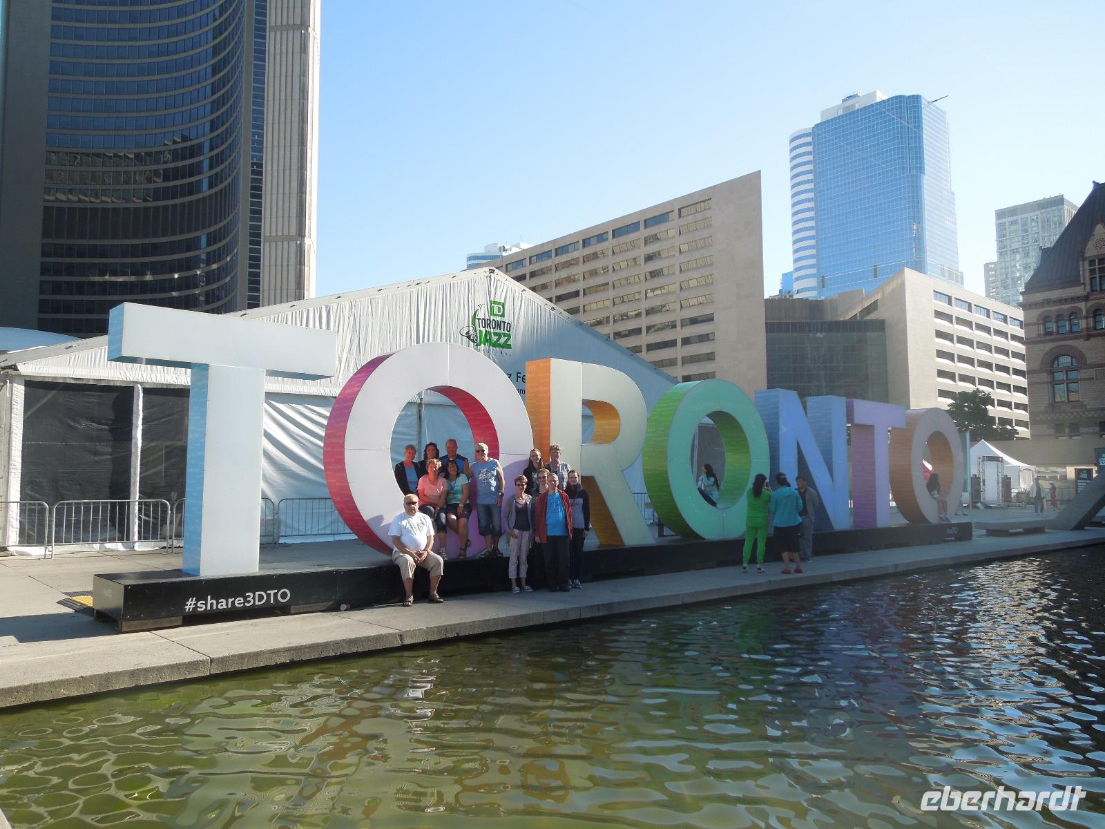 Nach dem Frühstück fuhren wir Richtung Innenstadt. Da heute Canada Day (großer Nationalfeiertag) war, gab es viele Straßen, die gesperrt waren. Zuerst liefen wir mit unserer Reiseleiterin Barbara auf den Parlamentshügel, um die Wachablösung der Mounties zu bestaunen. Die Royal Canadian Mounted Police ist die nationale Polizei Kanadas, die im Auftrag der Provinzen und Territorien sowie vieler Gemeinden auch lokale Aufgaben wahrnimmt. In Ottawa waren die Straßen voller rot-weiß gekleideter Kanadier. Diese haben einen unheimlich großen Nationalstolz und an diesem Tag wurde überall in Kanada groß gefeiert. Wir hatten das Glück gerade an diesem Tag in der Hauptstadt Kanadas zu sein. Ein paar von uns haben sich aus diesem Anlass auch am Vortag ein rot-weißes Kanada-Shirt gekauft, was sehr gut bei den Kanadiern ankam. Jeder von uns bekam auch eine kleine kanadische Fahne mit dem berühmten Ahornblatt drauf. Das Zuckerahornblatt auf der Fahne hat übrigens elf Zacken, was keine bestimmte Bedeutung hat. Nach der zeremoniellen Wachablösung mit Gesang und Musik liefen wir noch ein wenig weiter, um alles auf uns wirken zu lassen. Anschließend führte uns eine zweistündige Busfahrt zu den bekannten 1000 Inseln, wo wir ein regionales Mittagessen genossen. Danach unternahmen wir eine Bootsfahrt auf dem Sankt-Lorenz-Strom und bestaunten die vielen kleinen Inseln, die am Abfluss des Ontariosees in der Grenzregion zwischen den USA und Kanada liegen. Hier findet man ebenfalls die kleinste internationale Brücke der Welt. Danach fuhren wir auch schon weiter Richtung Toronto. Auf dem Weg dorthin legten wir eine Pause in dem kleinen Städtchen Kingston ein, das über 120.000 Einwohner hat und am nordöstlichen Ende des Ontariosees liegt. Nach weiteren drei Stunden Busfahrt kamen wir am Abend in Toronto an. Auf der Fahrt gab es als kleine Überraschung kanadischen Whiskey mit Ahornsirup und dazu Ahornkekse. Toronto ist mit 2,6 Millionen Einwohnern die größte Stadt Kanadas und die Hauptstadt der Provinz Ontario. Da unser Hotel direkt in Downtown lag, waren viele sehenswerte Plätze zu Fuß erreichbar. So z.B. die Yonge Street mit dem aufregenden Dundas Square, viele Restaurants oder das Eaton Center. Die Yonge Street ist eine der wichtigsten Straßen Torontos und ist mit 1896 Kilometern die längste Straße der Welt. Sie schaffte es sogar ins Guinness-Buch der Rekorde. Die Lage des Hotels war also ideal um noch einen kleinen oder großen Spaziergang in die Umgebung zu machen. Wir übernachteten übrigens im größten Hotel Kanadas mit 1590 Zimmern. Natürlich war auch in Toronto sehr viel wegen des Canada Days los. Die Kanadier hatten ein verlängertes Wochenende und die Amerikaner wegen dem 4. Juli auch. Also waren alle an diesem Wochenende unterwegs.
