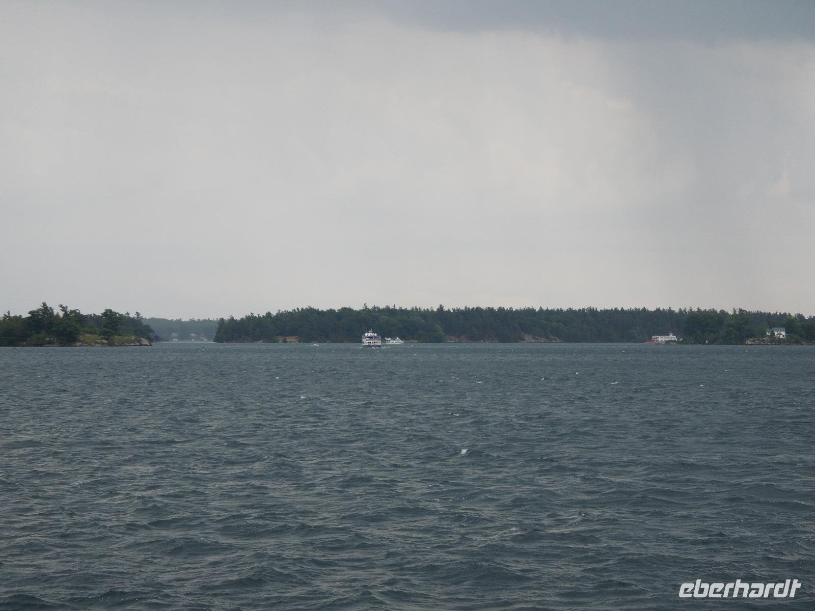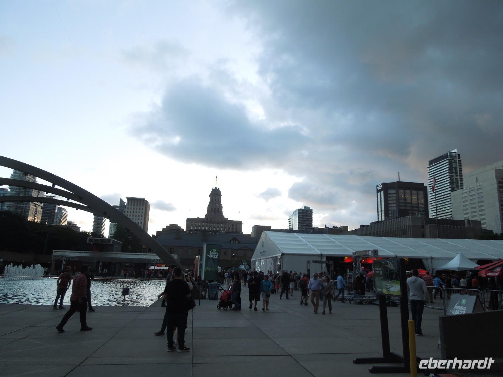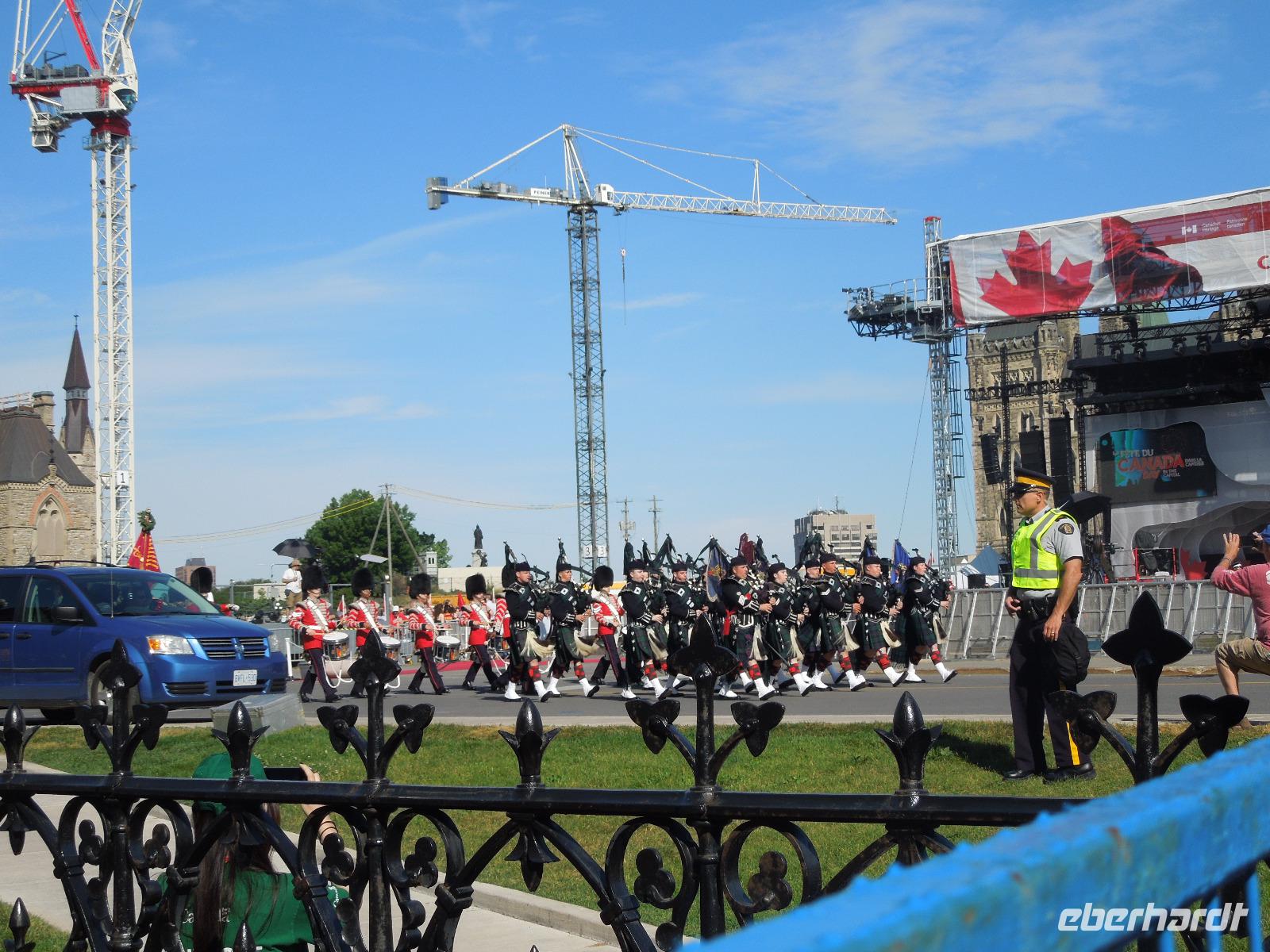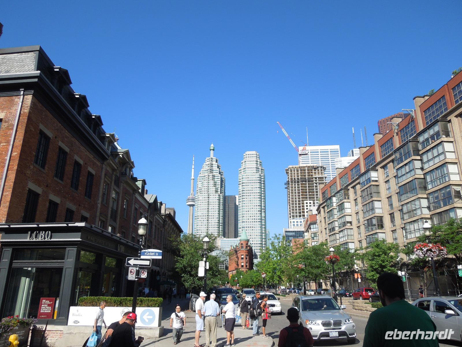 Nach dem Frühstück fuhren wir Richtung Innenstadt. Da heute Canada Day (großer Nationalfeiertag) war, gab es viele Straßen, die gesperrt waren. Zuerst liefen wir mit unserer Reiseleiterin Barbara auf den Parlamentshügel, um die Wachablösung der Mounties zu bestaunen. Die Royal Canadian Mounted Police ist die nationale Polizei Kanadas, die im Auftrag der Provinzen und Territorien sowie vieler Gemeinden auch lokale Aufgaben wahrnimmt. In Ottawa waren die Straßen voller rot-weiß gekleideter Kanadier. Diese haben einen unheimlich großen Nationalstolz und an diesem Tag wurde überall in Kanada groß gefeiert. Wir hatten das Glück gerade an diesem Tag in der Hauptstadt Kanadas zu sein. Ein paar von uns haben sich aus diesem Anlass auch am Vortag ein rot-weißes Kanada-Shirt gekauft, was sehr gut bei den Kanadiern ankam. Jeder von uns bekam auch eine kleine kanadische Fahne mit dem berühmten Ahornblatt drauf. Das Zuckerahornblatt auf der Fahne hat übrigens elf Zacken, was keine bestimmte Bedeutung hat. Nach der zeremoniellen Wachablösung mit Gesang und Musik liefen wir noch ein wenig weiter, um alles auf uns wirken zu lassen. Anschließend führte uns eine zweistündige Busfahrt zu den bekannten 1000 Inseln, wo wir ein regionales Mittagessen genossen. Danach unternahmen wir eine Bootsfahrt auf dem Sankt-Lorenz-Strom und bestaunten die vielen kleinen Inseln, die am Abfluss des Ontariosees in der Grenzregion zwischen den USA und Kanada liegen. Hier findet man ebenfalls die kleinste internationale Brücke der Welt. Danach fuhren wir auch schon weiter Richtung Toronto. Auf dem Weg dorthin legten wir eine Pause in dem kleinen Städtchen Kingston ein, das über 120.000 Einwohner hat und am nordöstlichen Ende des Ontariosees liegt. Nach weiteren drei Stunden Busfahrt kamen wir am Abend in Toronto an. Auf der Fahrt gab es als kleine Überraschung kanadischen Whiskey mit Ahornsirup und dazu Ahornkekse. Toronto ist mit 2,6 Millionen Einwohnern die größte Stadt Kanadas und die Hauptstadt der Provinz Ontario. Da unser Hotel direkt in Downtown lag, waren viele sehenswerte Plätze zu Fuß erreichbar. So z.B. die Yonge Street mit dem aufregenden Dundas Square, viele Restaurants oder das Eaton Center. Die Yonge Street ist eine der wichtigsten Straßen Torontos und ist mit 1896 Kilometern die längste Straße der Welt. Sie schaffte es sogar ins Guinness-Buch der Rekorde. Die Lage des Hotels war also ideal um noch einen kleinen oder großen Spaziergang in die Umgebung zu machen. Wir übernachteten übrigens im größten Hotel Kanadas mit 1590 Zimmern. Natürlich war auch in Toronto sehr viel wegen des Canada Days los. Die Kanadier hatten ein verlängertes Wochenende und die Amerikaner wegen dem 4. Juli auch. Also waren alle an diesem Wochenende unterwegs.