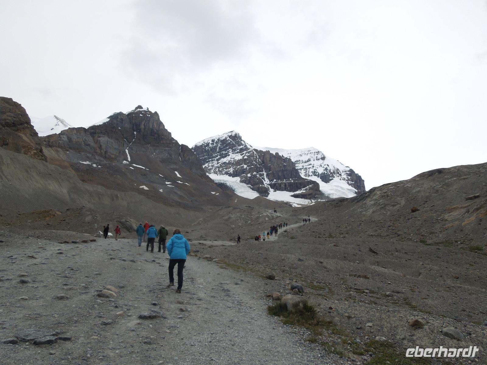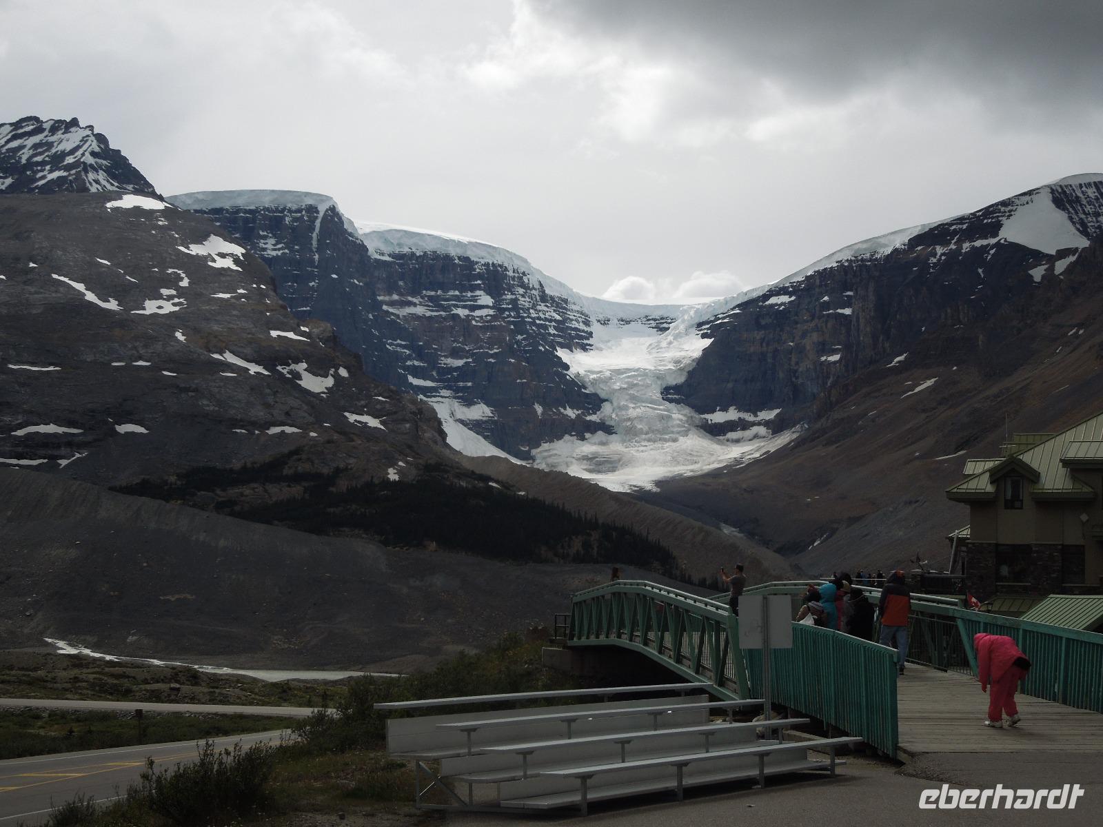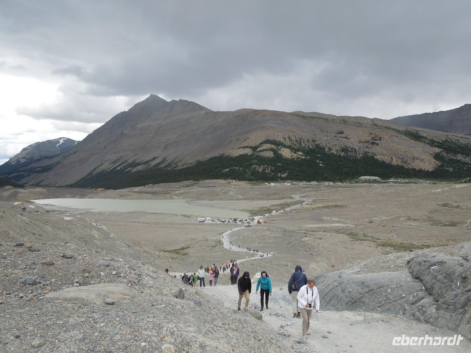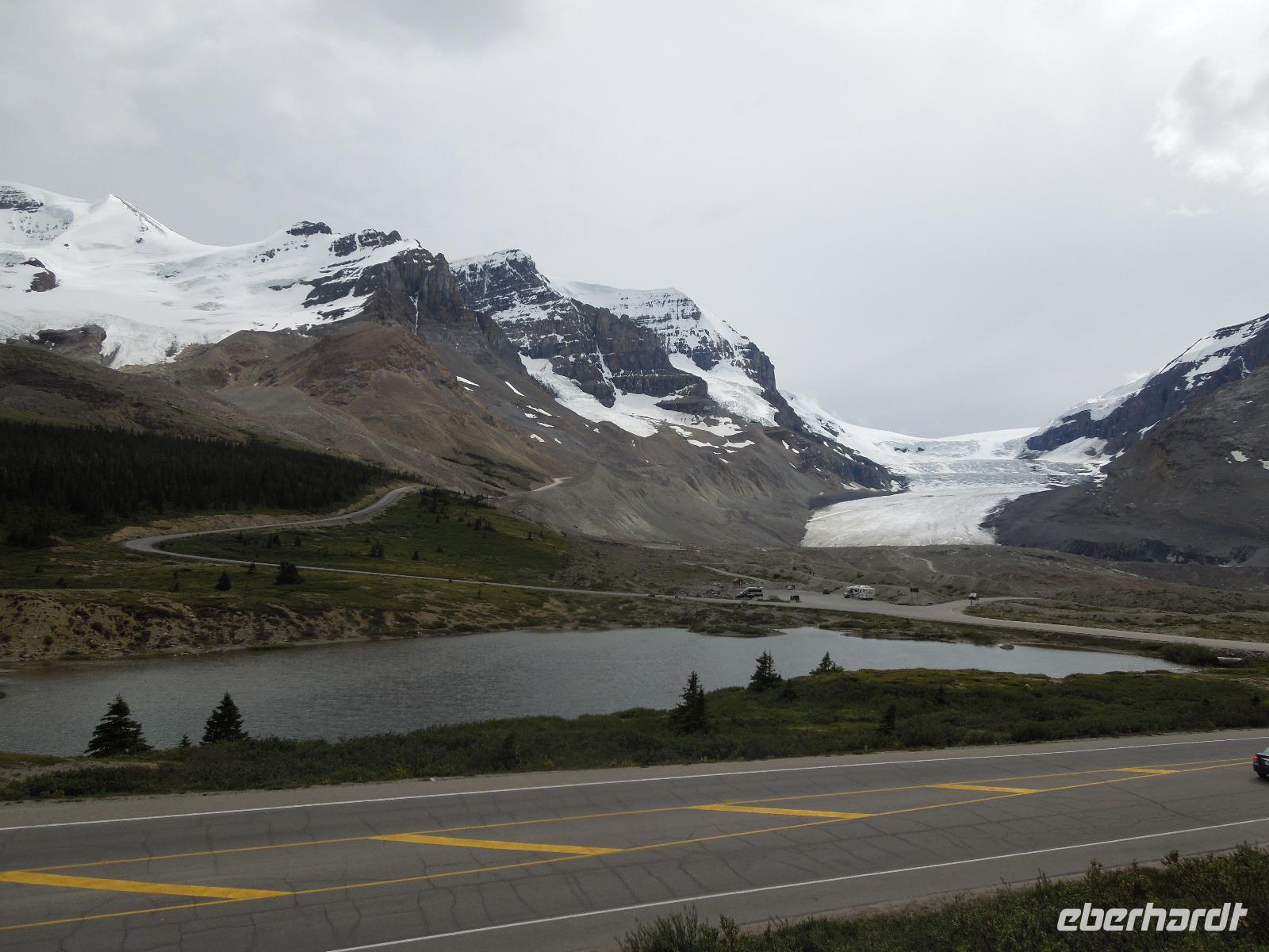 Mit gepackten Koffern starteten wir am heutigen Morgen zum Moraine Lake, ein von Gletschern gespeister See. Da es nicht regnete, konnten wir auch ein paar schöne Fotos vom See schießen, in dem sich die Berge sehr schön spiegelten. Danach fuhren wir zum bekannten Lake Louise. Die türkisblaue Farbe des Sees stammt von Steinmehl, das von Gletscherschmelzwasser in den See gespült wird und auch als rock flour oder glacial flour bezeichnet wird. Lake Louise ist nach Prinzessin Louise Caroline Alberta, einer Tochter von Königin Victoria, benannt. Da es regnete, hielten wir uns hauptsächlich im Chateau Lake Louise auf, einem weiteren fünf Sterne Hotel der Fairmont Hotelkette. Im Ort hielten wir kurz an um ein paar Besorgungen für das Picknick zu machen. Unser Busfahrer Kong hatte uns angeboten zu den Tatakaw Falls zu fahren, was durch die engen Kurven nur sehr wenige Busfahrer machen. Kong lenkte uns sicher durch diese Kurven und wenig später kamen wir bei den Wasserfällen an. Zuerst picknickten wir zum Mittag gemütlich, dann gingen wir entlang der Wasserfälle spazieren. Auf dem Weg zu unserem nächsten Ziel sahen wir ein paar Bergschafe und machten Fotostopps am Bow Lake & am Peyto Lake. Unterwegs erzählte uns Gudrun viel über die Umgebung und auch Geschichten über bekannte Persönlichkeiten der Nationalparks. Wir fuhren entlang des Icefield Parkways, der als einer der schönsten Fernstraßen der Welt gilt und durch die zwischen Lake Louise und Jasper durch die Rocky Mountains führt. Auf dem Weg stoppten wir am Athabasca Gletscher, wo es die Möglichkeit gab mit dem Schneebus auf den Gletscher zu fahren, was allerdings keiner von uns gemacht hat. Wir wanderten deshalb ein Stück in Richtung des Gletschers und sahen ihn uns aus etwas Entfernung an. Der Aufstieg war auch in Anbetracht der dünneren Luft ganz schön anstrengend. Hier hatte man auch eine tolle Sicht auf das Columbia Icefield, das eine der größten Ansammlungen von Eis südlich des Polarkreises ist. Nach einiger Zeit Fahrt kamen wir dann an unserer nächsten Unterkunft an, wo wir mit heißer Schokolade begrüßt wurden. Die Anlage der Lodge war klein und bestand größtenteils aus gemütlichen Bungalows. Restaurant und Souvenirshop gab es auch. Da die Lodge relativ abgelegen im Wald lag, hatte man viel Ruhe und konnte den Klängen der Natur lauschen. Allerdings gab es auch sehr viele durstige Mücken, die hartnäckig waren.