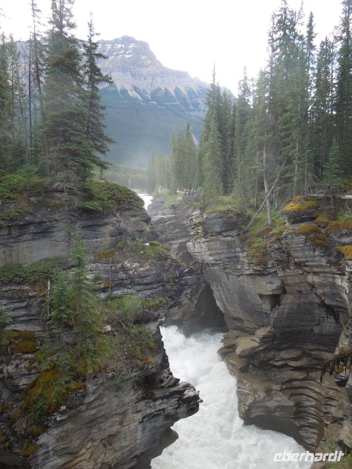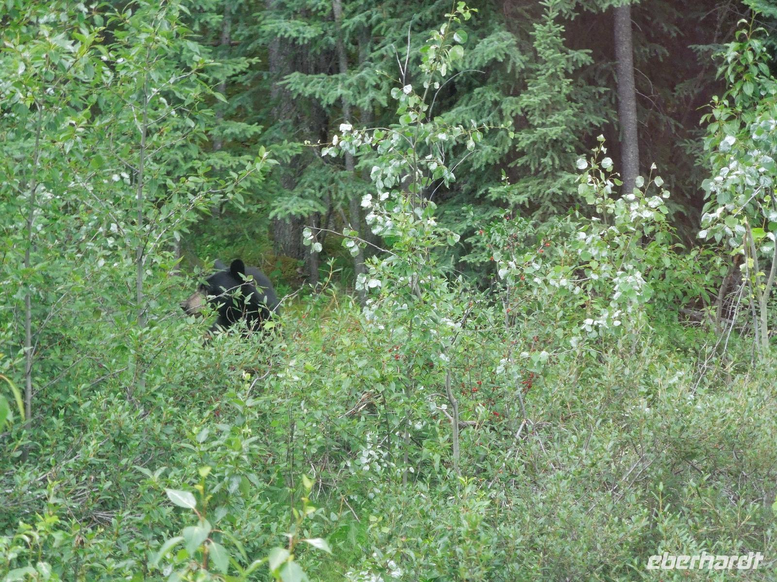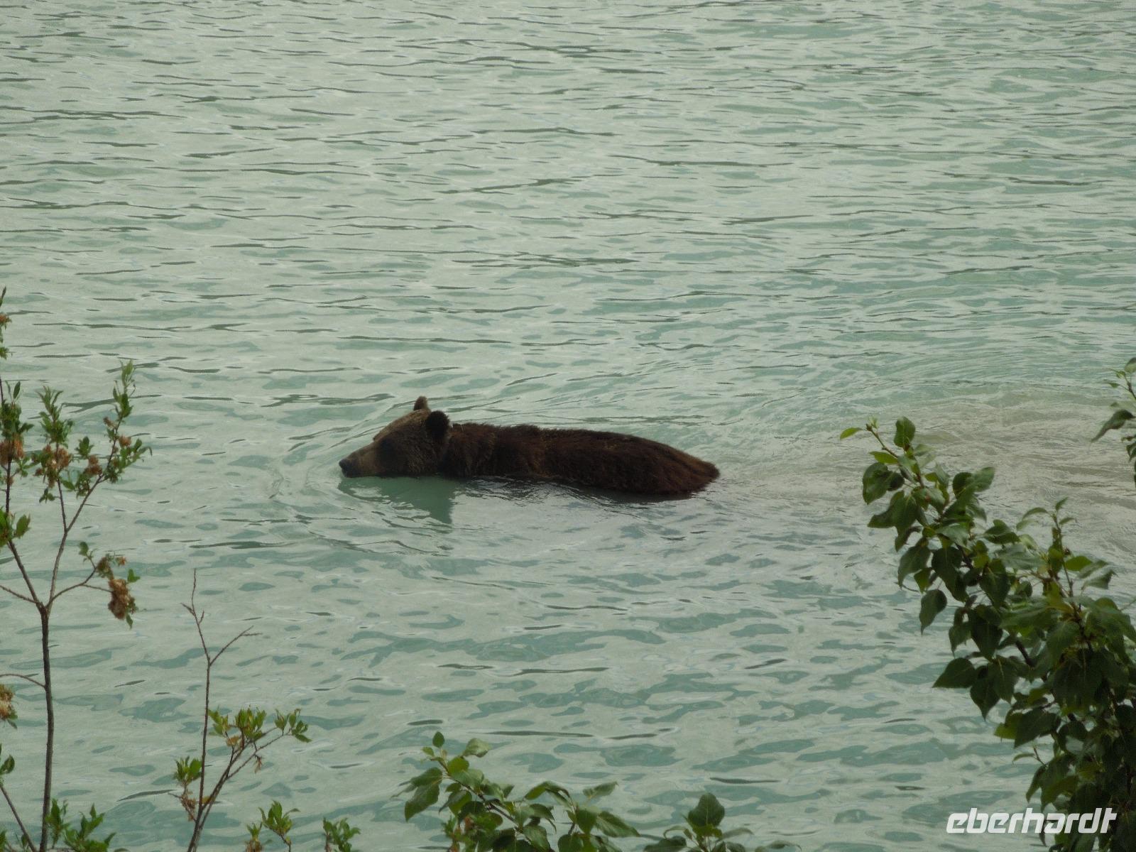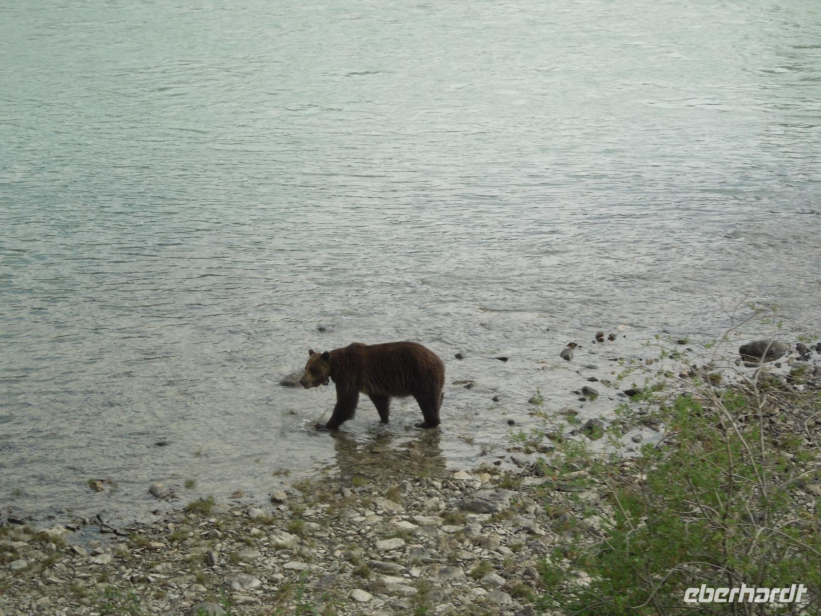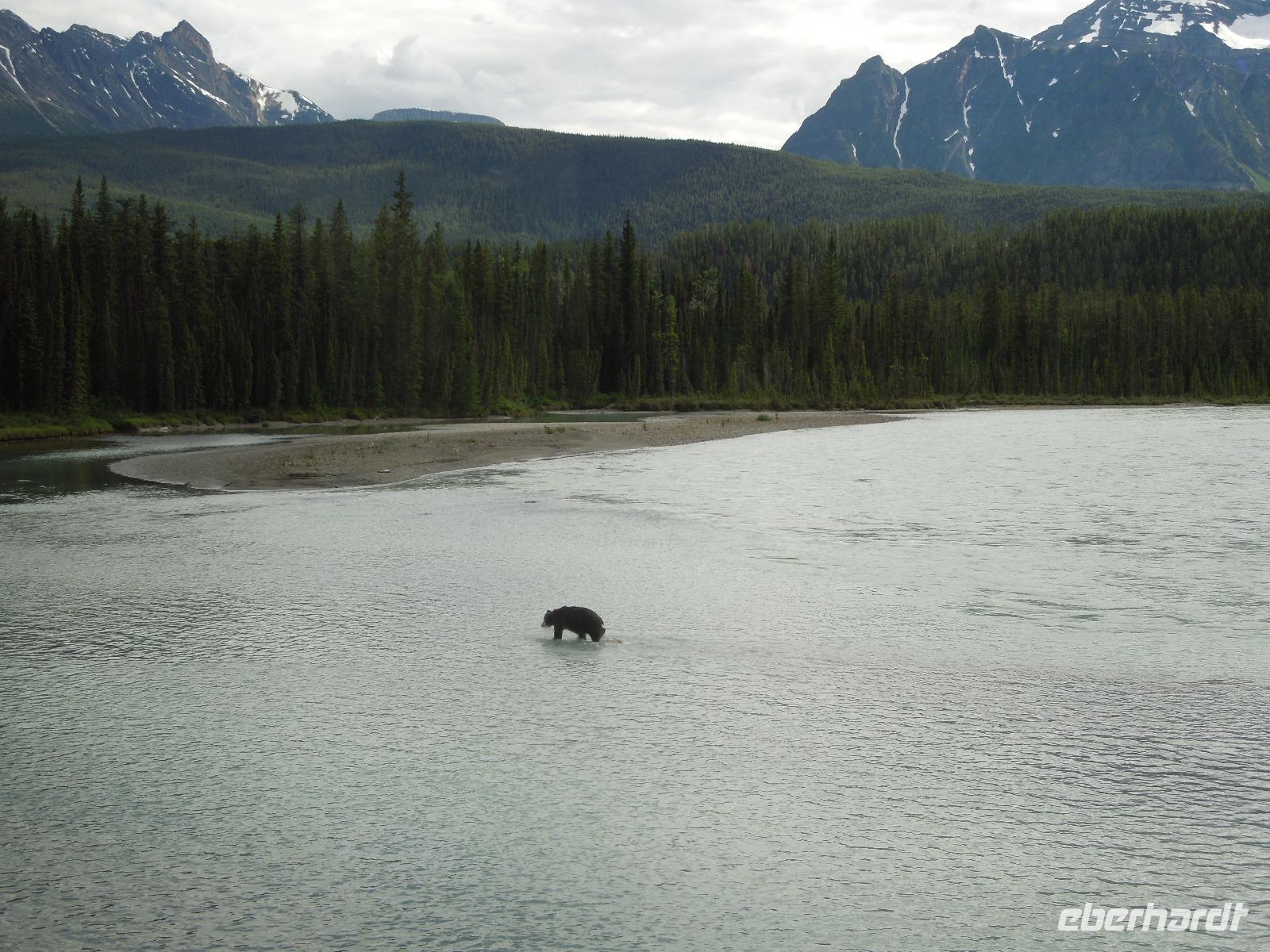 Am Vormittag machten wir uns mit dem Bus zu Erkundungen im Jasper-Nationalpark auf. Zuerst hielten wir an den Athabasca Falls. Wir spazierten gemütlich entlang der Wasserfälle. Natürlich hielten wir unterwegs auch wieder für ein paar Fotostopps, an denen man wunderbar ein paar Fotos von den von der Sonne beschienenen Rockies machen konnte. Wenig Zeit später kamen wir am Maligne Lake an, wo wir auch unsere Mittagspause verbrachten. Wir wanderten entlang des Sees und stöberten im Souvenirshop. Anschließend fuhren wir weiter und sahen eine Bärenmutter und ihr Junges. Kurze Zeit später sahen wir noch einen Schwarzbären, der gemütlich am Wegesrand saß und futterte. Nach Ankunft am nächsten Ziel wanderten wir entlang des Maligne Canyons eine ganze Weile vorbei an ein paar Brücken bis zur 5. Brücke. An der genannten Brücke holte Kong uns wieder ab und wir fuhren gemeinsam nach Jasper, wo wir eine kleine Pause einlegten, um den Ort zu erkunden und noch ein paar Besorgungen zu machen. Auf dem Rückweg zu unserer Unterkunft sahen wir noch einen Schwarzbären. Dieser ging und schwamm fröhlich durch den Fluss, was ein sensationelles Fotomotiv abgab. Wieder in der Unterkunft angekommen, gab es eine kleine Überraschung für die Gruppe: kanadischen Weiß- und Rotwein. Dazu gab es kanadische Cracker. Beide Weine schmeckten ausgezeichnet. Später nahmen wir noch gemeinsam das Abendessen im kleinen Restaurant der Lodge ein. Nach dem Essen spazierten wir noch mit Gudrun zu den Sunwapta Falls.