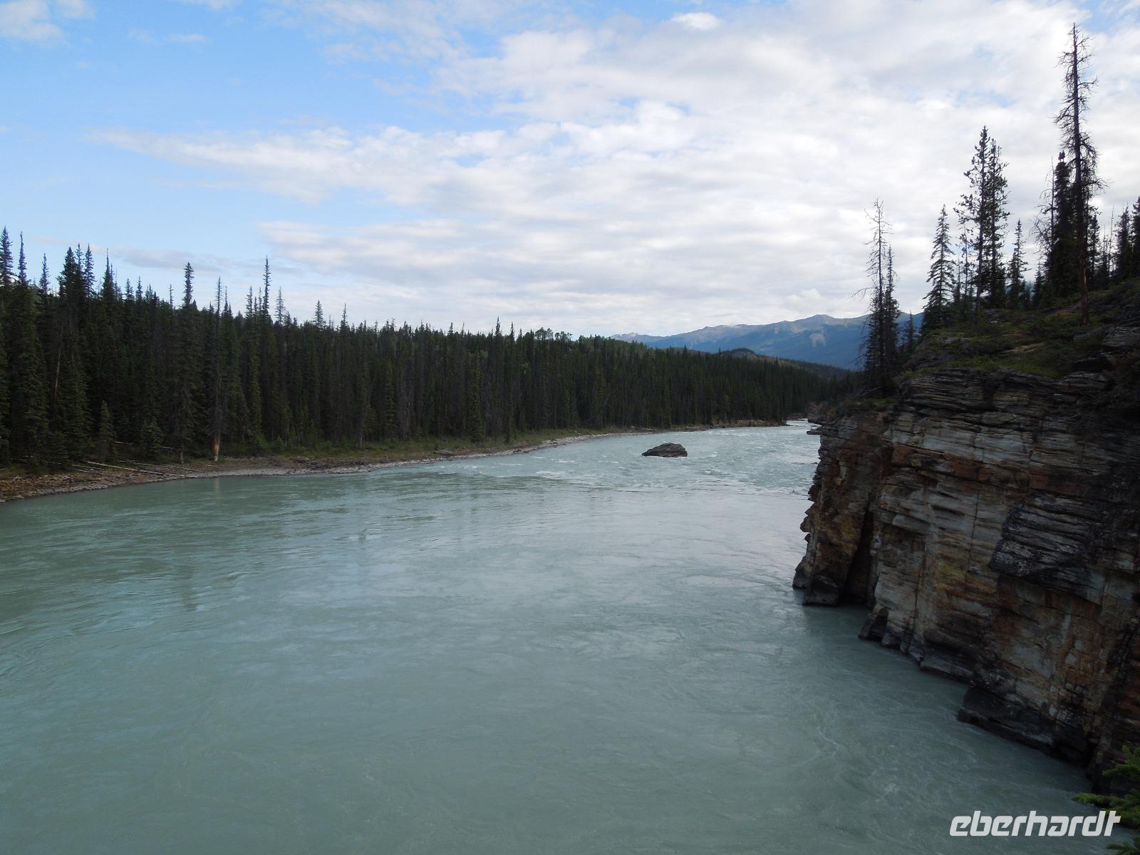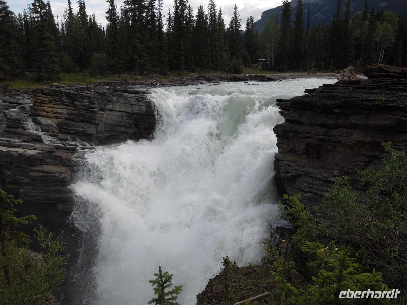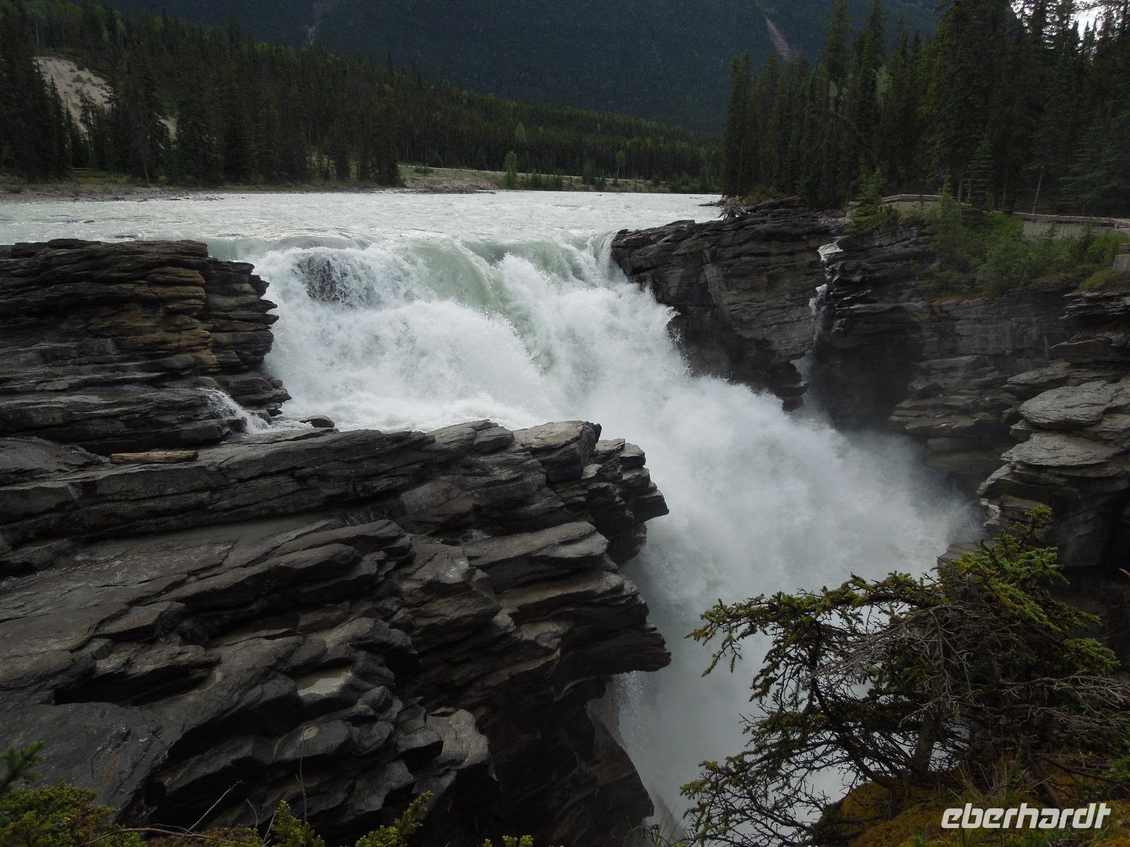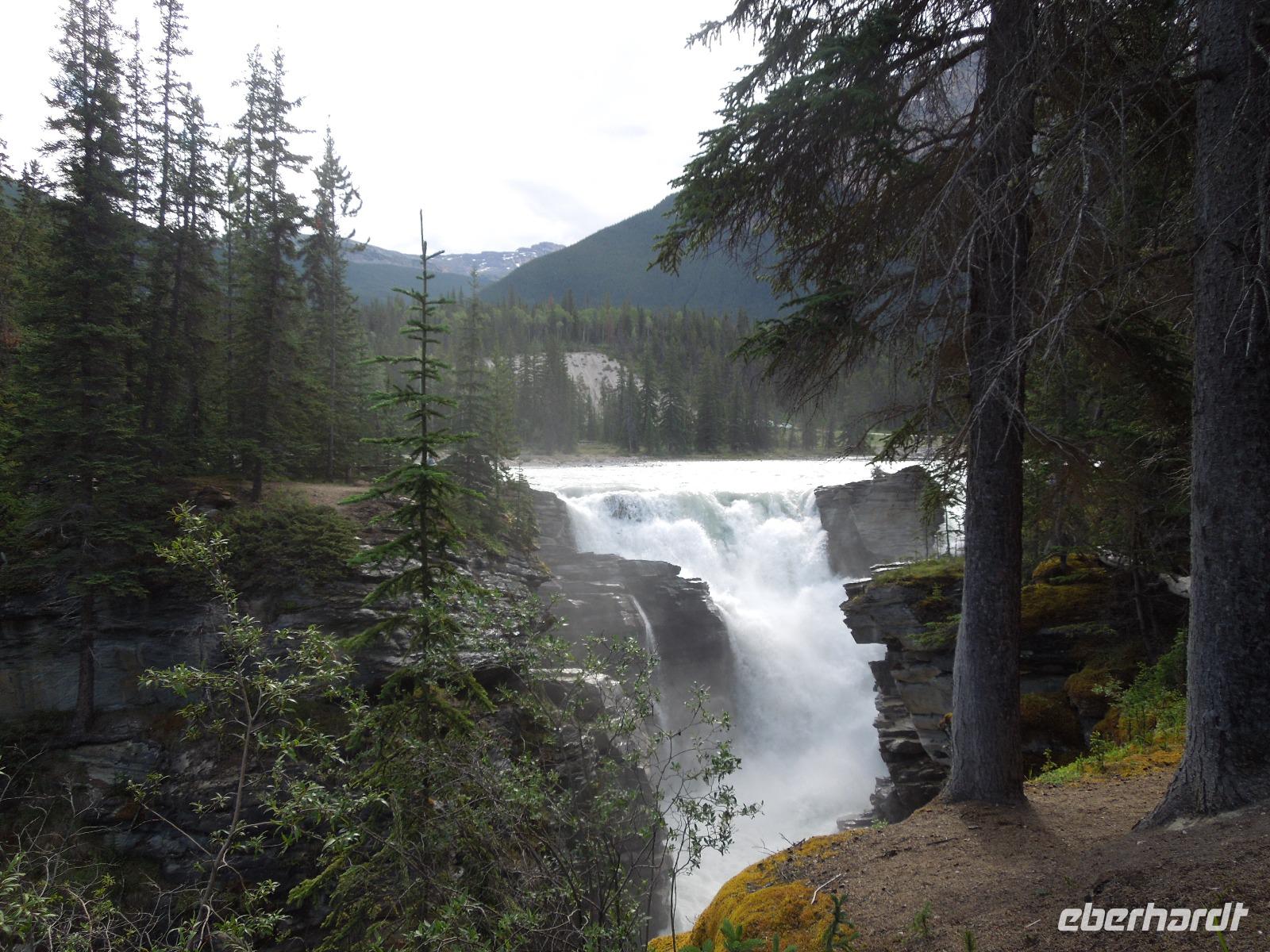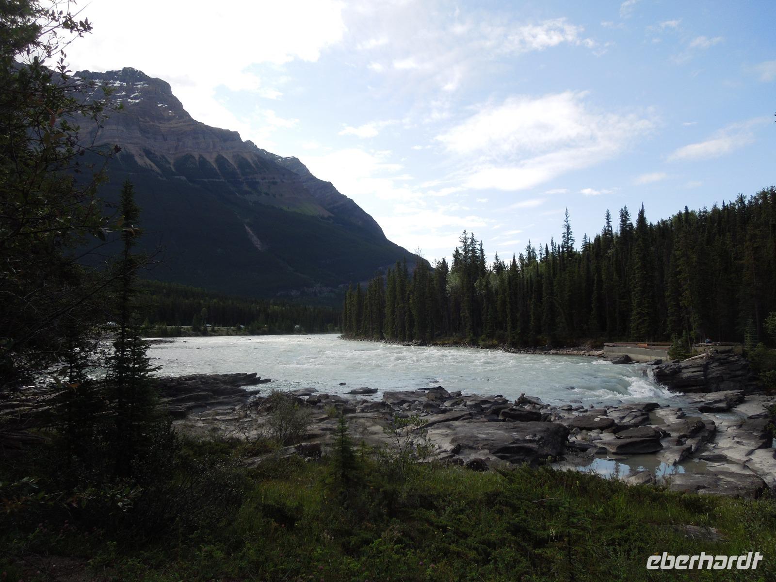 Am Vormittag machten wir uns mit dem Bus zu Erkundungen im Jasper-Nationalpark auf. Zuerst hielten wir an den Athabasca Falls. Wir spazierten gemütlich entlang der Wasserfälle. Natürlich hielten wir unterwegs auch wieder für ein paar Fotostopps, an denen man wunderbar ein paar Fotos von den von der Sonne beschienenen Rockies machen konnte. Wenig Zeit später kamen wir am Maligne Lake an, wo wir auch unsere Mittagspause verbrachten. Wir wanderten entlang des Sees und stöberten im Souvenirshop. Anschließend fuhren wir weiter und sahen eine Bärenmutter und ihr Junges. Kurze Zeit später sahen wir noch einen Schwarzbären, der gemütlich am Wegesrand saß und futterte. Nach Ankunft am nächsten Ziel wanderten wir entlang des Maligne Canyons eine ganze Weile vorbei an ein paar Brücken bis zur 5. Brücke. An der genannten Brücke holte Kong uns wieder ab und wir fuhren gemeinsam nach Jasper, wo wir eine kleine Pause einlegten, um den Ort zu erkunden und noch ein paar Besorgungen zu machen. Auf dem Rückweg zu unserer Unterkunft sahen wir noch einen Schwarzbären. Dieser ging und schwamm fröhlich durch den Fluss, was ein sensationelles Fotomotiv abgab. Wieder in der Unterkunft angekommen, gab es eine kleine Überraschung für die Gruppe: kanadischen Weiß- und Rotwein. Dazu gab es kanadische Cracker. Beide Weine schmeckten ausgezeichnet. Später nahmen wir noch gemeinsam das Abendessen im kleinen Restaurant der Lodge ein. Nach dem Essen spazierten wir noch mit Gudrun zu den Sunwapta Falls.