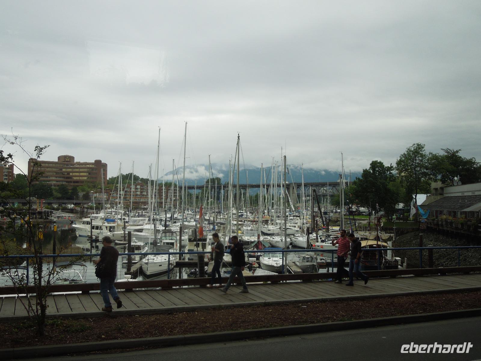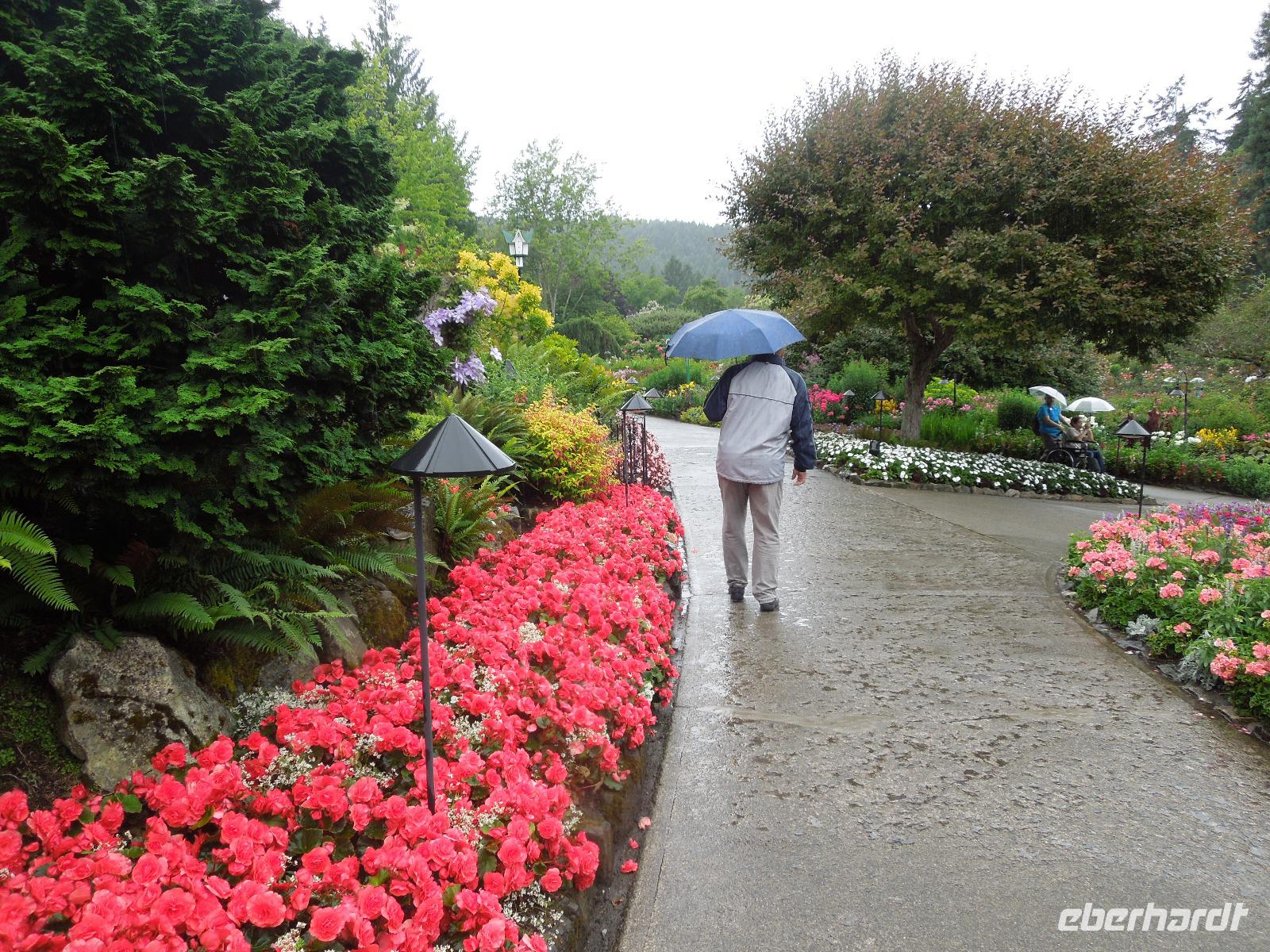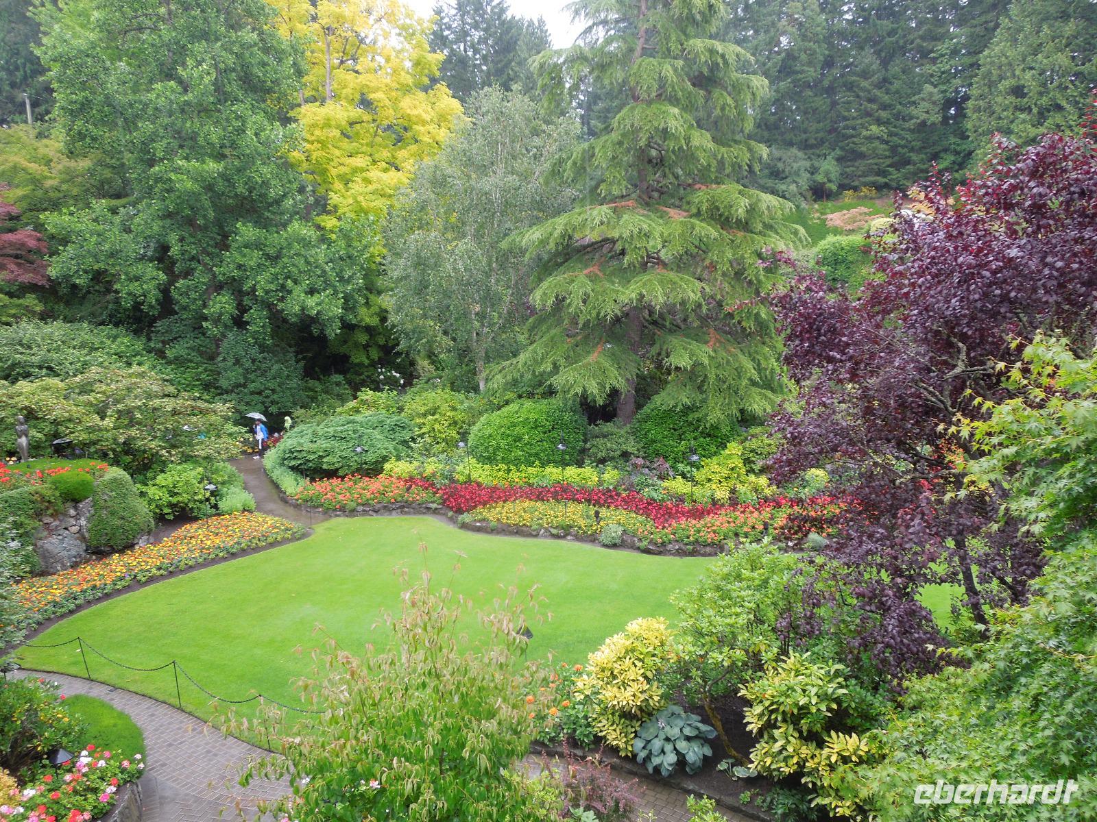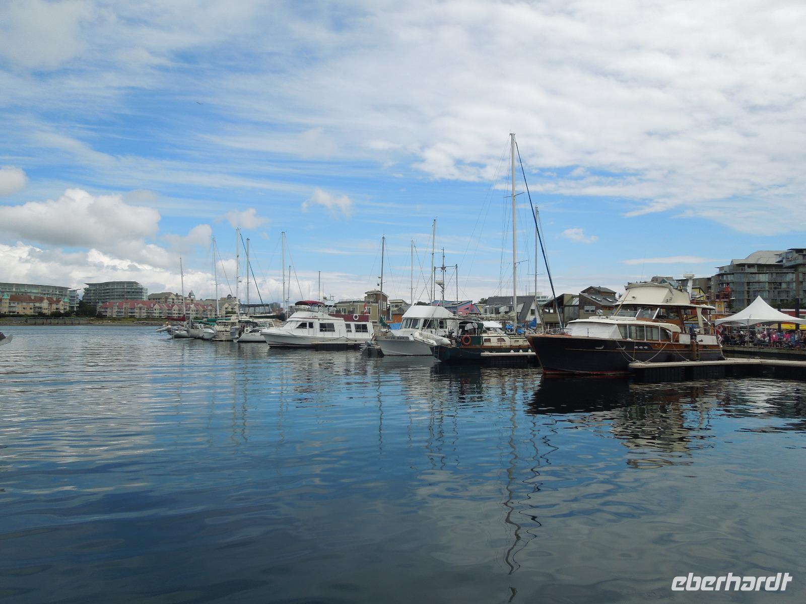 An diesem verregneten Morgen war Victoria auf Vancouver Island unser Ziel. Auf der Busfahrt und dann nochmal eineinhalb Stunden Fährüberfahrt zogen Vancouver und die wunderbare Landschaft British Columbias an uns vorbei. Während der Zeit auf der Fähre hatte man die Möglichkeit die vorbeiziehenden kleinen Inseln und Landstriche zu beobachten oder ein paar tolle Fotos zu schießen. Als wir in Victoria ankamen, hatte es bereits aufgehört zu regnen. Zuerst fuhren wir zur Fisherman's Wharf, um uns umzusehen und eventuell eine Kleinigkeit zu essen. Hier trafen wir auch auf zwei schwimmende Robben, die darauf warteten, dass man sie fütterte. Aber das war natürlich nicht gestattet. Anschließend sahen wir bei einer Stadtrundfahrt unter anderem Chinatown, die Pazifikküste, das Parlamentsgebäude und den Hafen. Victoria ist die Hauptstadt British Columbias und liegt an der Südspitze von Vancouver Island in der Bucht des Pazifiks. Man bezeichnet sie als die britischste Stadt von Kanada, erkennbar zum Beispiel an der Architektur, den roten Doppeldeckerbussen und dem Namen Victoria. Sie hat ihren Ursprung in einem 1843 errichteten Handelsposten der Hudson's Bay Company. Nach der Stadtrundfahrt hatten wir Zeit, um die charmante Stadt eigenständig zu erkunden und eventuell noch das ein oder andere letzte Souvenir zu kaufen. Wir flanierten die Hauptstraße bis zum Hafen runter, wo ein paar Straßenkünstler ihr Können darboten. Danach fuhren wir zu den bekannten Butchart Gardens, ein 22 Hektar großer, privater Blumengarten. Der erste Garten wurde 1904 von Jennie Butchart angelegt. Sie beschloss, den ehemaligen Steinbruch zu verschönern, der durch das Zementgeschäft Ihres Ehemannes entstanden war. Einst nicht viel mehr als ein paar Zuckererbsen und Rosen, ist der Versunkene Garten heute eine der Hauptattraktionen der Anlage. Leider regnete es eine ganze Weile, sodass wir hauptsächlich Regenbilder von den schönen und vielfältigen Pflanzen bekamen. Nach einem erlebnisreichen Tag fuhren wir wieder zurück zu unserem Hotel in Vancouver.