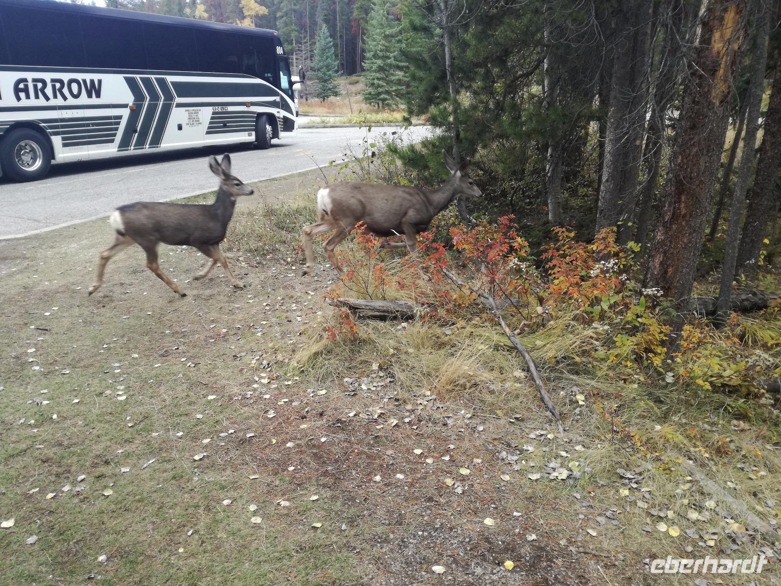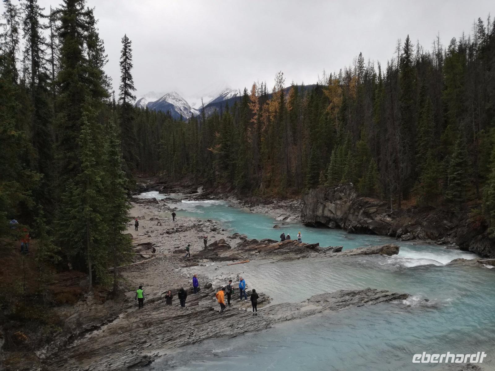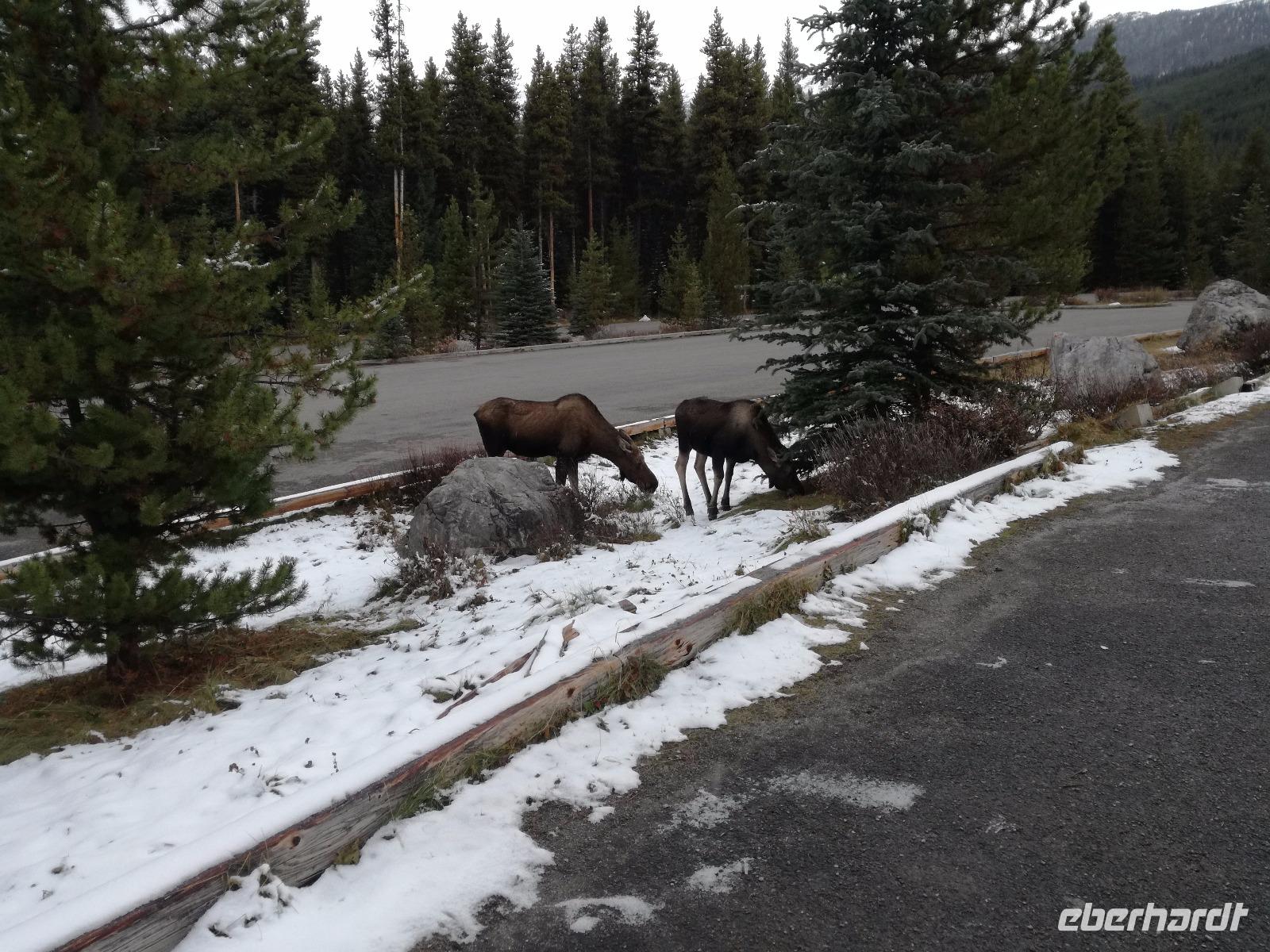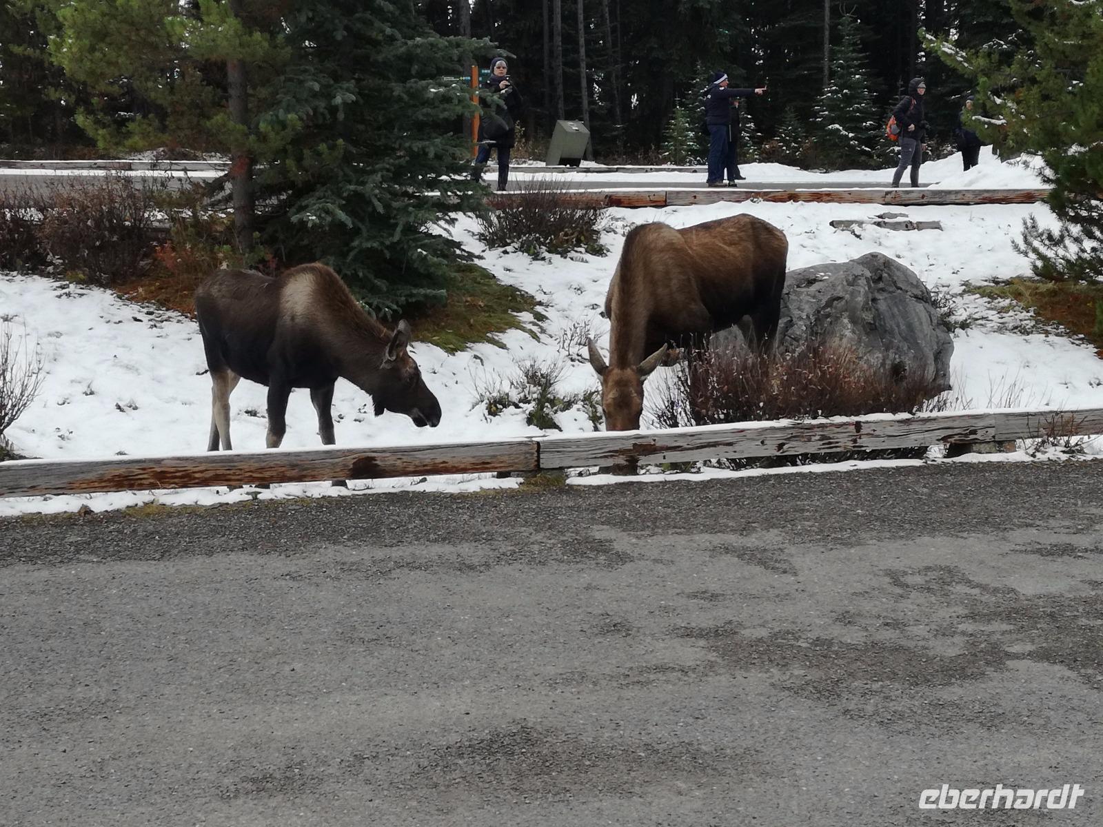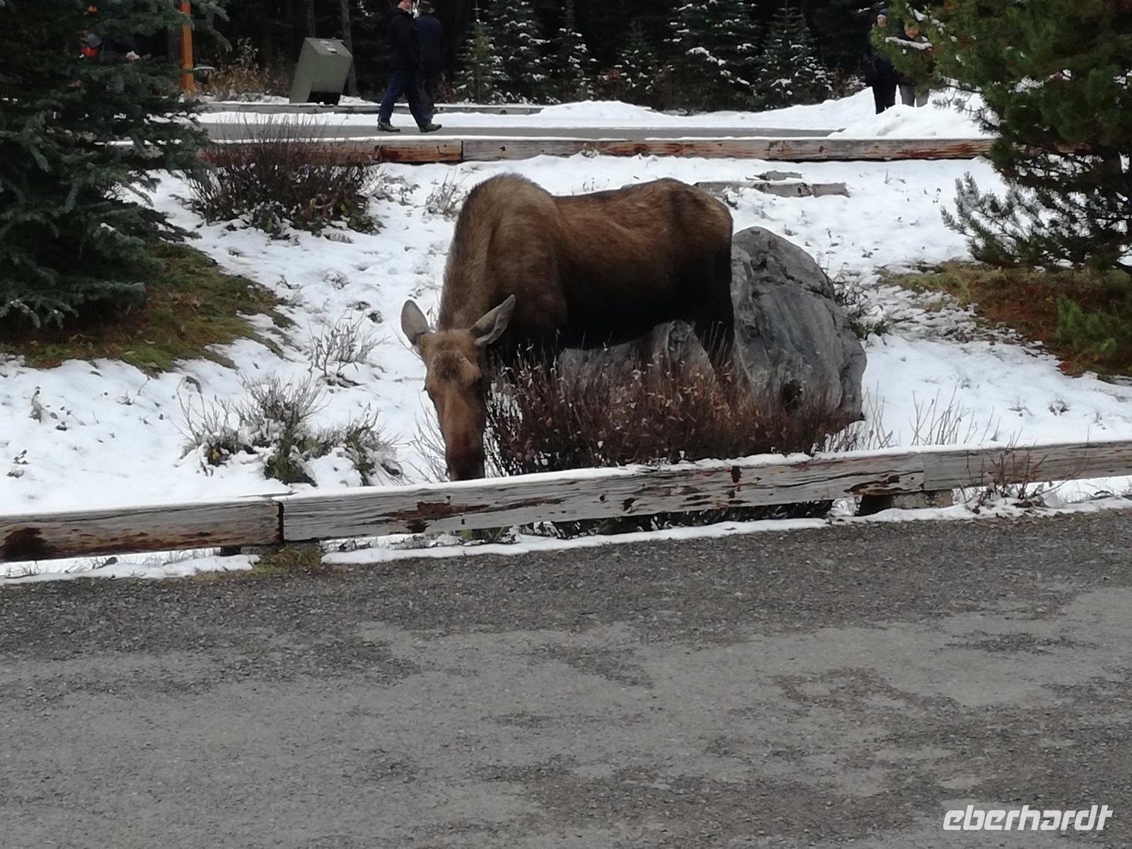 Nach einer gemütlichen und ruhigen Nacht in unseren Bungalows brachen wir nach dem Frühstück auf. Unser Ziel der berühmte Japser Nationalpark und zunächst einmal die Athabasca Fälle. Die 23 Meter hohen Fälle sind besonders für Ihre Kraft bekannt, mit der die Wassermassen durch den Berg fließen. Nach dem Aufenthalt an den Fällen fuhren wir weiter in Richtung Maligne Lake. Während der Busfahrt sahen wir zwei Wapitis am Straßenrand grasen. Weiter ging es zum Maligne Lake. Während sich die ersten bereits mit Kaffee und Essen stärkten, entdecken 2 Gäste plötzlich Elche auf einem abgelegenen Parkplatz. Schnell wurde die Gruppe informiert und wir konnten alle ein schönes Bild von den gemütlich erscheinenden Tieren machen. Nach dieser Bekanntschaft stand noch ein Spaziergang entlang des Seeufers auf dem Programm. Nach der kleinen Wanderung kehrten wir alle in ein Restaurant ein und wärmten uns mit Suppe und Kaffee. Nach der Mittagspause fuhren wir weiter zum Maligne Canyon. Über mehrere Brücken passierten wir die tiefen Schluchten des Canyons. Auch hier erkannte man wieder die Kraft der Wassermassen, da die Steinfelsen rundförmig durch die Strömung abgetragen wurden. Als wir zurück zum Bus liefen, entdeckten wir wieder Wapitis, die vorm Bus grasten. Unseren letzten Halt des Tages machten wir in der Provinzstadt Jasper, wo wir ausreichend Zeit zum Bummel oder spazieren hatten, bevor wir zurück zur unserer Lodge fuhren.