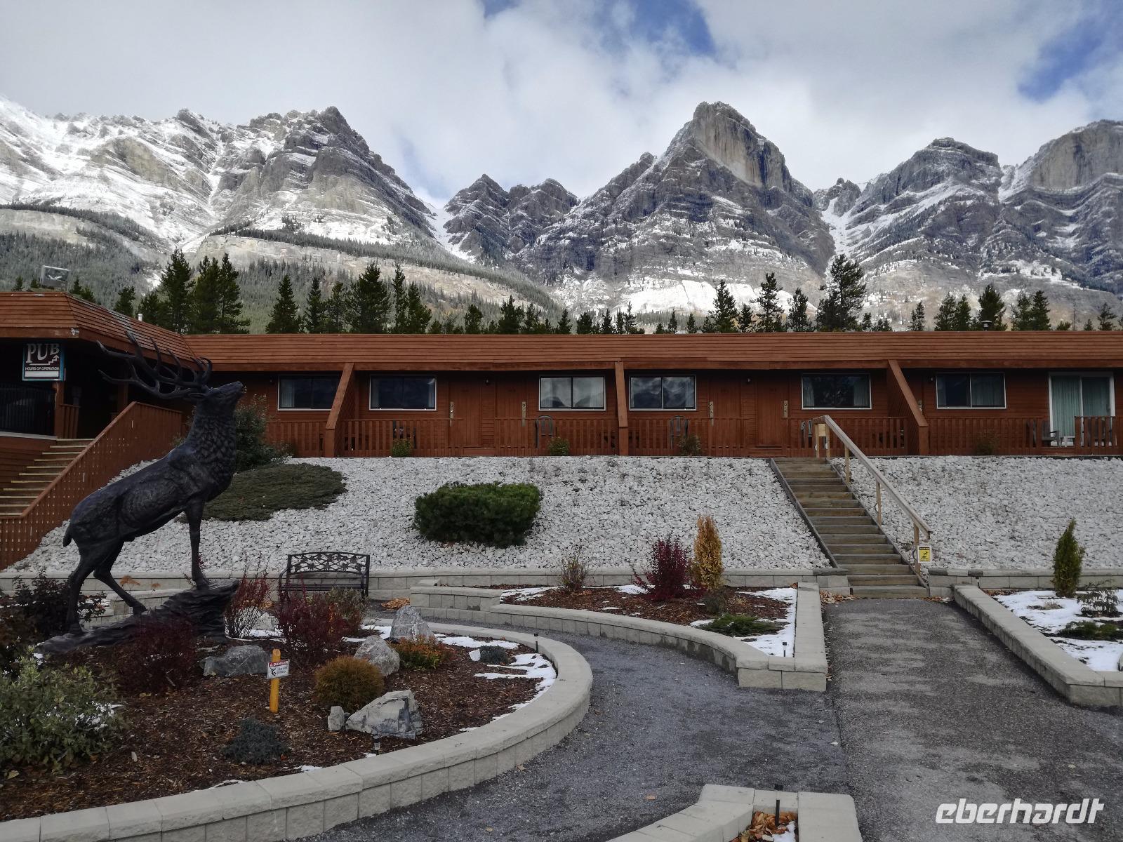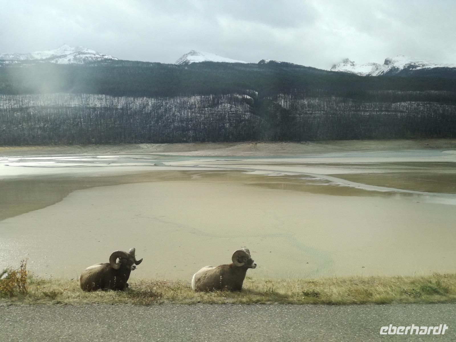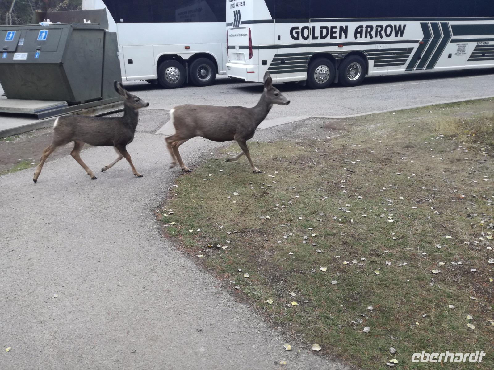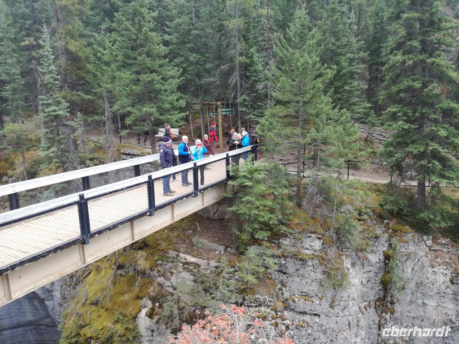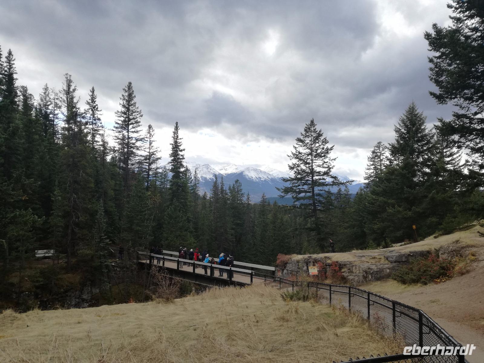 Nach einer gemütlichen und ruhigen Nacht in unseren Bungalows brachen wir nach dem Frühstück auf. Unser Ziel der berühmte Japser Nationalpark und zunächst einmal die Athabasca Fälle. Die 23 Meter hohen Fälle sind besonders für Ihre Kraft bekannt, mit der die Wassermassen durch den Berg fließen. Nach dem Aufenthalt an den Fällen fuhren wir weiter in Richtung Maligne Lake. Während der Busfahrt sahen wir zwei Wapitis am Straßenrand grasen. Weiter ging es zum Maligne Lake. Während sich die ersten bereits mit Kaffee und Essen stärkten, entdecken 2 Gäste plötzlich Elche auf einem abgelegenen Parkplatz. Schnell wurde die Gruppe informiert und wir konnten alle ein schönes Bild von den gemütlich erscheinenden Tieren machen. Nach dieser Bekanntschaft stand noch ein Spaziergang entlang des Seeufers auf dem Programm. Nach der kleinen Wanderung kehrten wir alle in ein Restaurant ein und wärmten uns mit Suppe und Kaffee. Nach der Mittagspause fuhren wir weiter zum Maligne Canyon. Über mehrere Brücken passierten wir die tiefen Schluchten des Canyons. Auch hier erkannte man wieder die Kraft der Wassermassen, da die Steinfelsen rundförmig durch die Strömung abgetragen wurden. Als wir zurück zum Bus liefen, entdeckten wir wieder Wapitis, die vorm Bus grasten. Unseren letzten Halt des Tages machten wir in der Provinzstadt Jasper, wo wir ausreichend Zeit zum Bummel oder spazieren hatten, bevor wir zurück zur unserer Lodge fuhren.